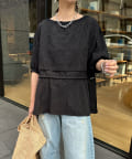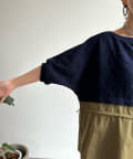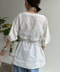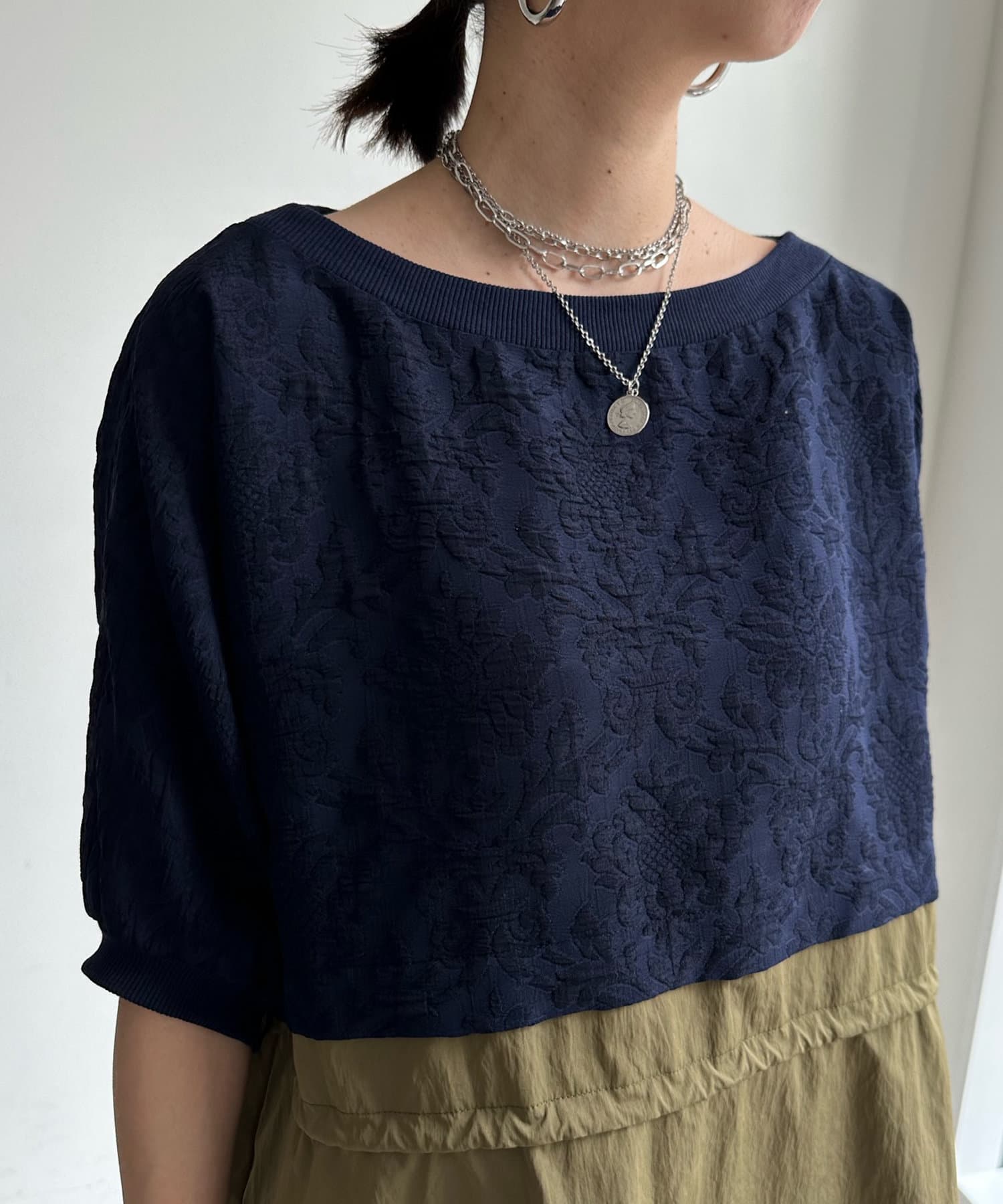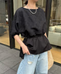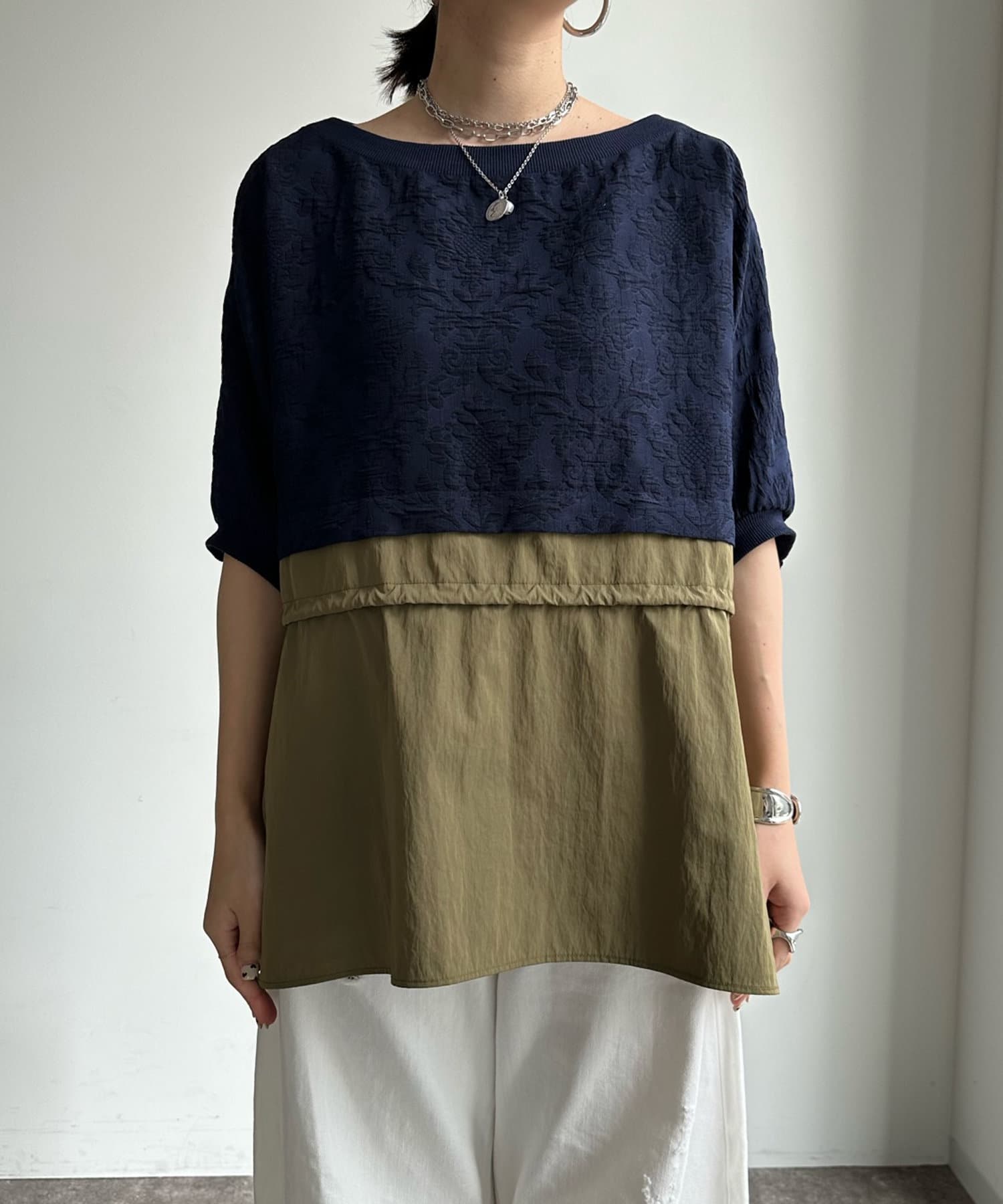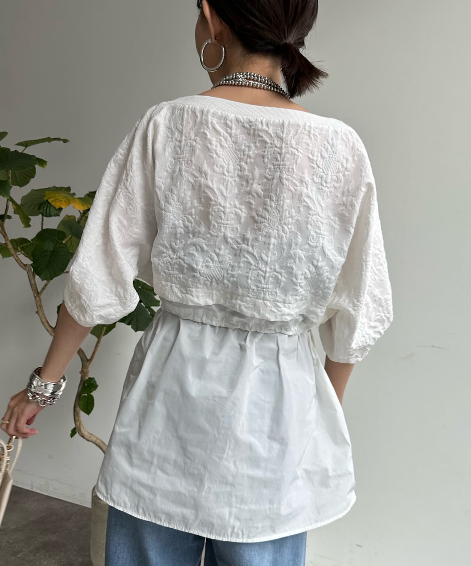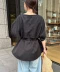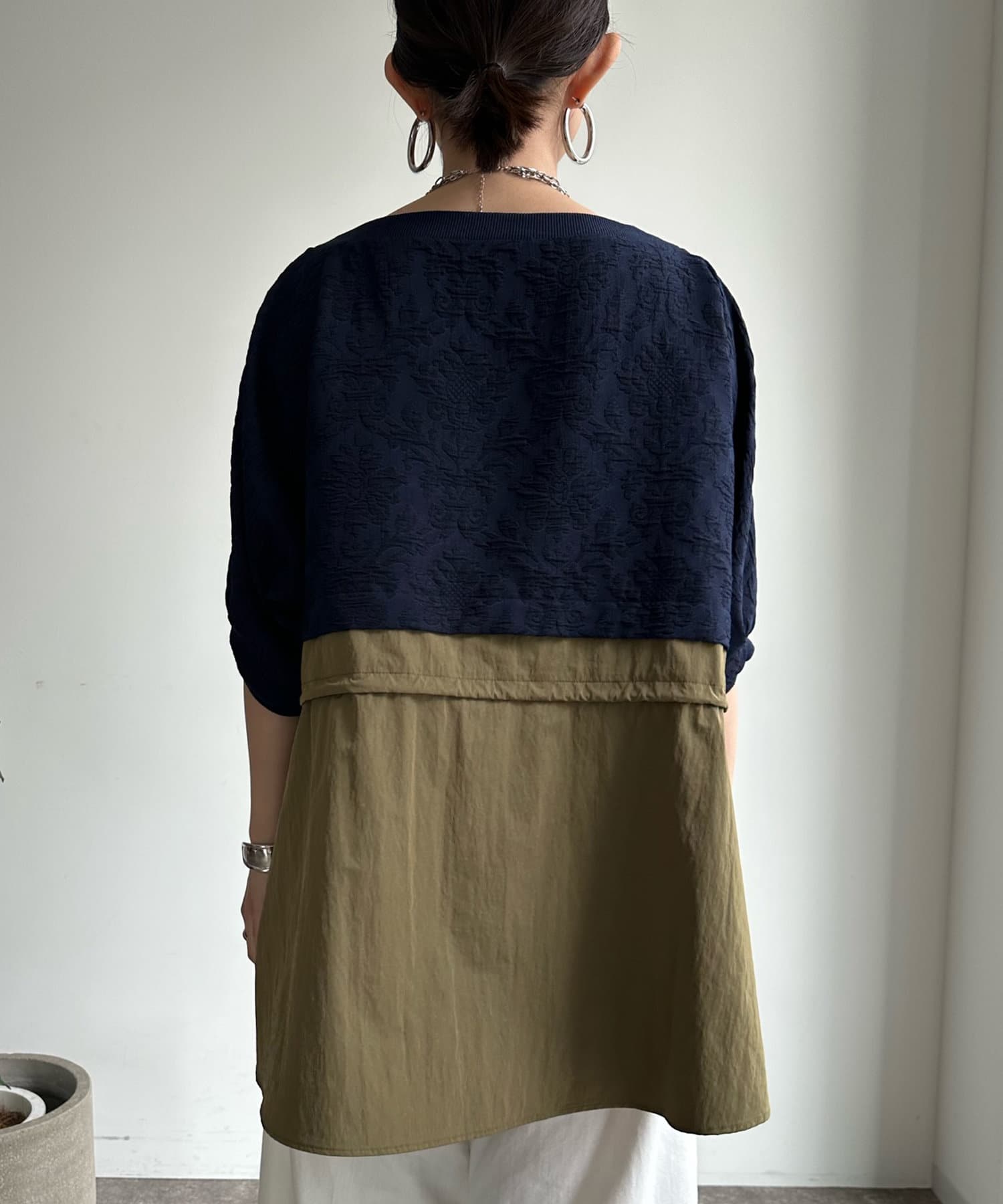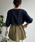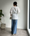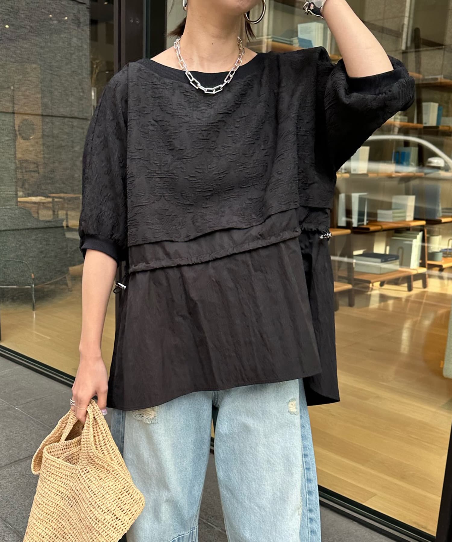 ウエスト下から素材を切り替え、ドロストコードを絞ると広がる裾が女性らしさ抜群。