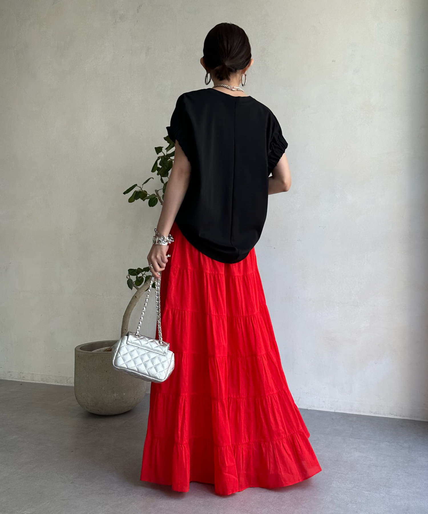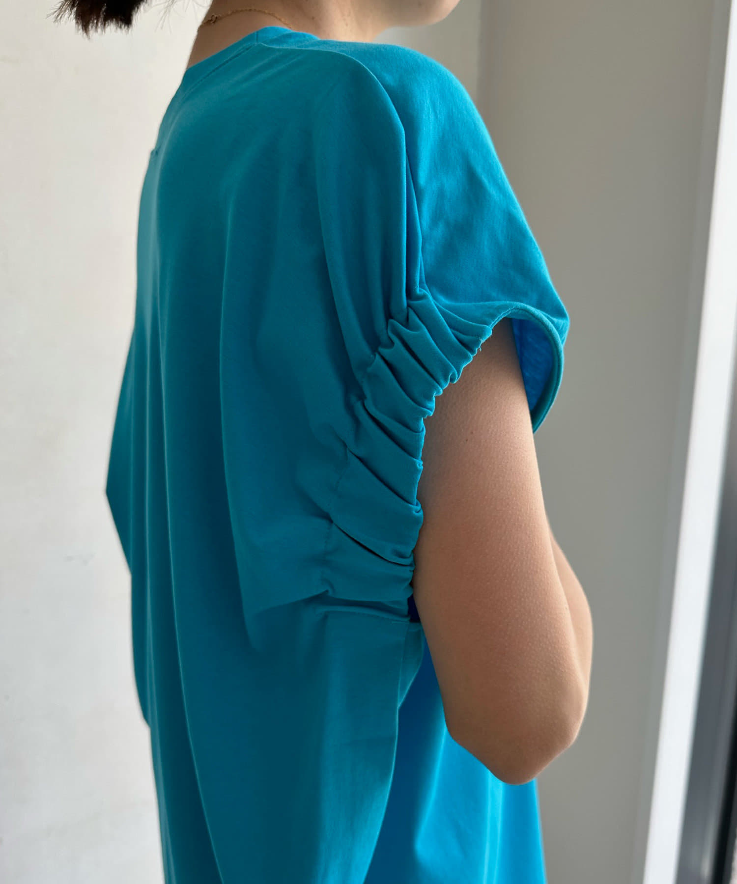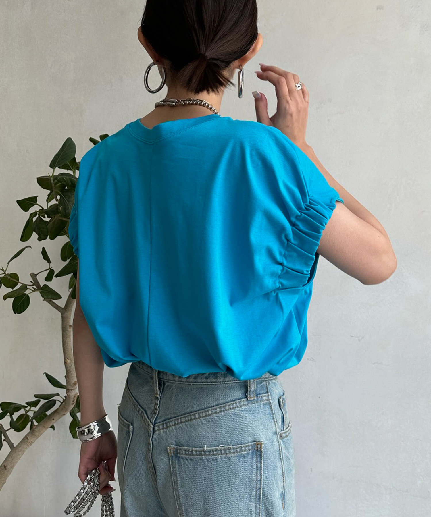 肩のタックと、立体感のあるシルエットが気になるところをカバーしつつ、二の腕部分もすっきり見せてくれます。