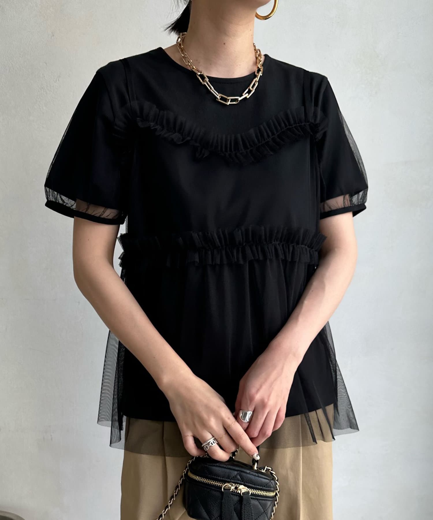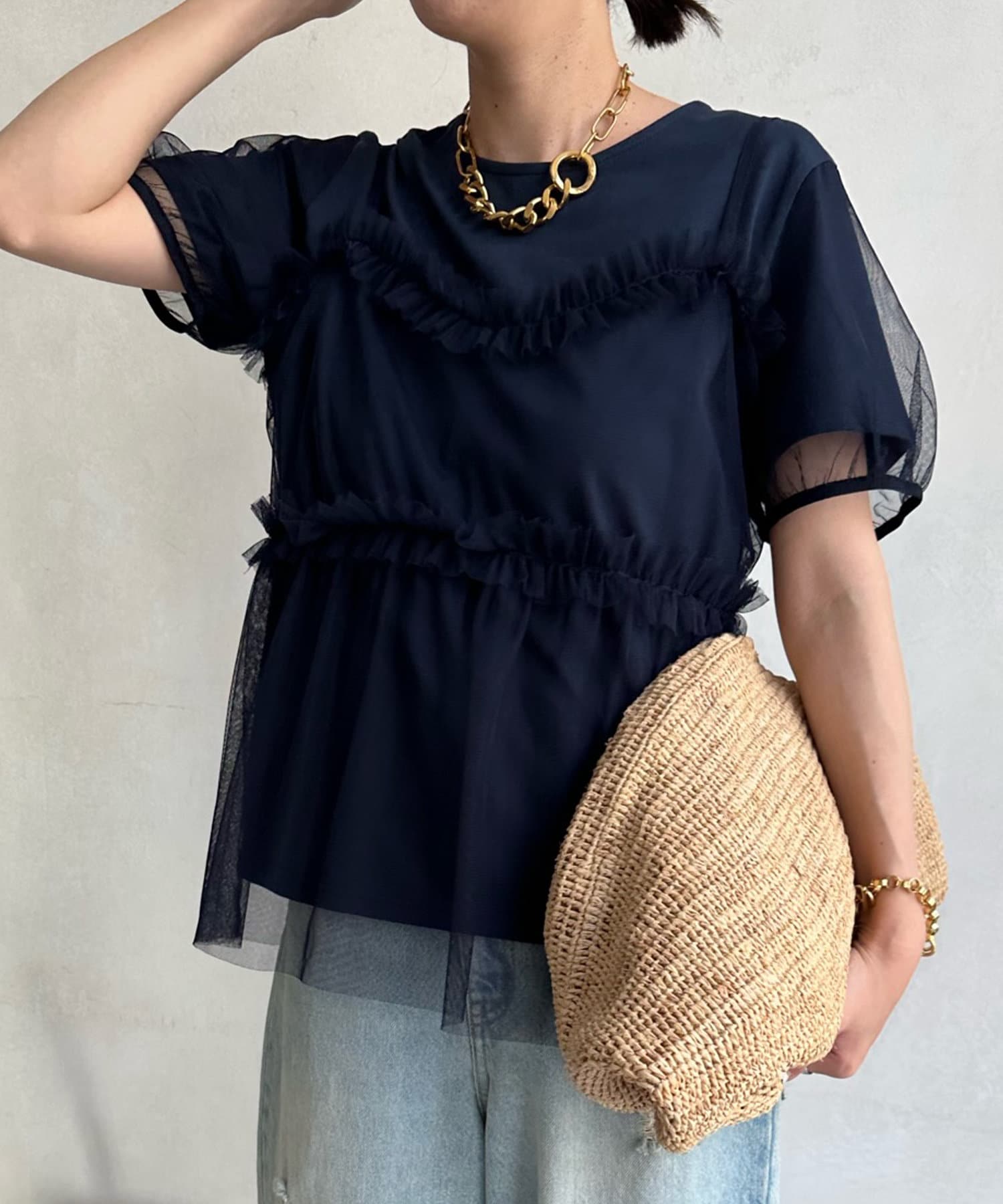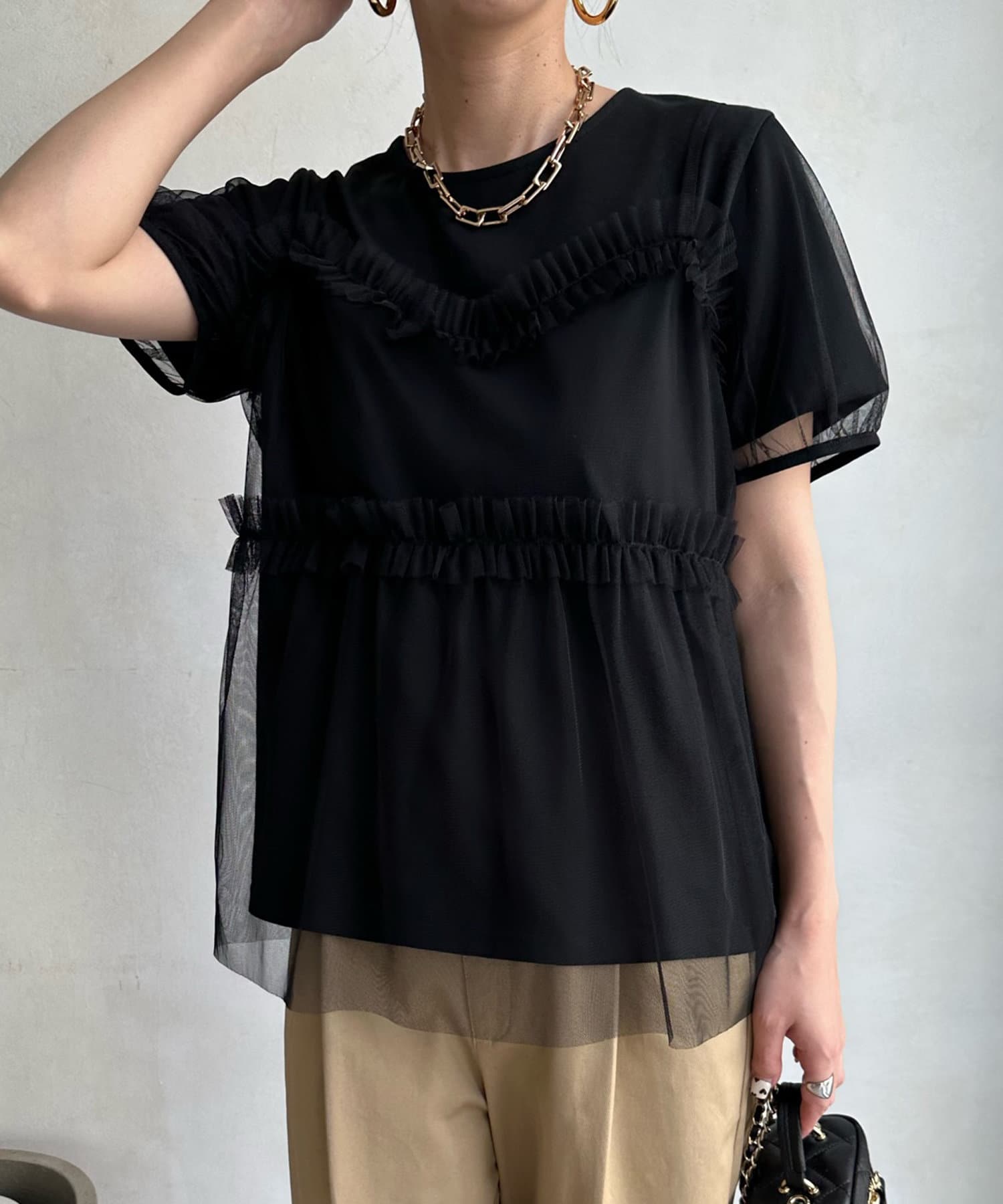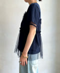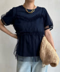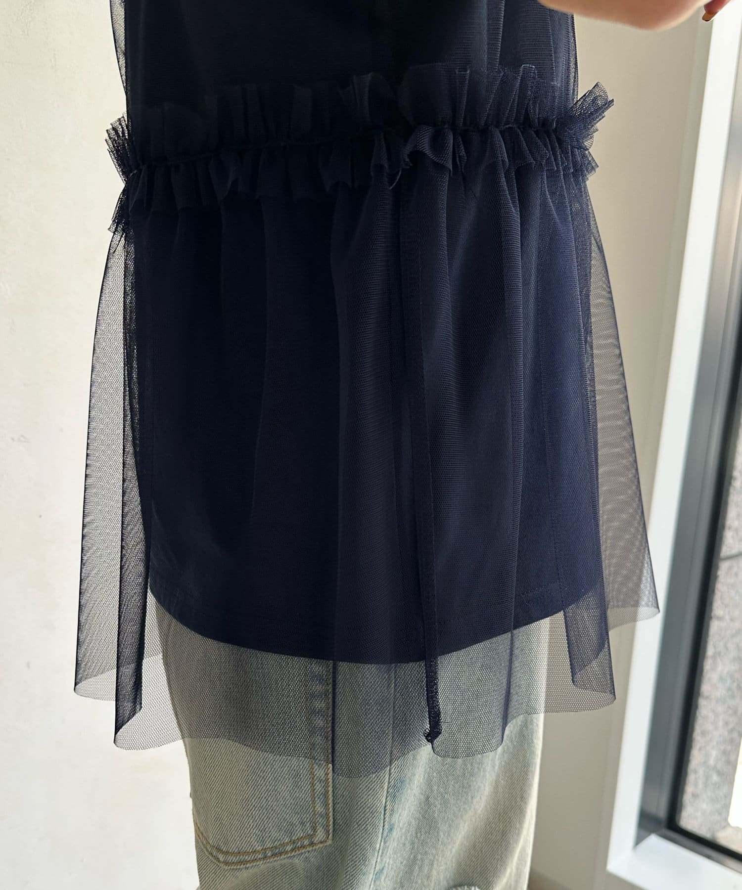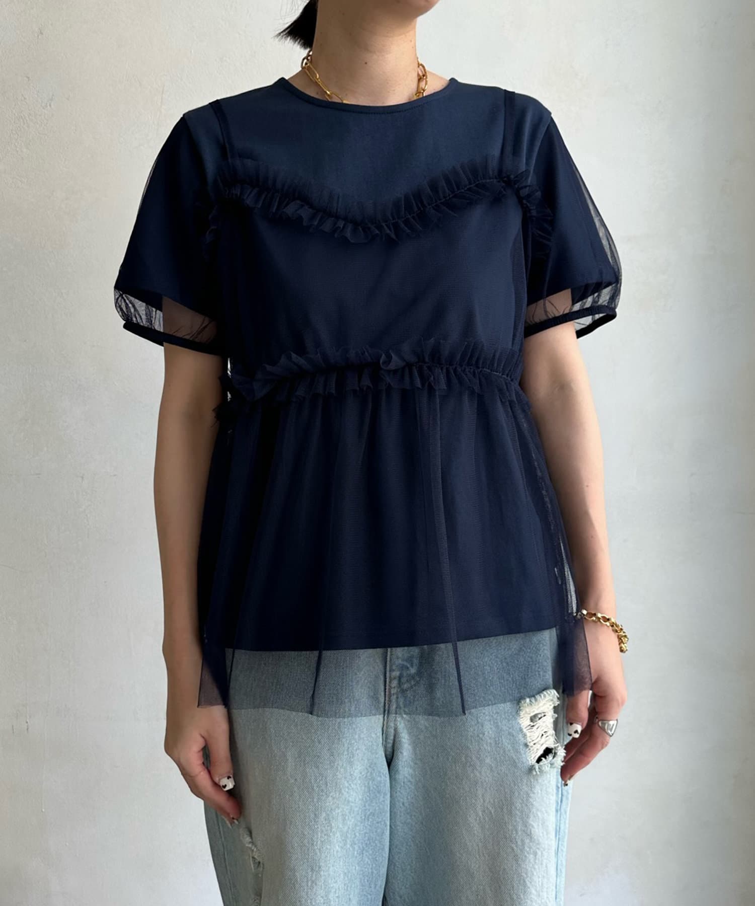 全体的にギャザーを寄せ、程よいボリューム感をプラス。Tシャツのショルダーにもふんわりとしたチュールを施し上品で華やかな印象に。