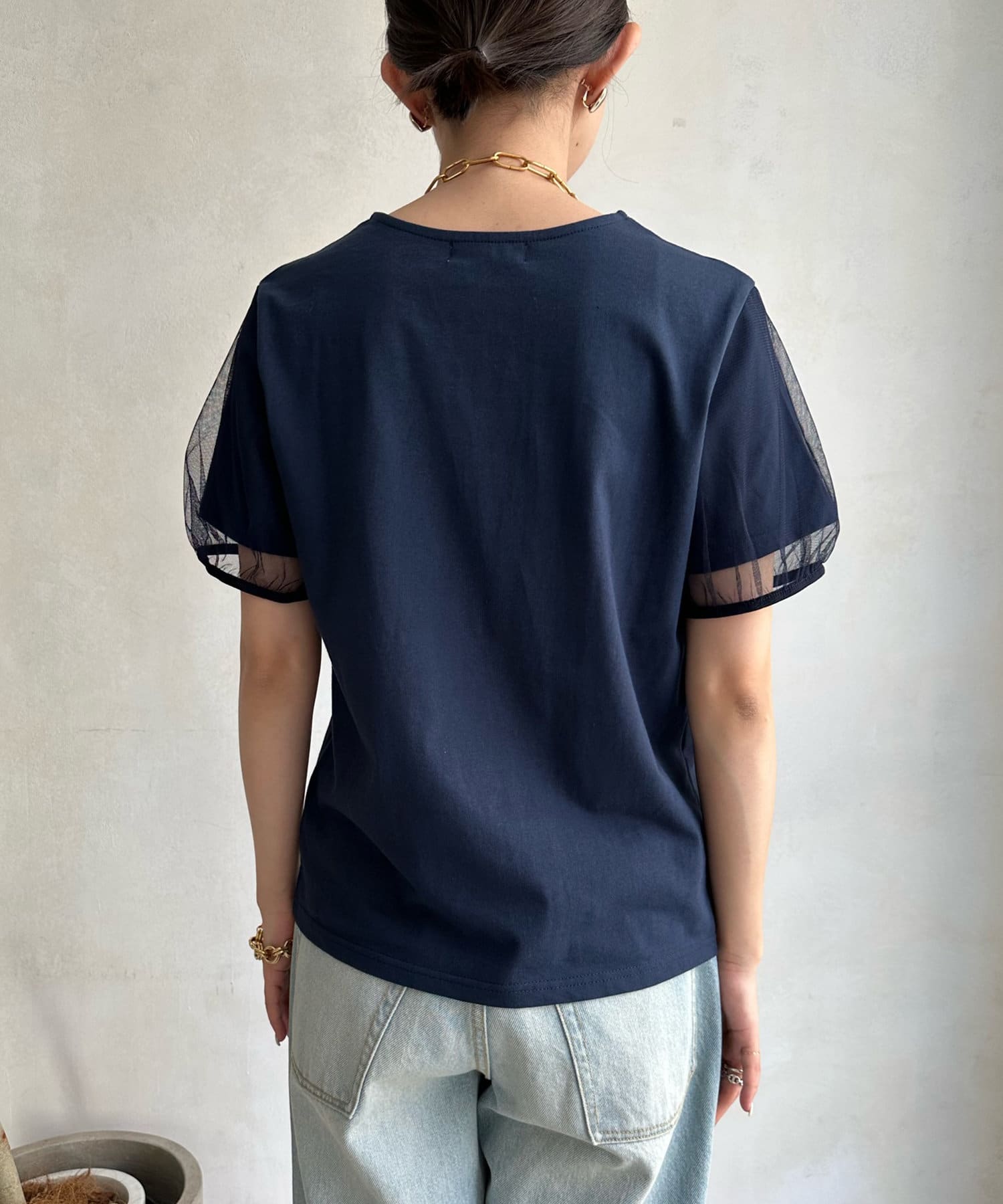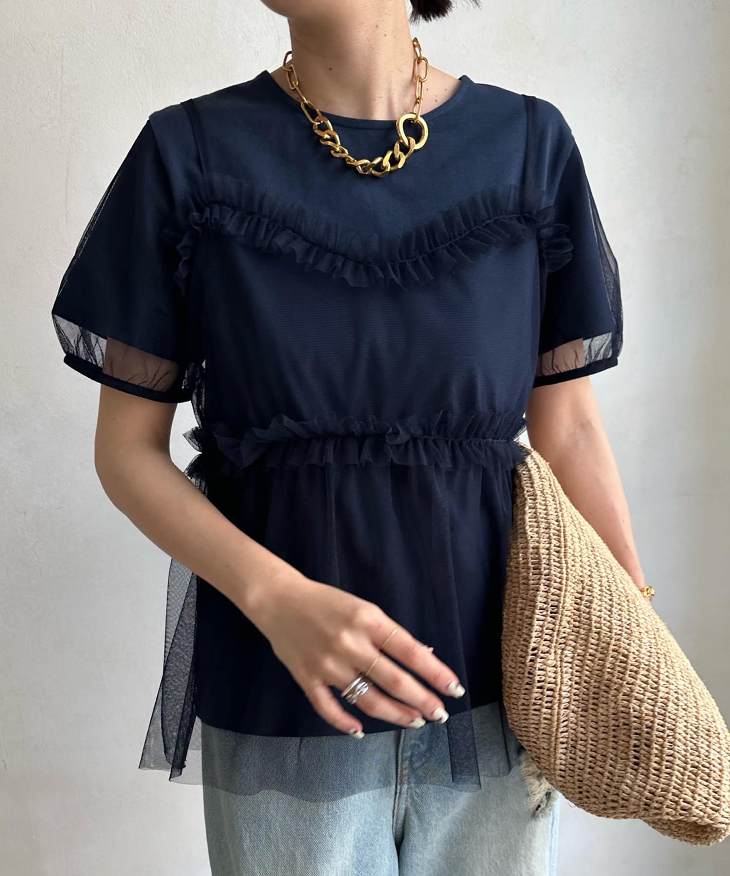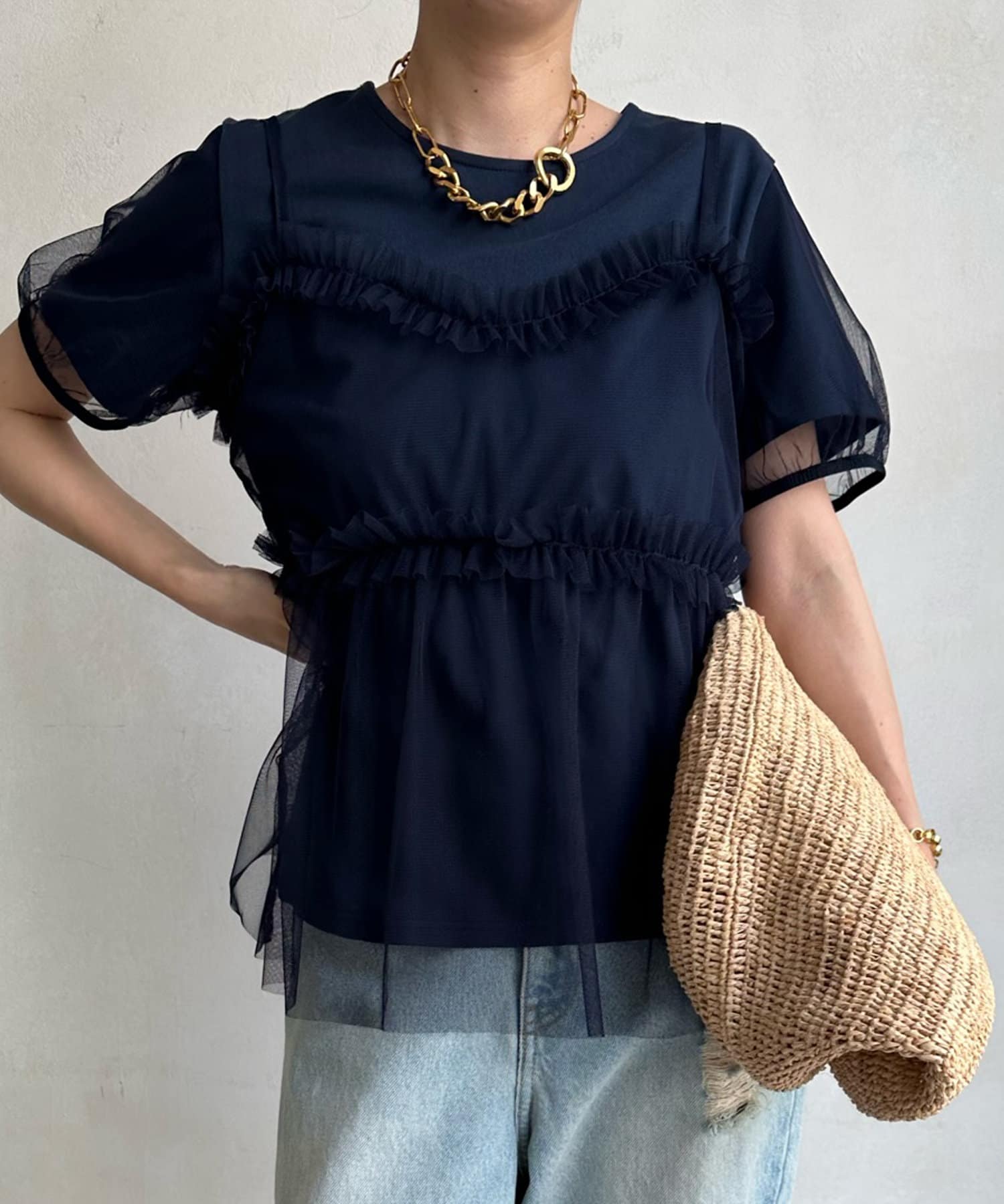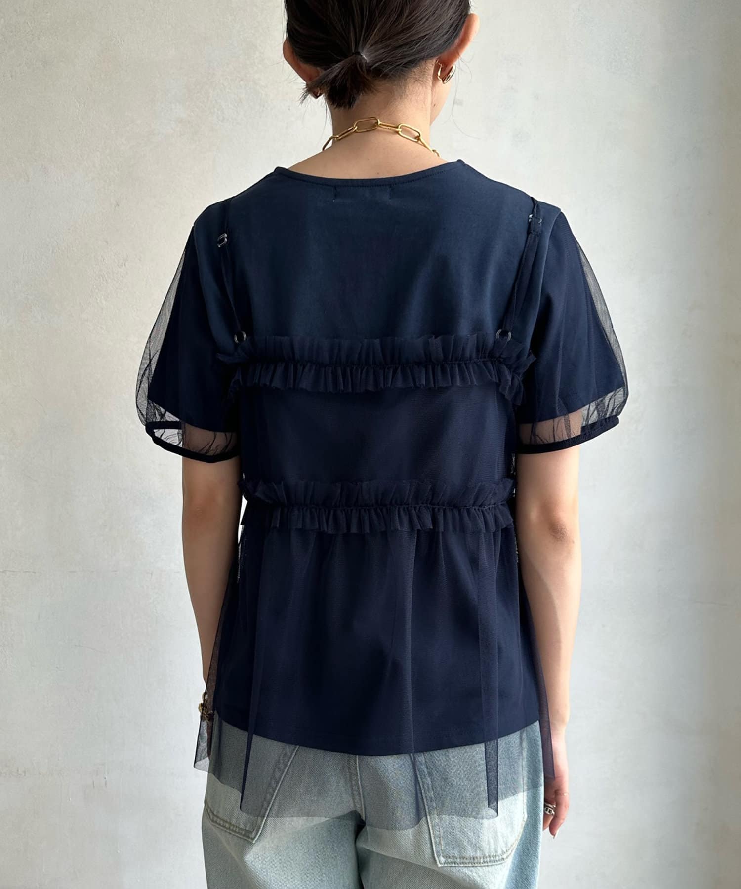 全体的にギャザーを寄せ、程よいボリューム感をプラス。Tシャツのショルダーにもふんわりとしたチュールを施し上品で華やかな印象に。