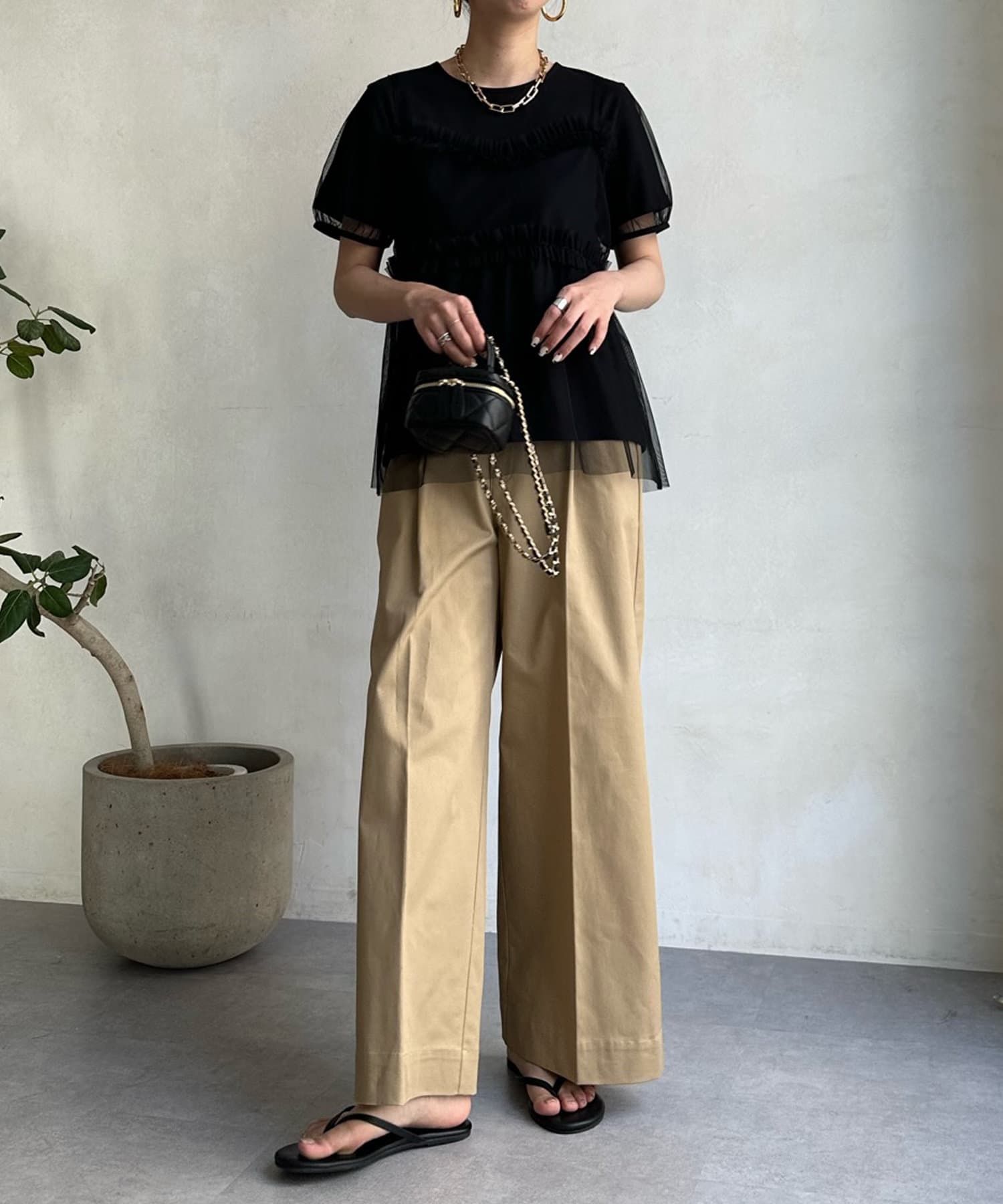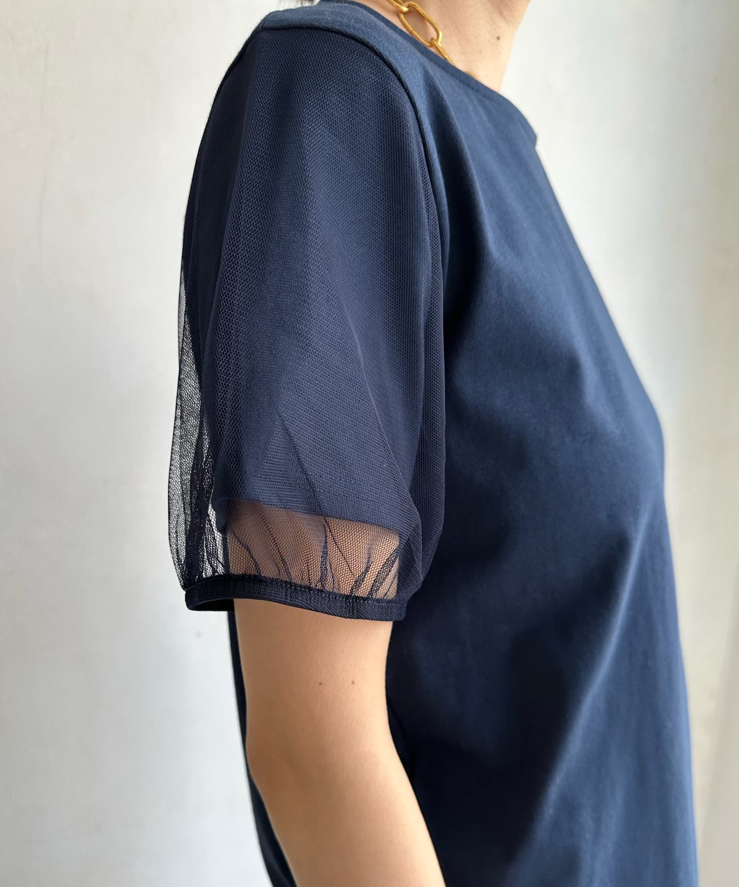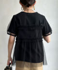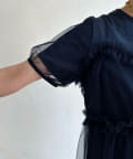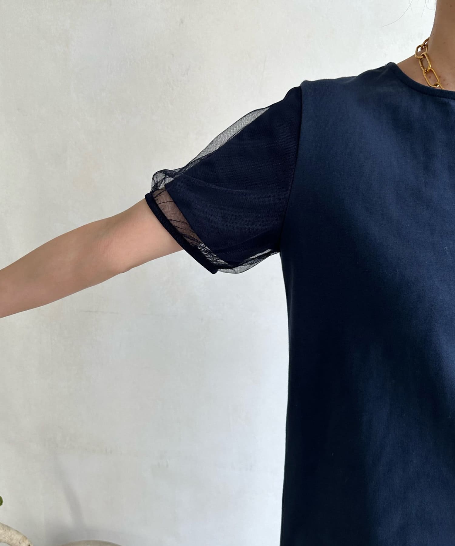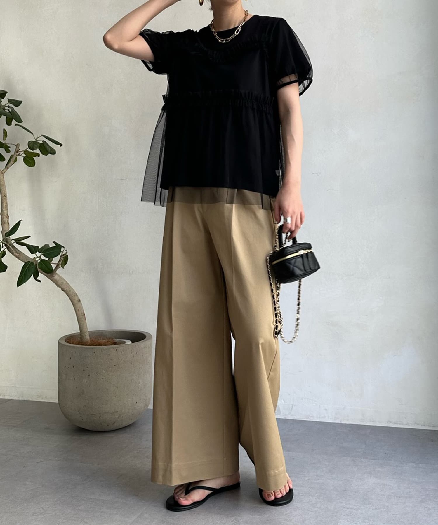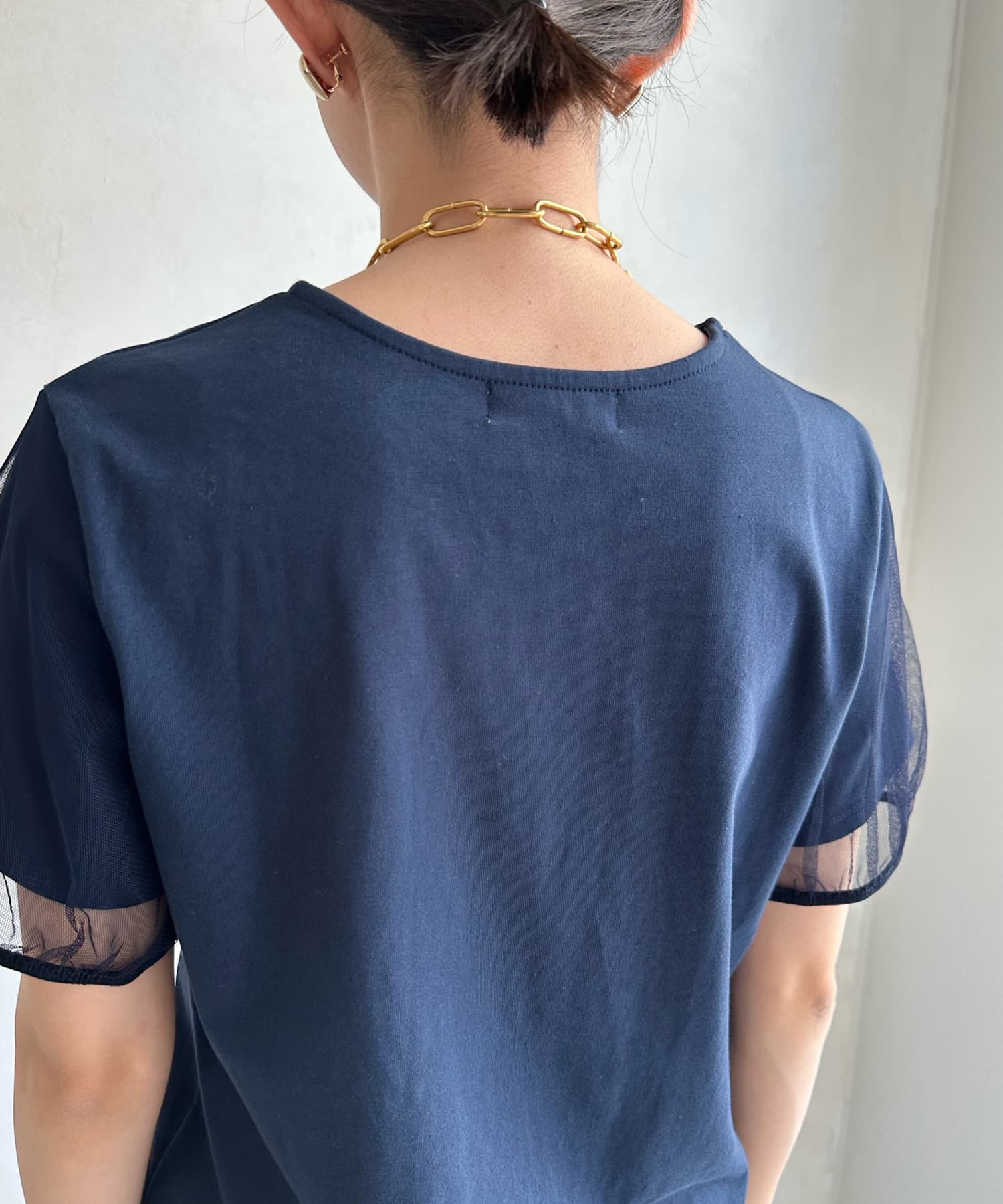 全体的にギャザーを寄せ、程よいボリューム感をプラス。Tシャツのショルダーにもふんわりとしたチュールを施し上品で華やかな印象に。