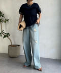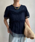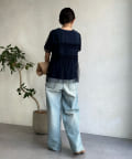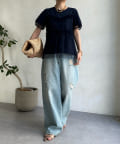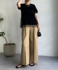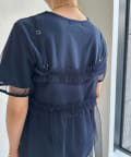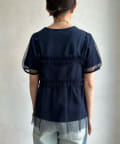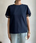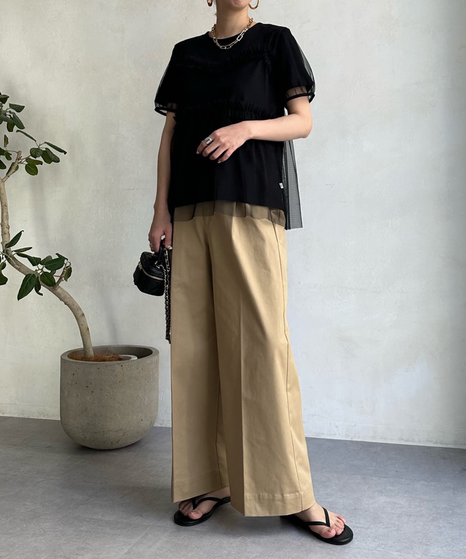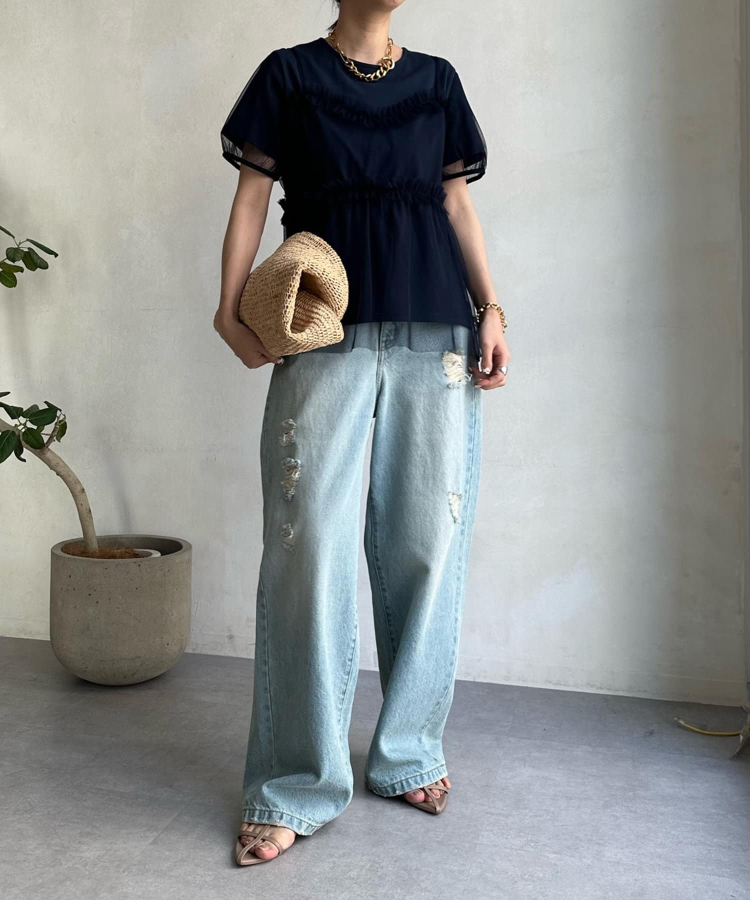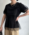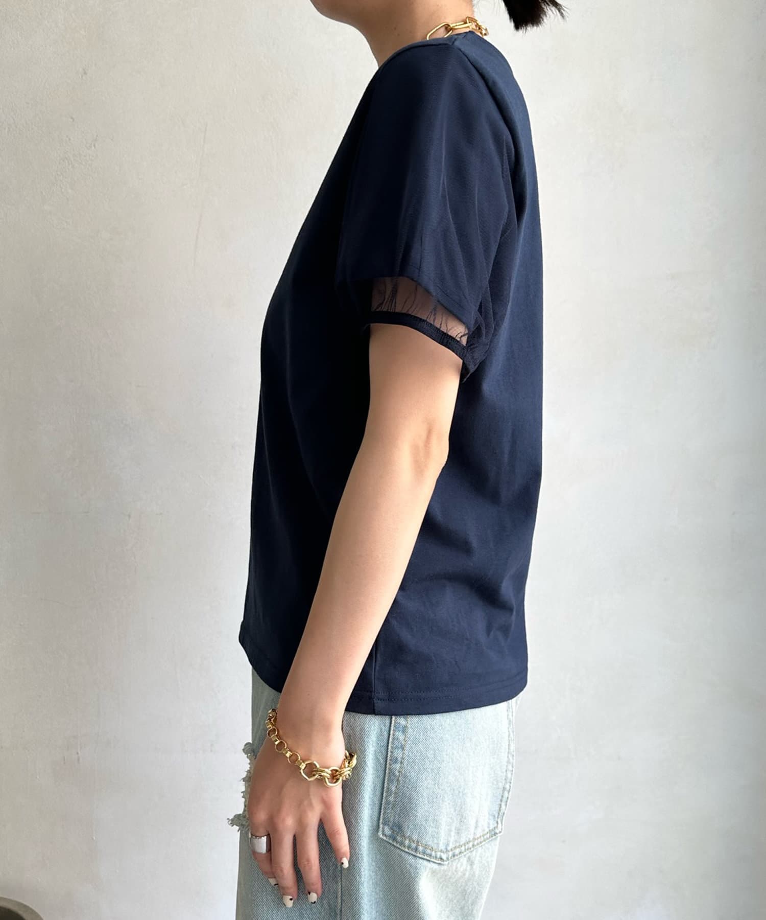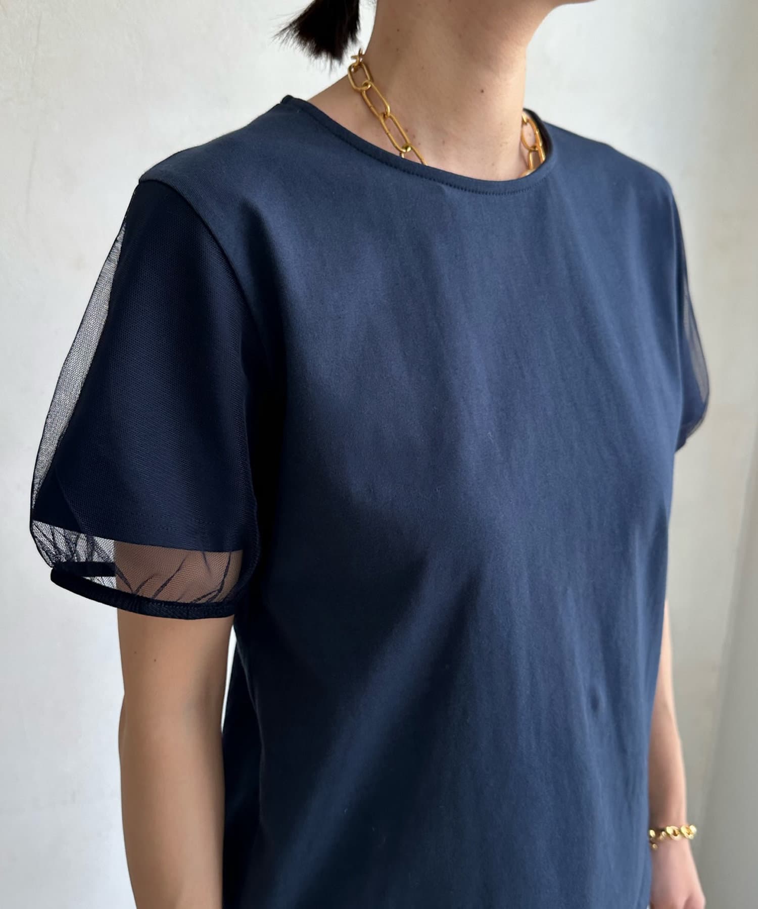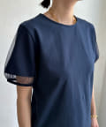 全体的にギャザーを寄せ、程よいボリューム感をプラス。Tシャツのショルダーにもふんわりとしたチュールを施し上品で華やかな印象に。