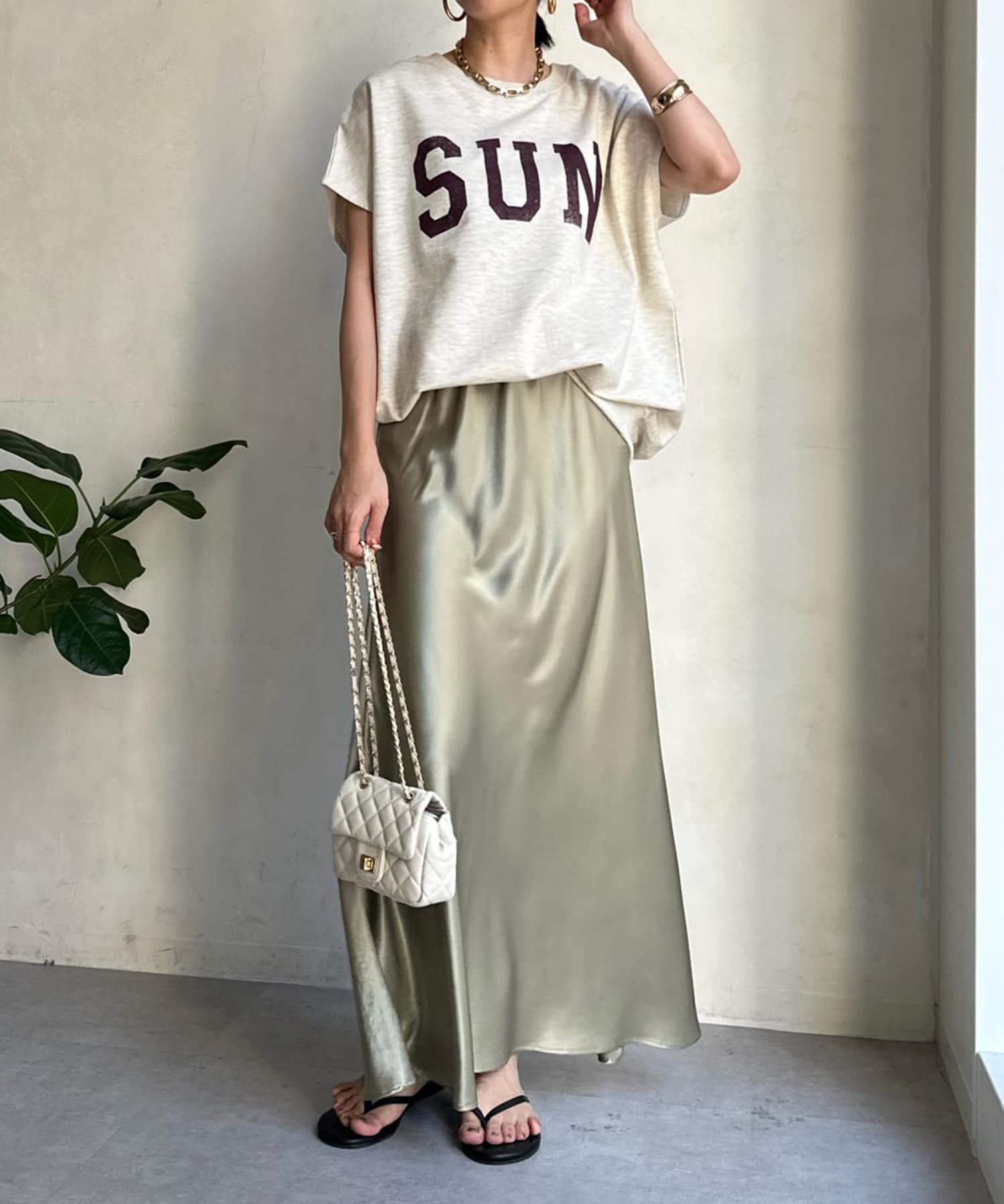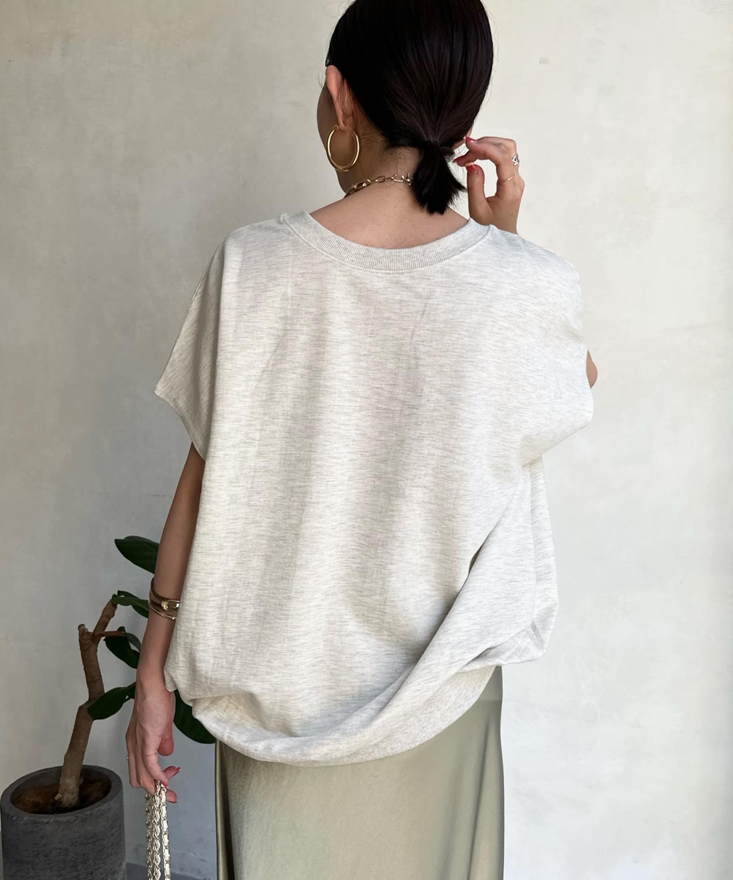 また、程よく二の腕をカバーしてくれるフレンチスリーブは女性らしさを演出し、華奢見え効果をサポート。