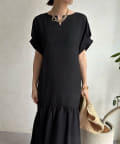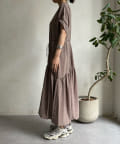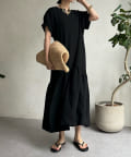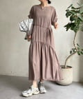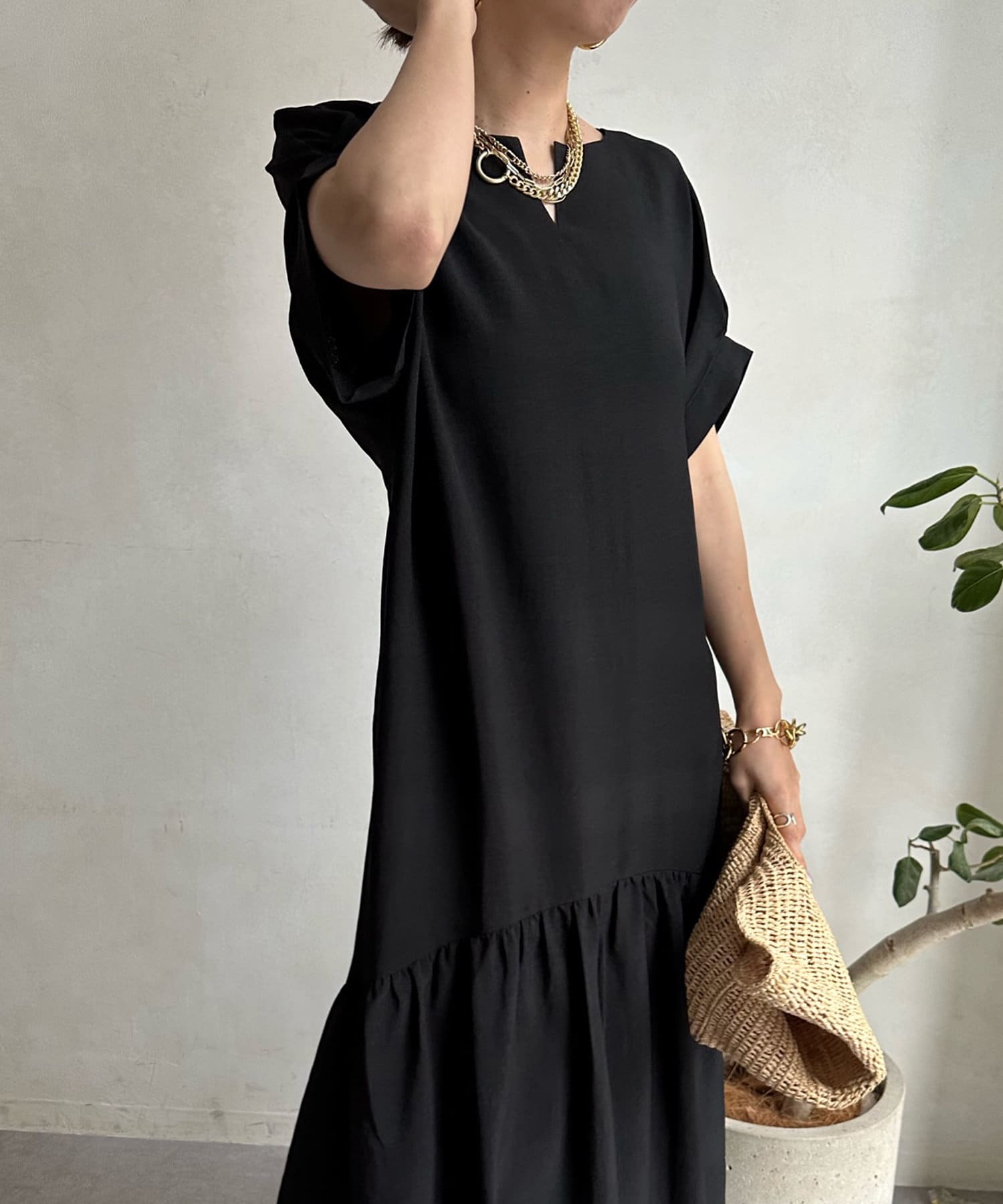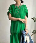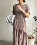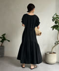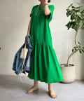 ふんわり程よいボリュームのバルーンスリーブやラウンドに切り替えられたティアードデザインがフェミニンな印象のワンピース。