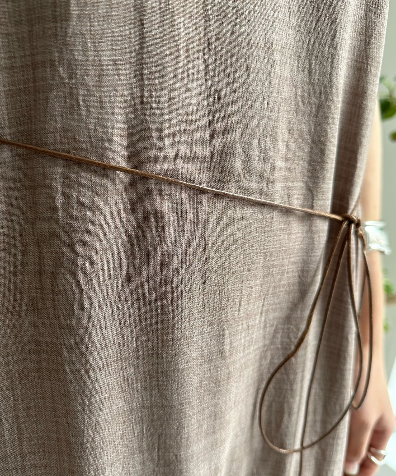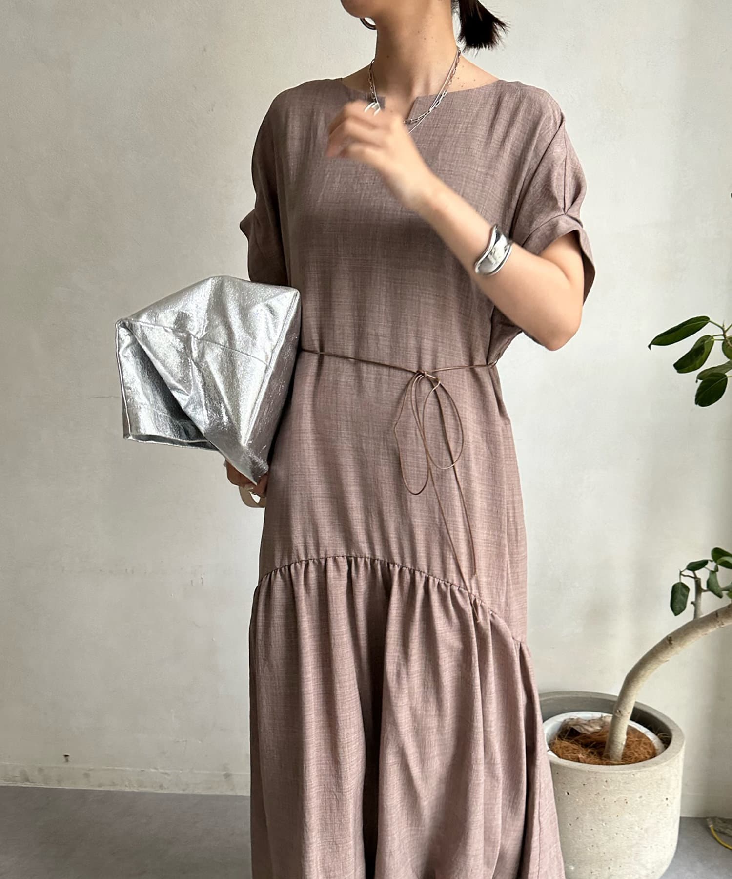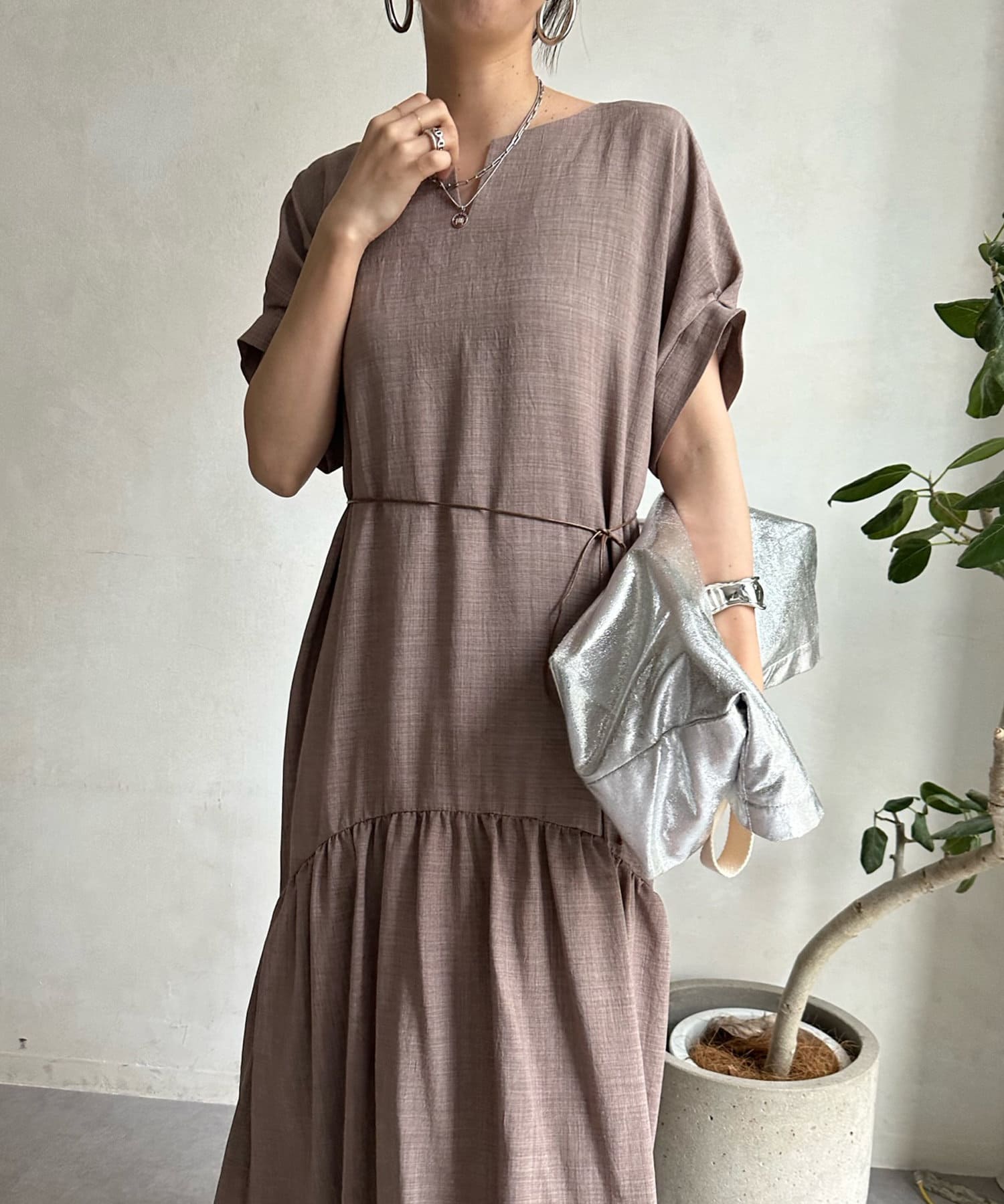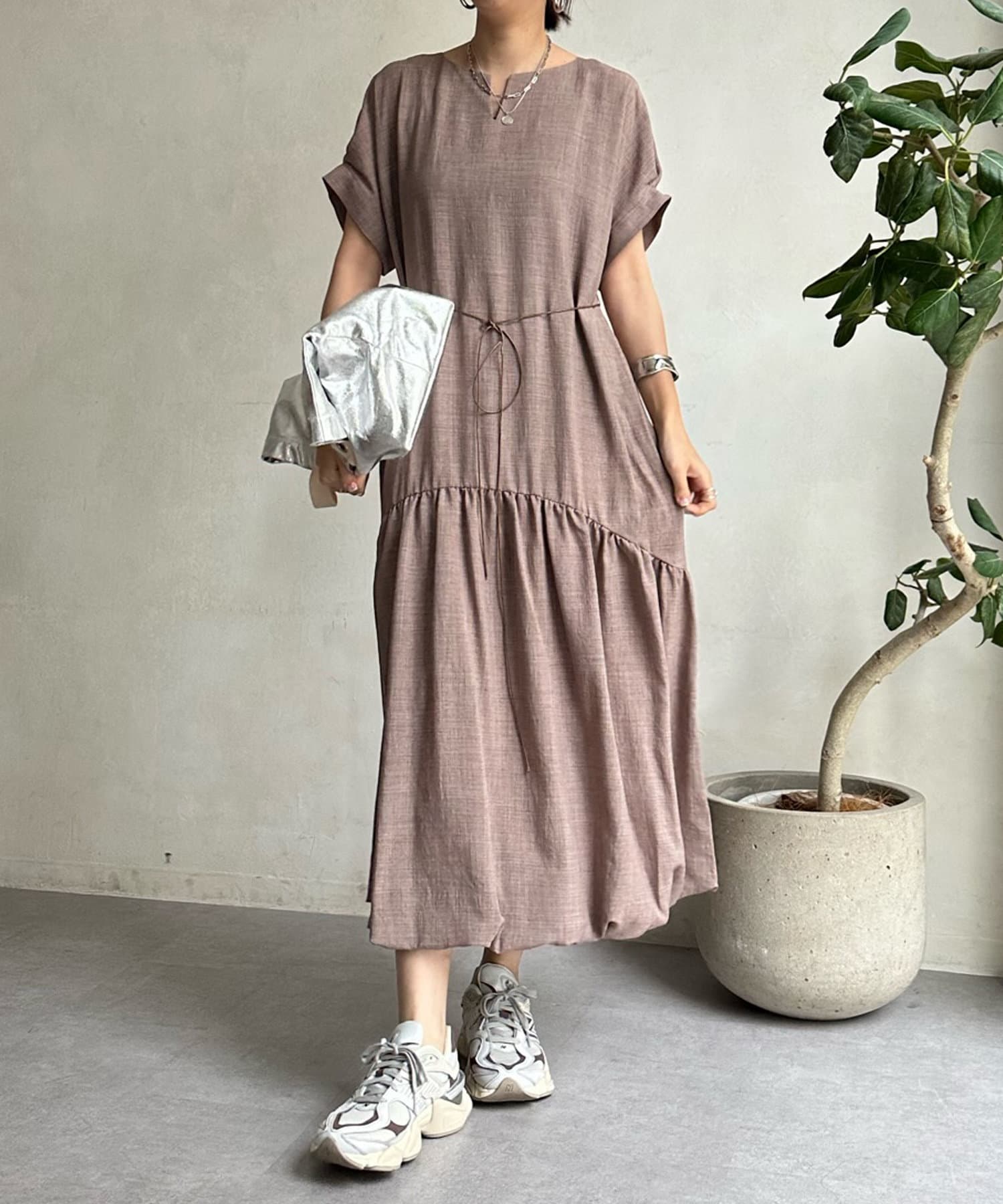 ウエストに付いている紐でワンピースのシルエットを変えてお楽しみいただけます!ボディーラインを拾わずノンストレスで軽い着心地なので夏も快適に過ごせますよ◎