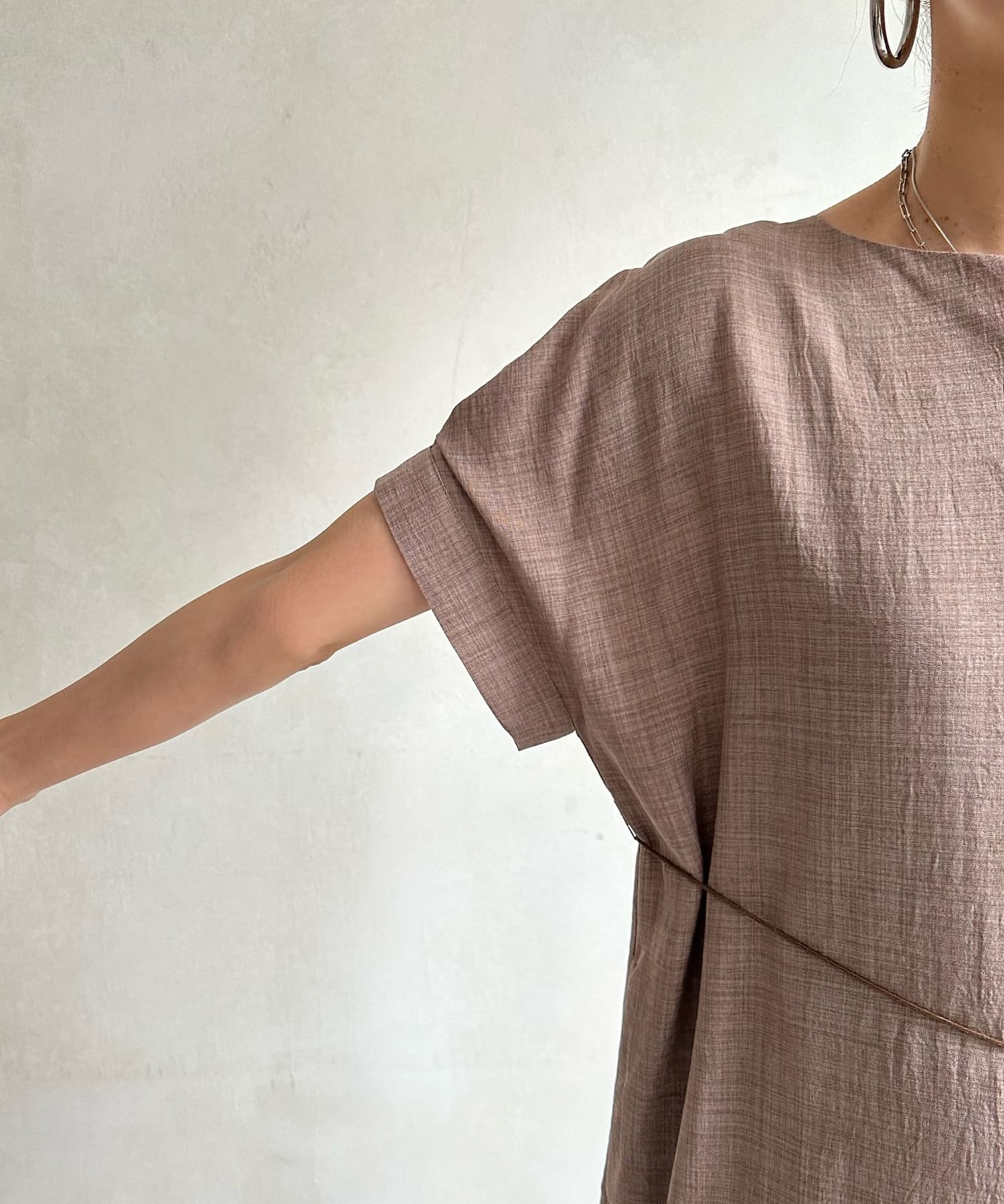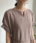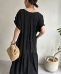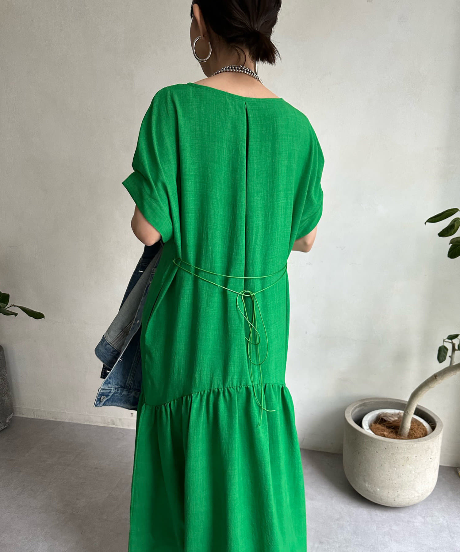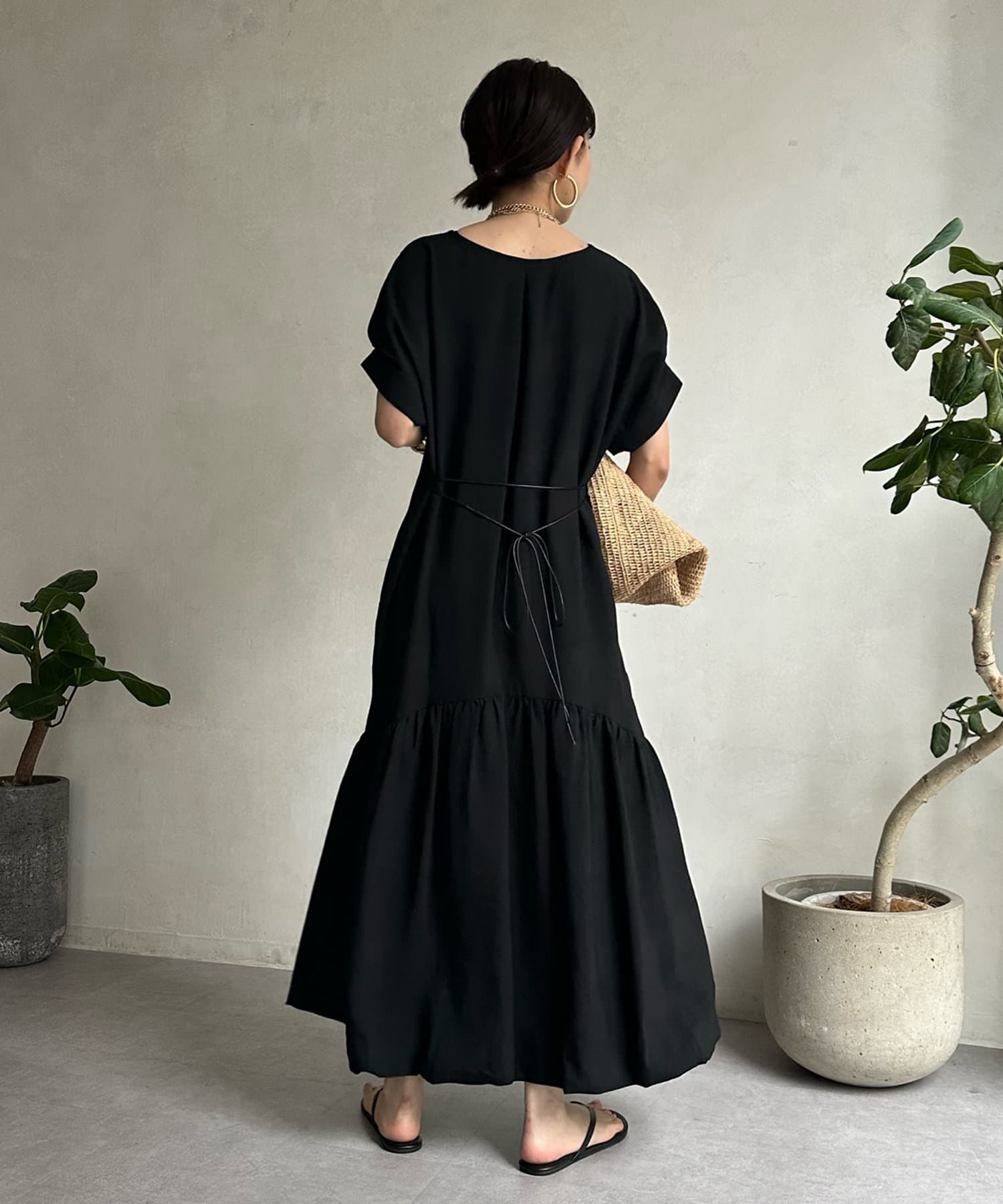 ウエストに付いている紐でワンピースのシルエットを変えてお楽しみいただけます!ボディーラインを拾わずノンストレスで軽い着心地なので夏も快適に過ごせますよ◎