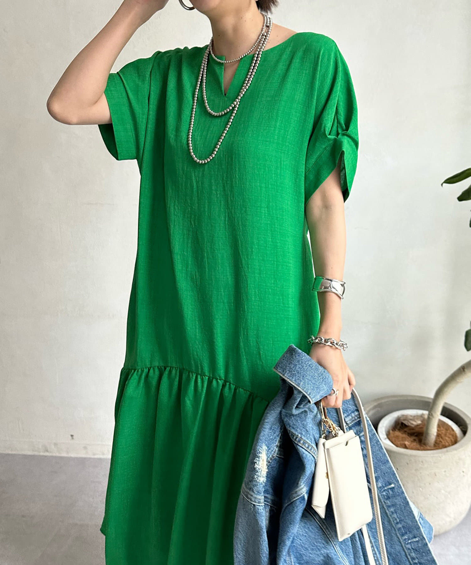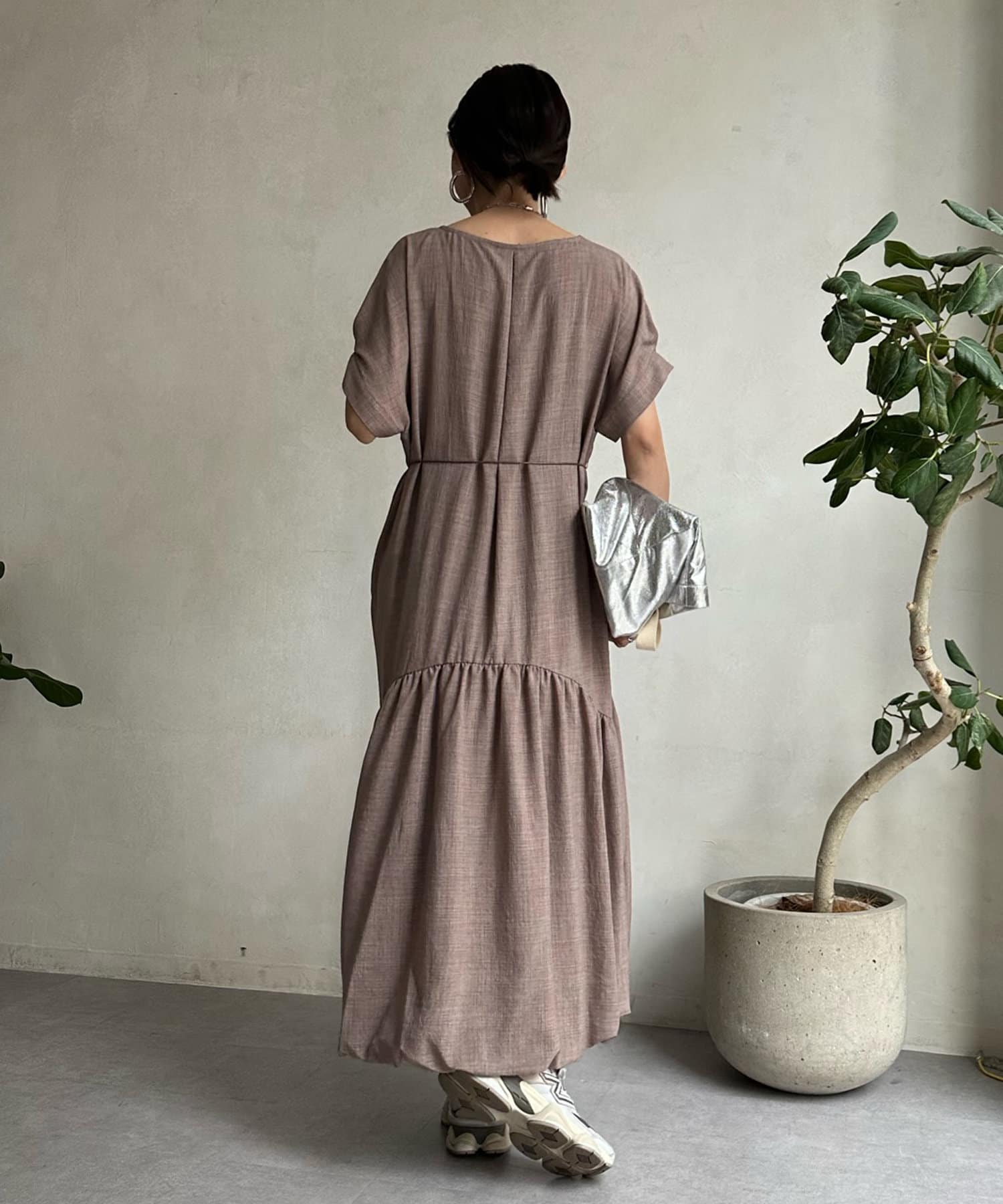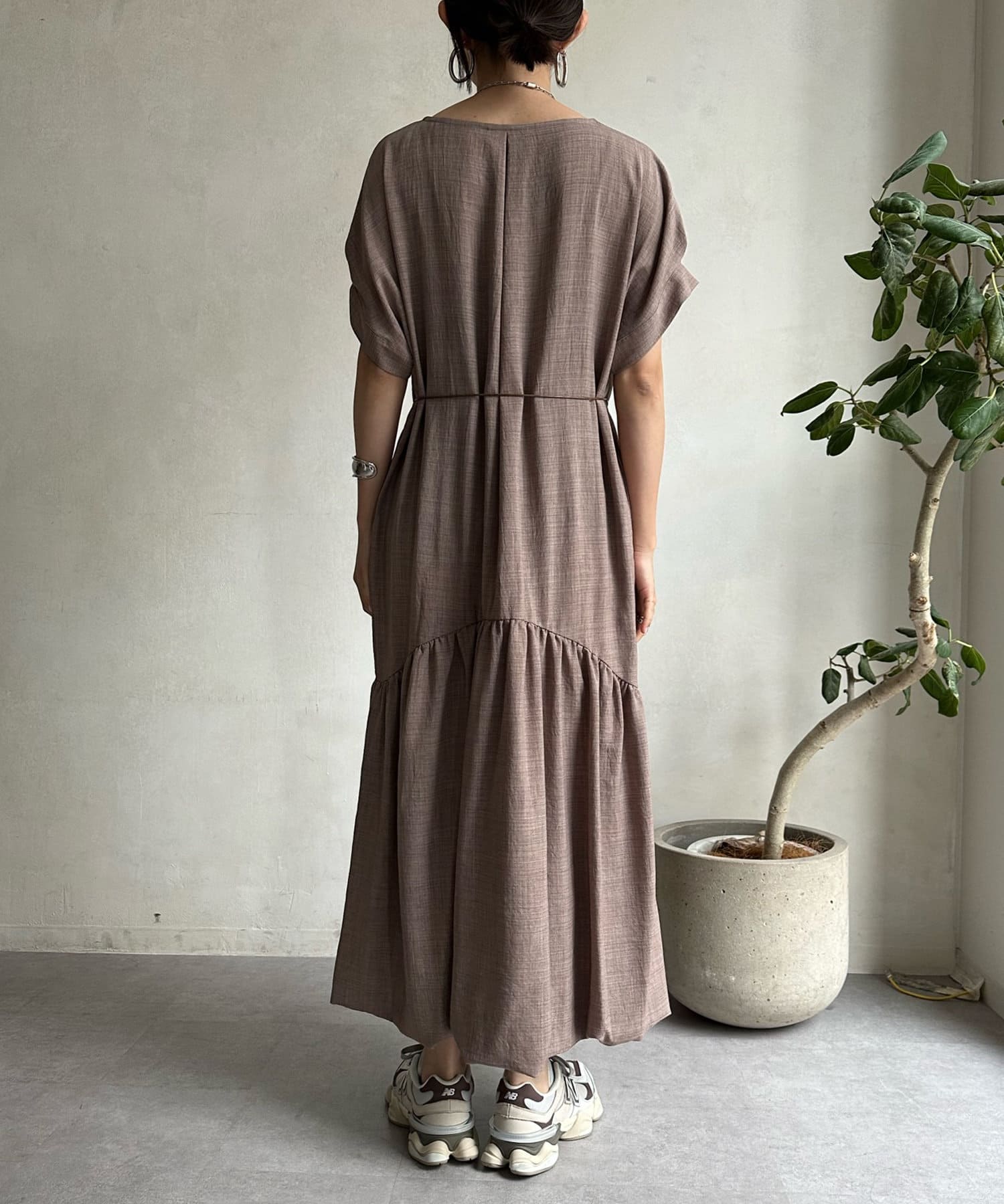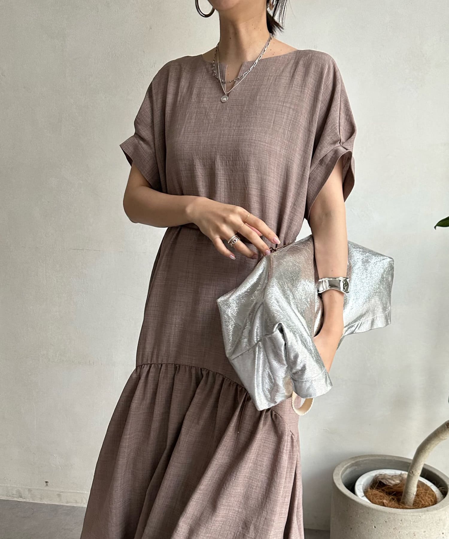 リネンライクで表情のある生地感とすこし落ち着いたカラーリングが甘すぎず、大人女子にぴったりな1着です。