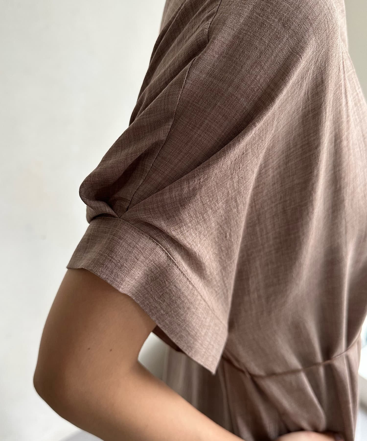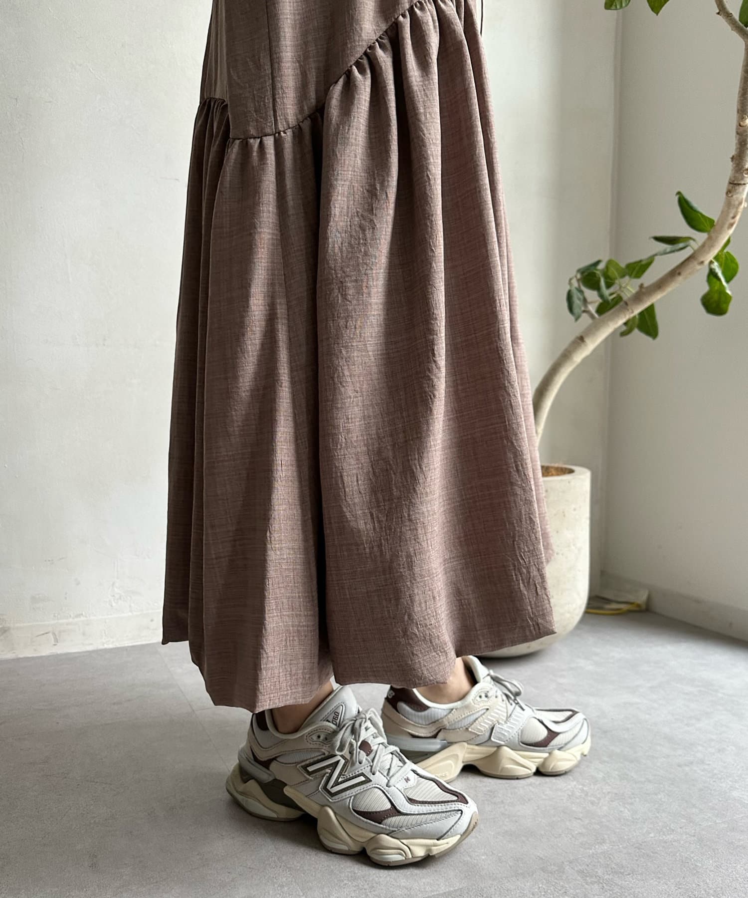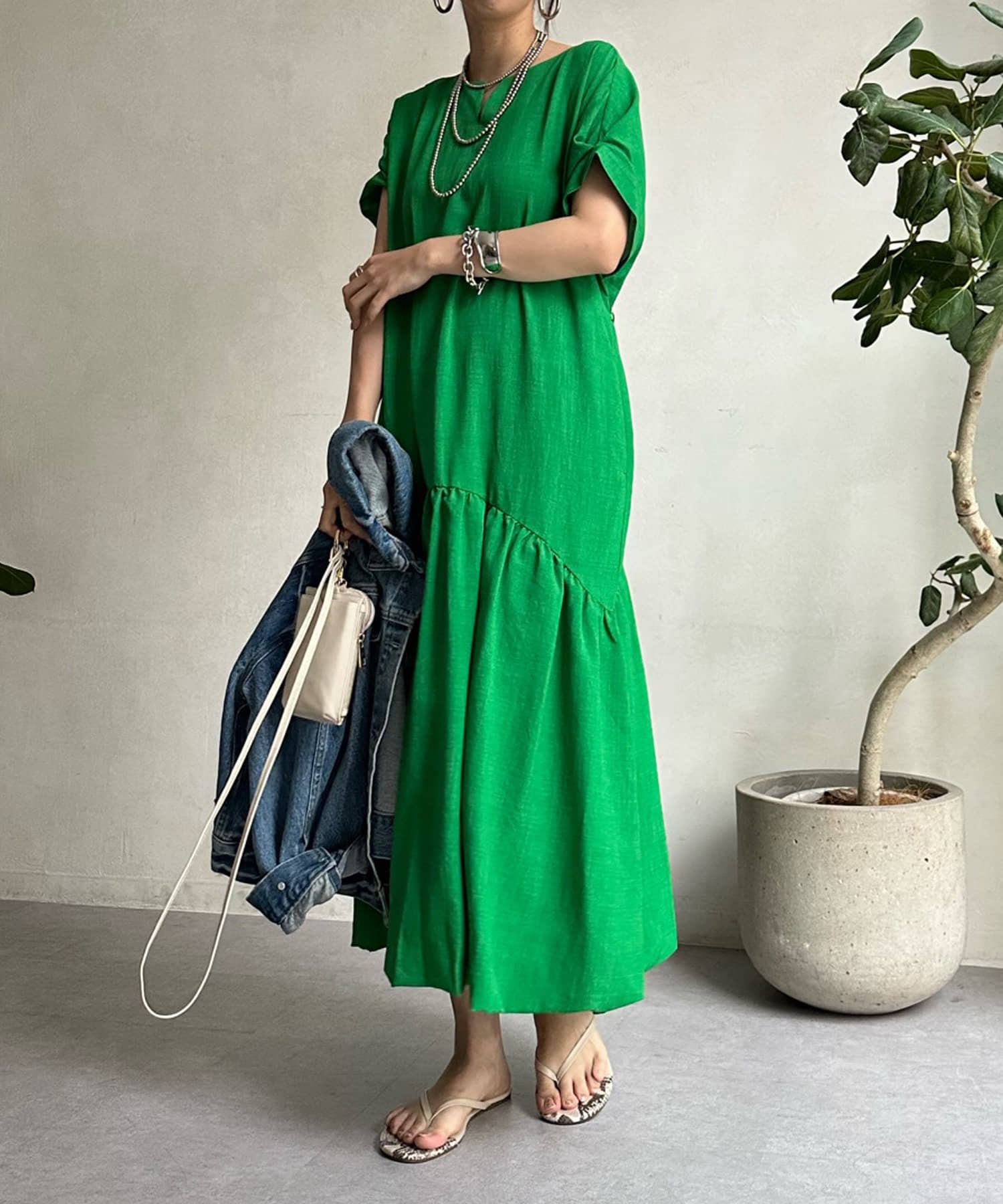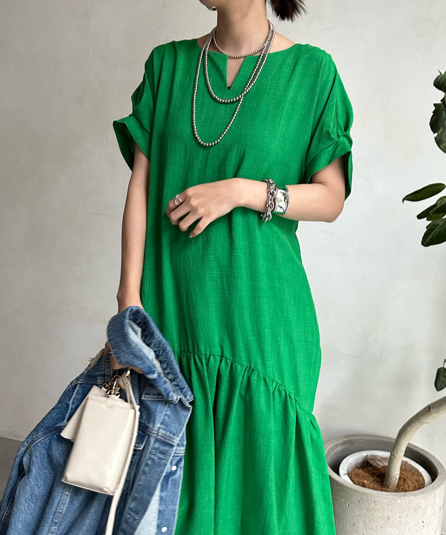 リネンライクで表情のある生地感とすこし落ち着いたカラーリングが甘すぎず、大人女子にぴったりな1着です。