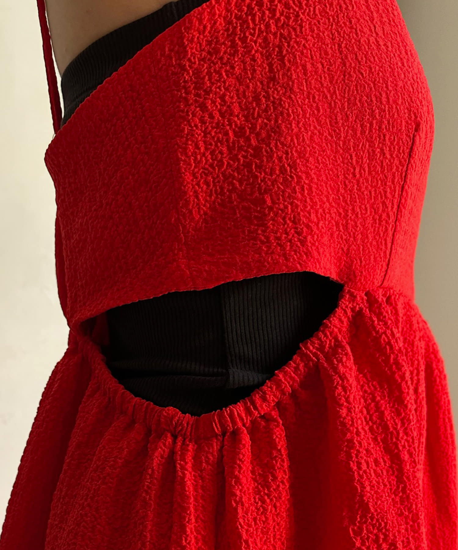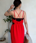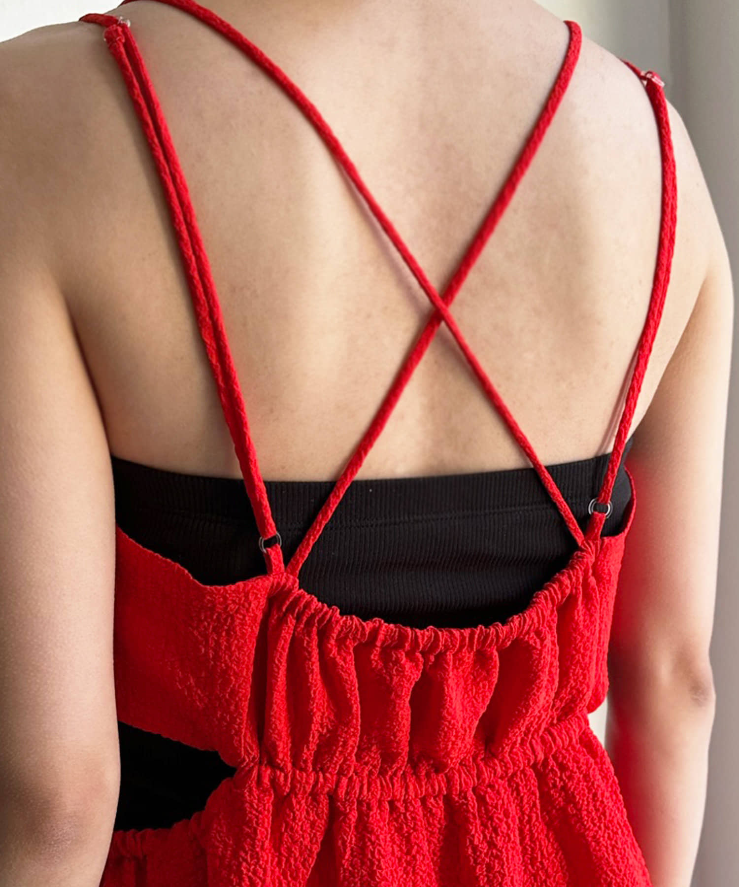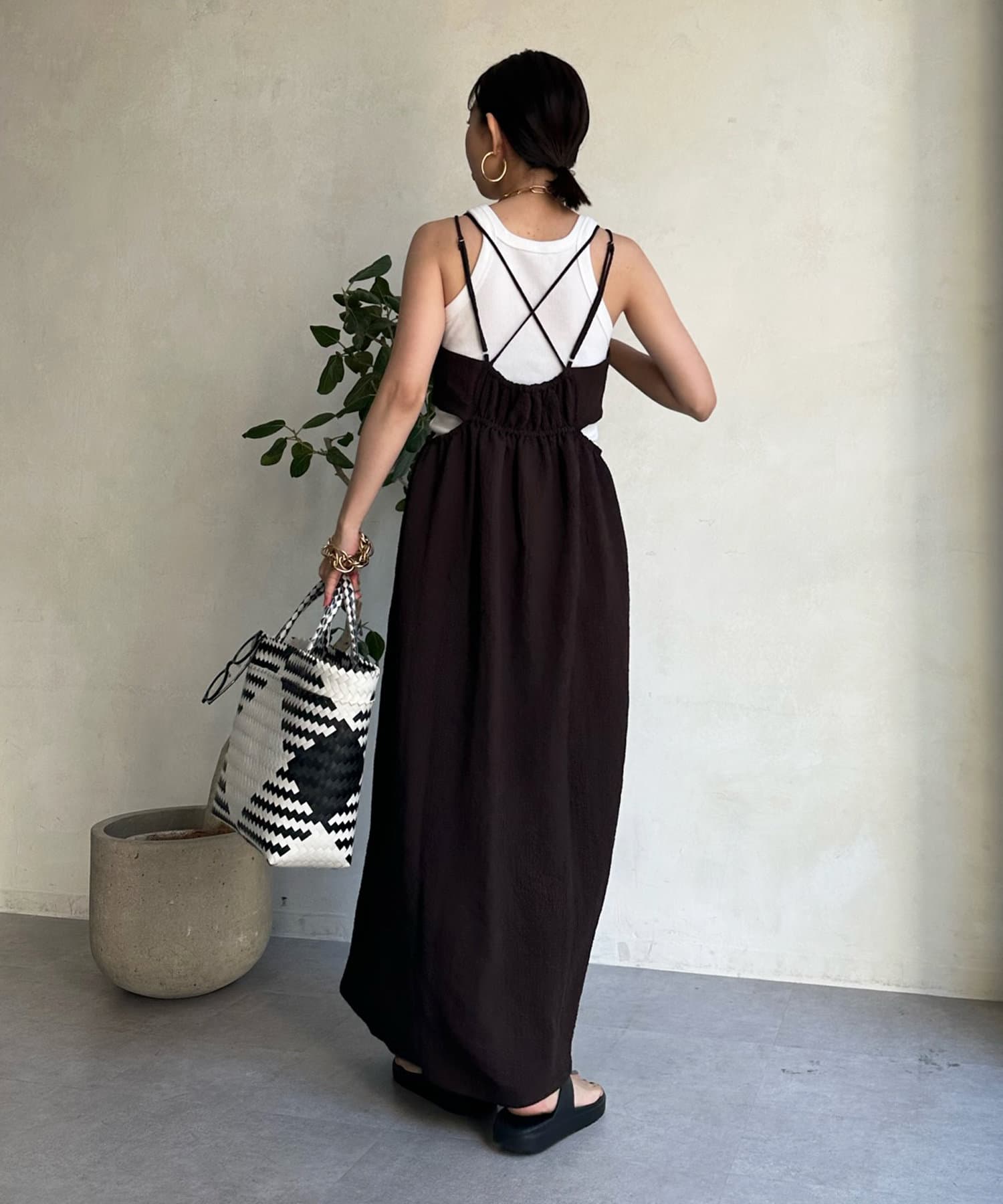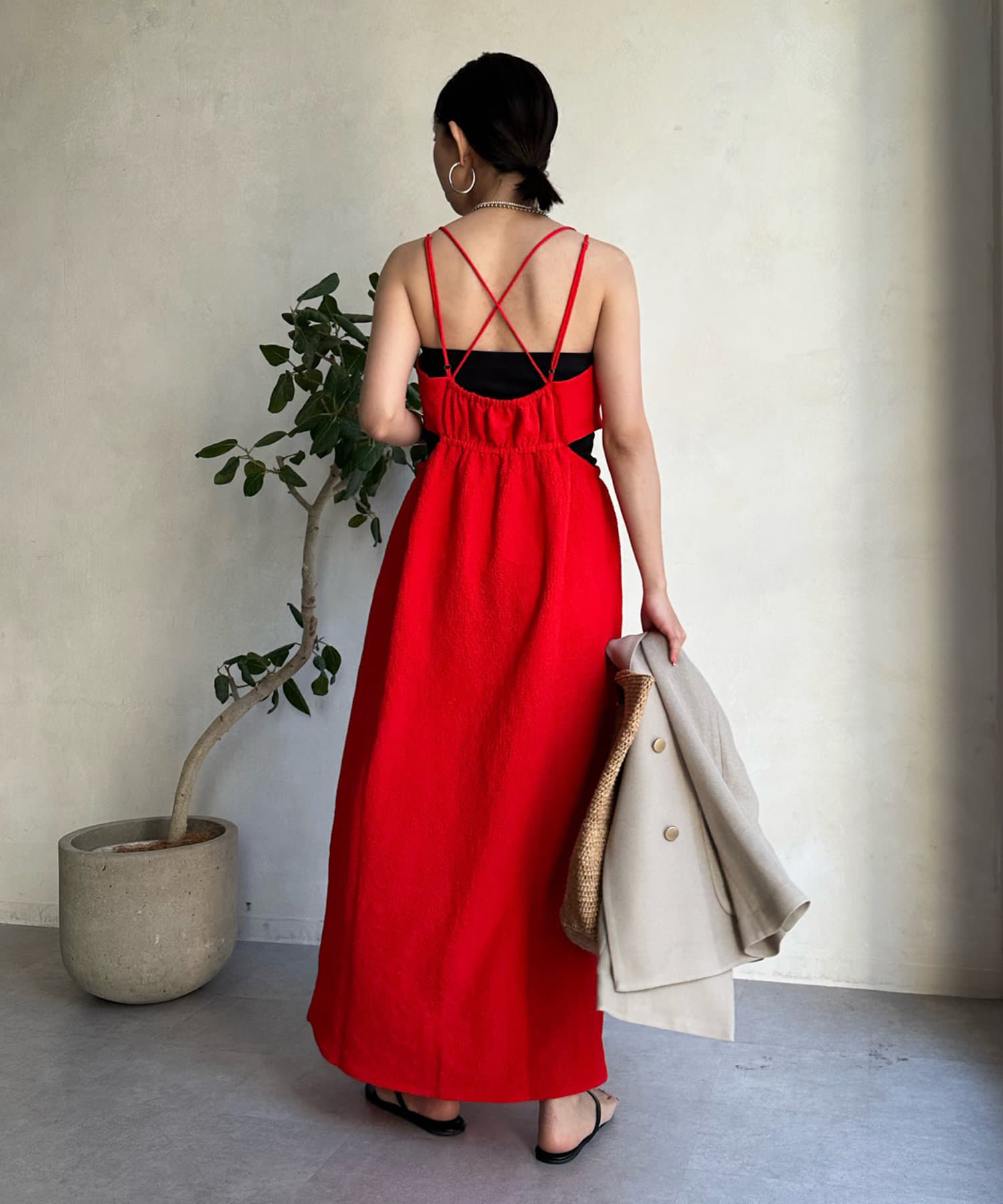 サイドの開きとクロスになった肩紐で、デザインの魅力がたっぷり。