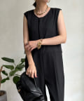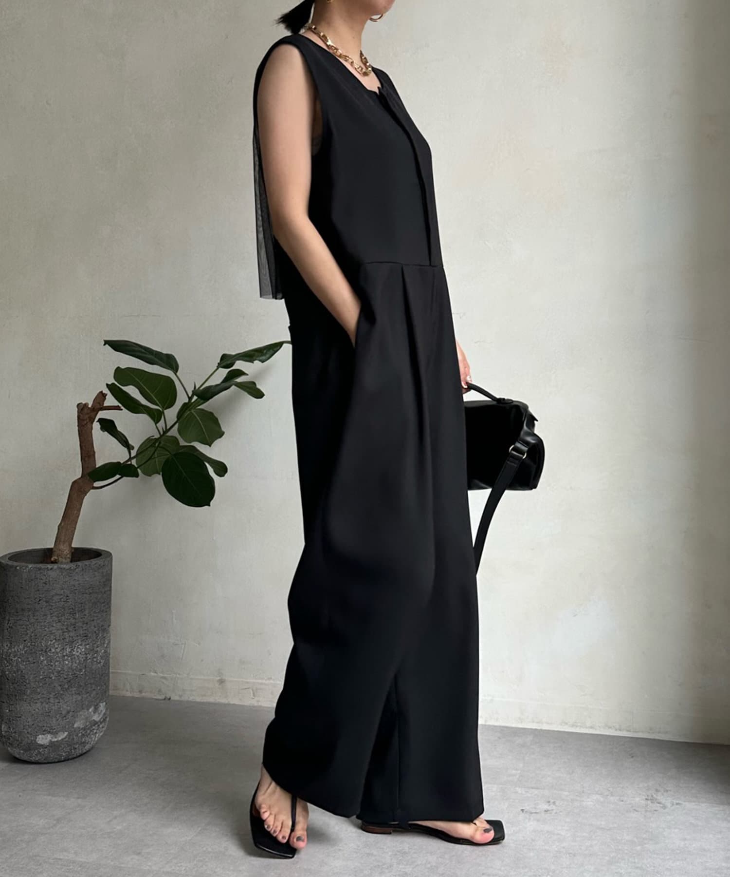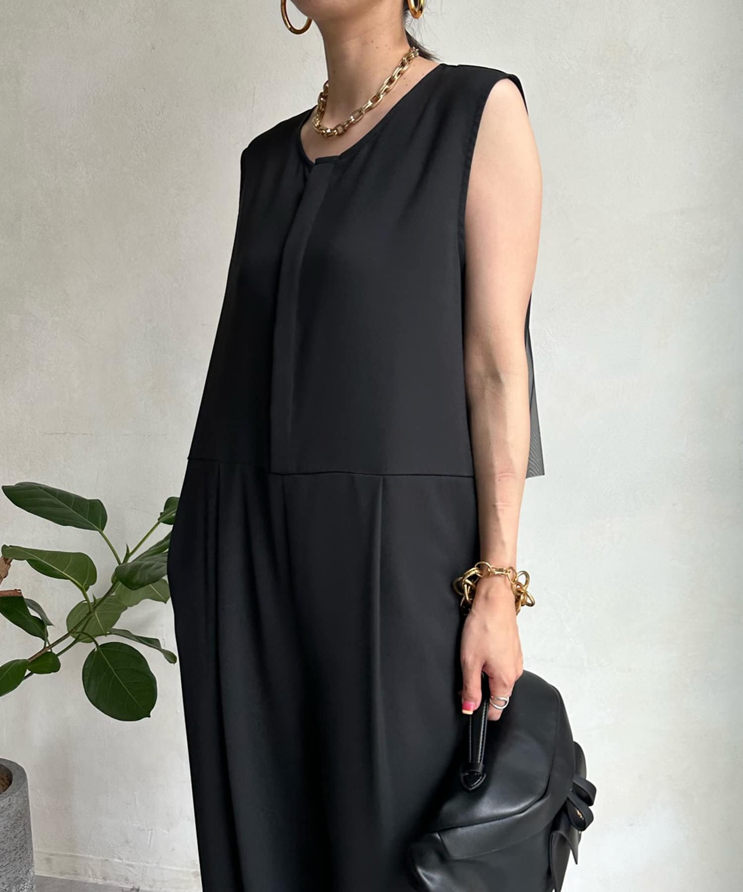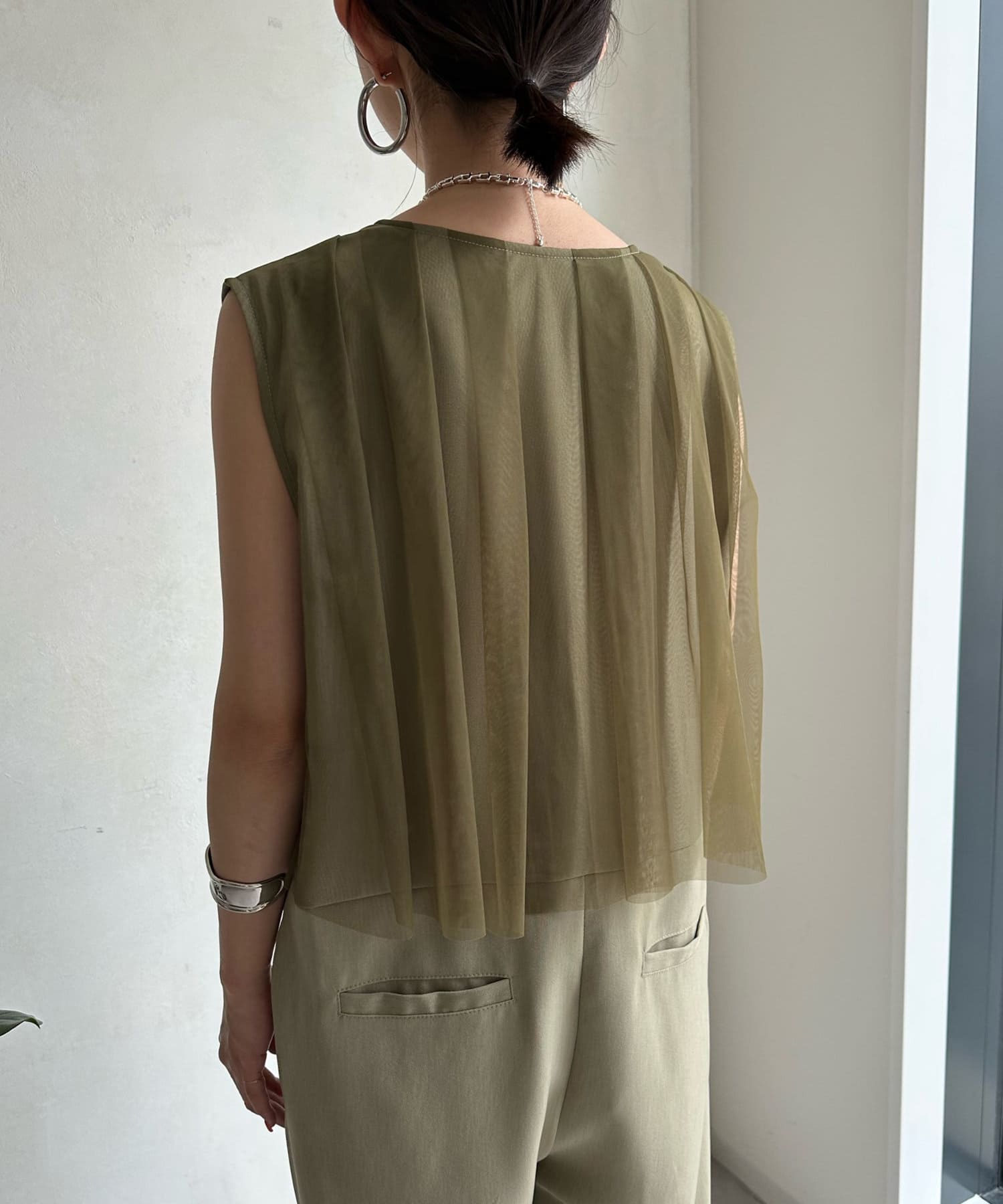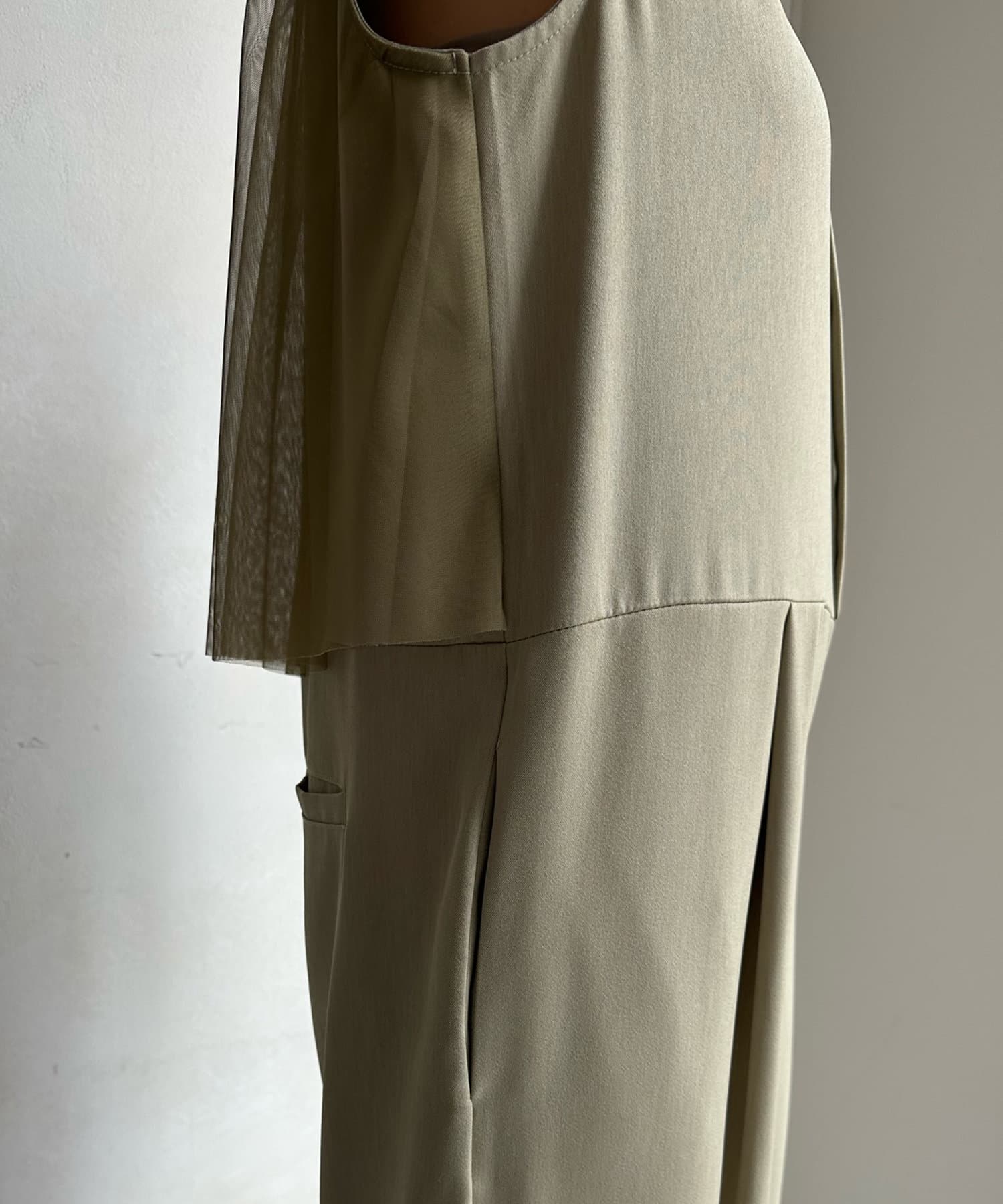 すっきりした印象のノースリーブ袖に、バックのチュール仕様がレディライクな印象に!