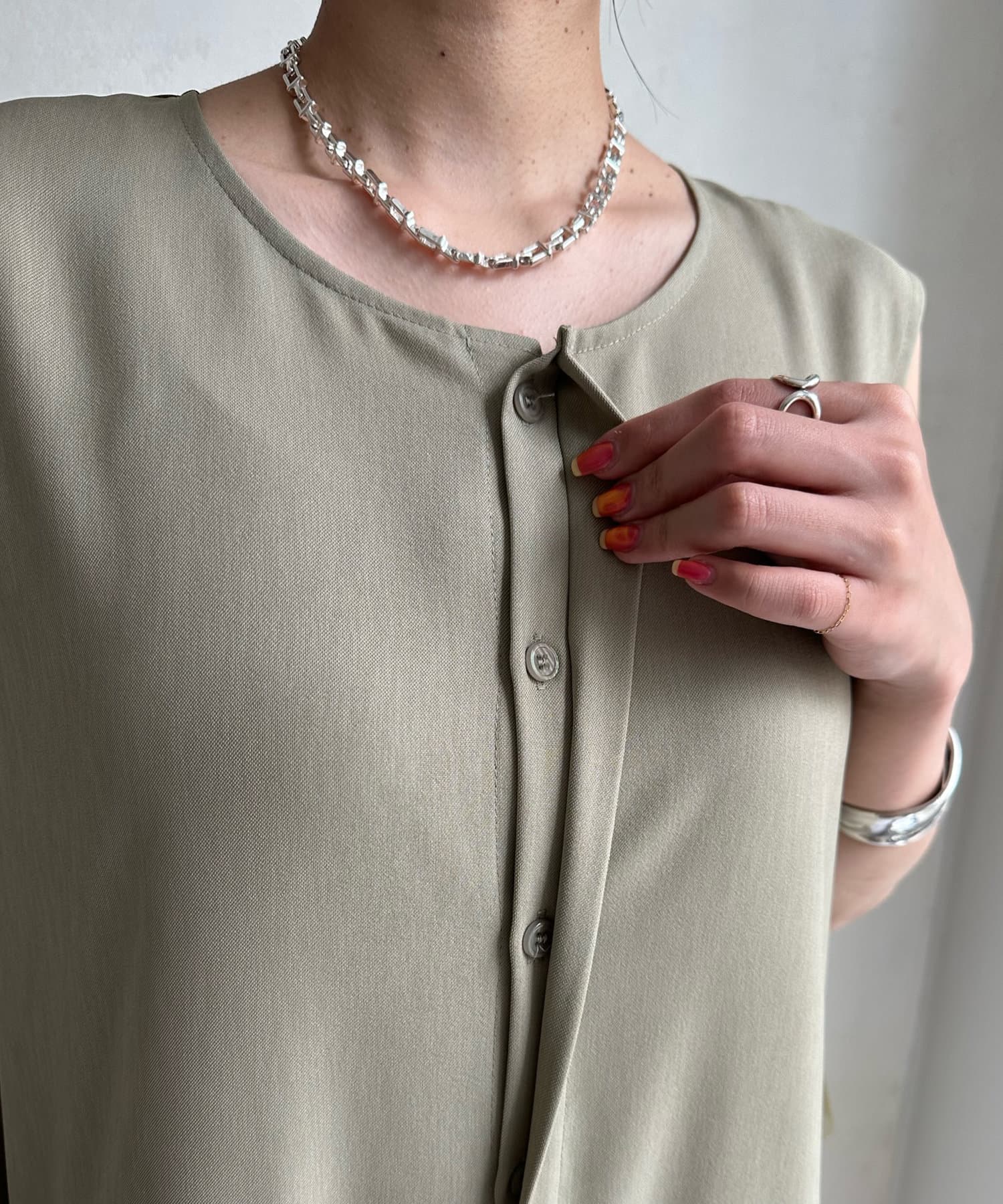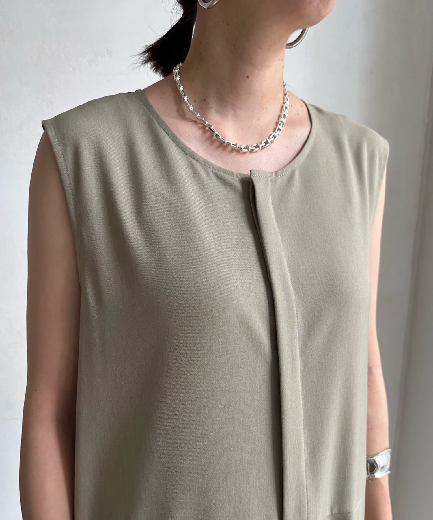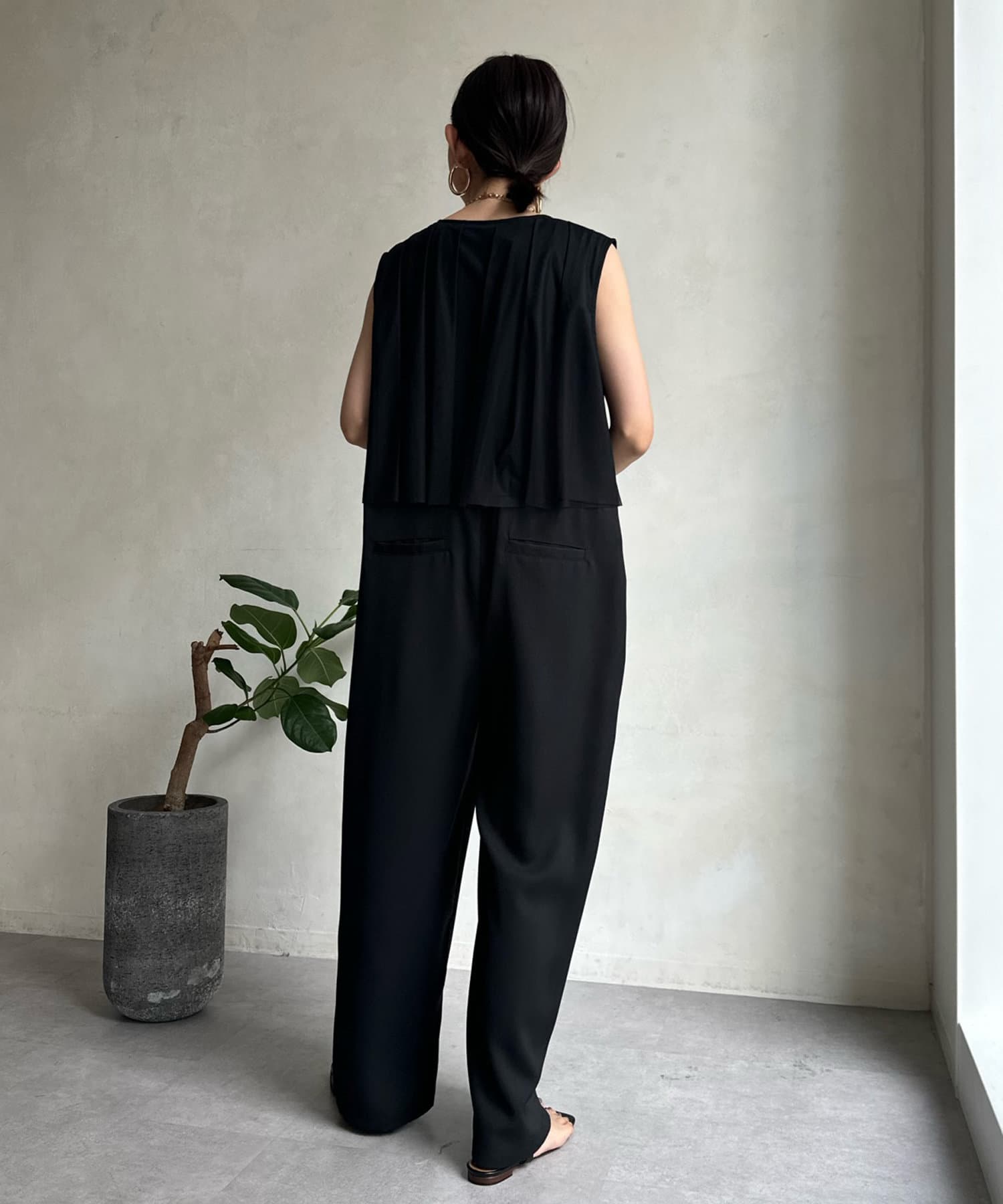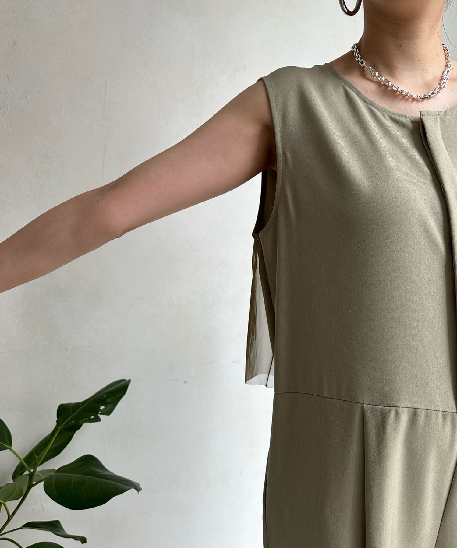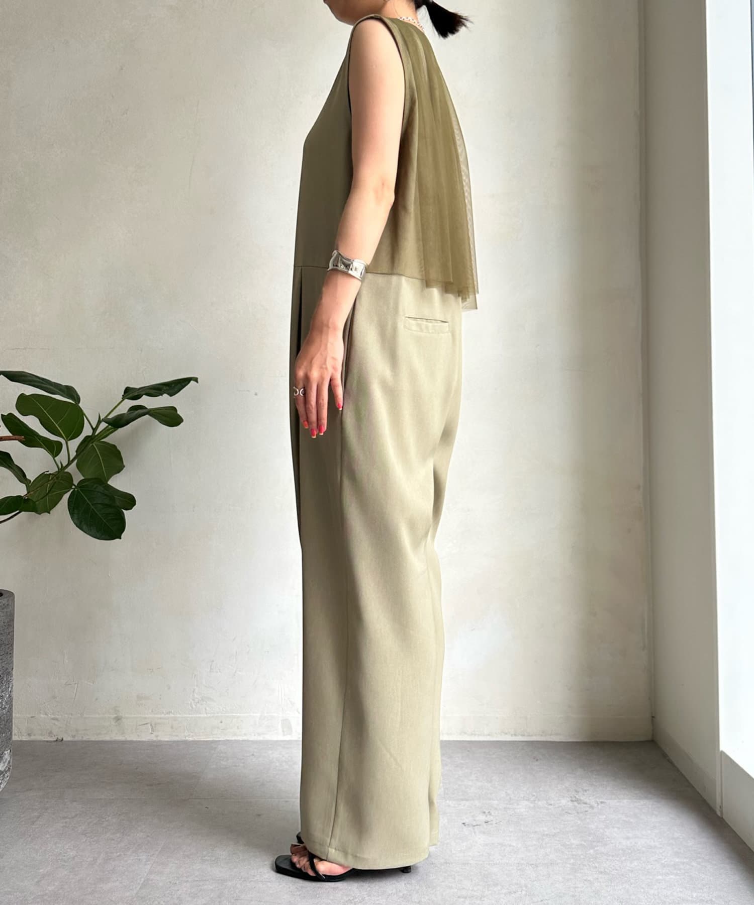 すっきりした印象のノースリーブ袖に、バックのチュール仕様がレディライクな印象に!