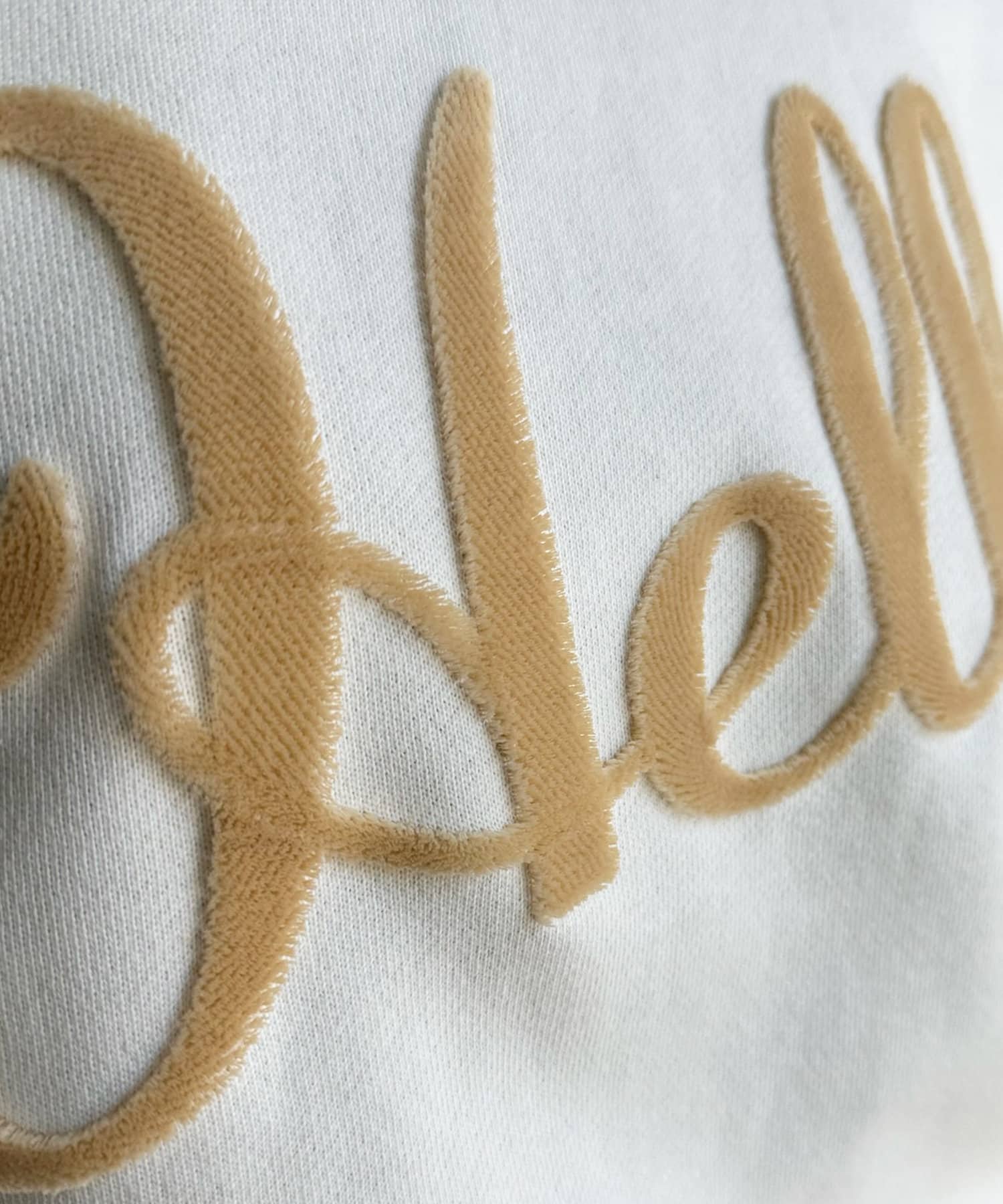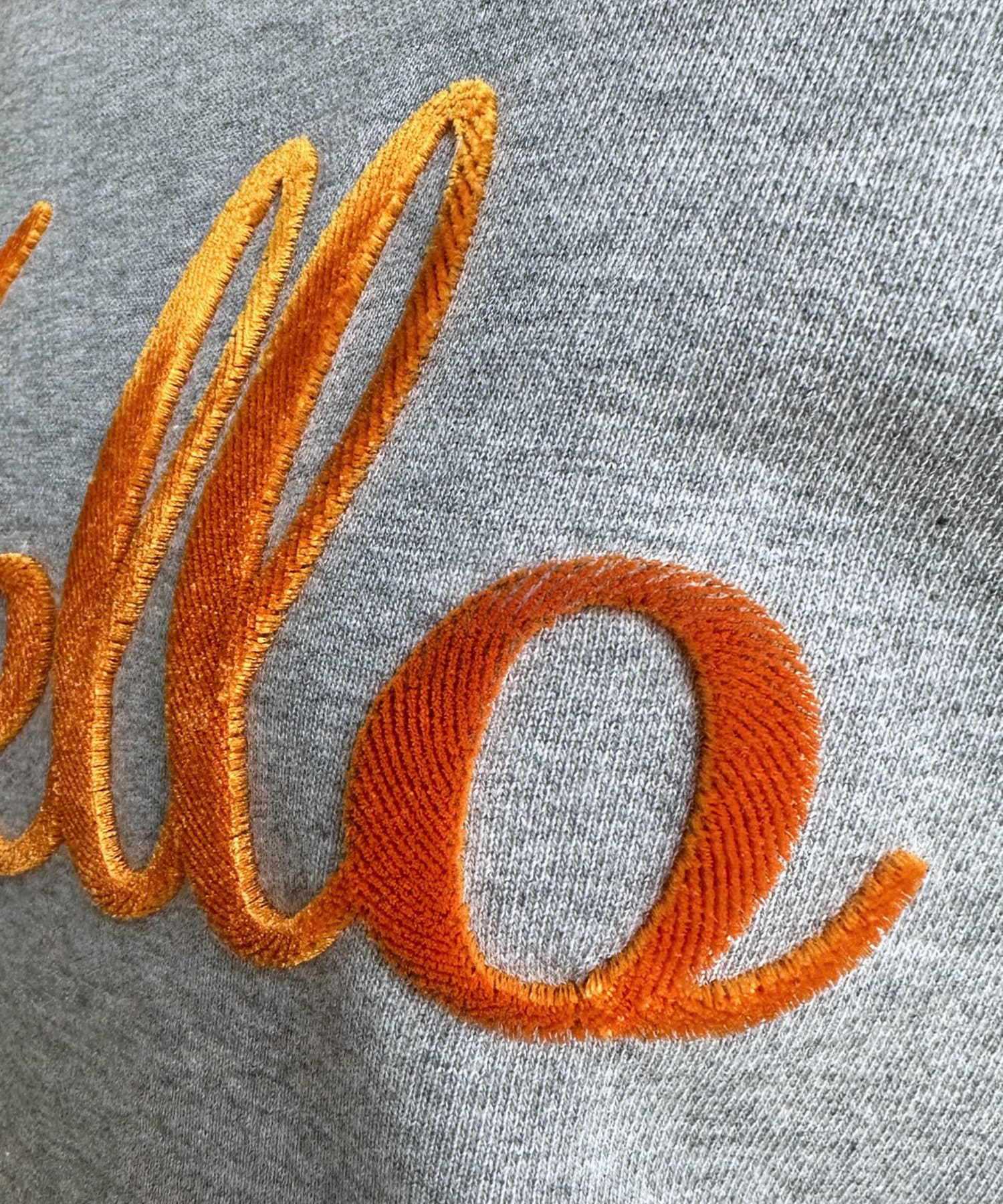 垂直に糸を直立させ、立体感のある表面を作り上げる、フワリ刺繍という刺繍方法を採用。