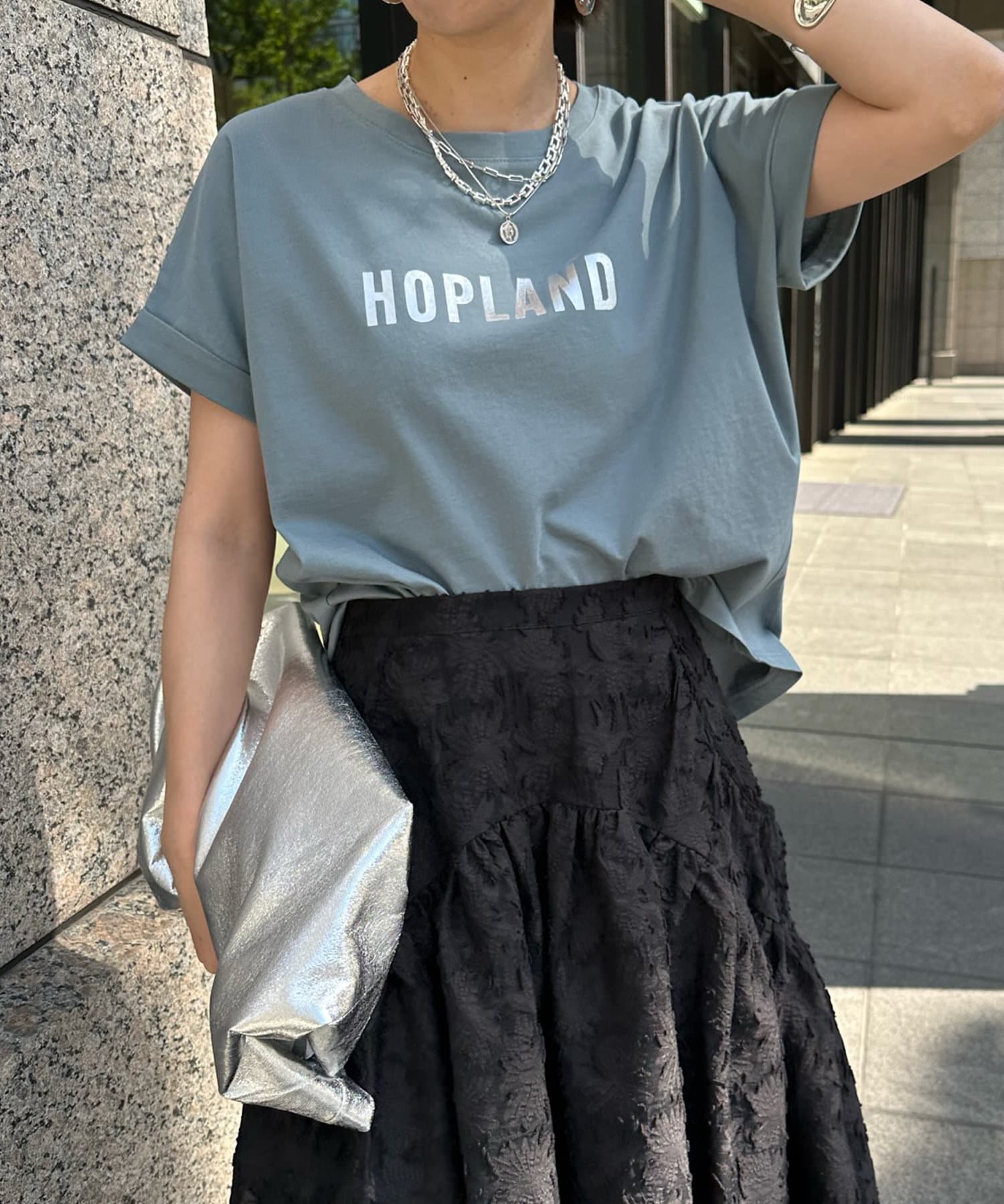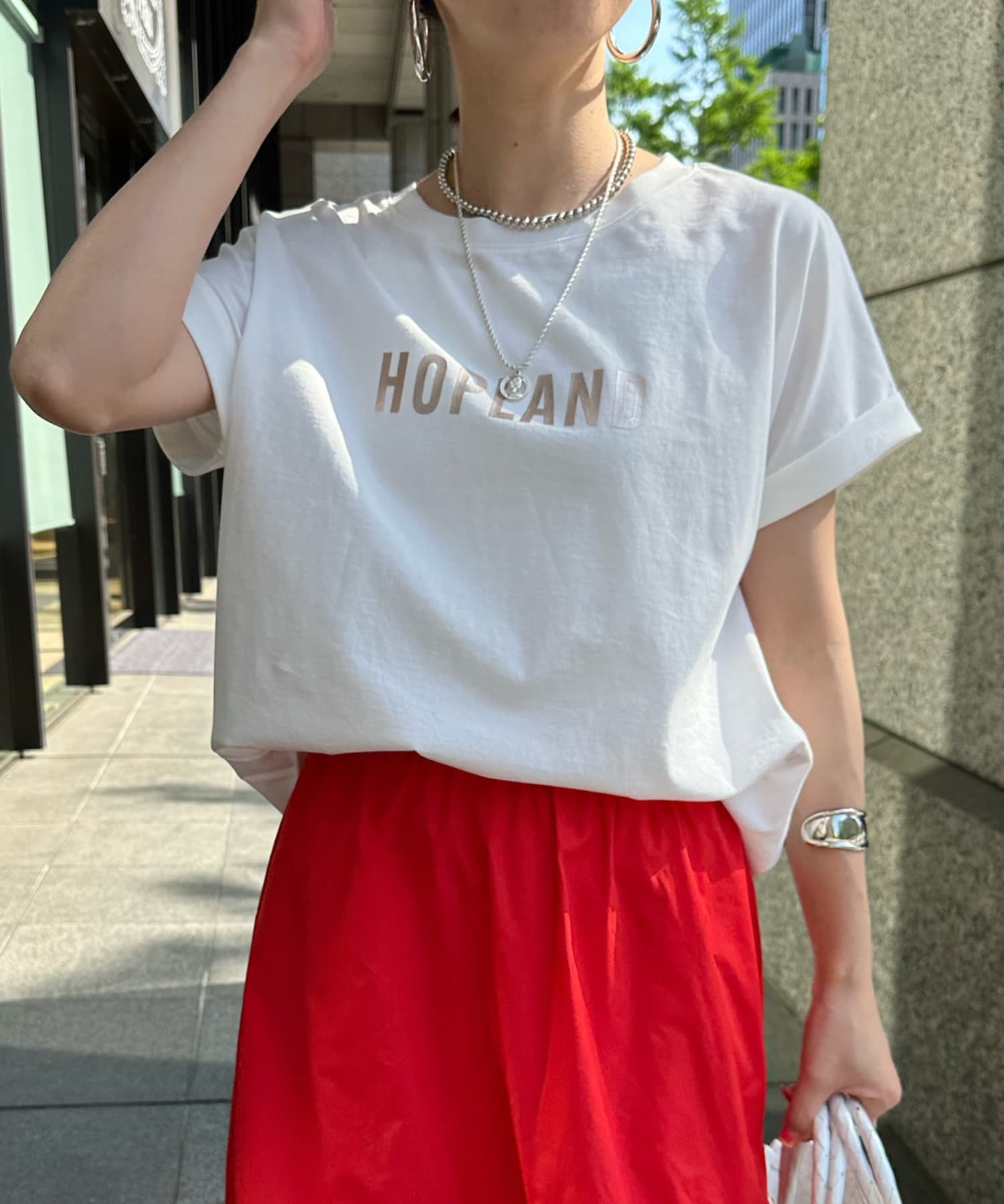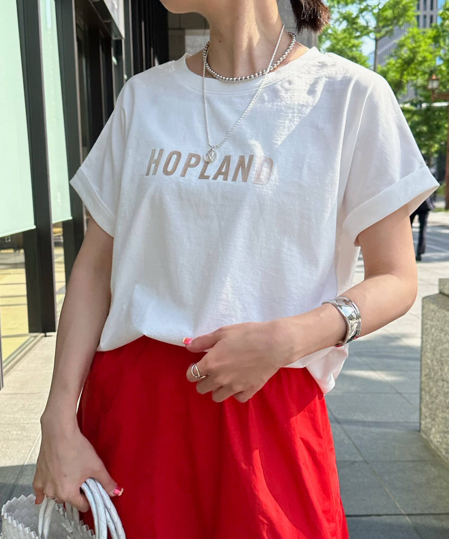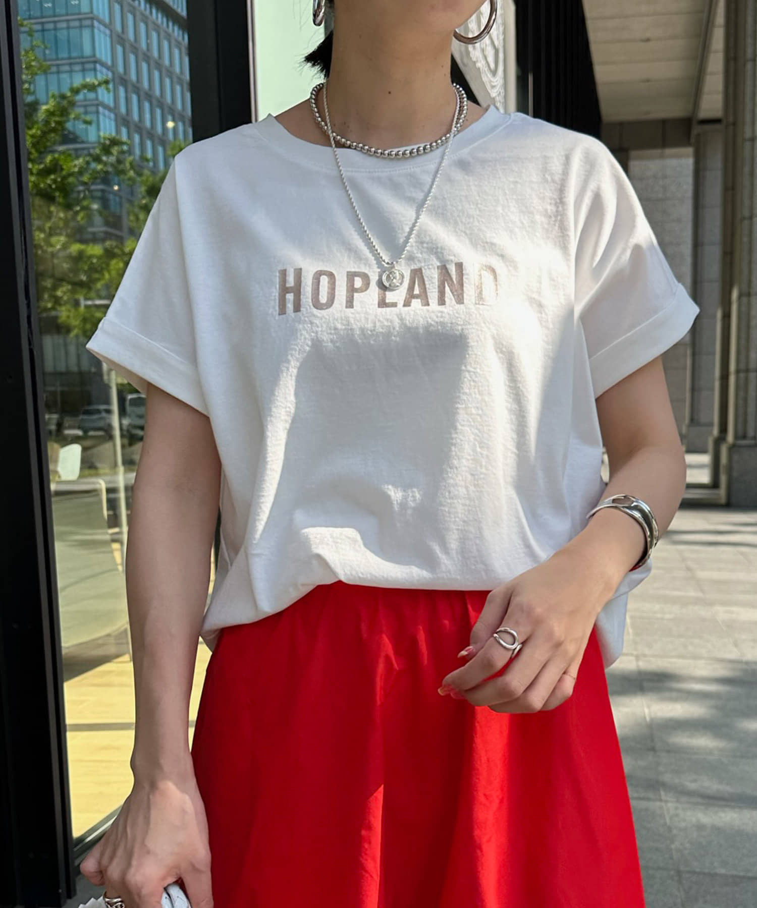 「HOPLAND」の箔プリントが、コーディネートの華やかなポイントとなってくれる1枚。