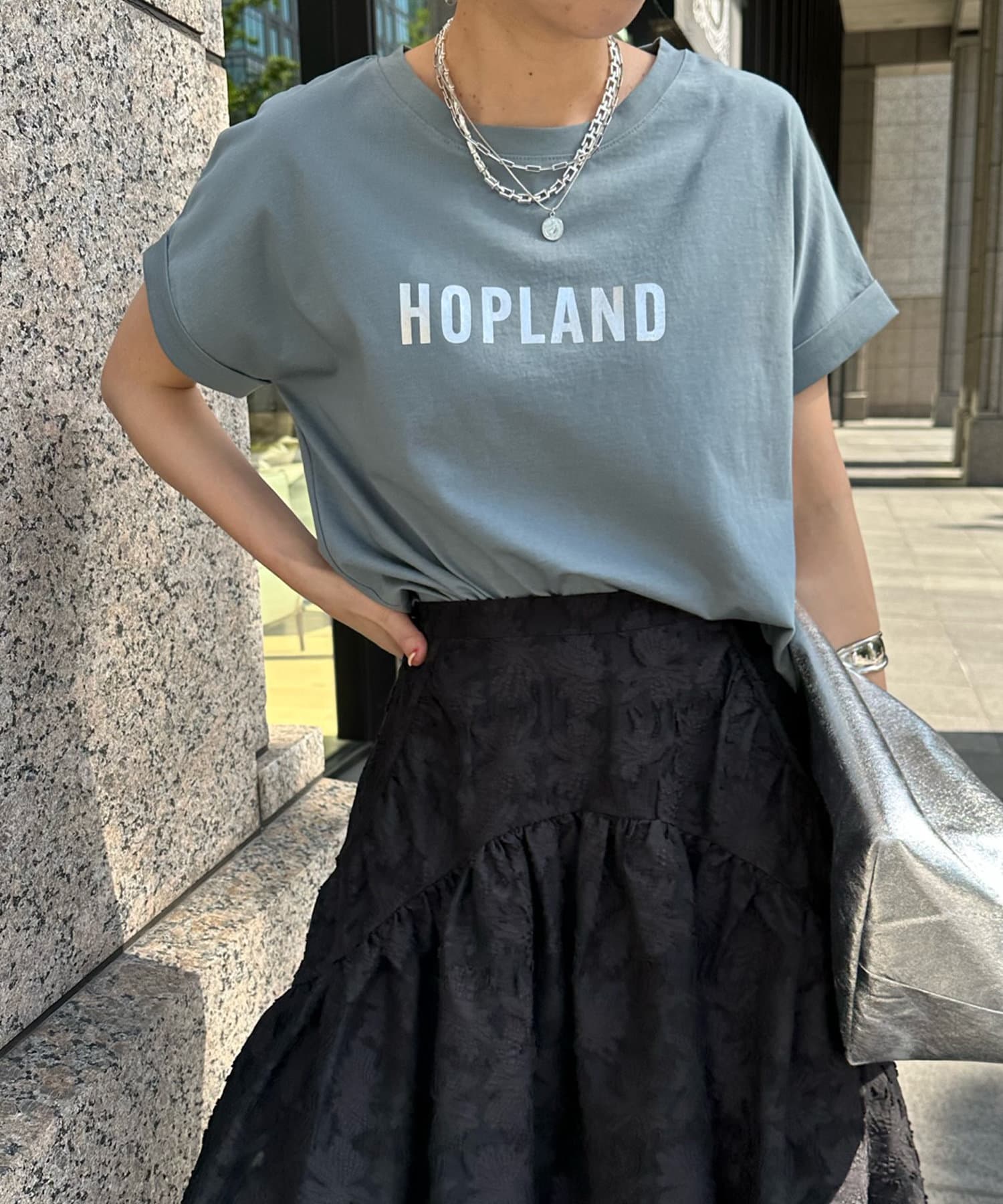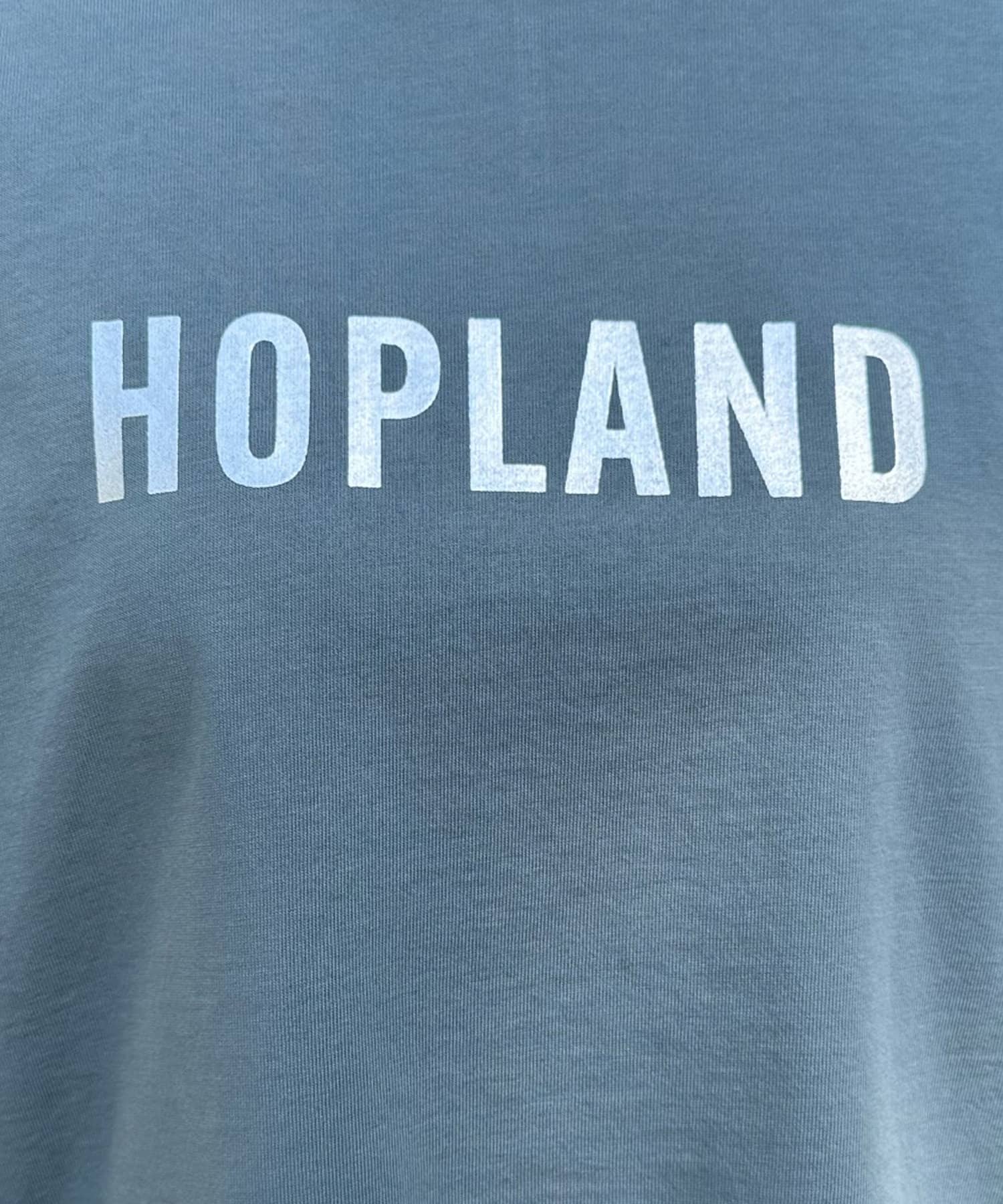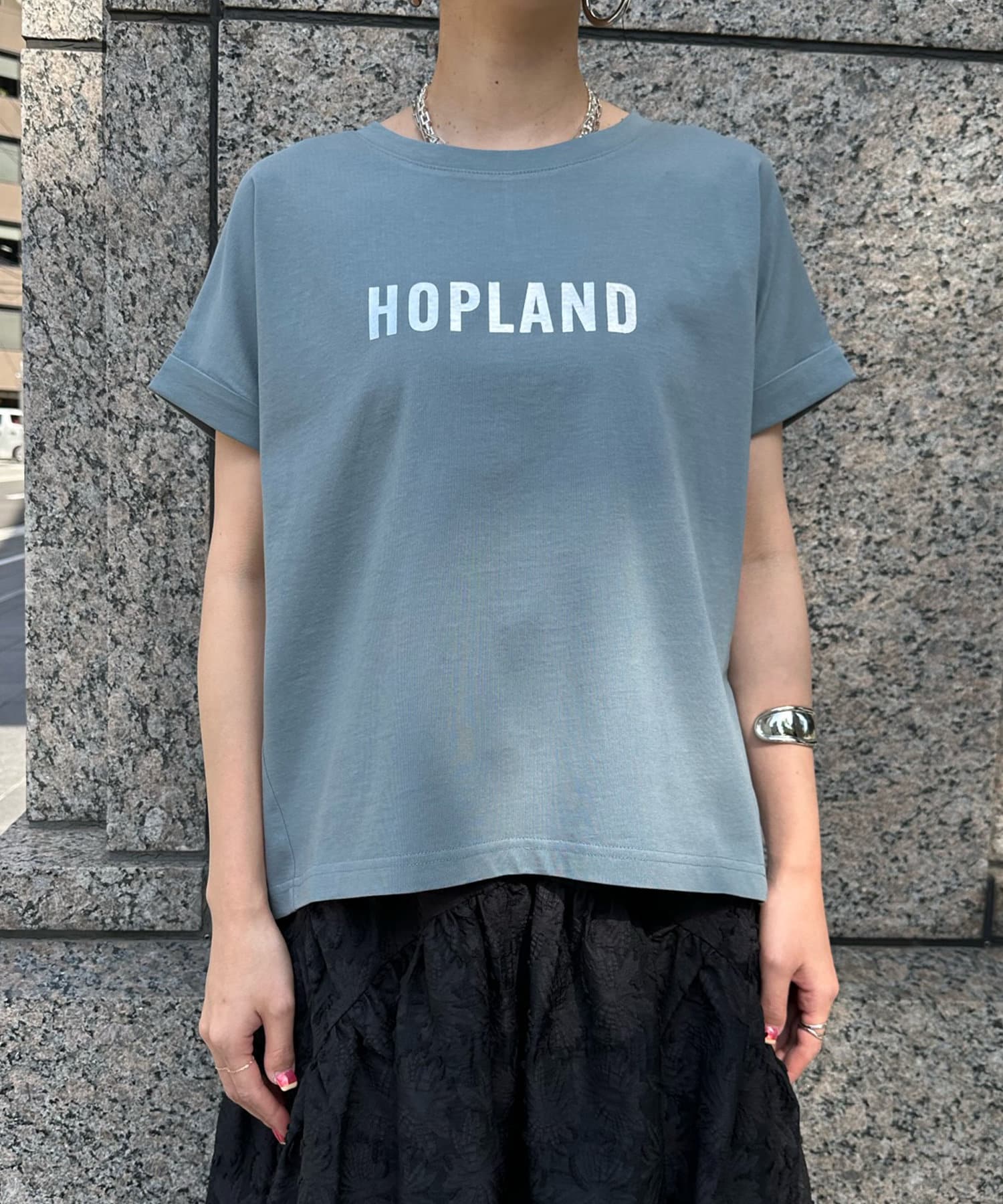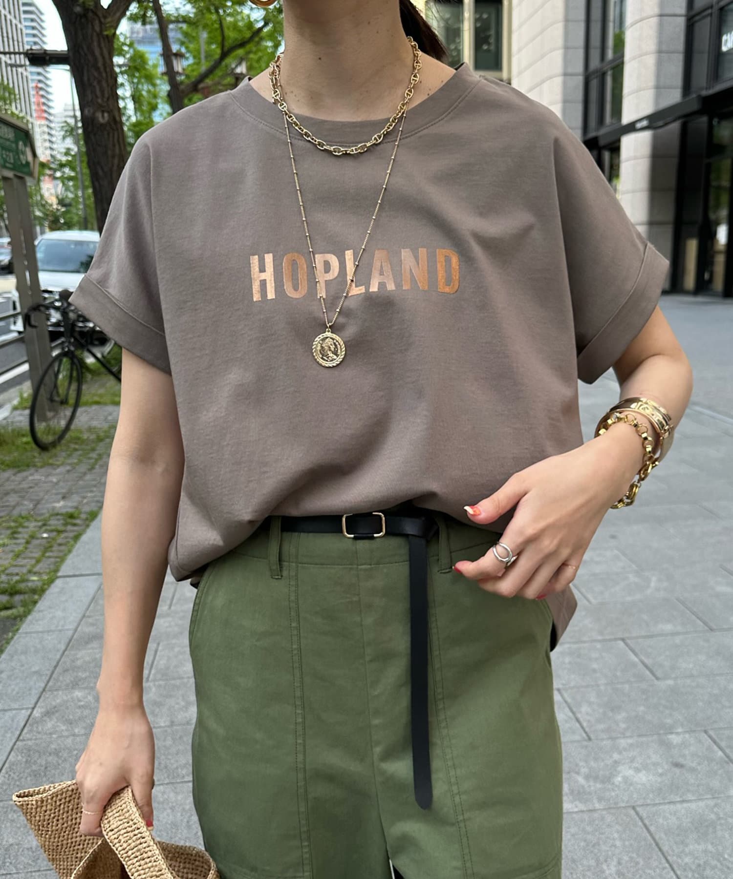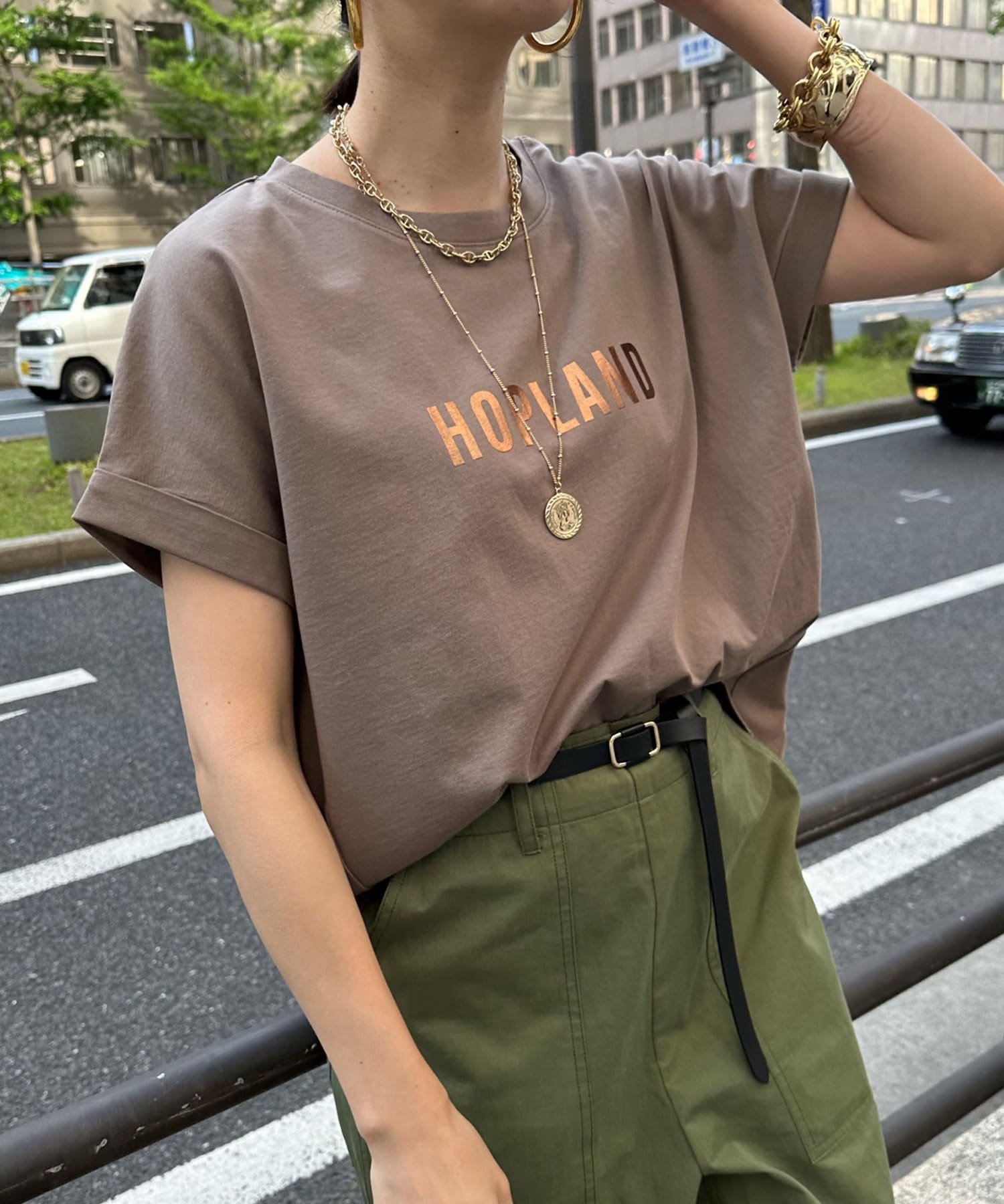 「HOPLAND」の箔プリントが、コーディネートの華やかなポイントとなってくれる1枚。