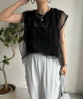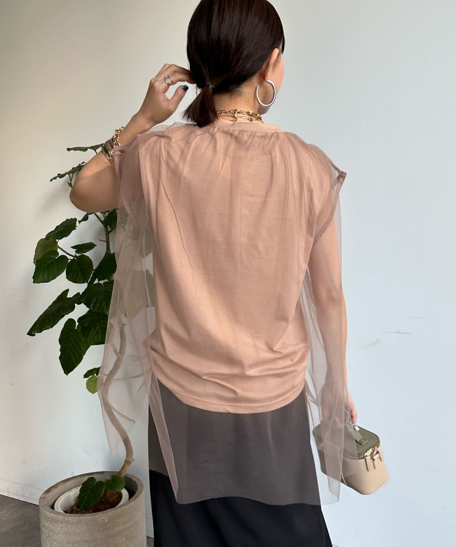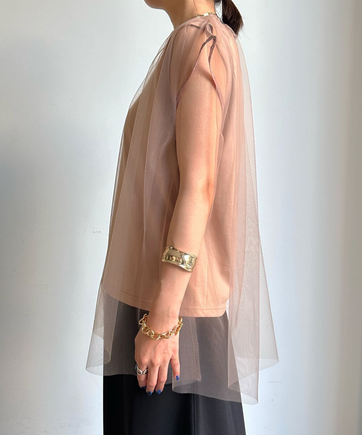 綿100%で着心地の良いカットソー素材に、トレンドライクなチュール素材をプラスした1枚でサマになるデザインtee。