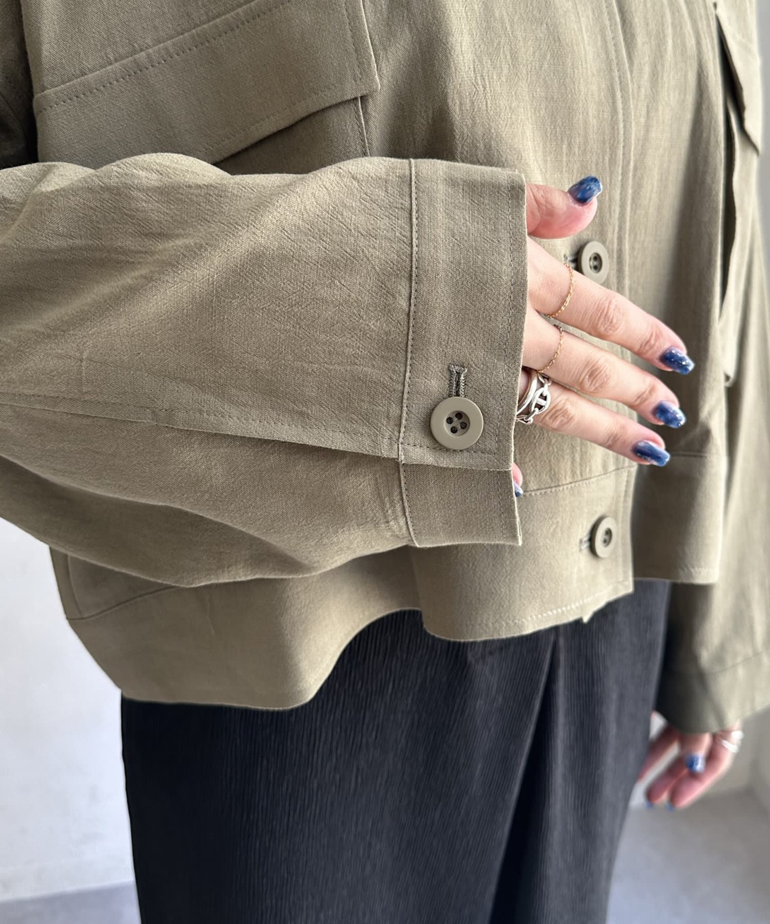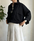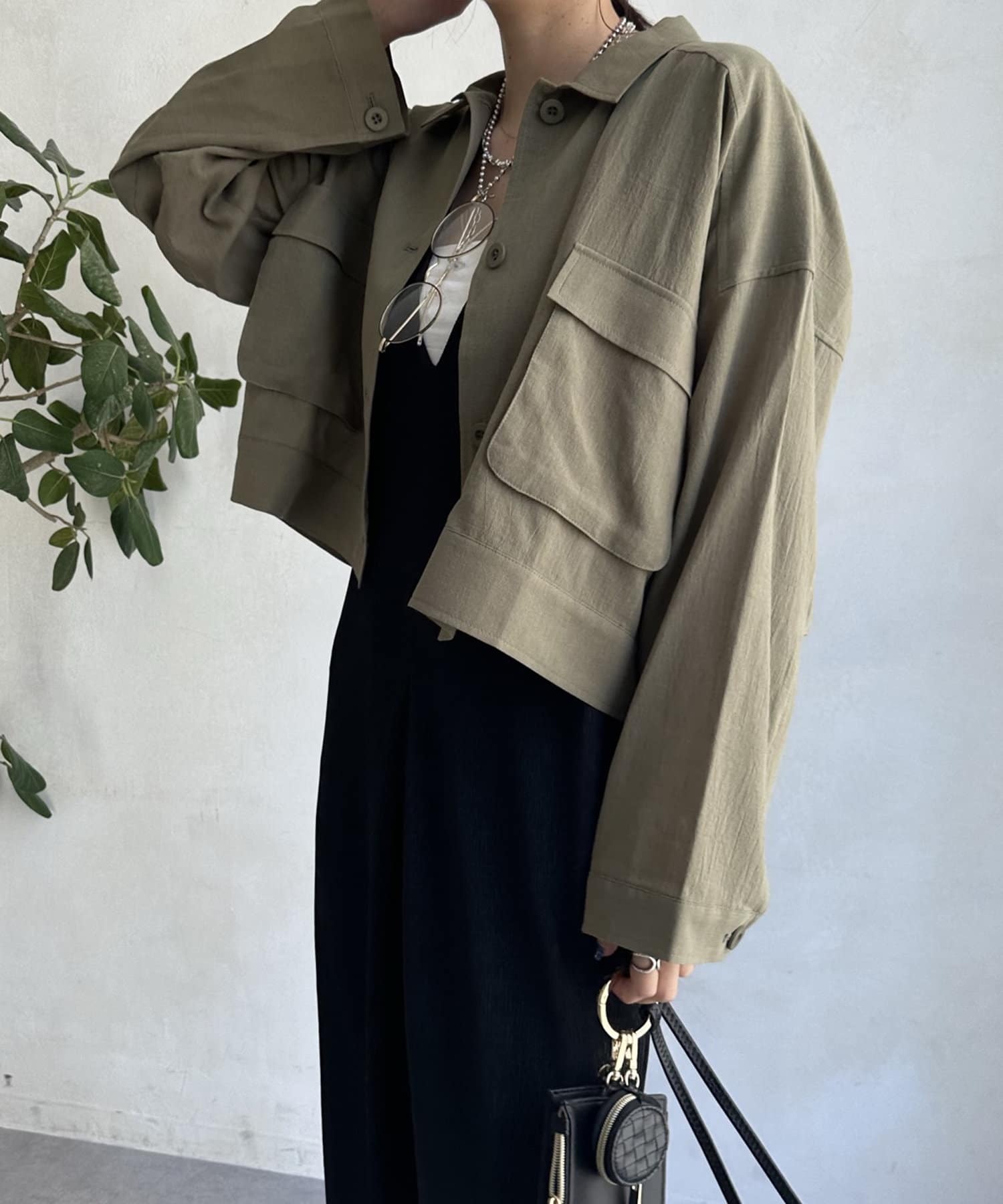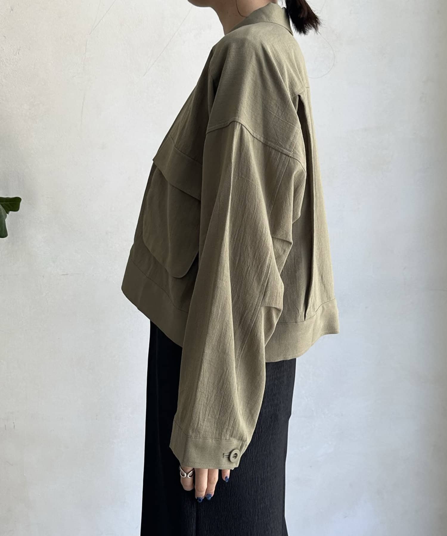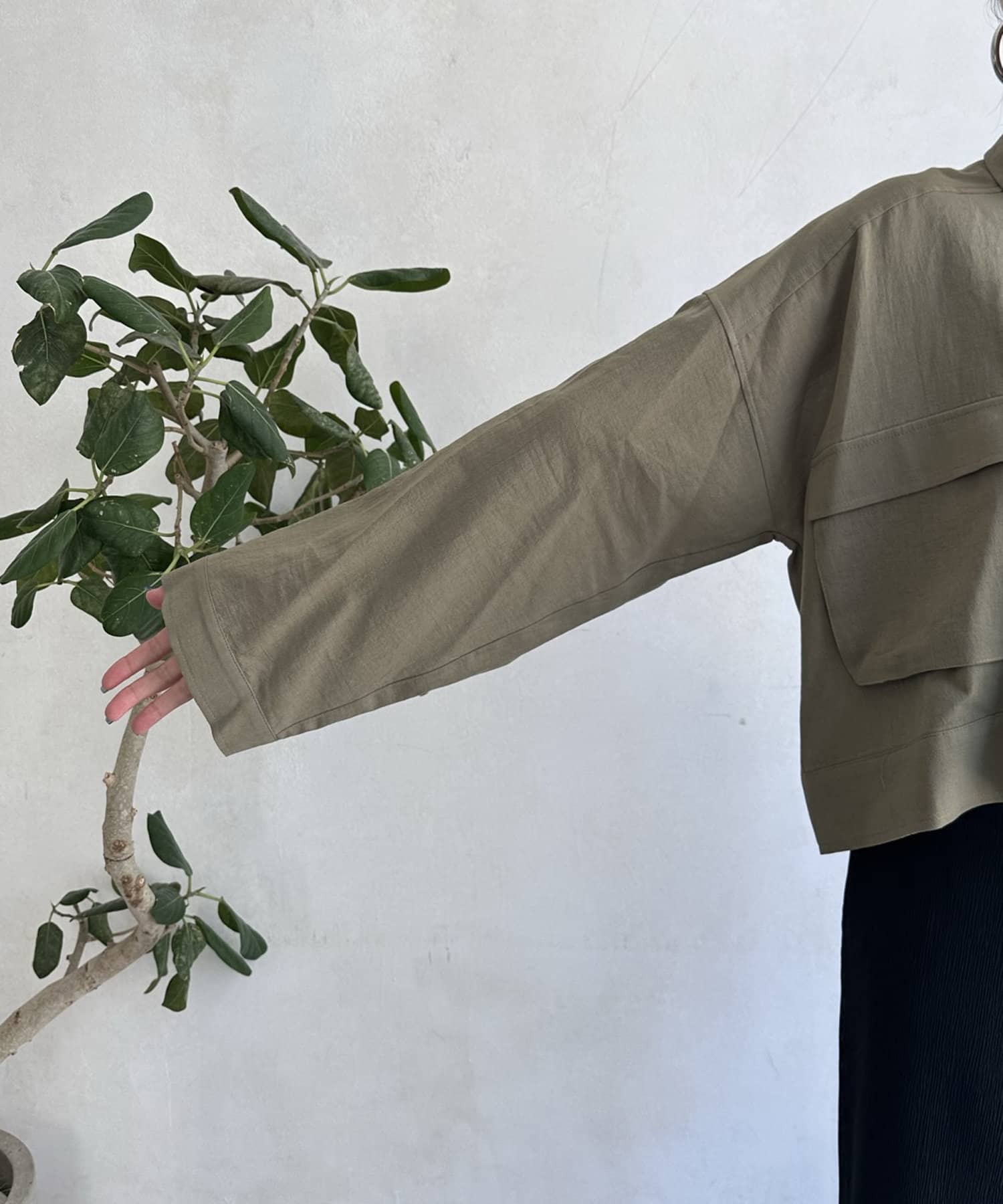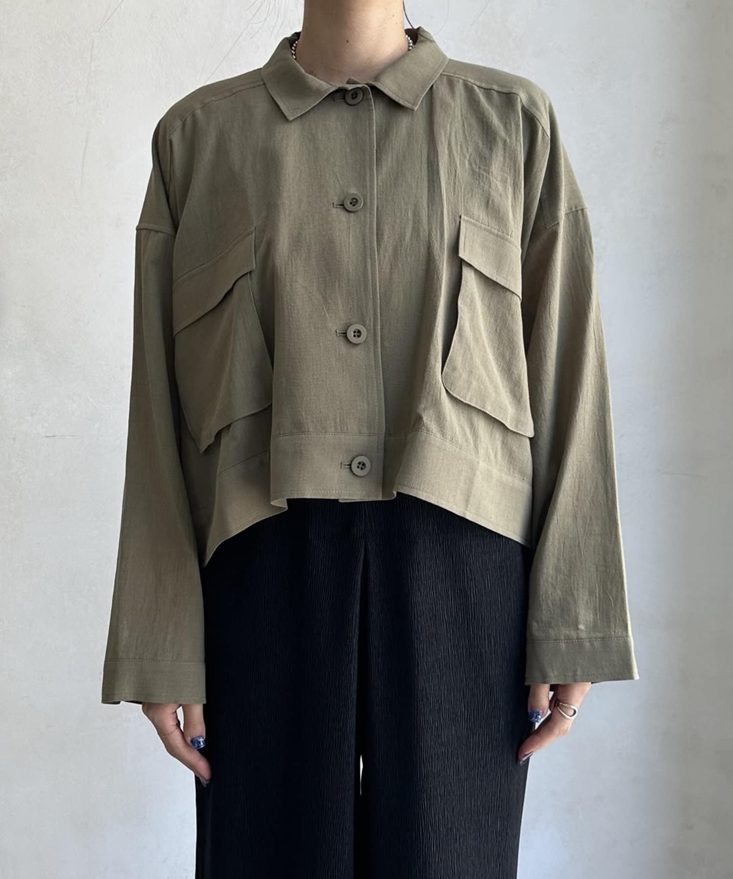 胸に大きなポケットとトレンドのショート丈がポイント。