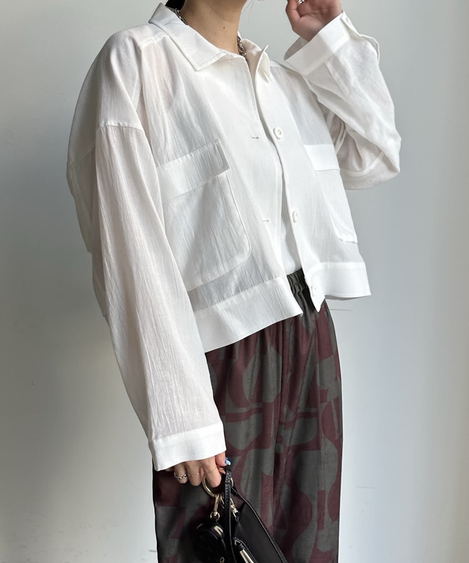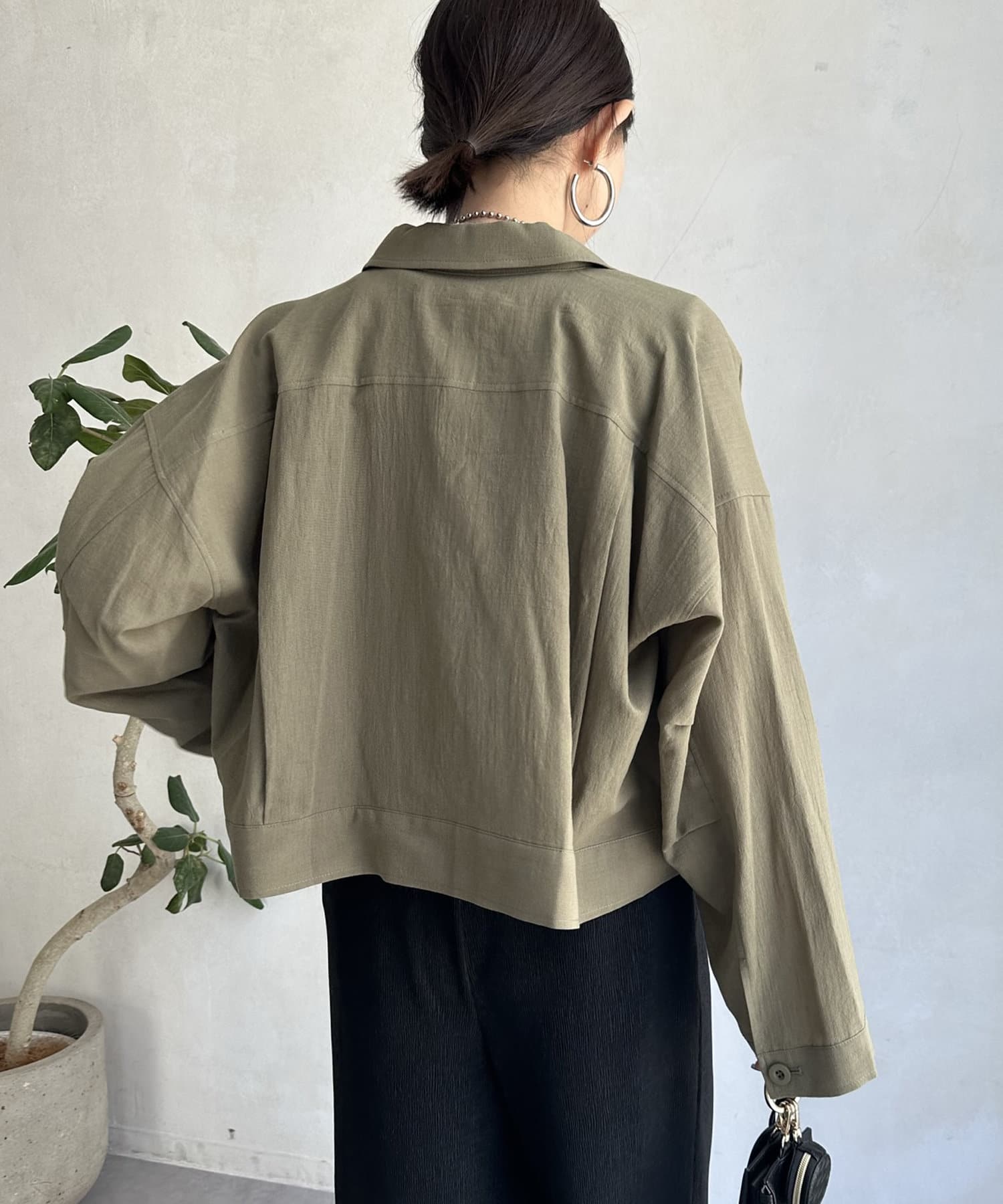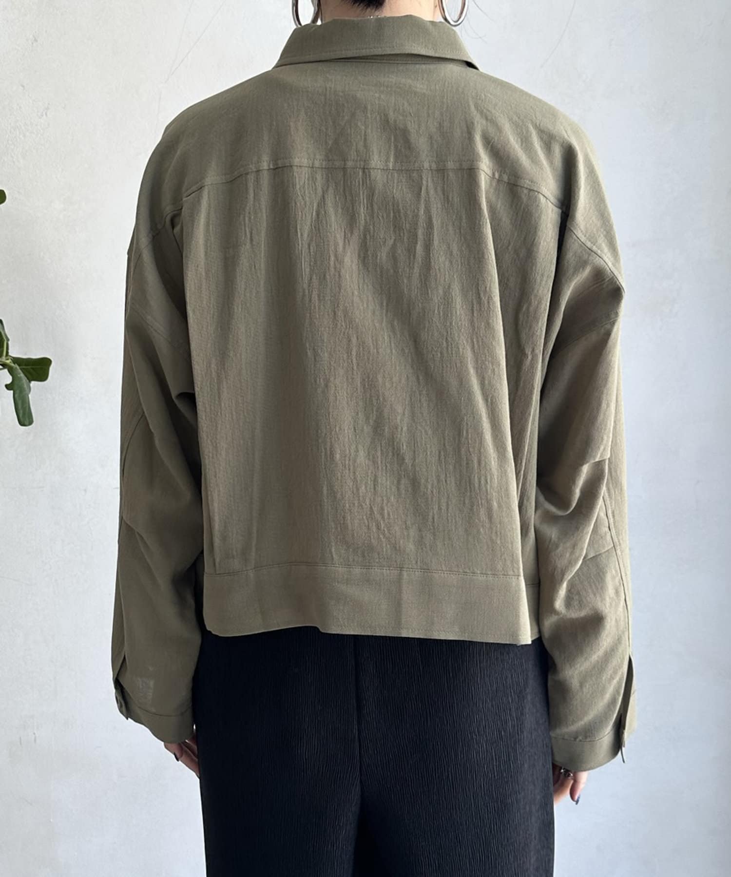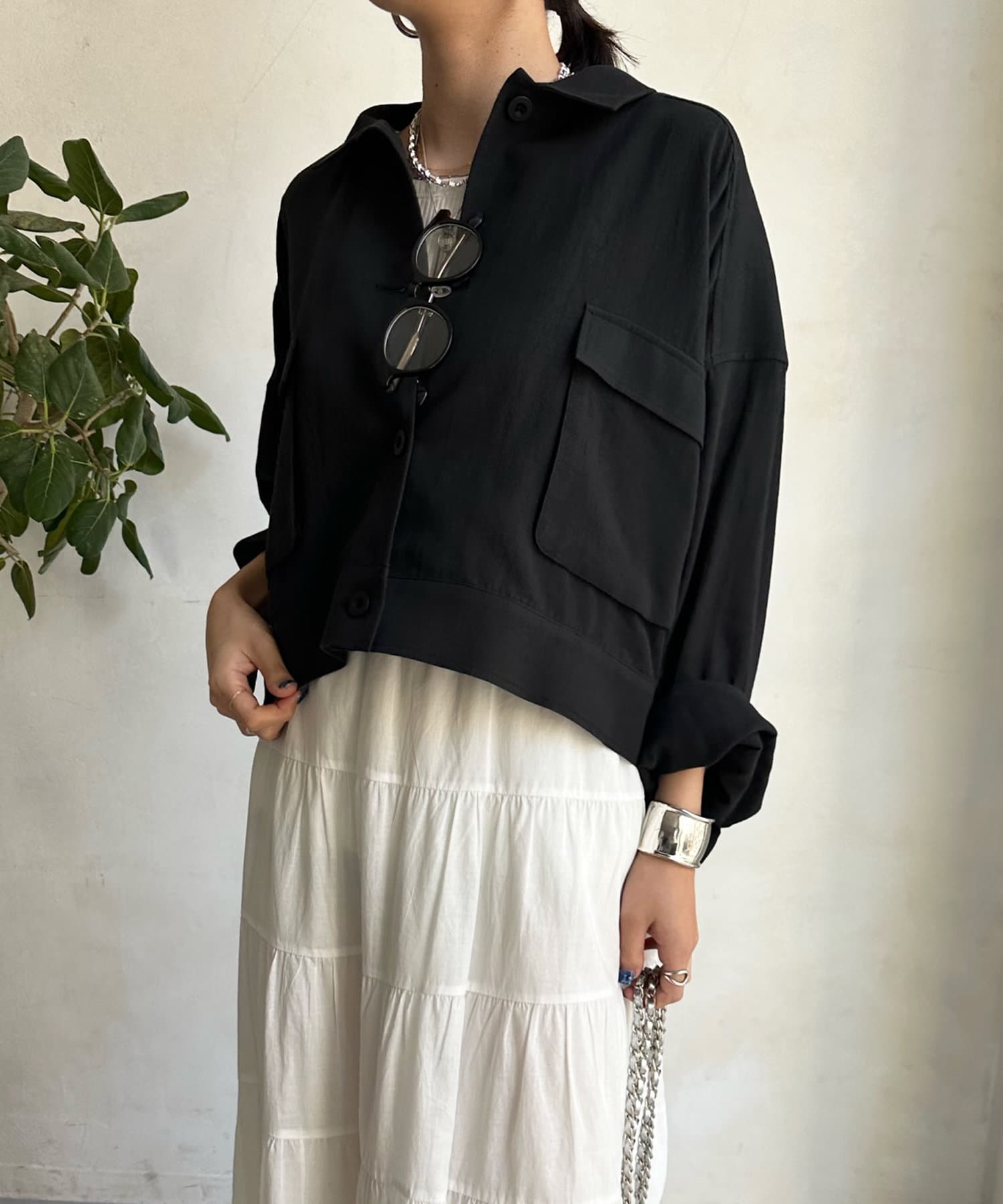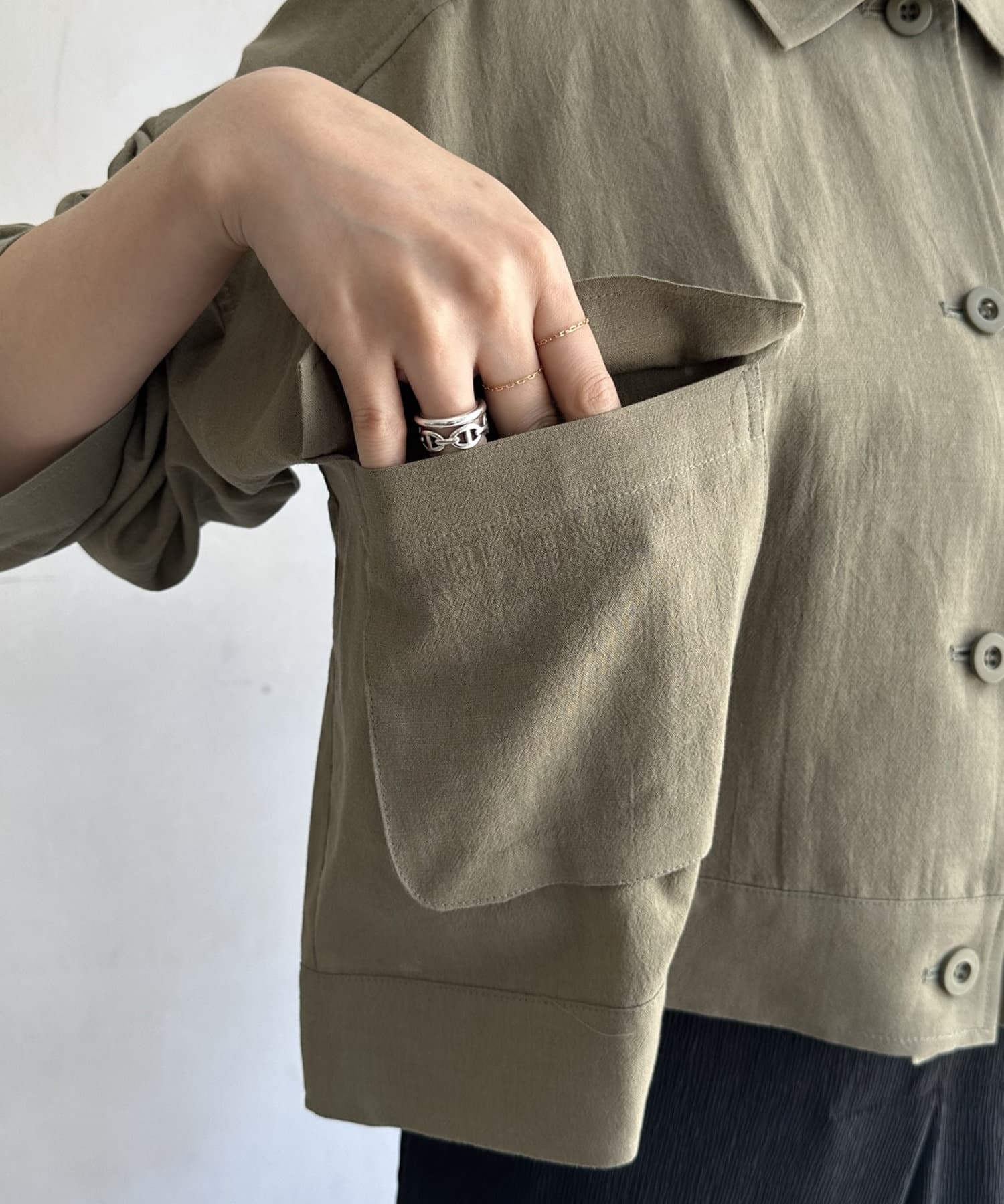 胸に大きなポケットとトレンドのショート丈がポイント。