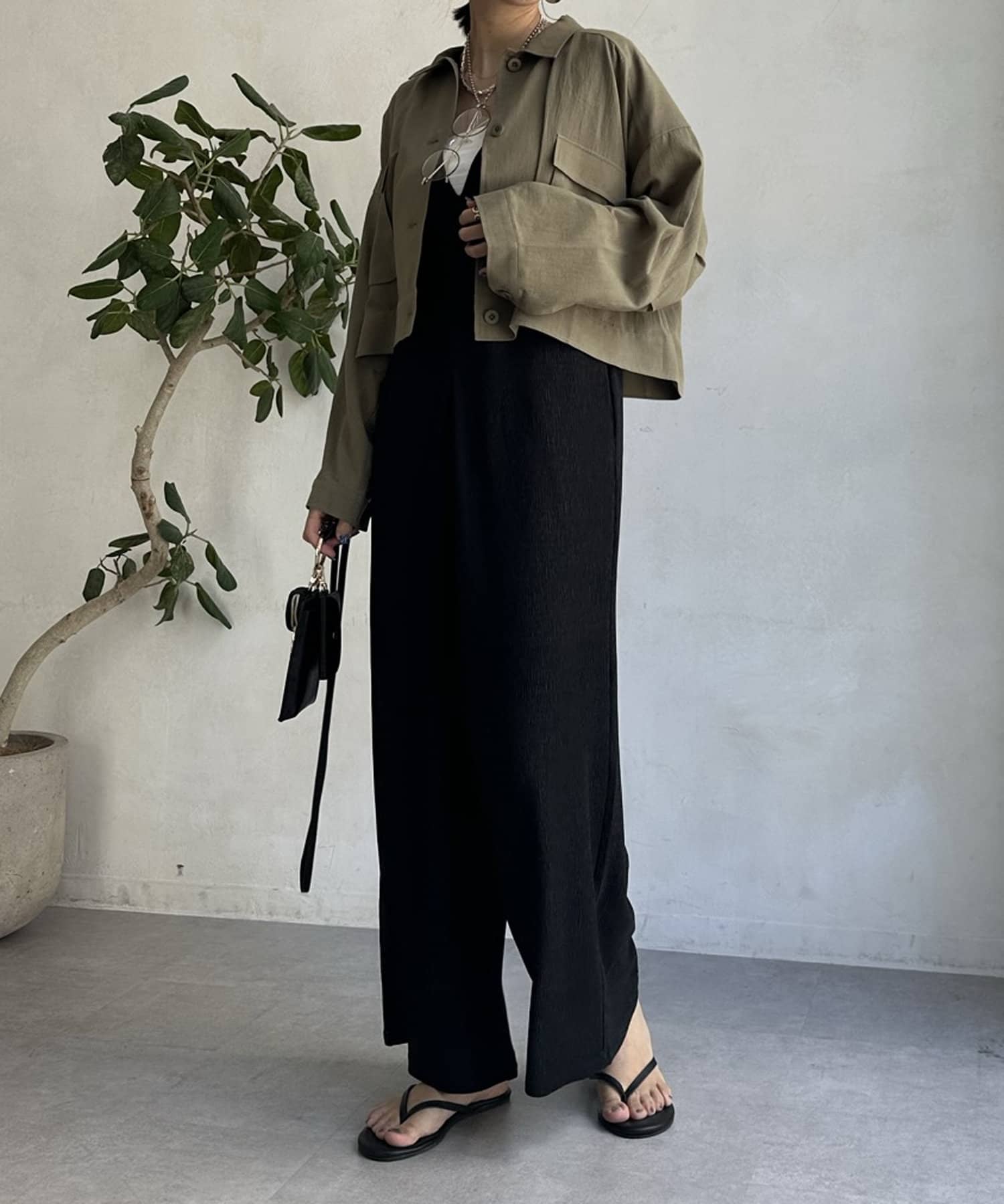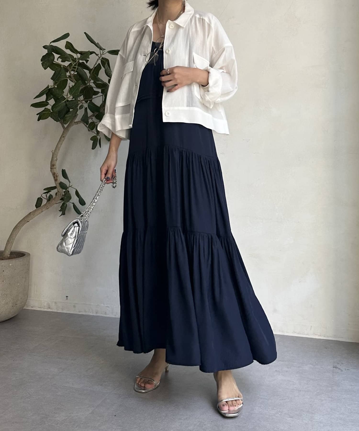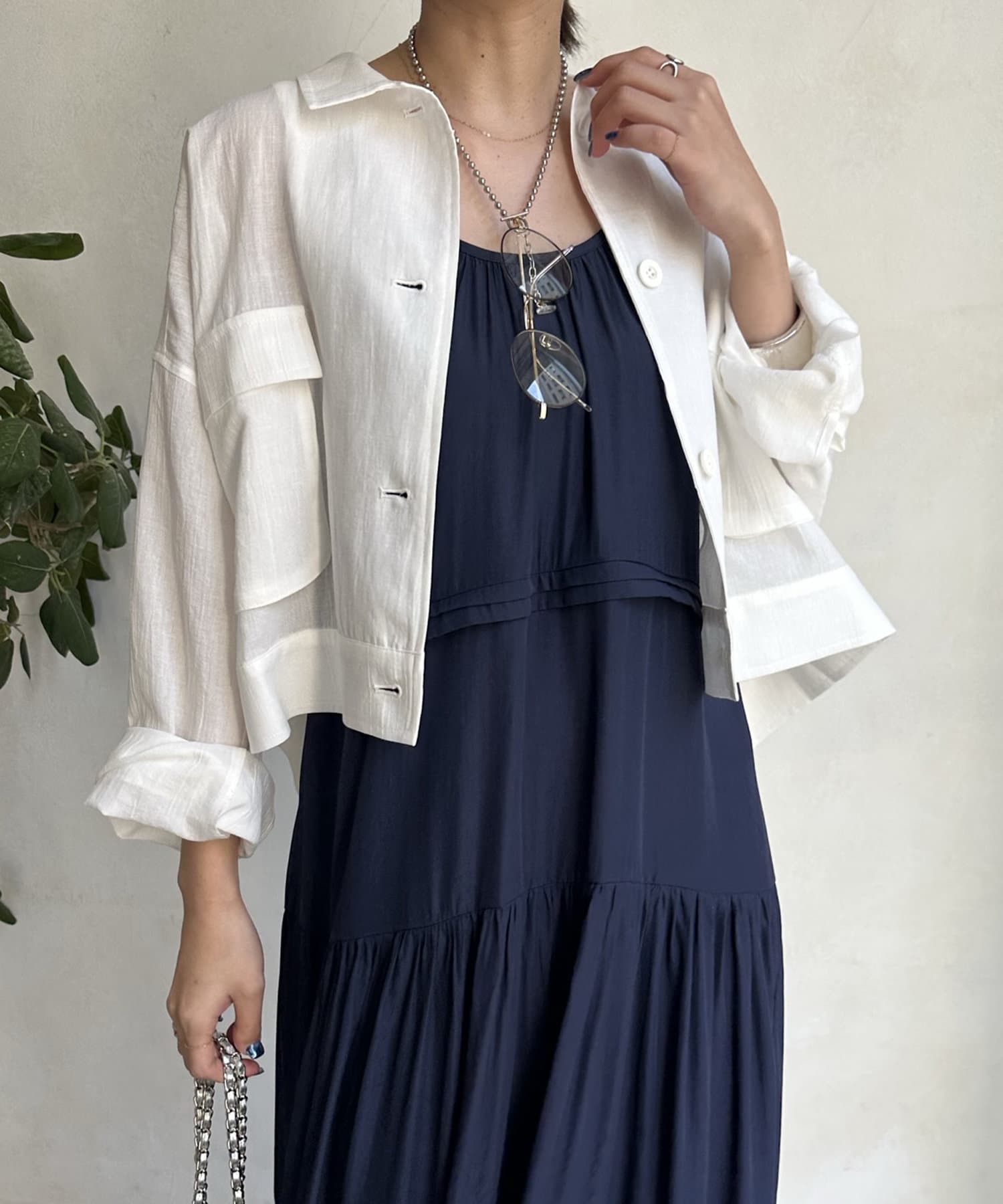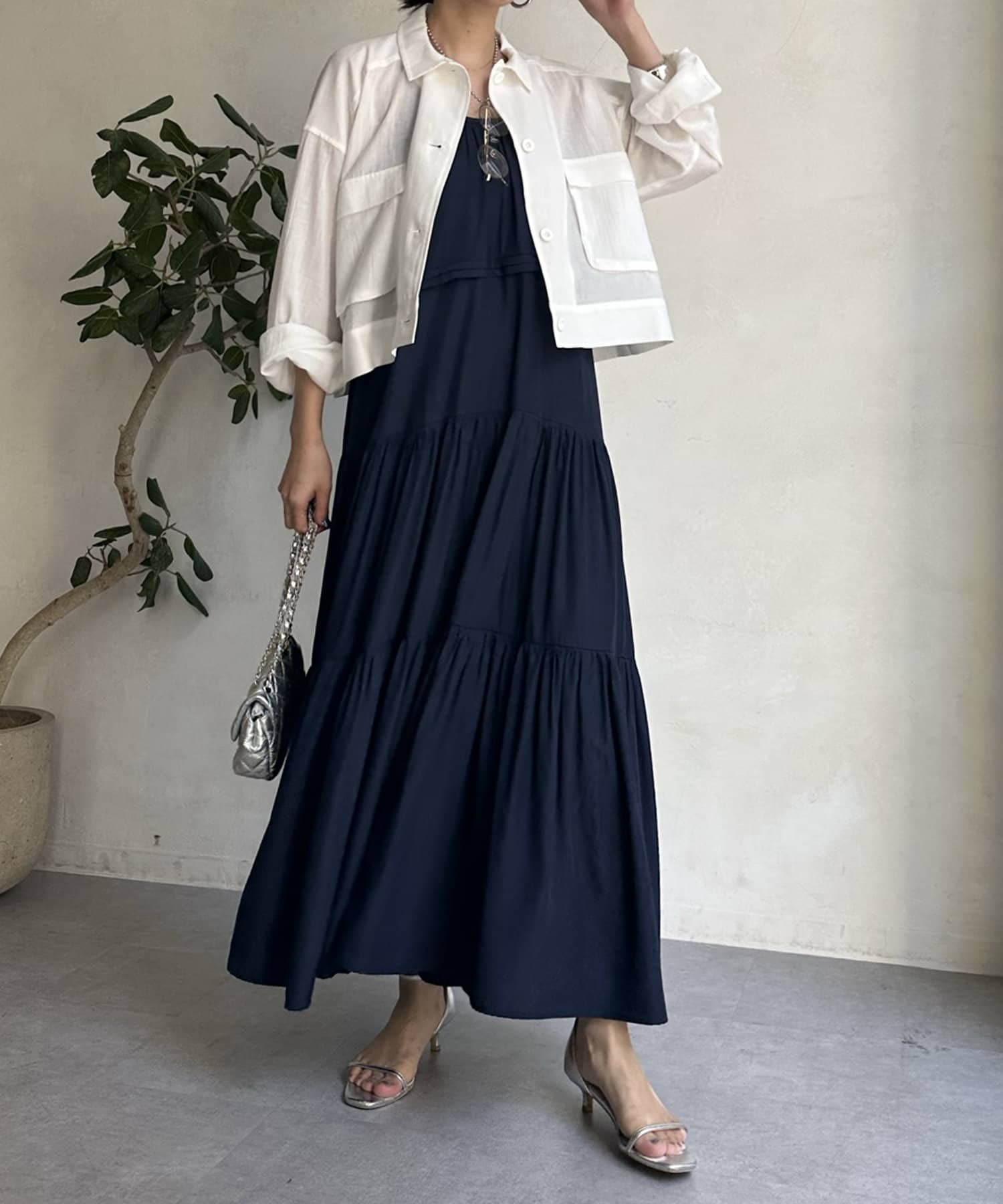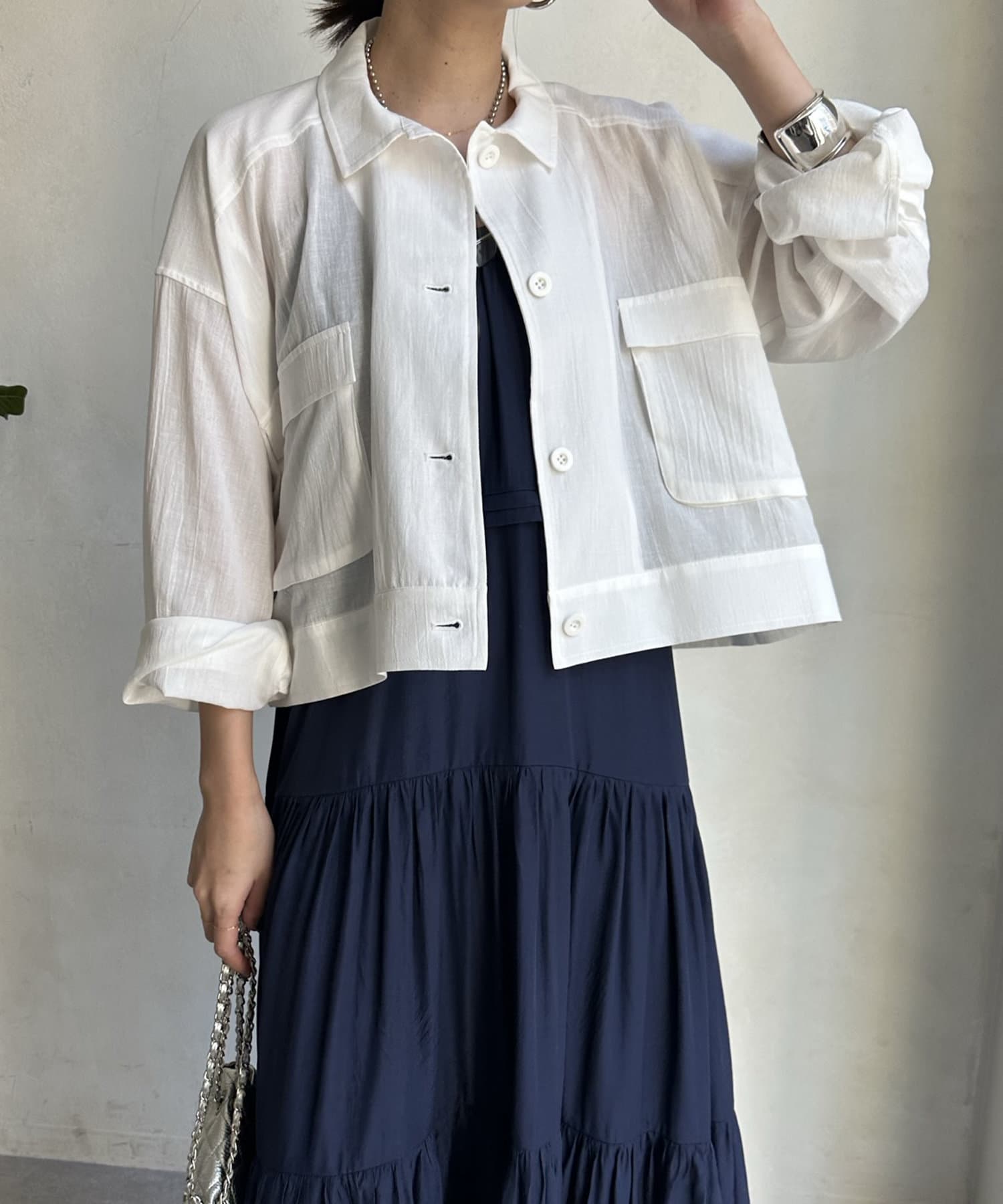 ワンピースの上から羽織ったり、キャミソールの上に羽織ったりするだけで大人カジュアルなスタイリングが完成。