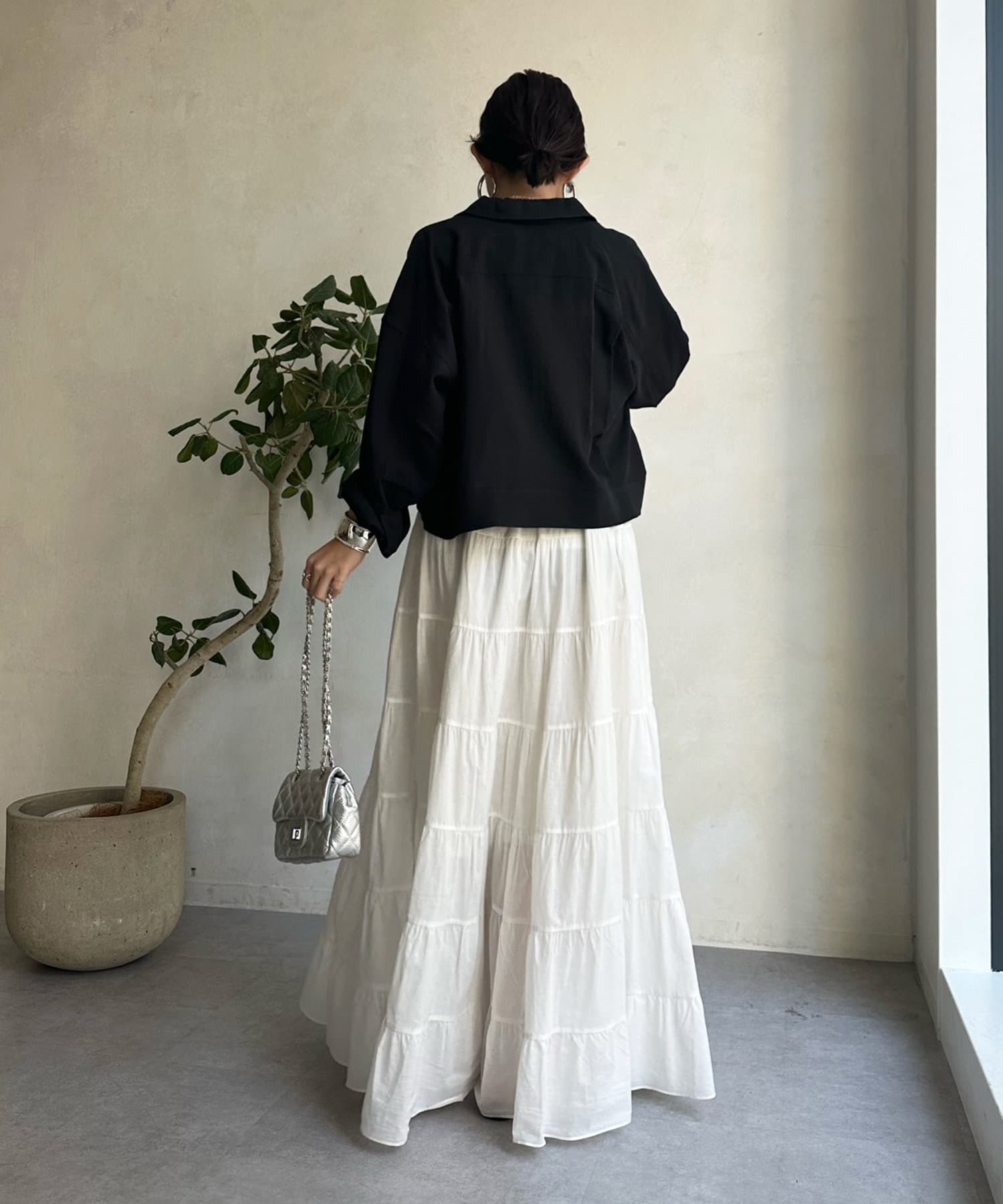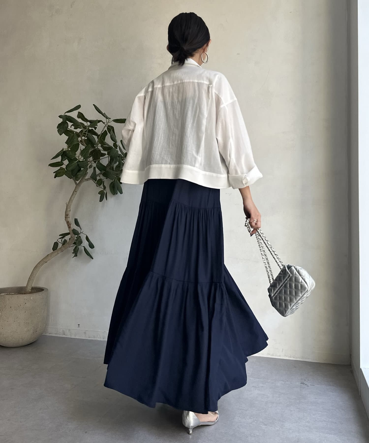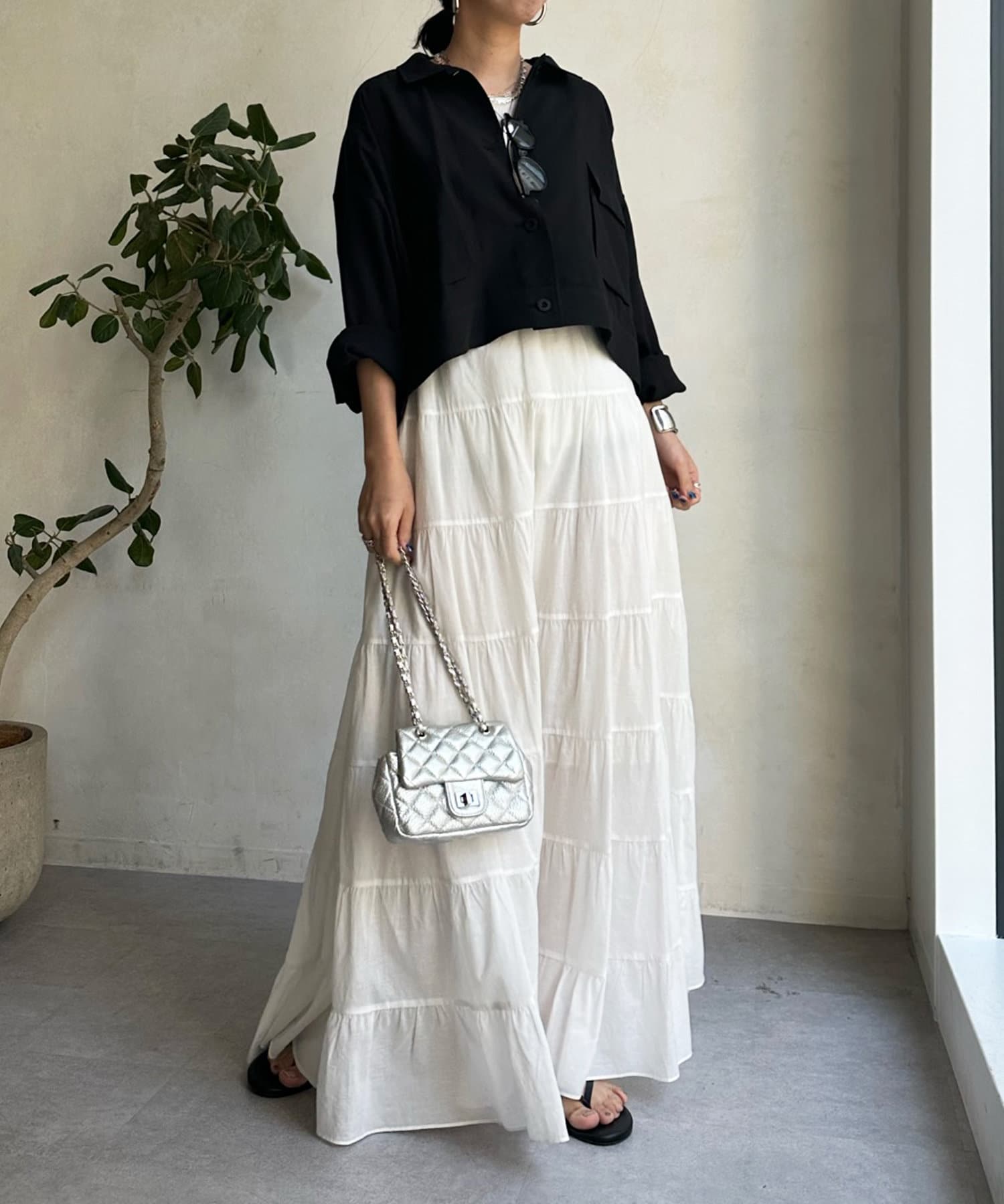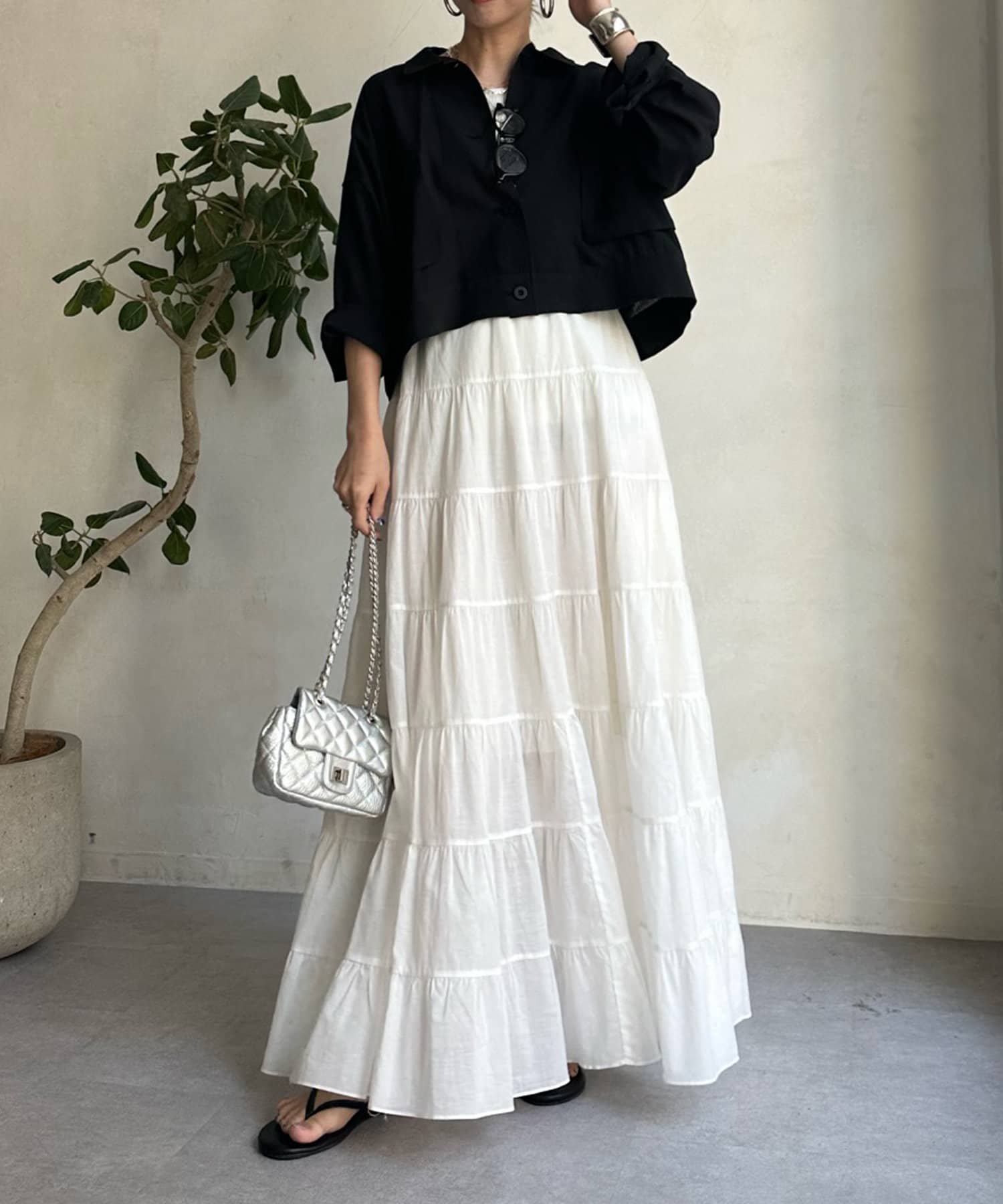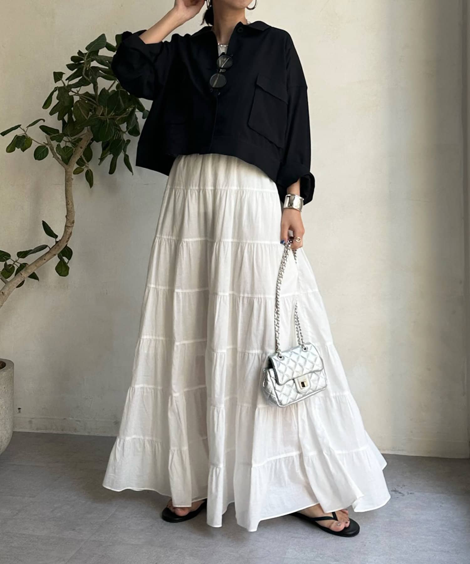 ワンピースの上から羽織ったり、キャミソールの上に羽織ったりするだけで大人カジュアルなスタイリングが完成。