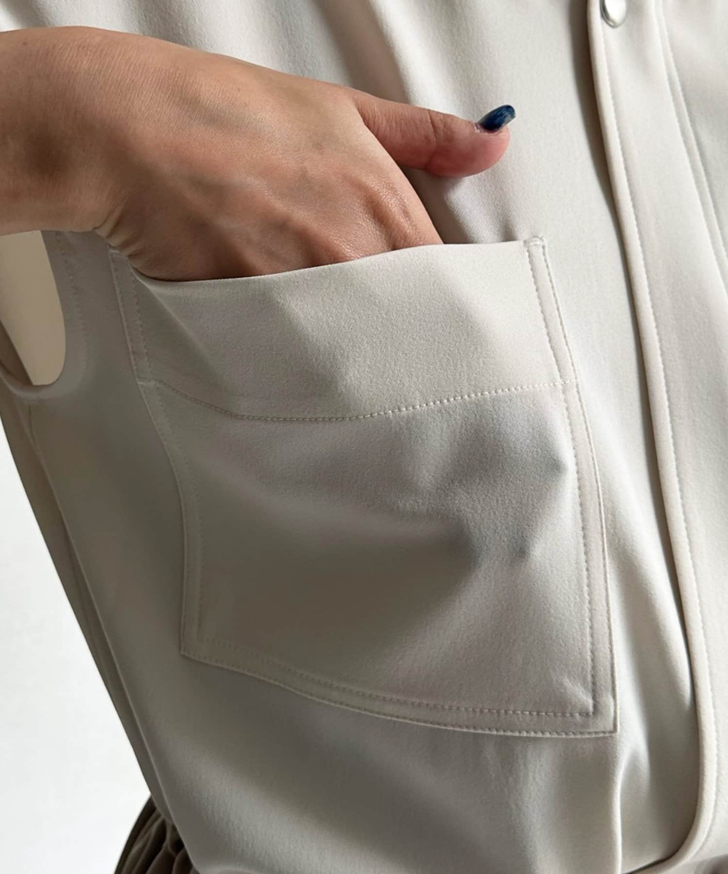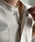 表面がクリアできれいめな合繊素材を使用した1着。