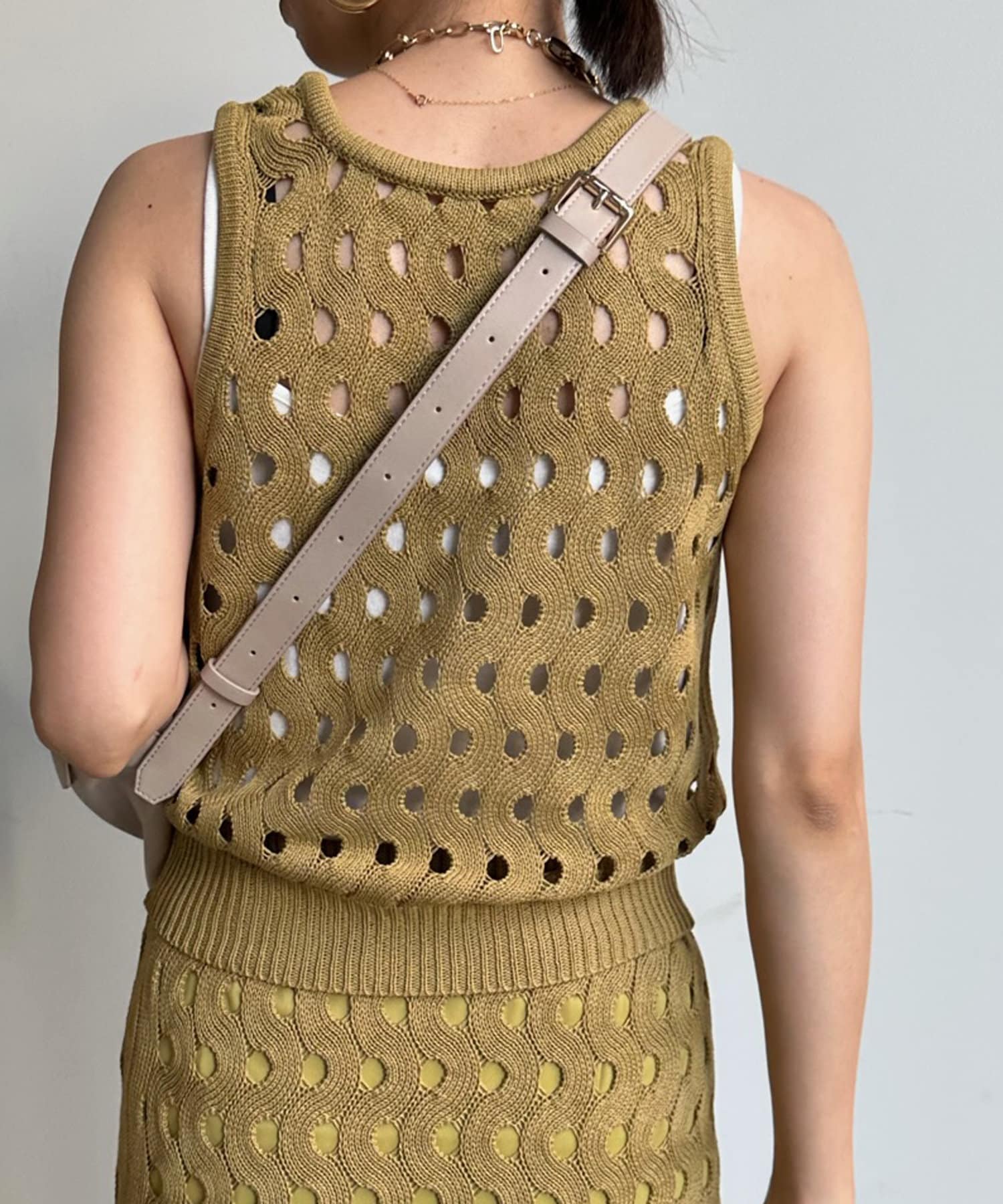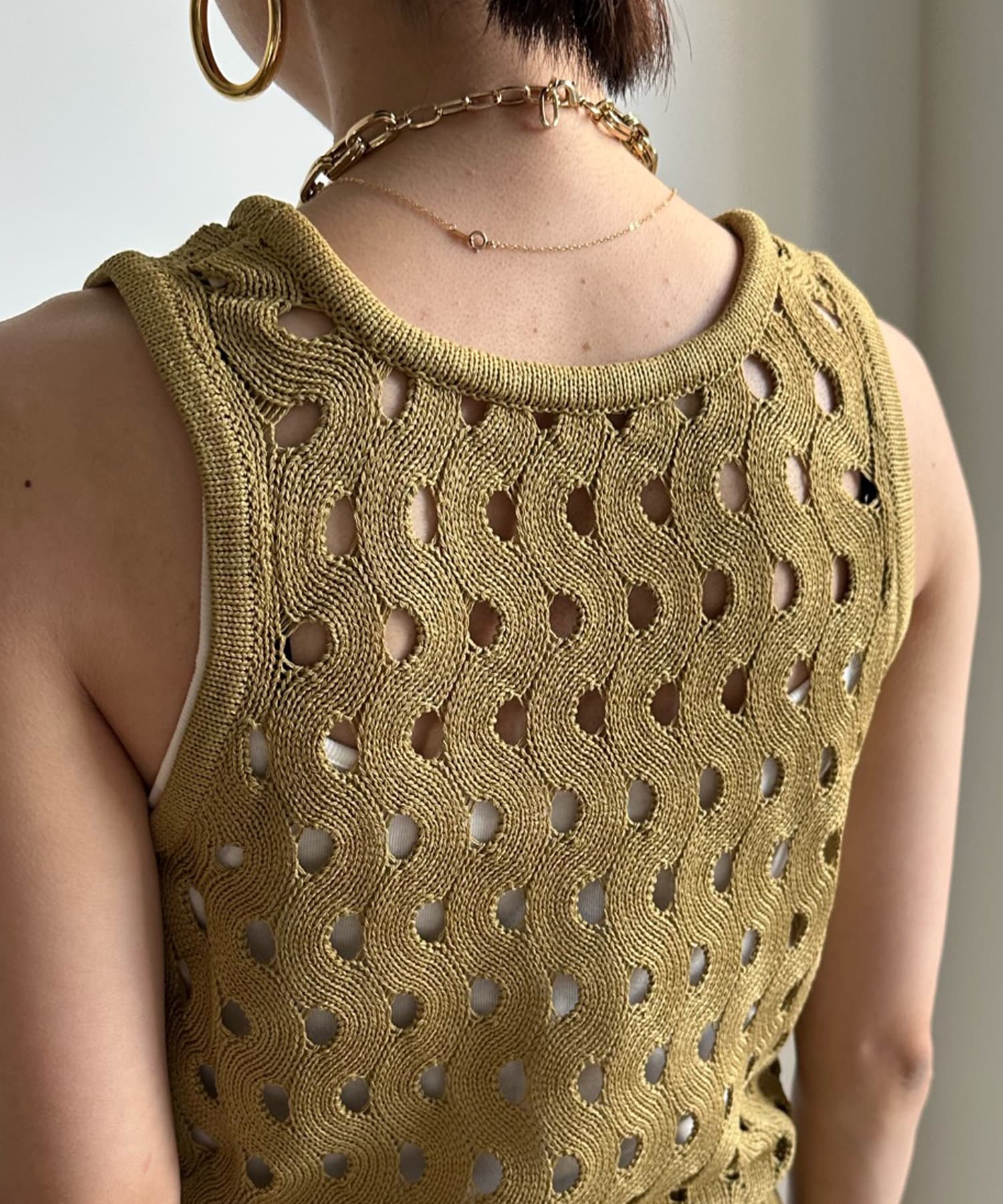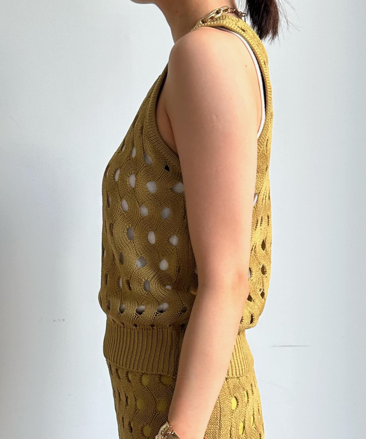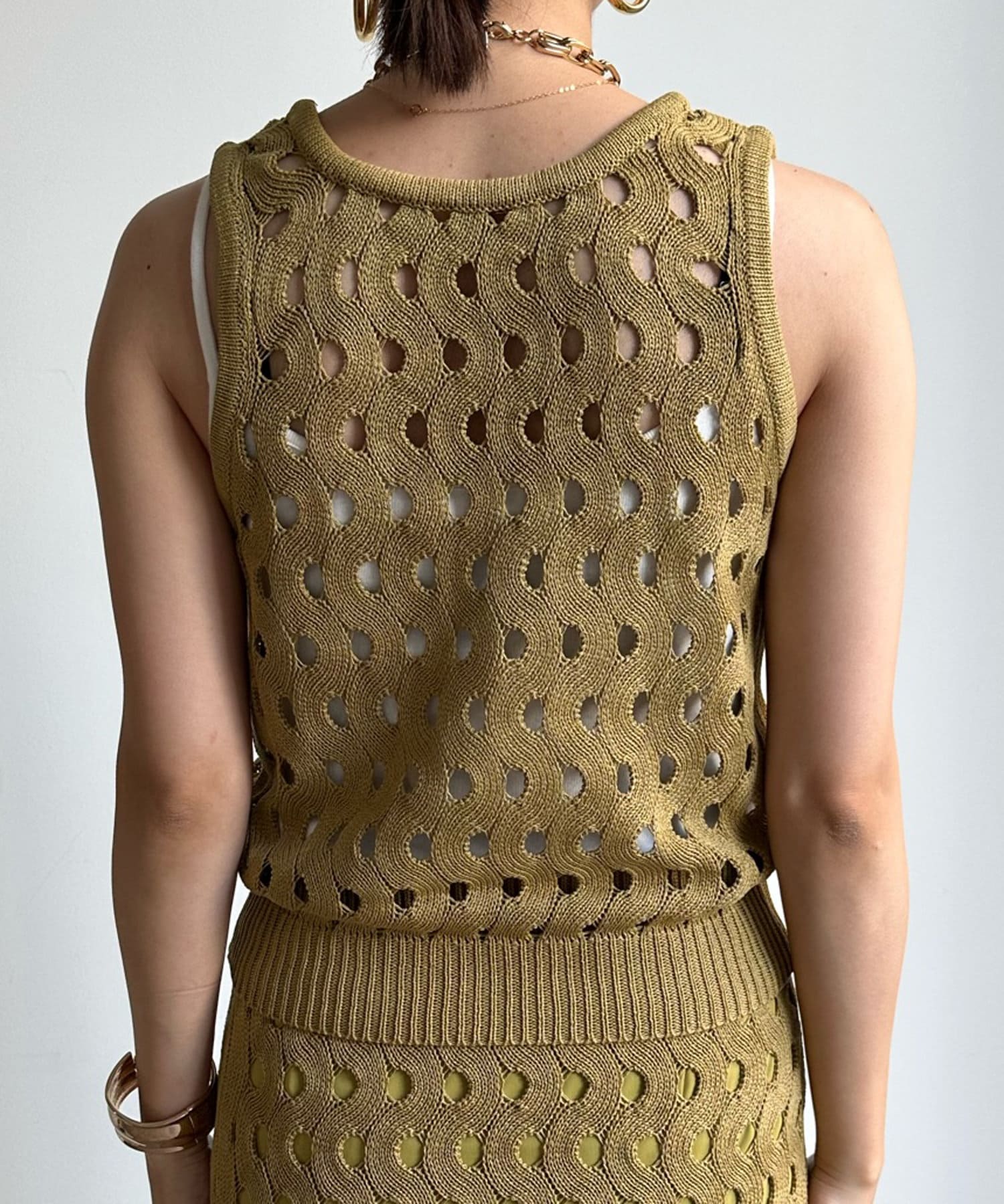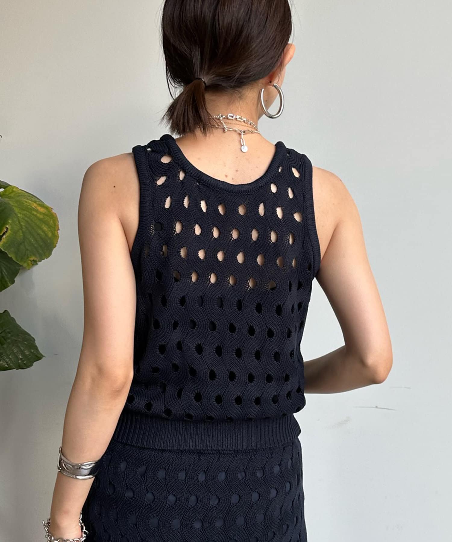 トレンド感のあるやや短丈のニットタンクは、ハイウエストのボトムスとも相性◎