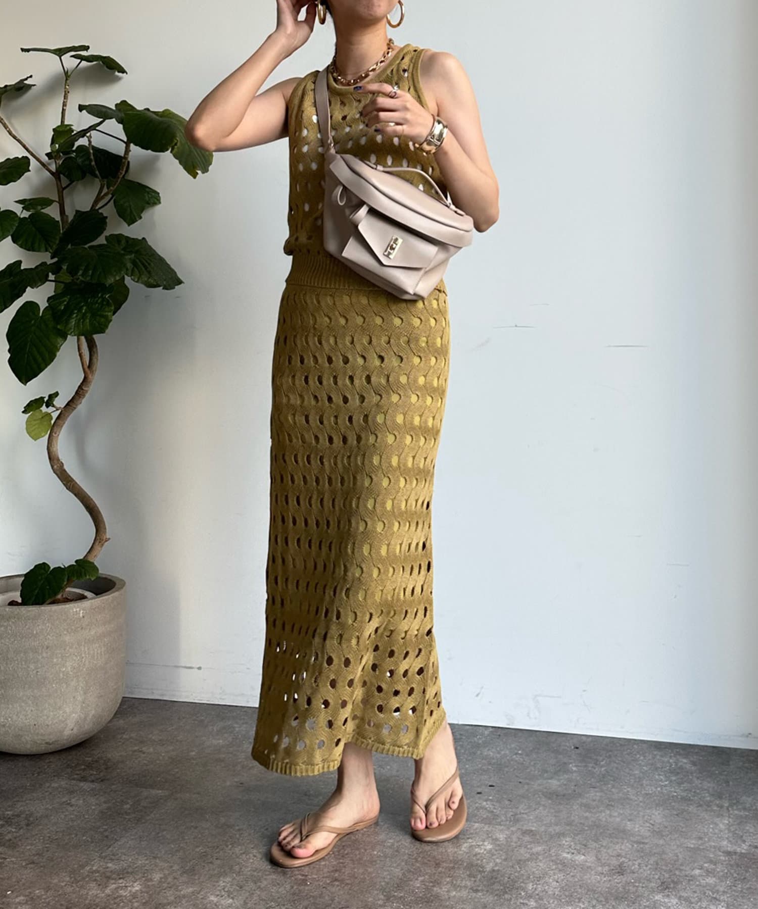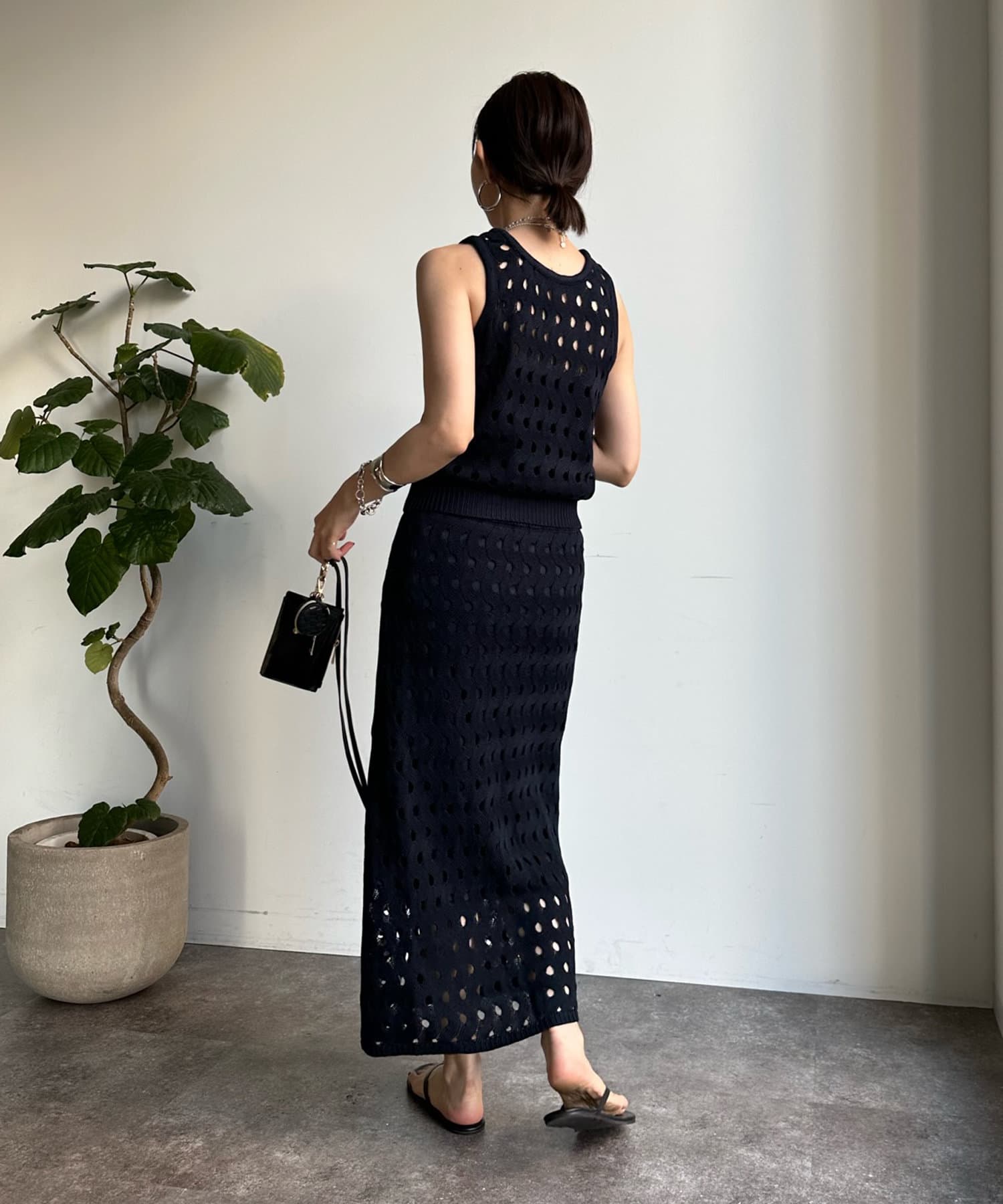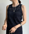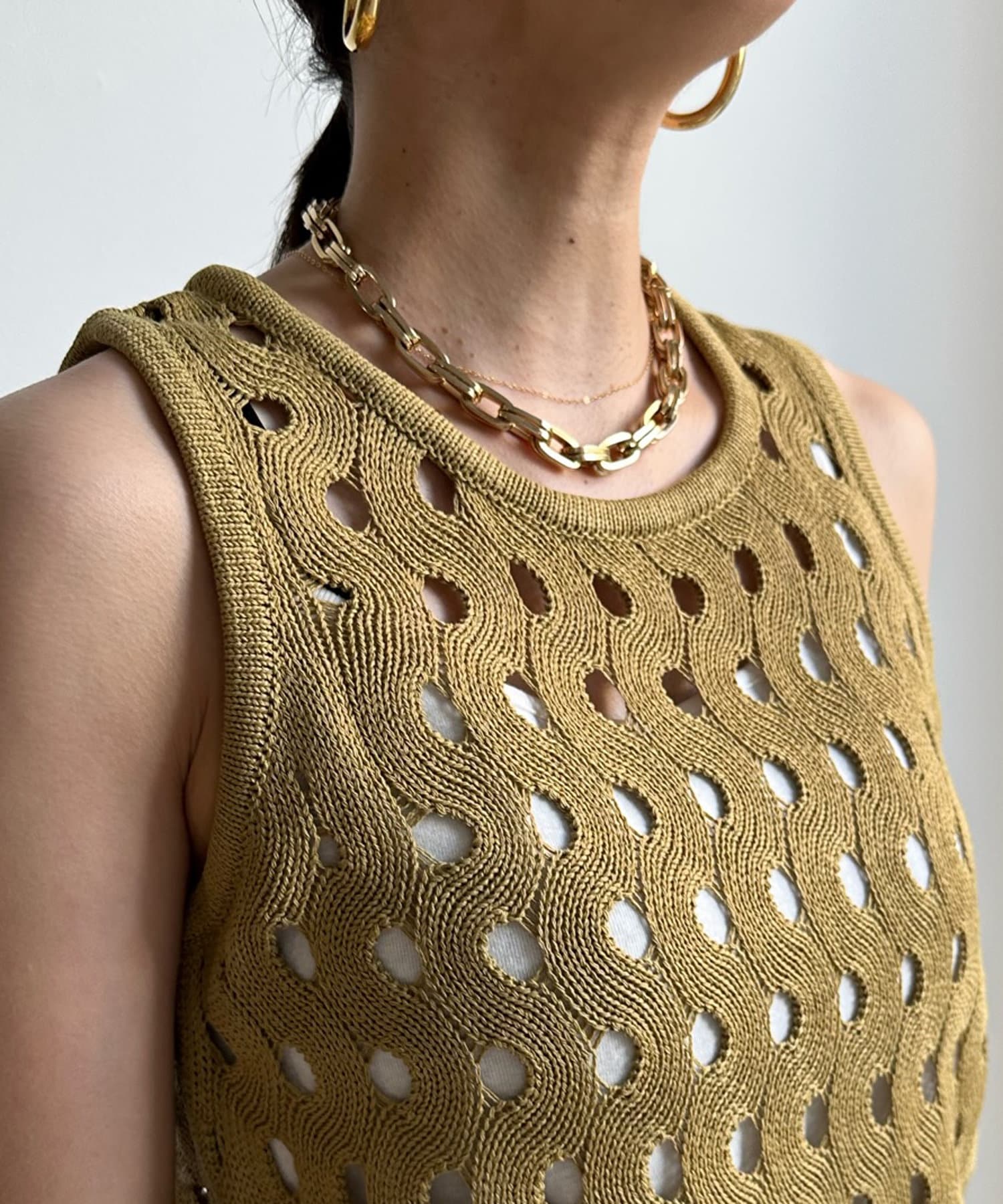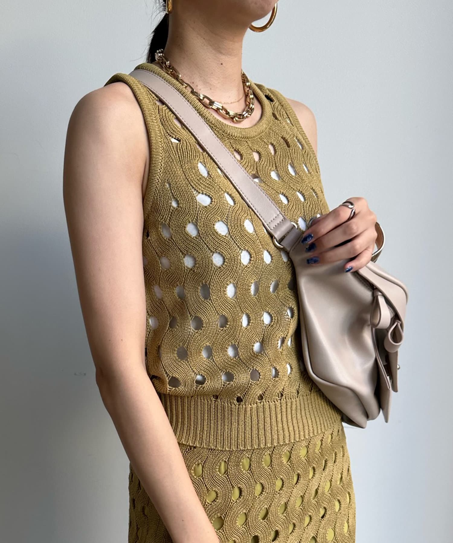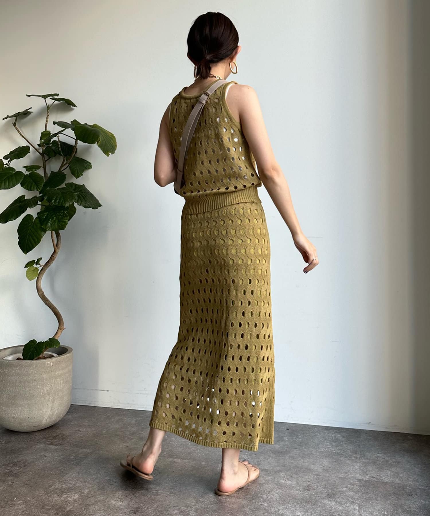 トレンド感のあるやや短丈のニットタンクは、ハイウエストのボトムスとも相性◎