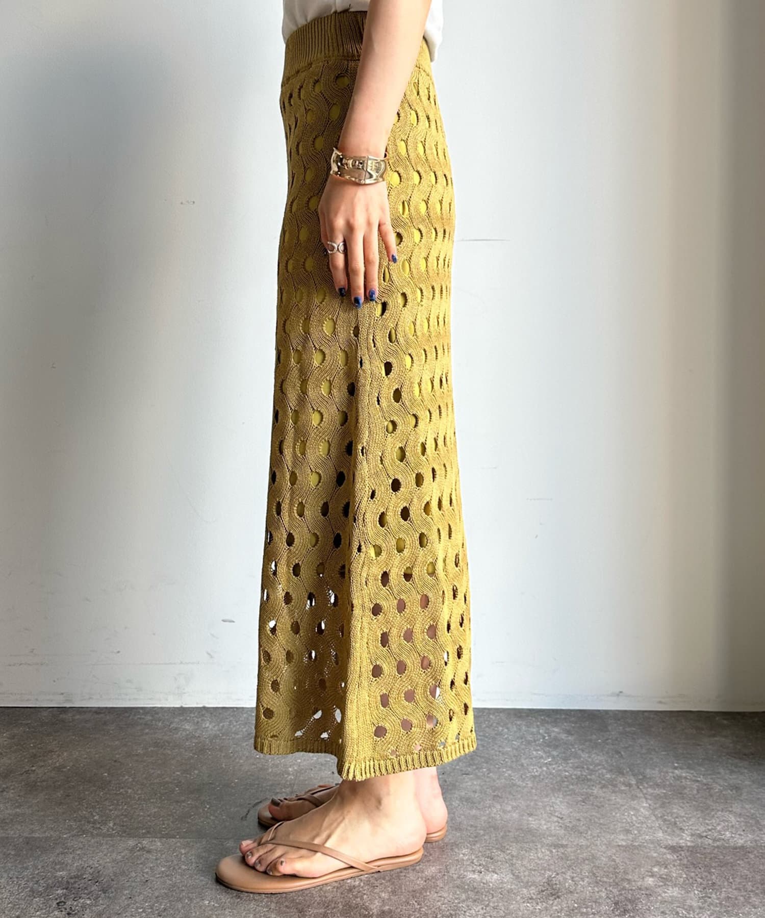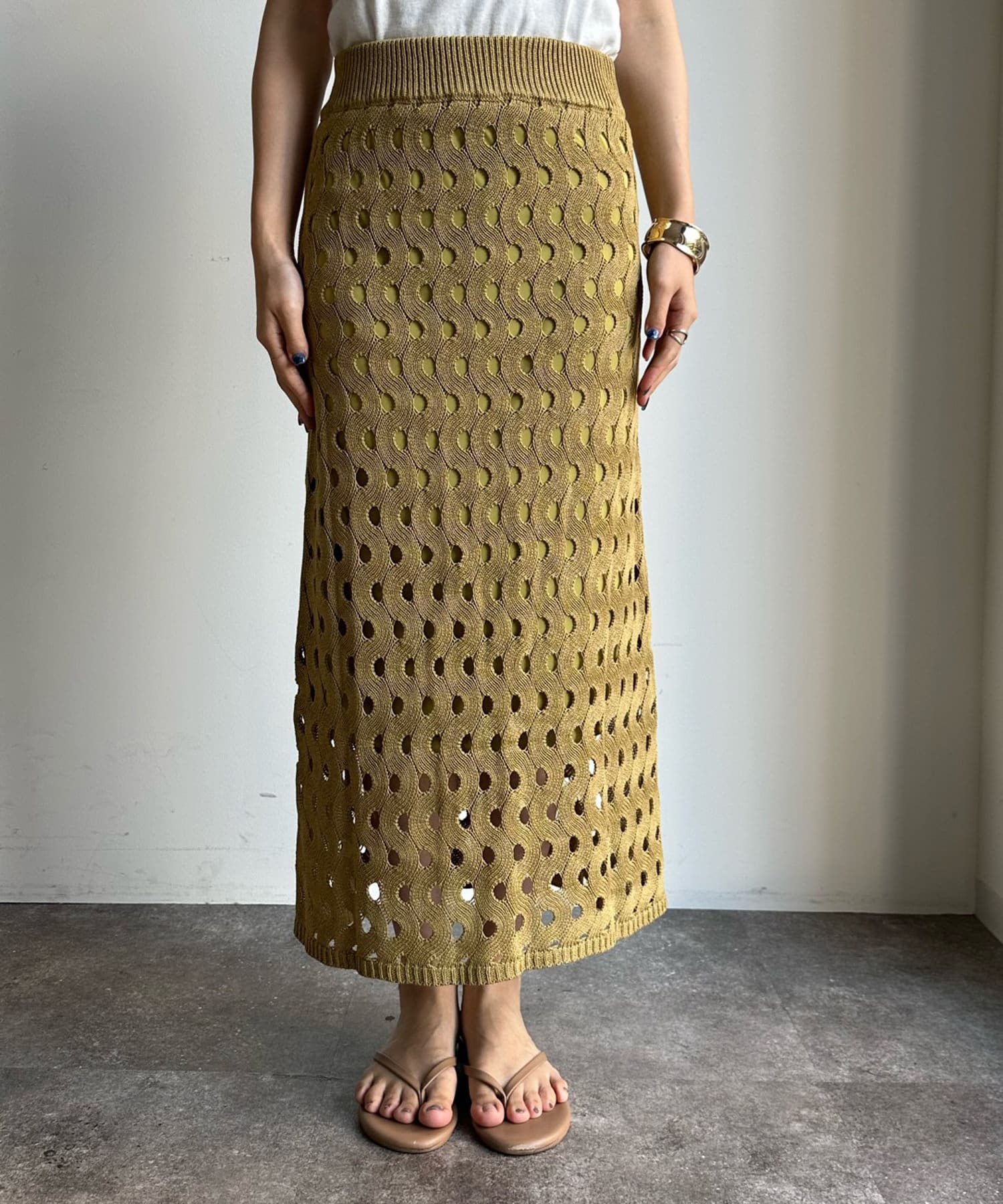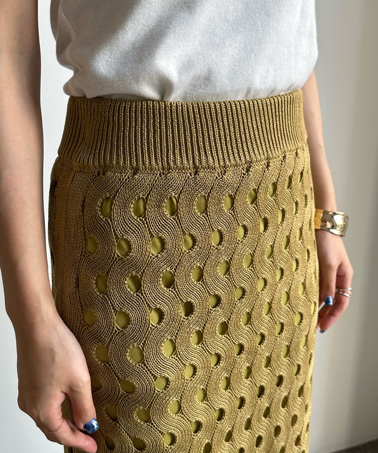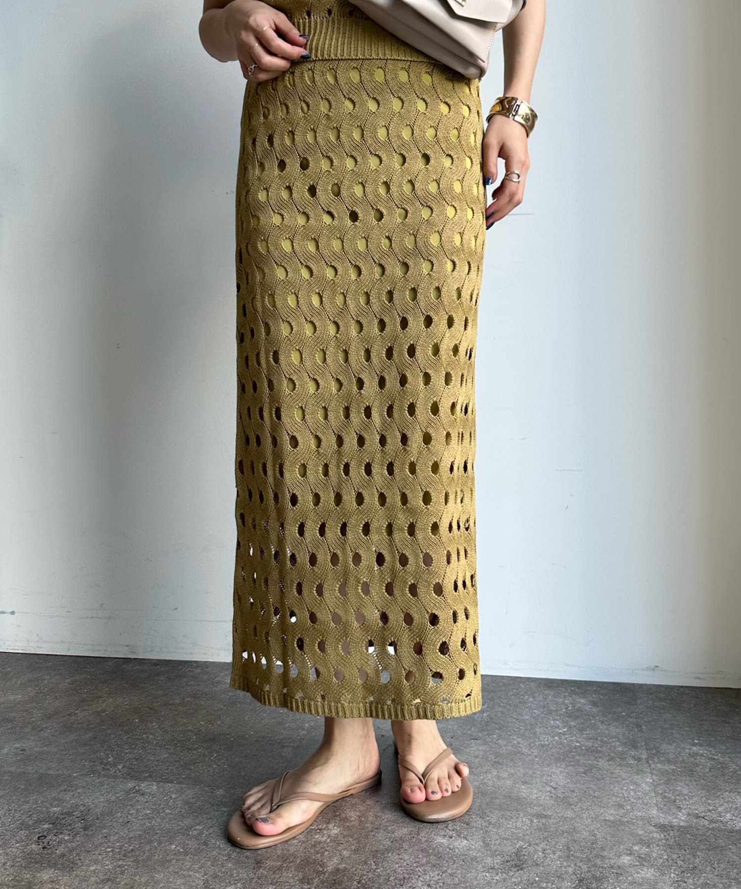 ヘルシーな肌見せが叶うスリーブレスなニットタンクと、女性らしいタイトシルエットのスカート。