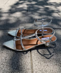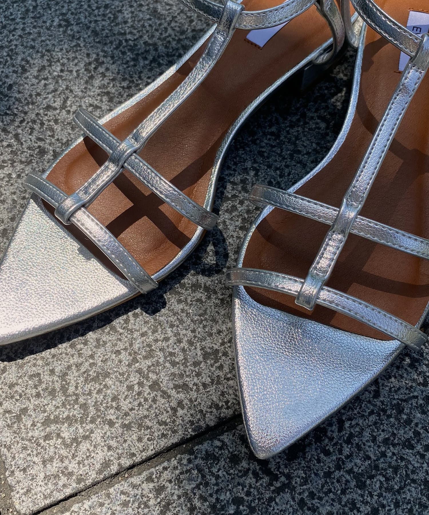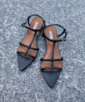 グリット状に細いストラップを配し、洗練された印象を作る一足。