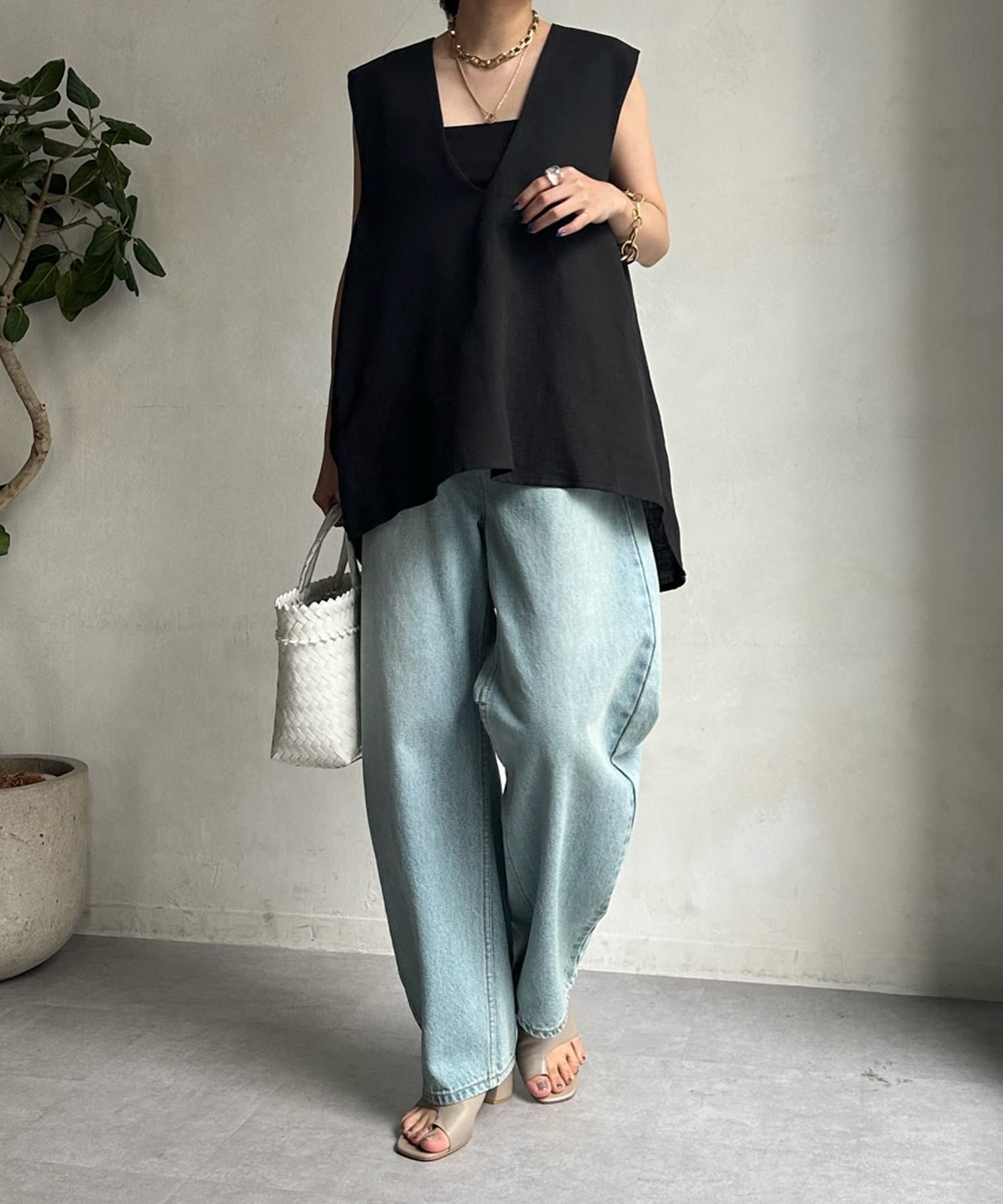 深めのVネックはレイヤードした時に、オシャレに魅せてくれるポイントとなってくれますよ。