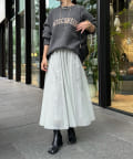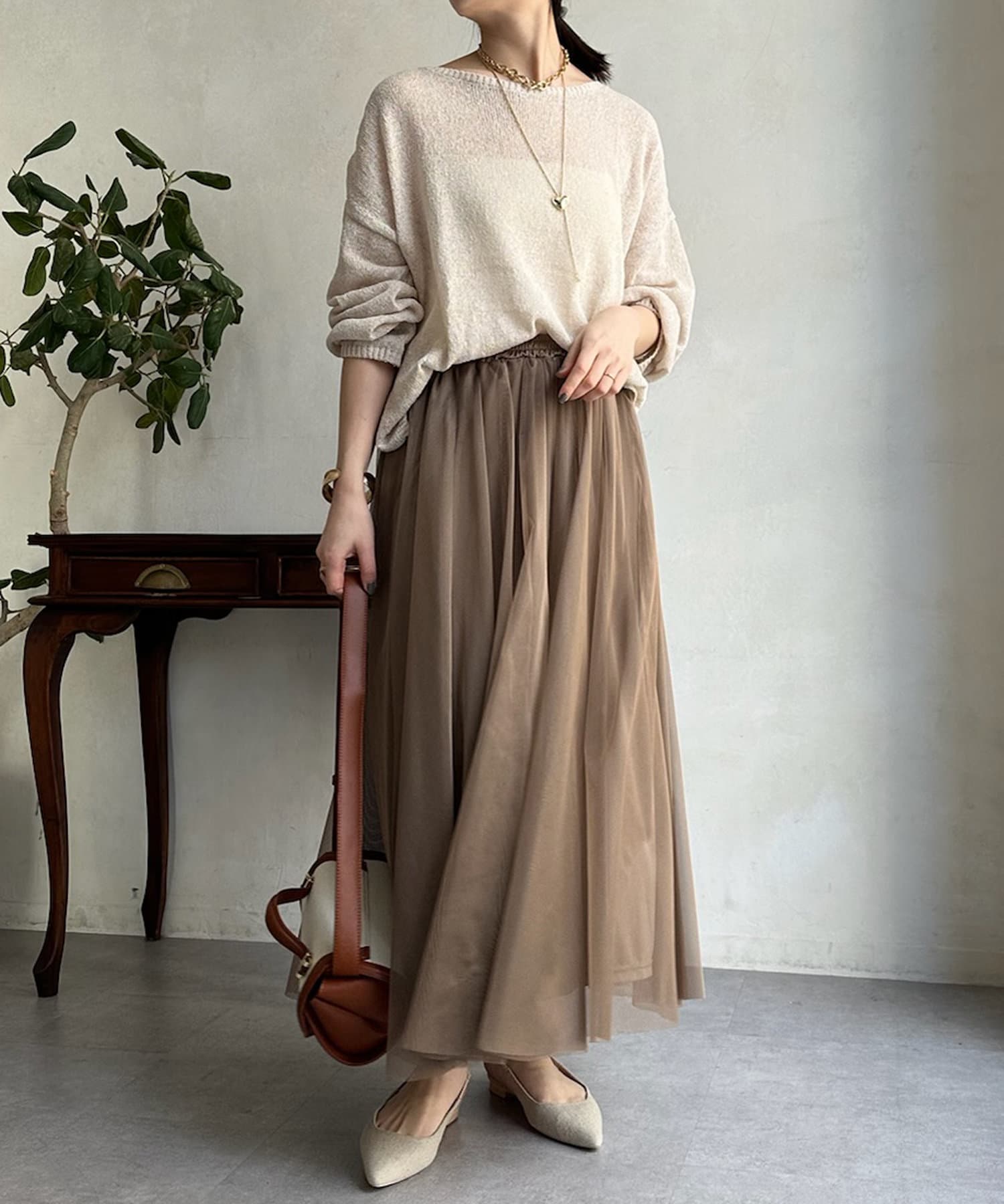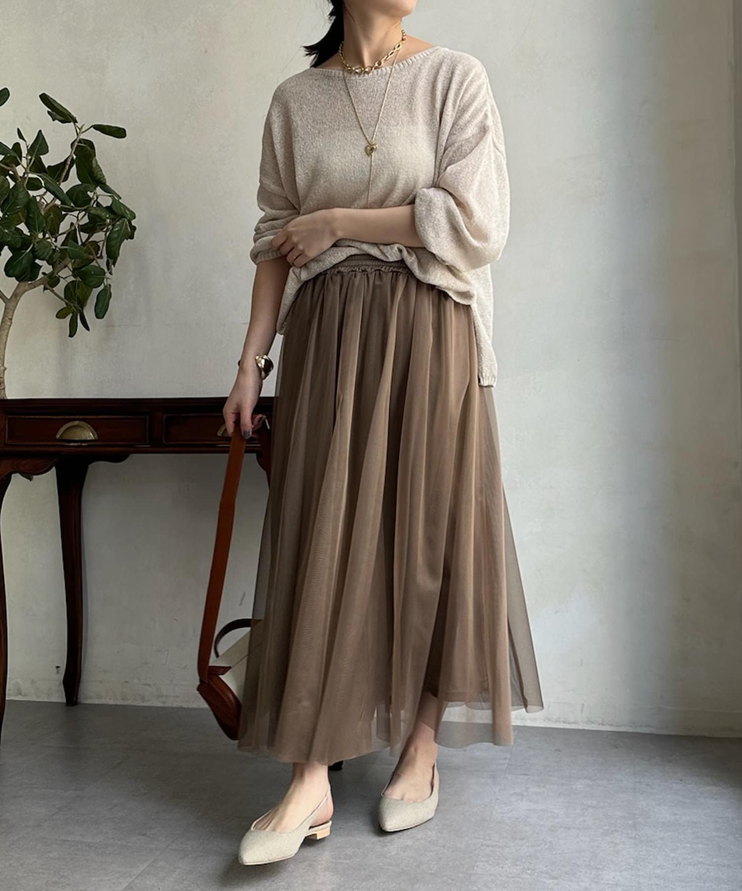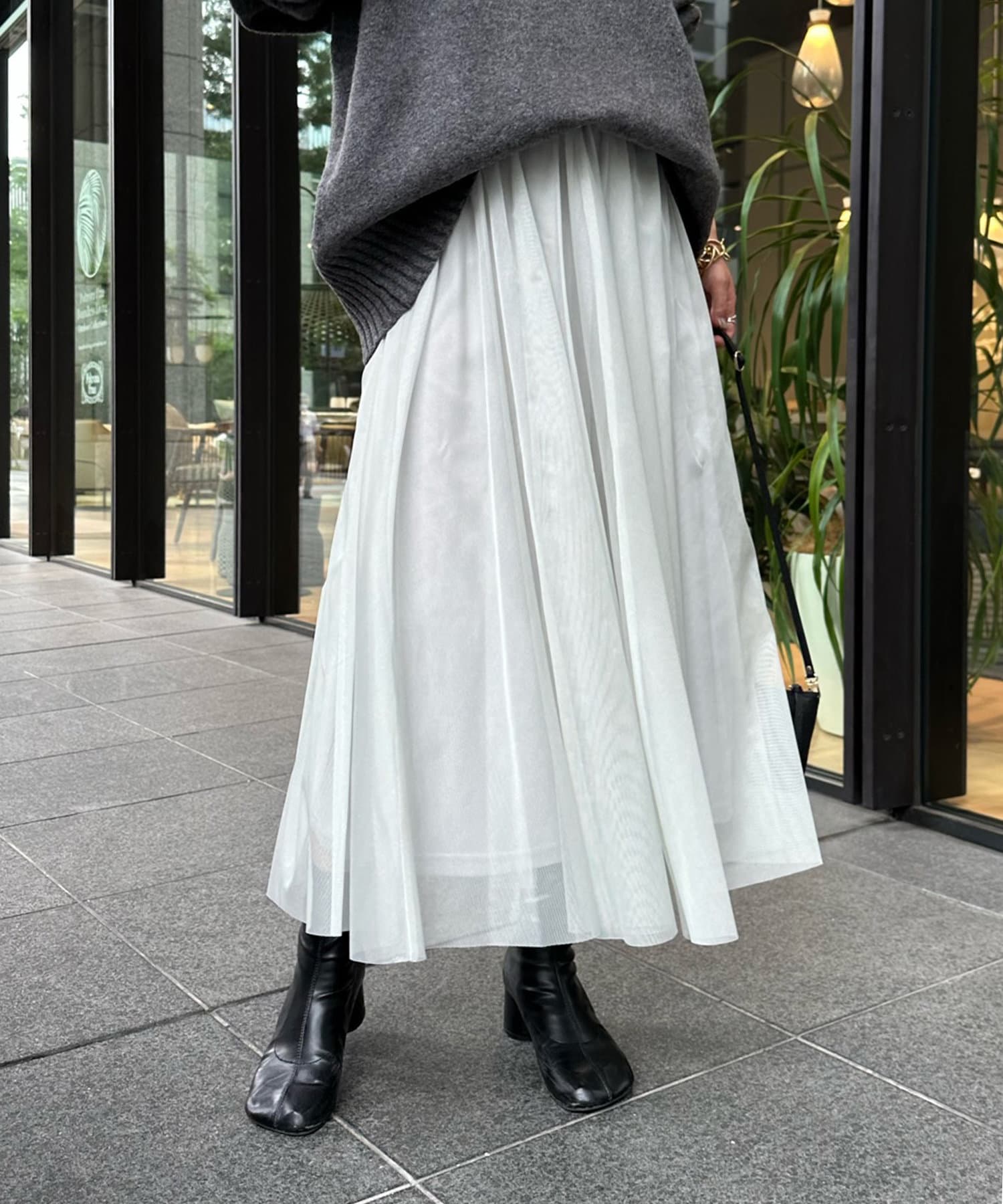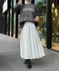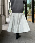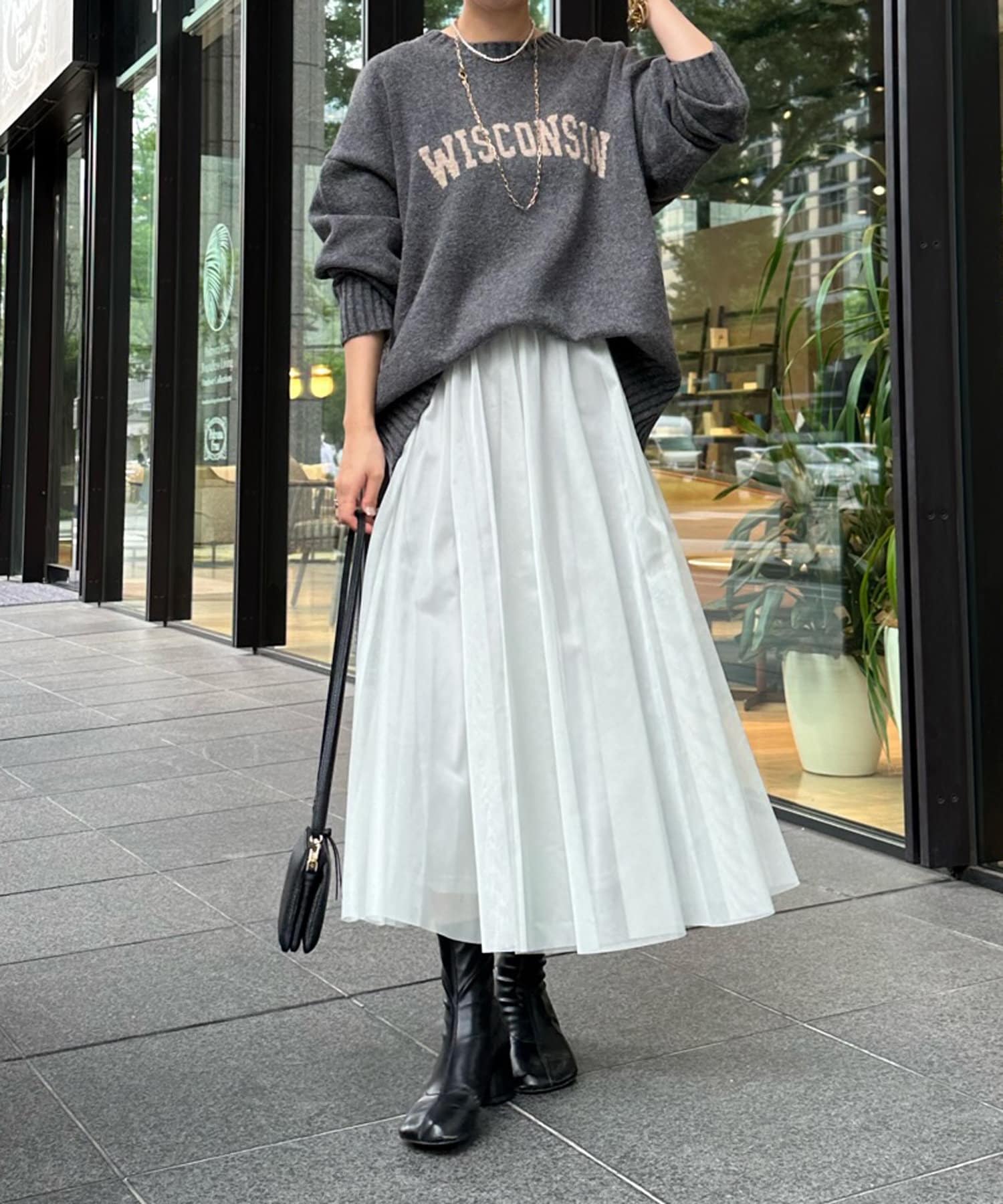 広がりすぎずに落ち感の出るシルエットと長めのレングスで甘くなりすぎず、大人フェミニンになアイテムです!