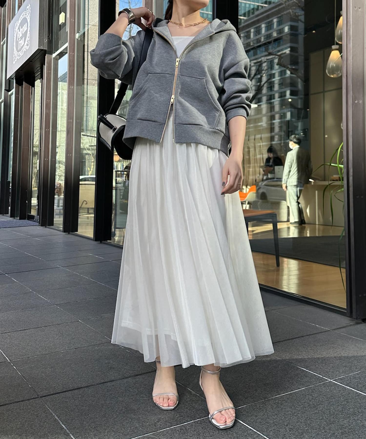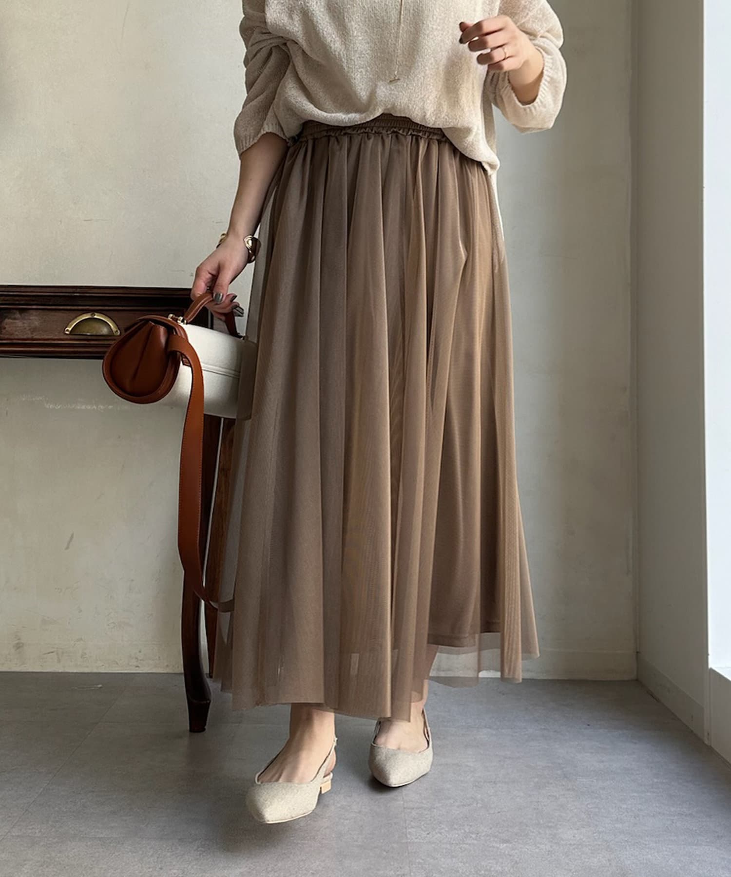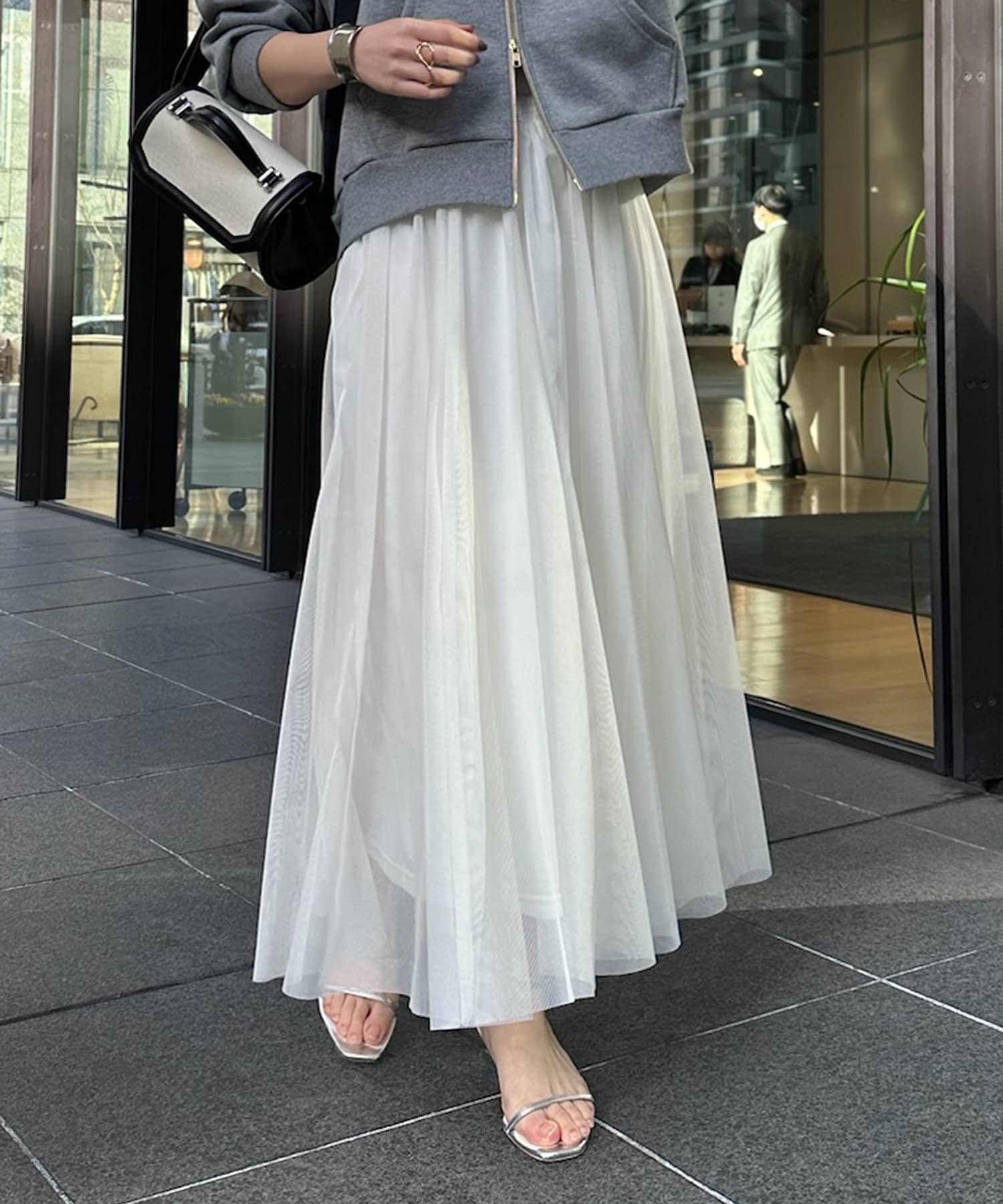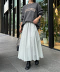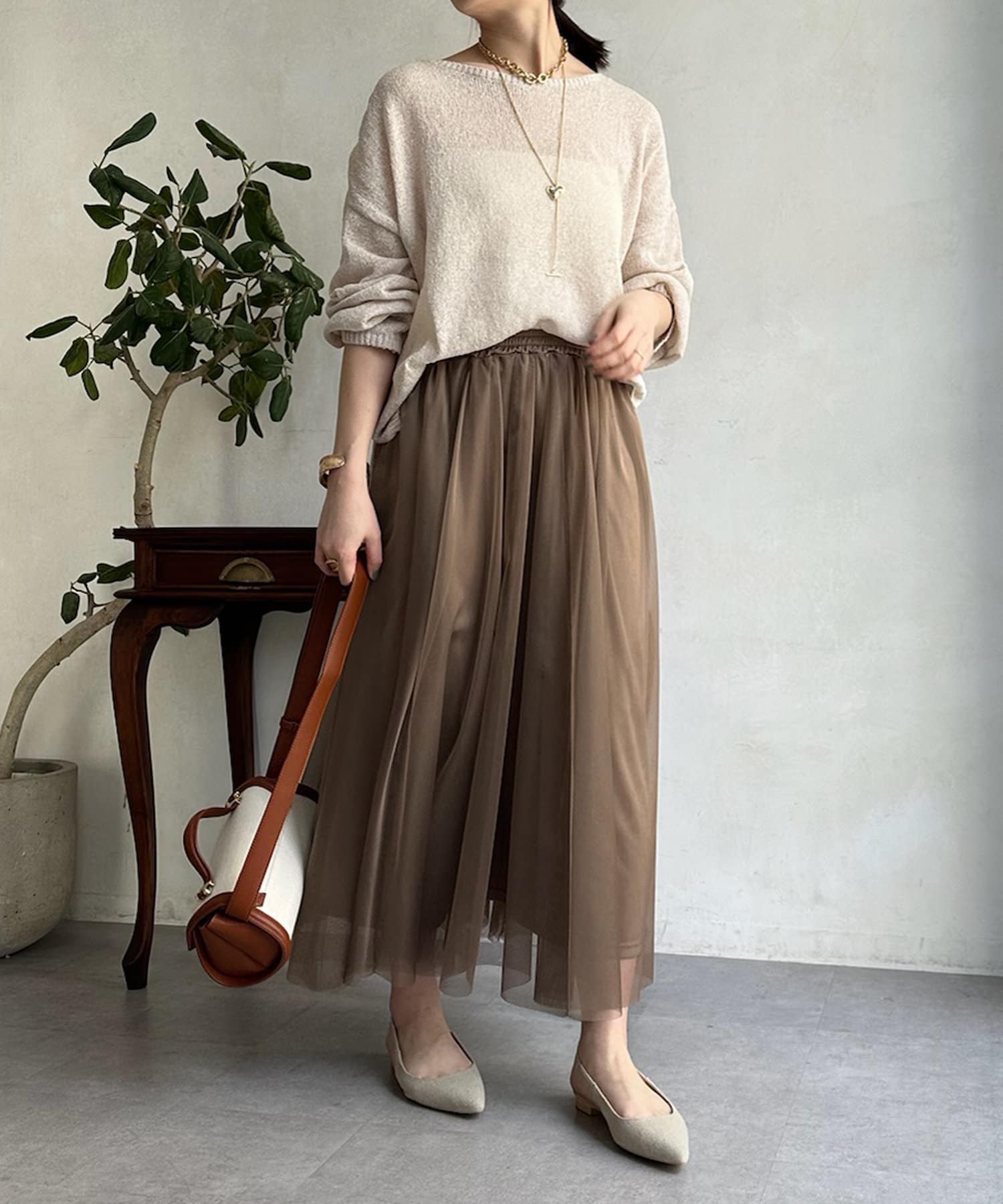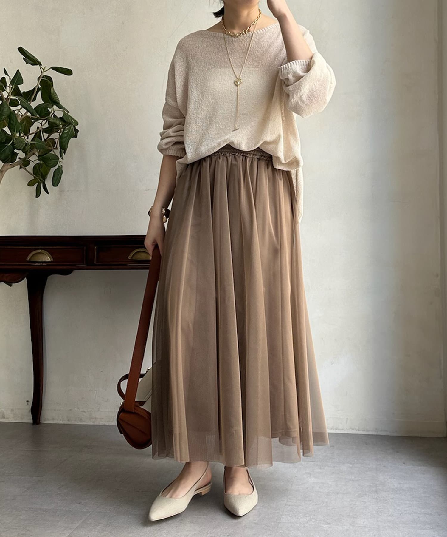 広がりすぎずに落ち感の出るシルエットと長めのレングスで甘くなりすぎず、大人フェミニンになアイテムです!