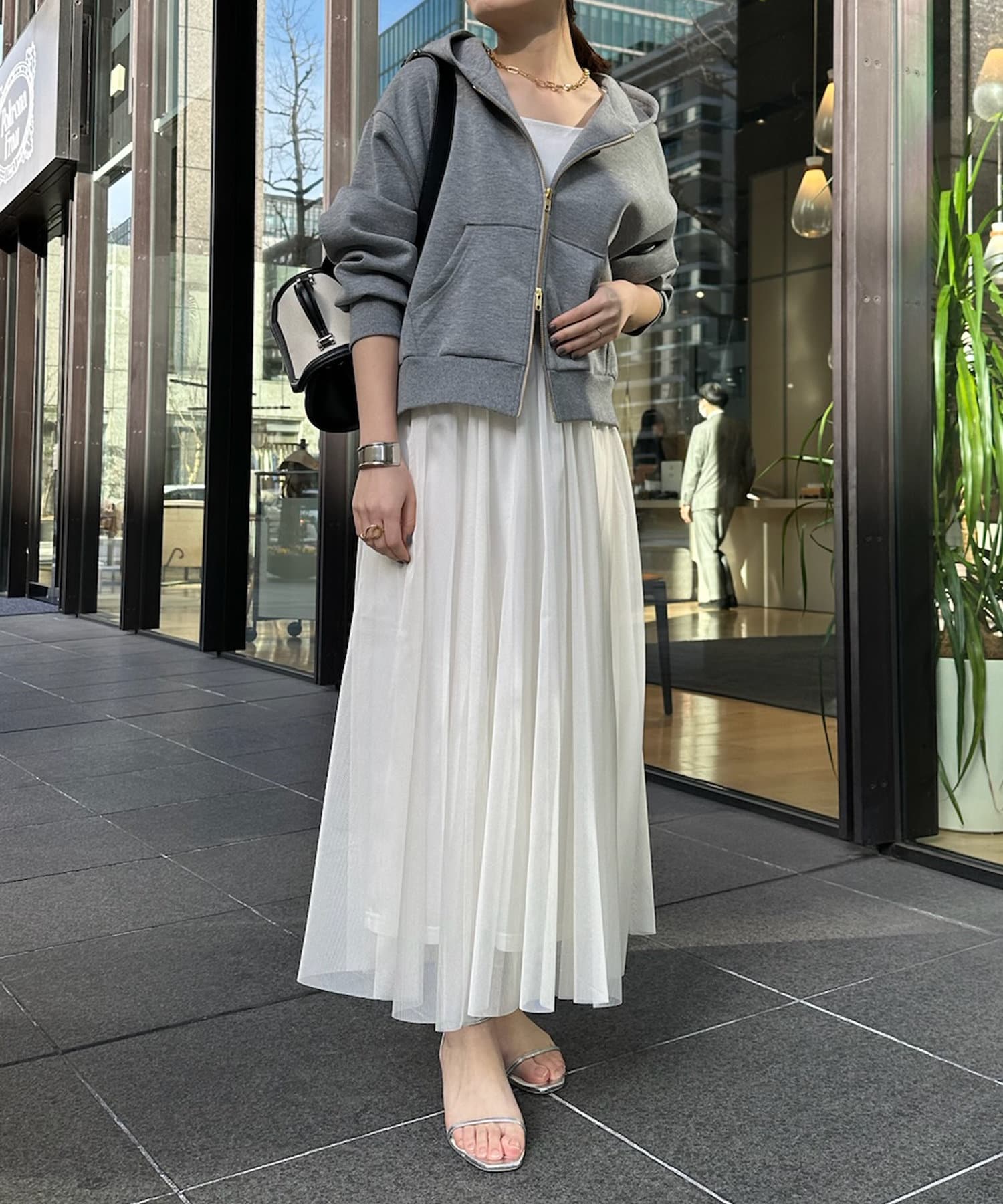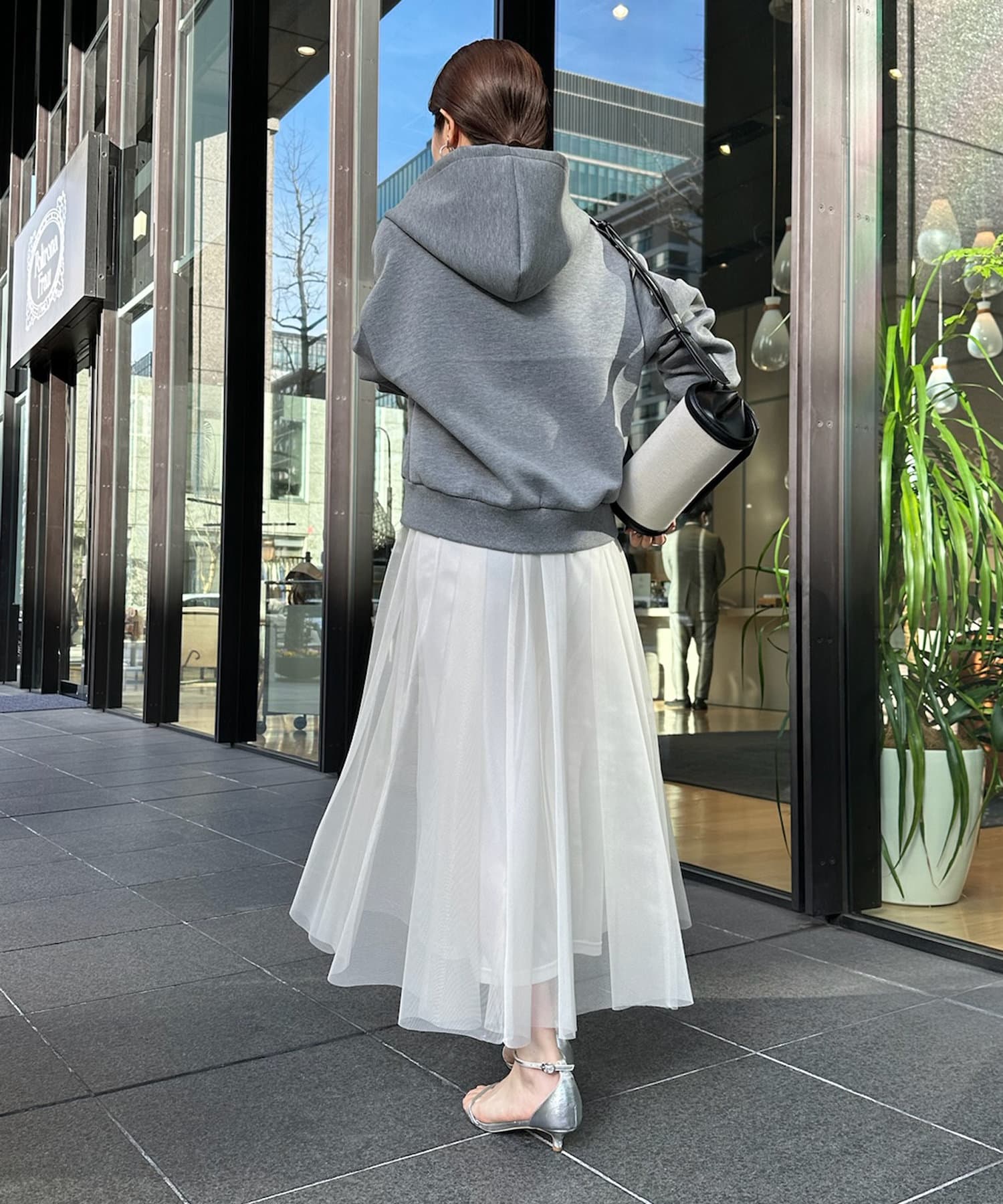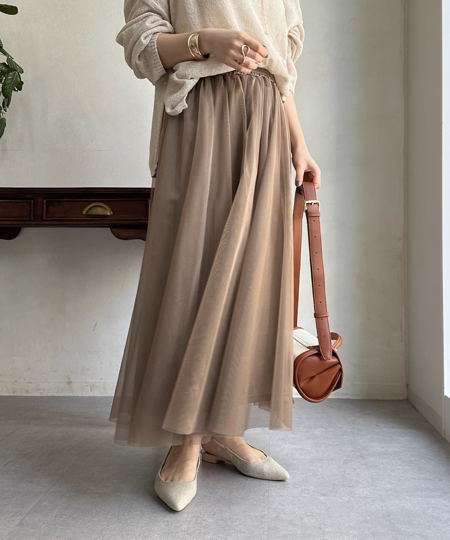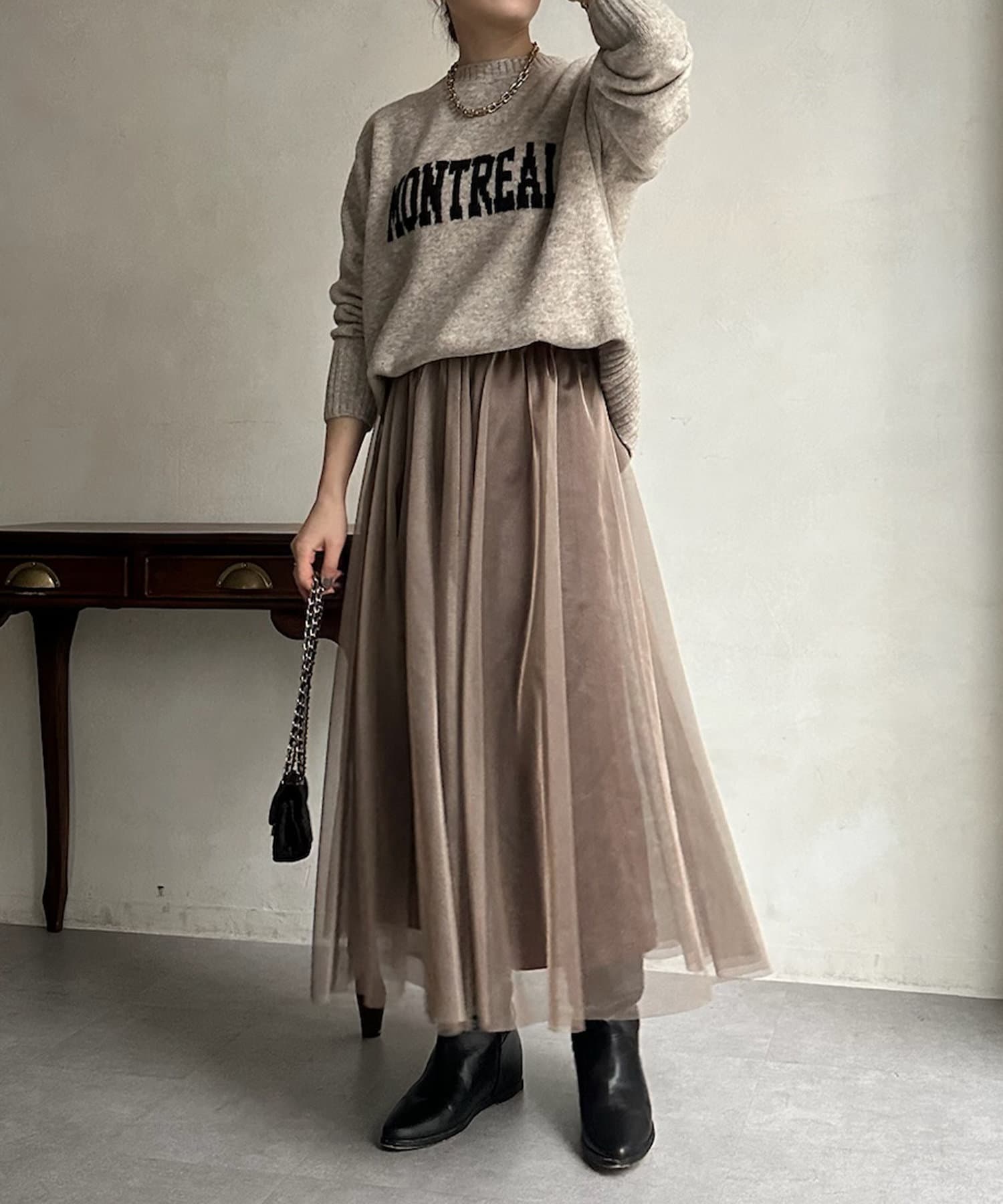 広がりすぎずに落ち感の出るシルエットと長めのレングスで甘くなりすぎず、大人フェミニンになアイテムです!