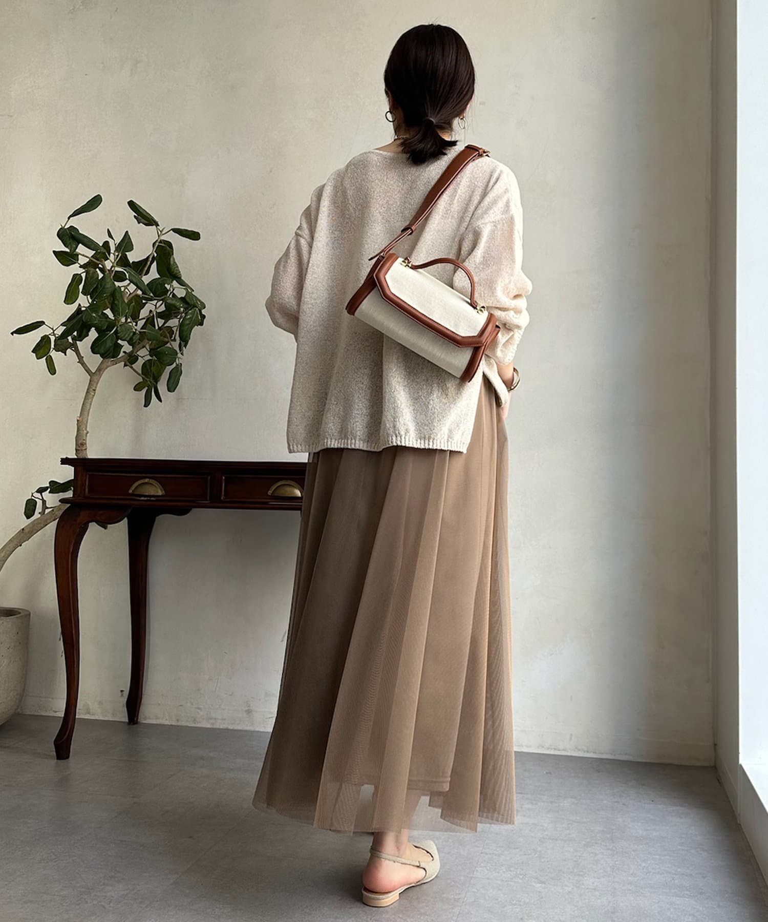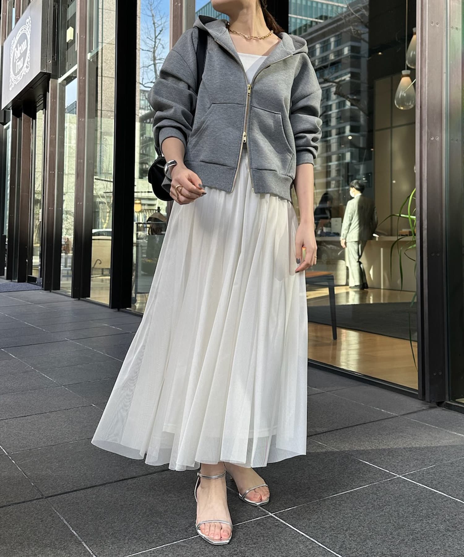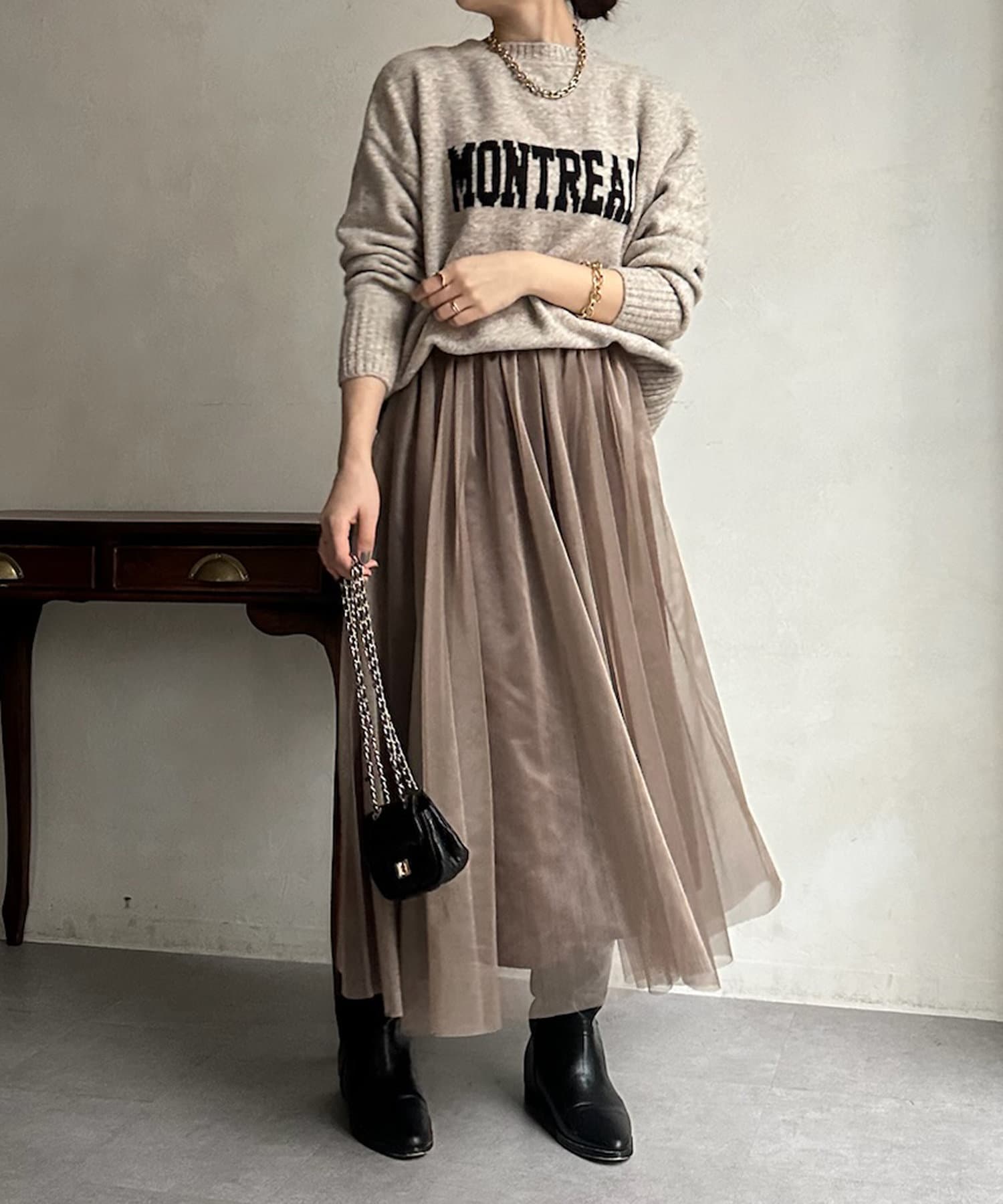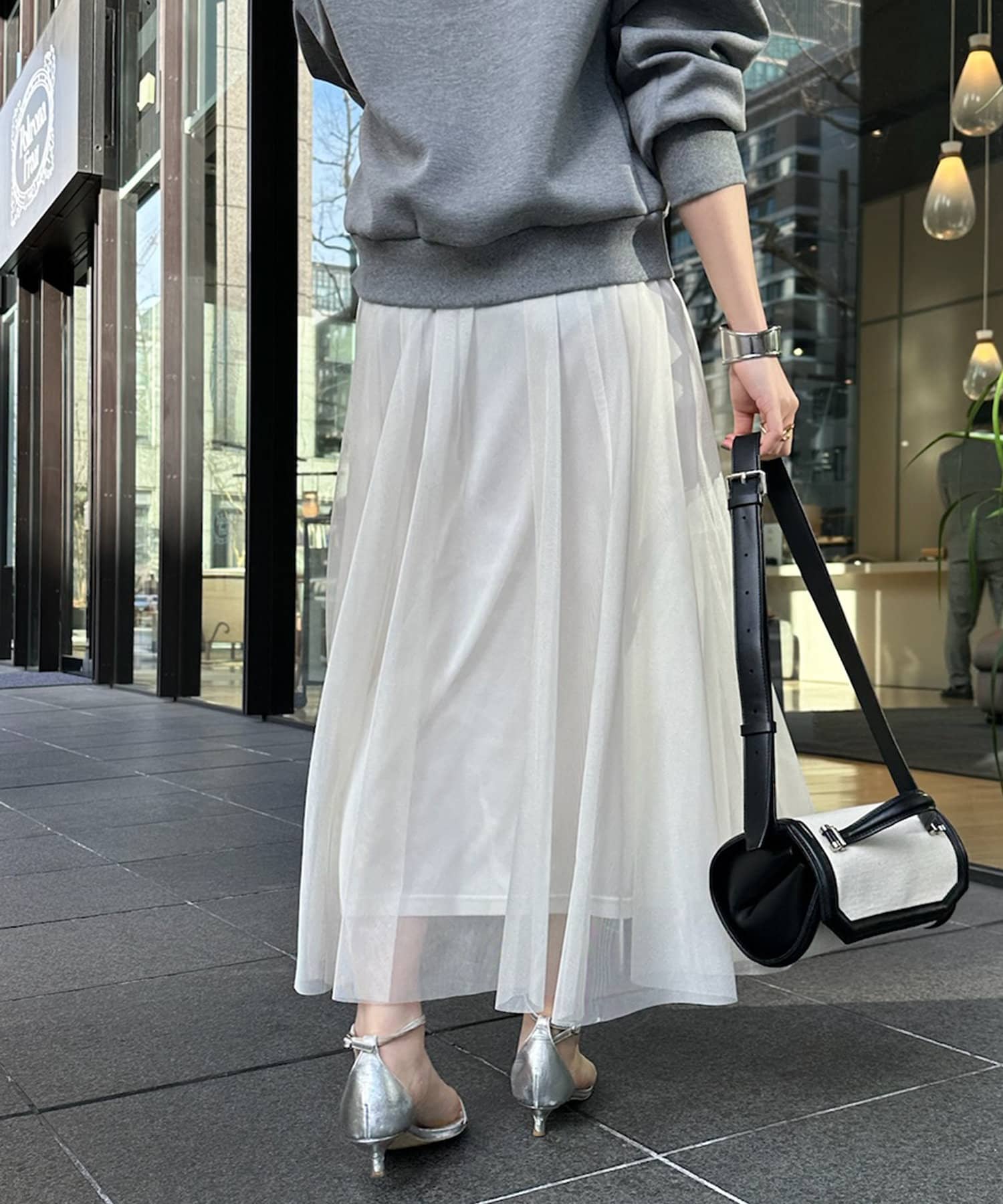 広がりすぎずに落ち感の出るシルエットと長めのレングスで甘くなりすぎず、大人フェミニンになアイテムです!