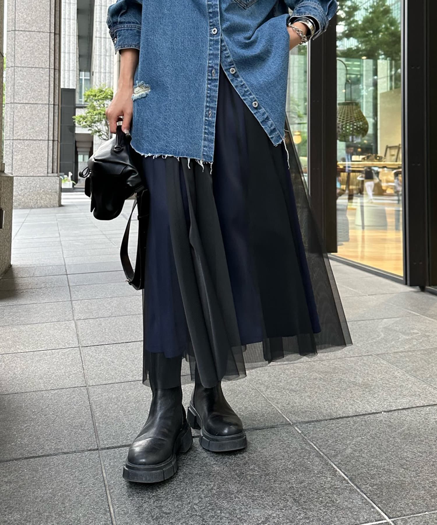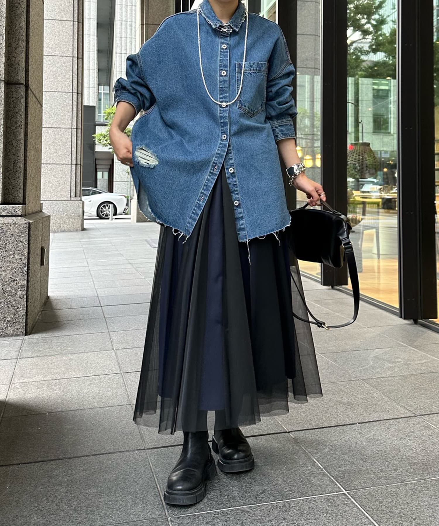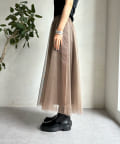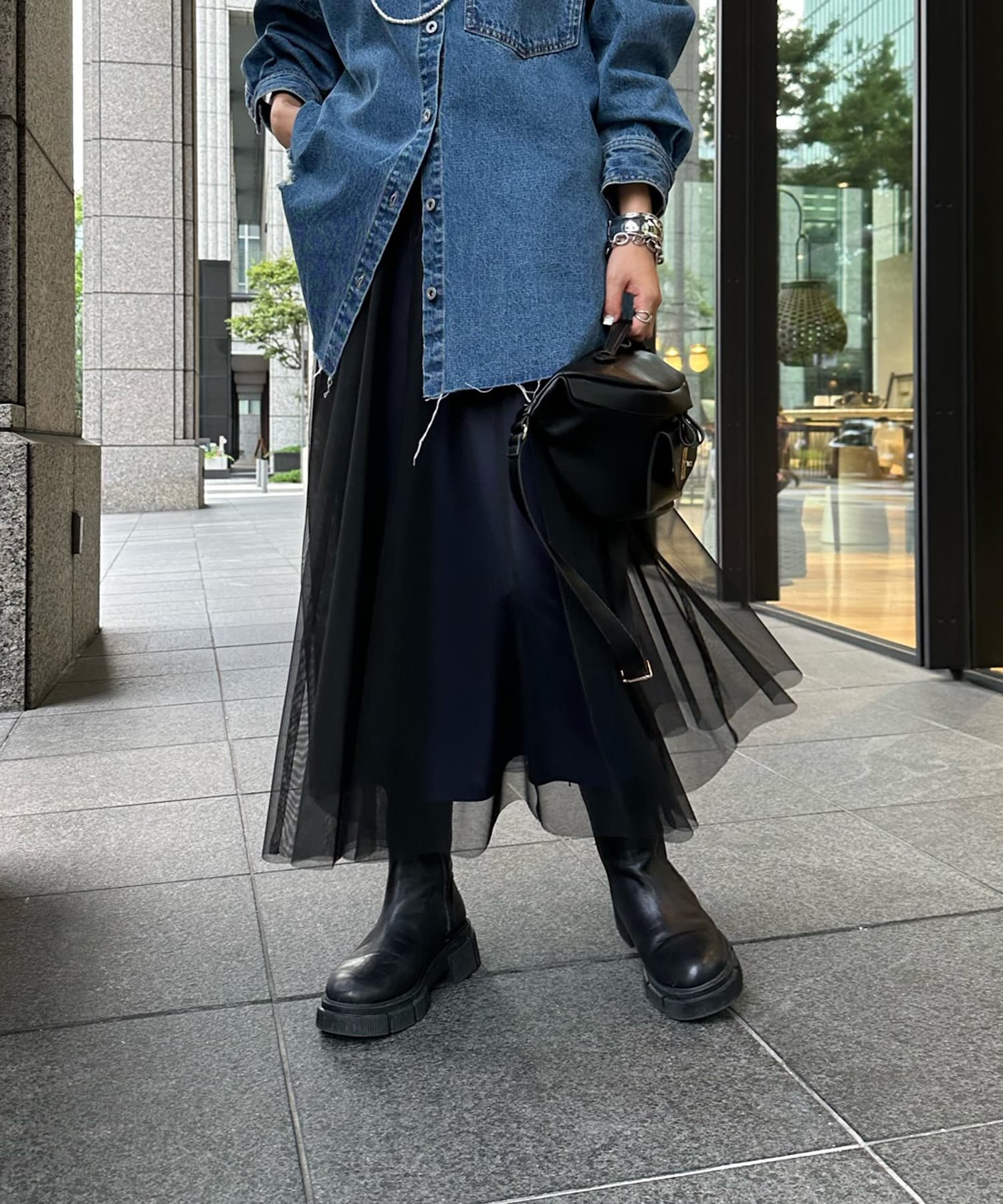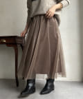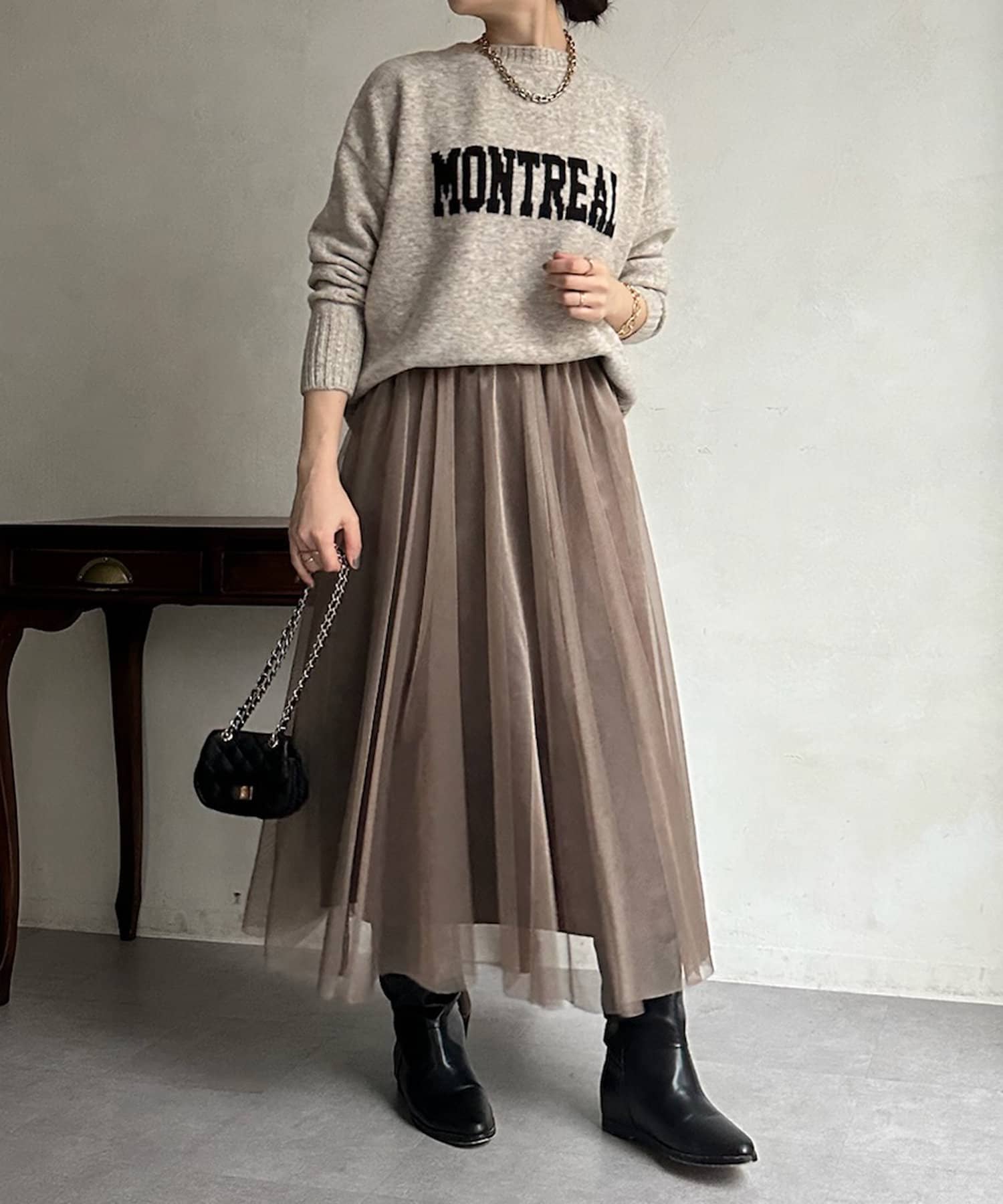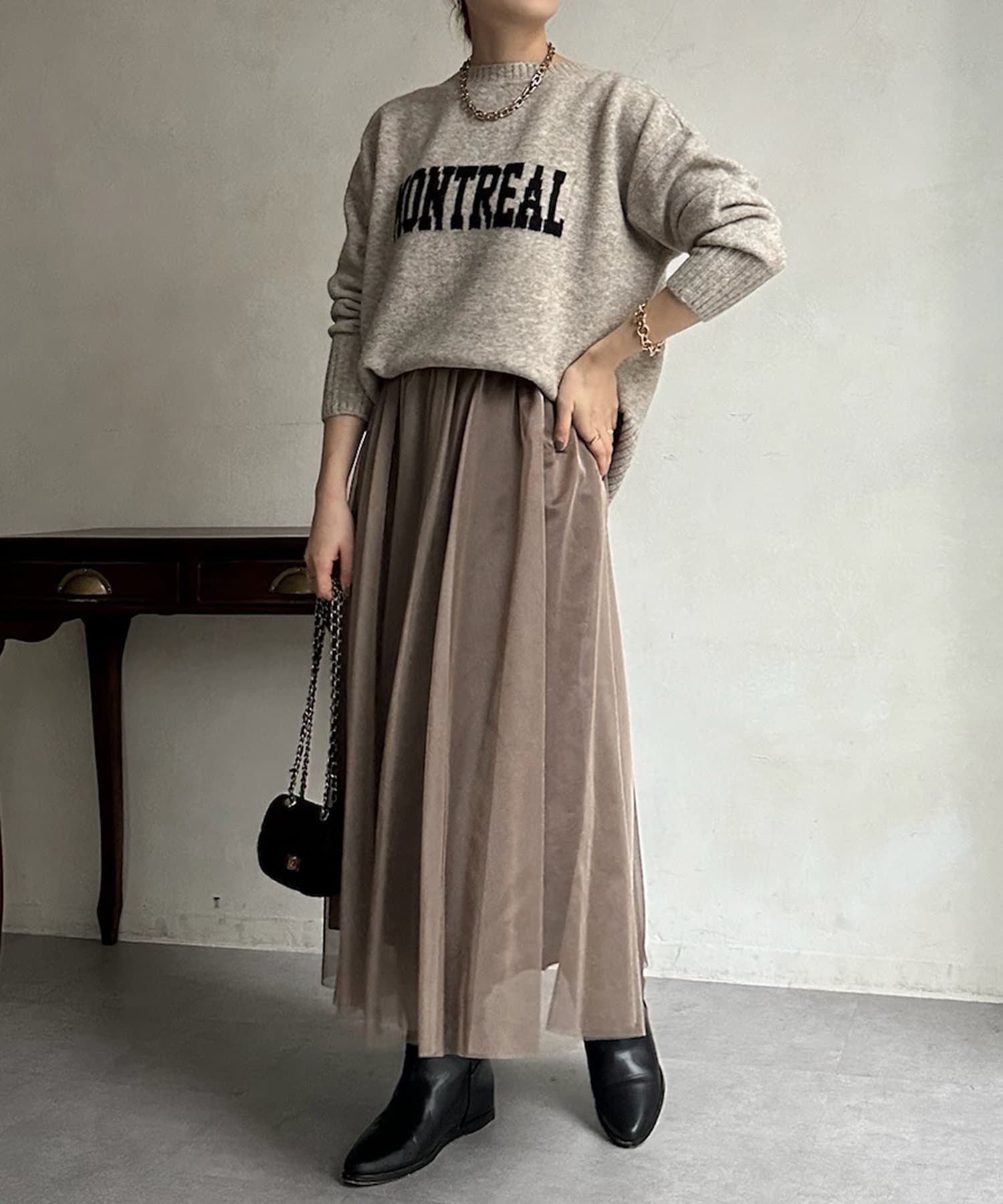 広がりすぎずに落ち感の出るシルエットと長めのレングスで甘くなりすぎず、大人フェミニンになアイテムです!