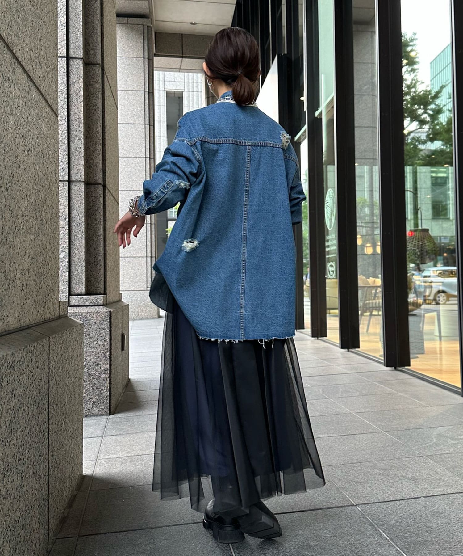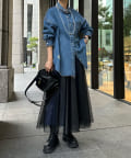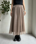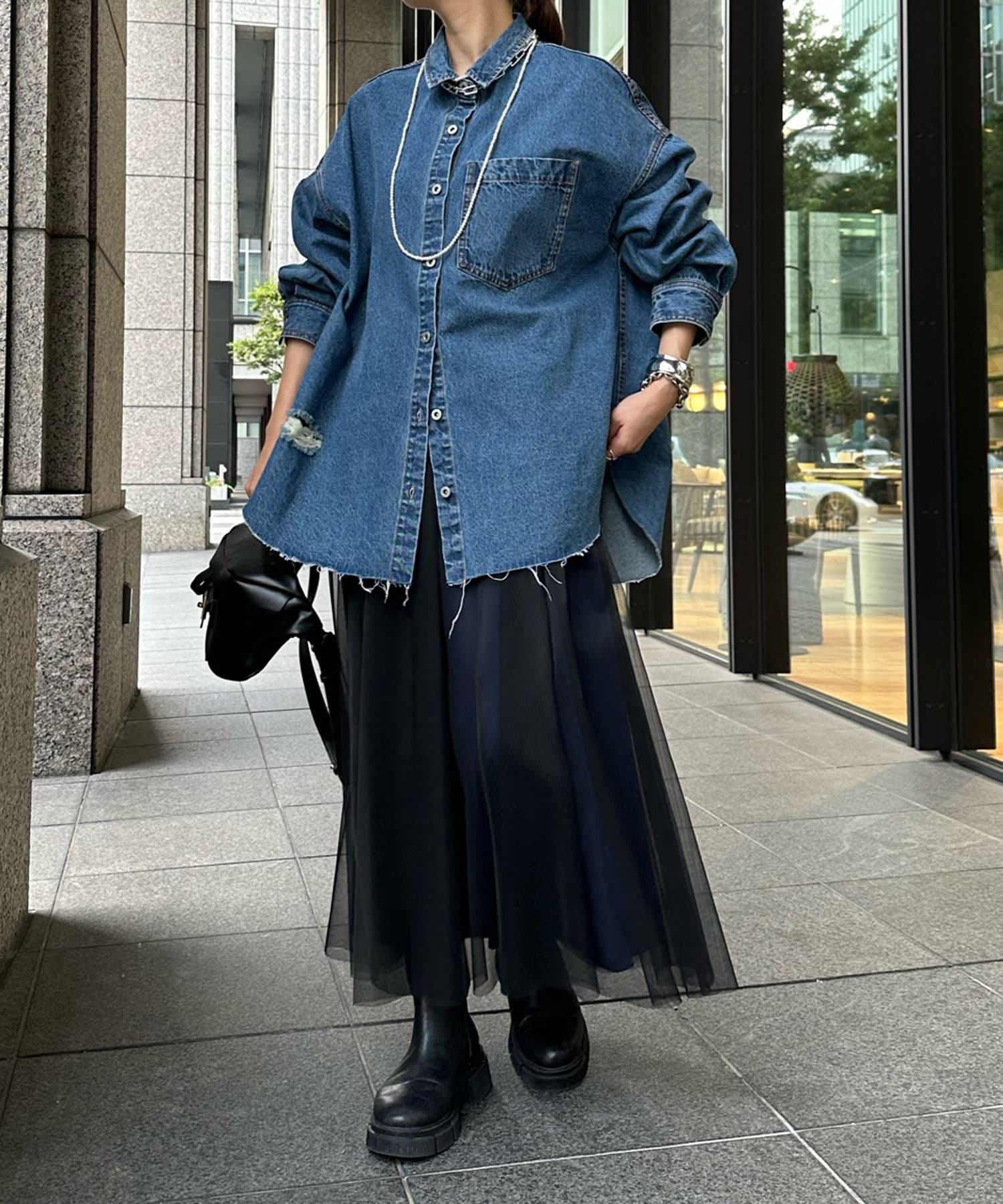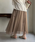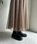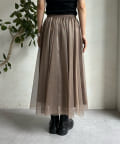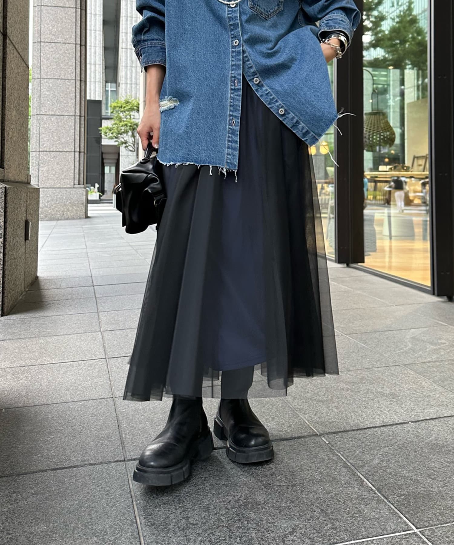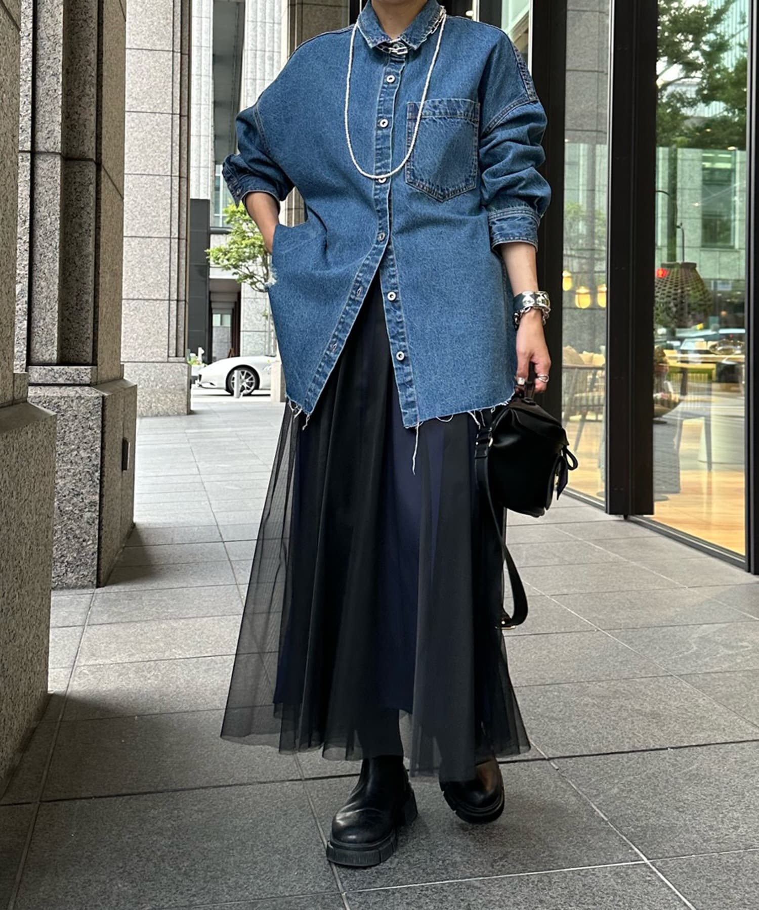 広がりすぎずに落ち感の出るシルエットと長めのレングスで甘くなりすぎず、大人フェミニンになアイテムです!