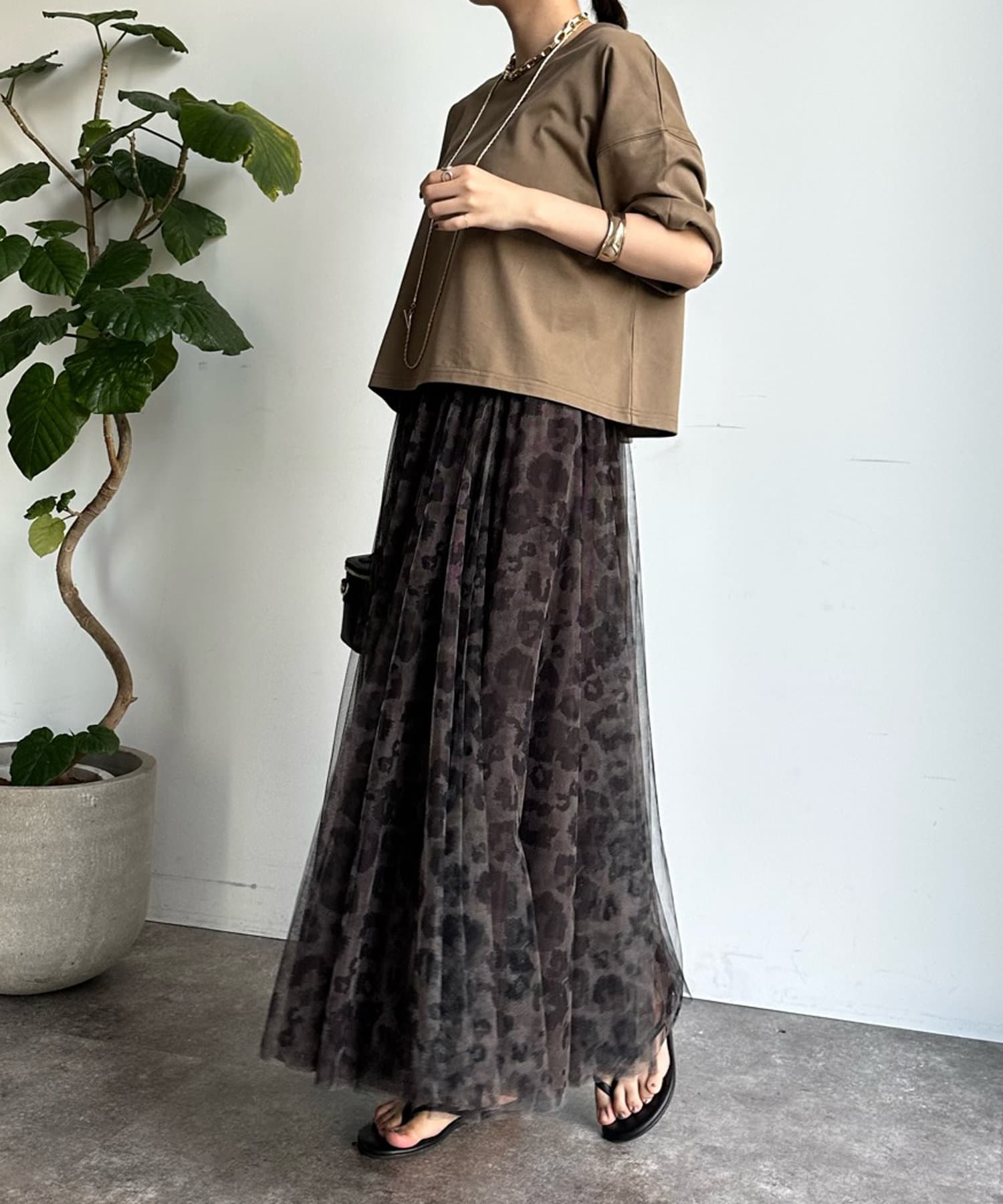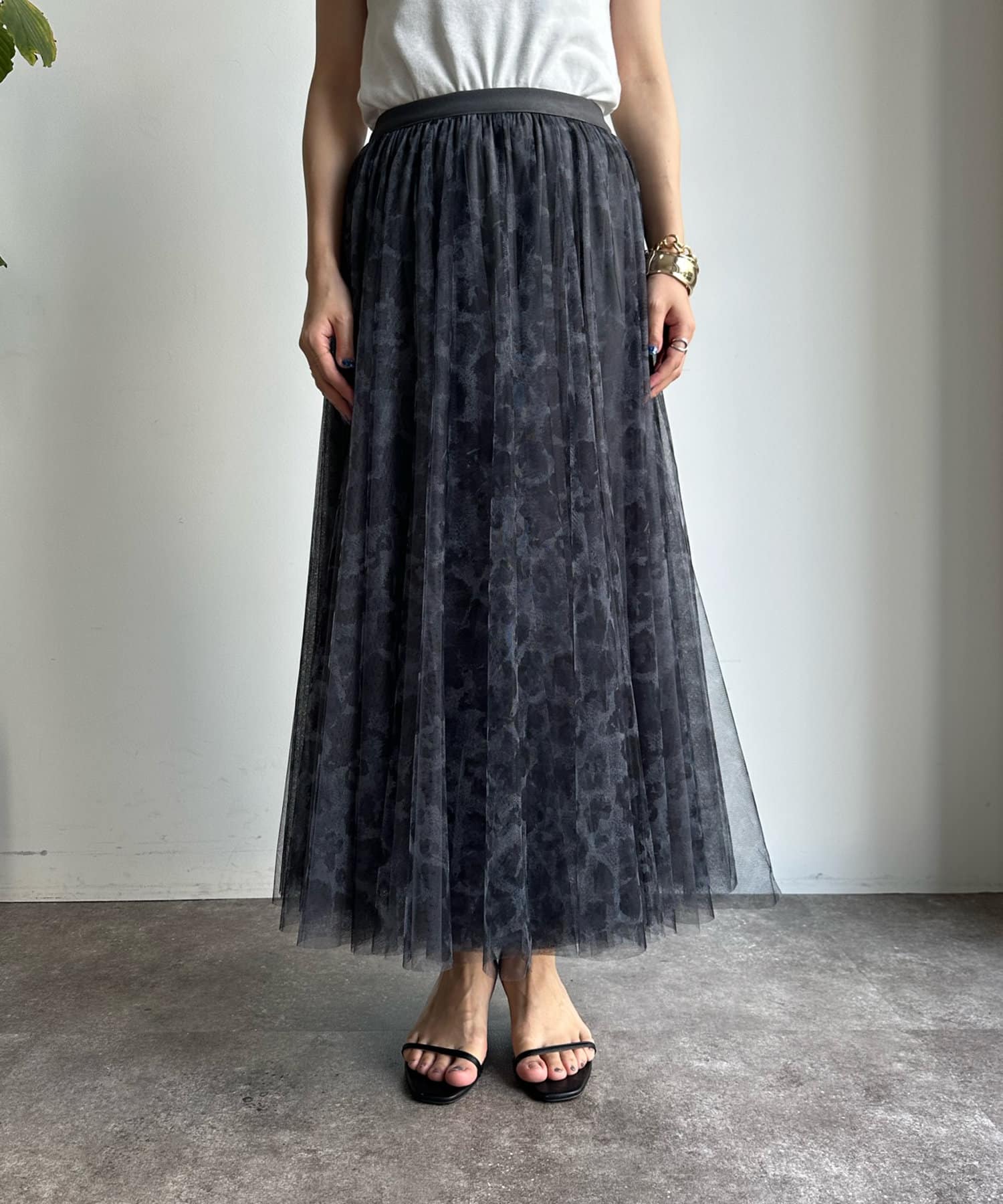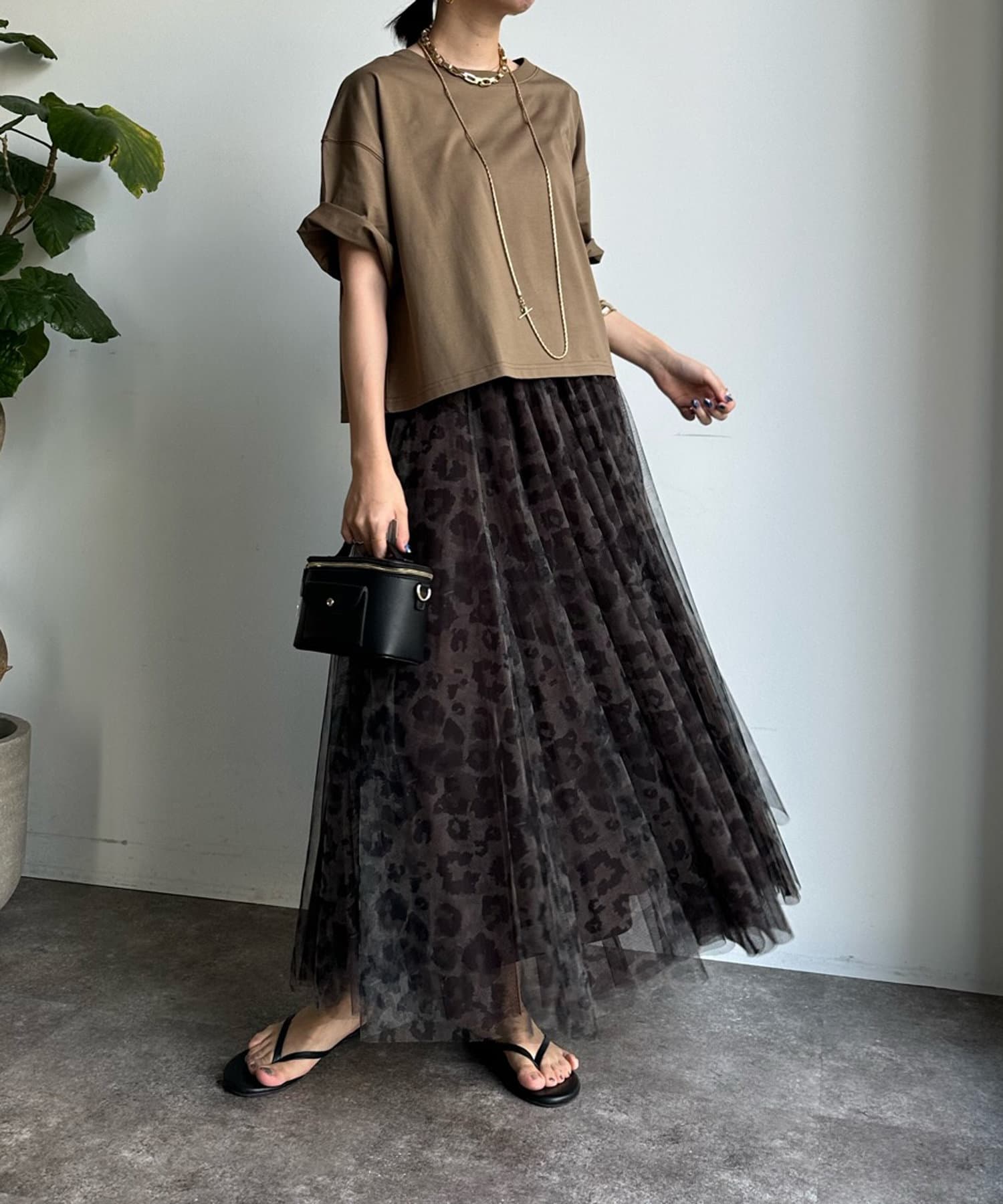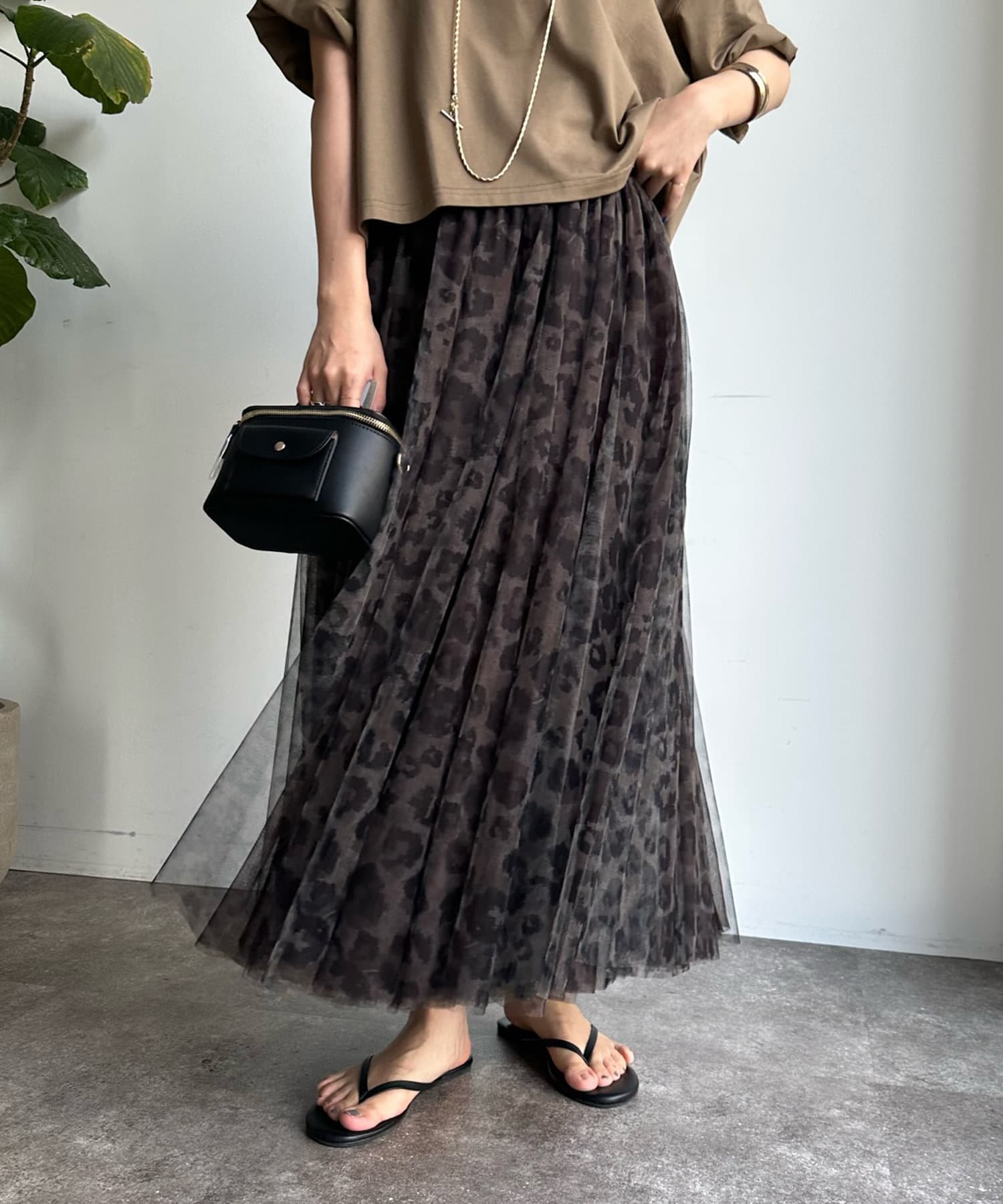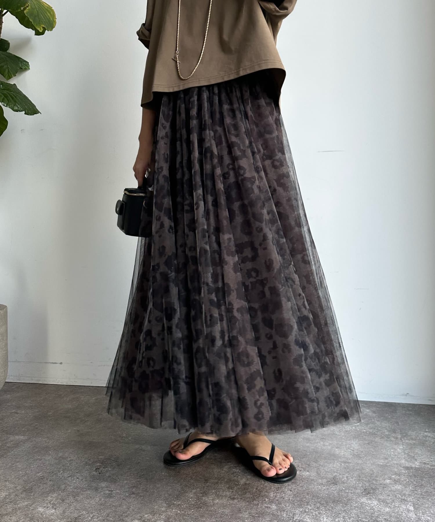 派手過ぎない色合いで落ち着いた印象を与えてくれるレオパード柄のチュールスカートです。