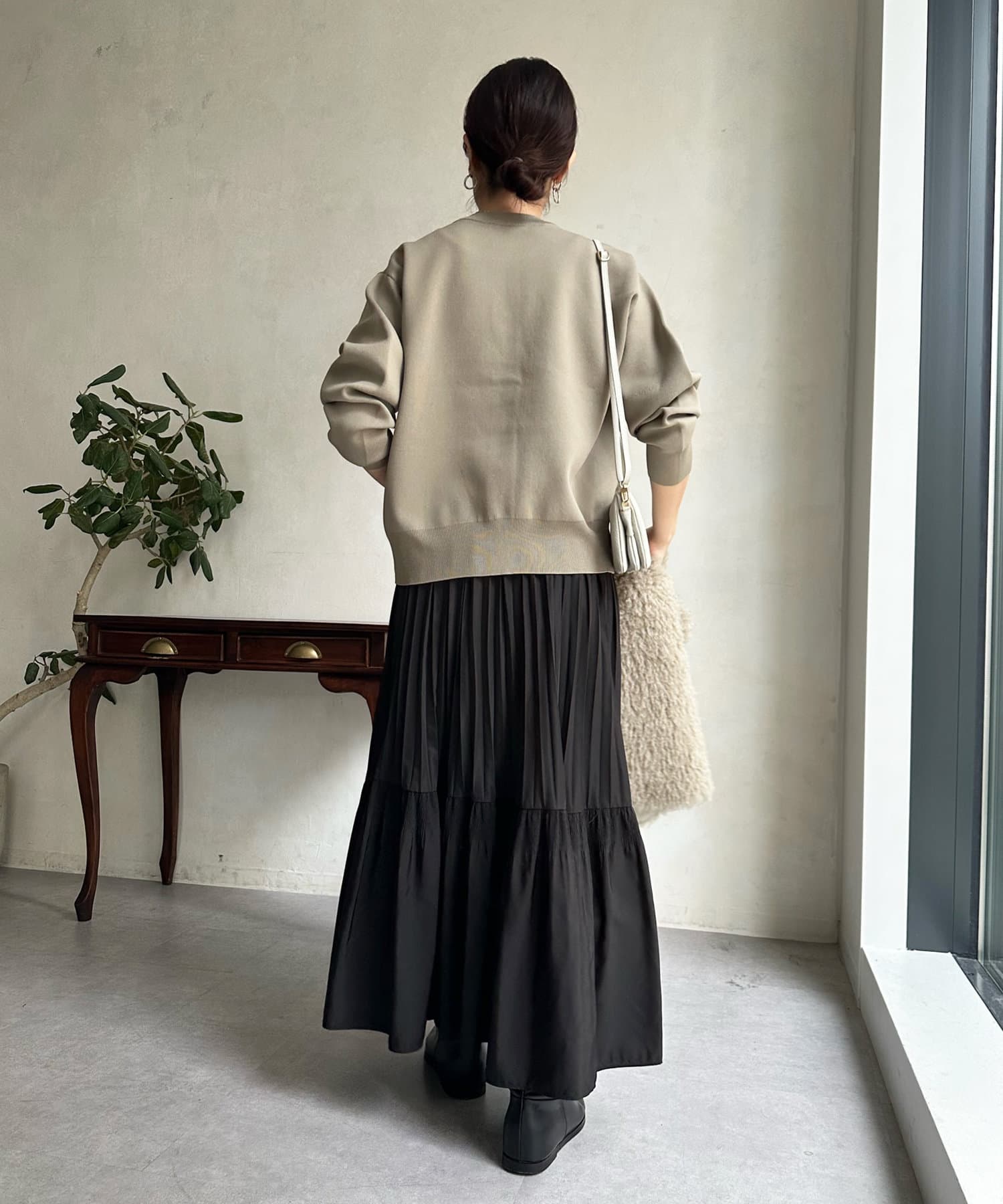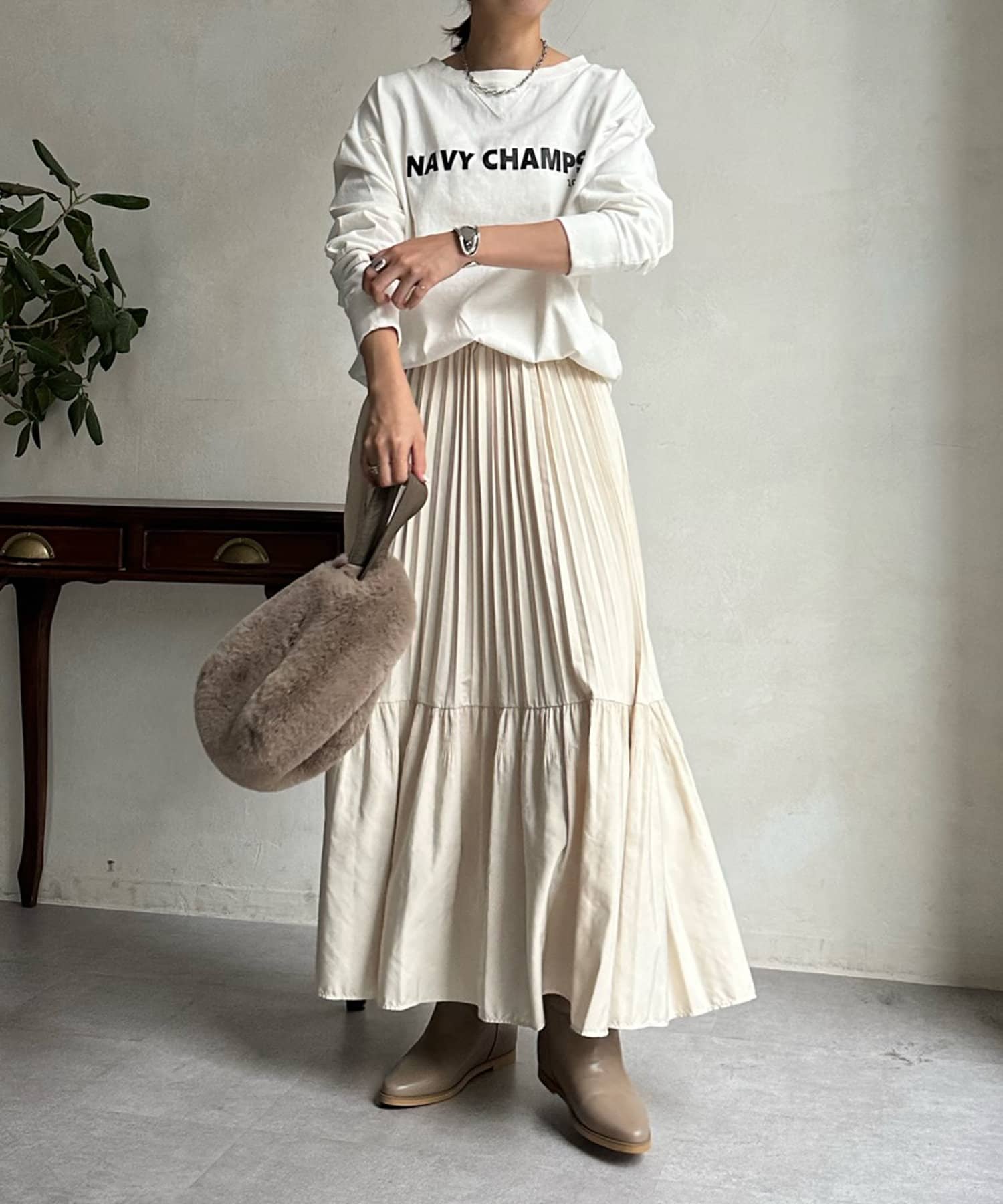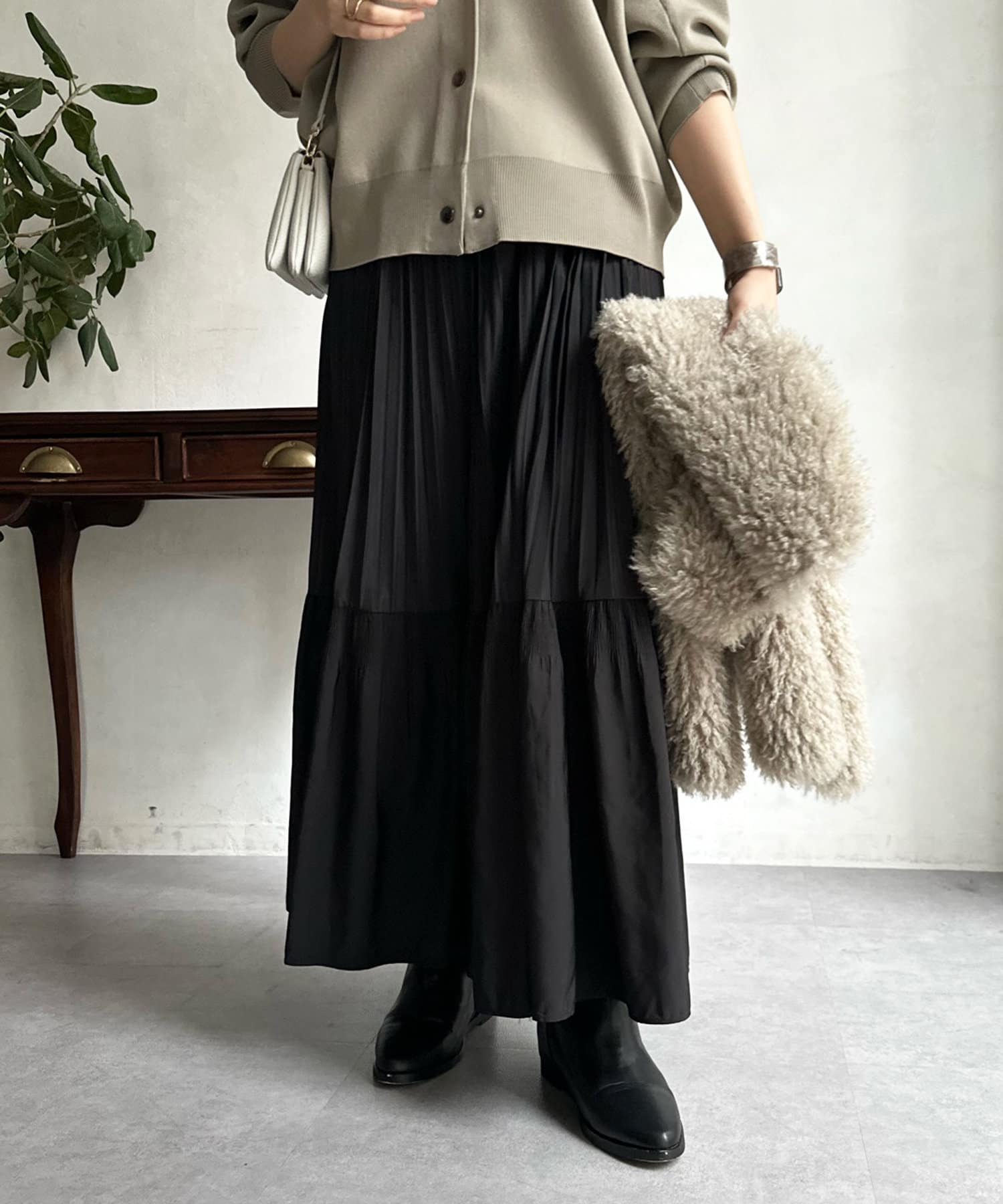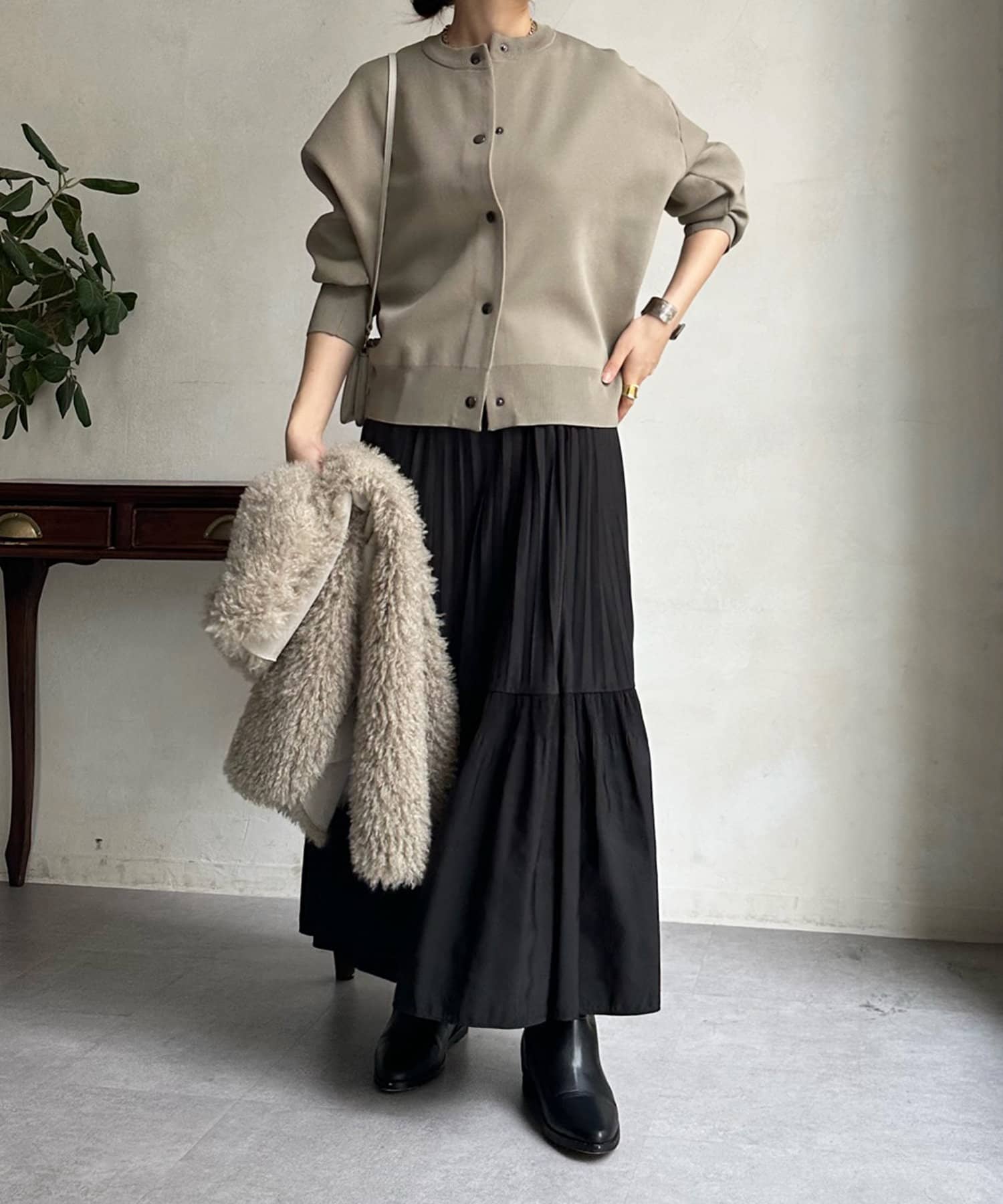 裾に向かって緩やかに広がるシルエットが旬な印象に。
