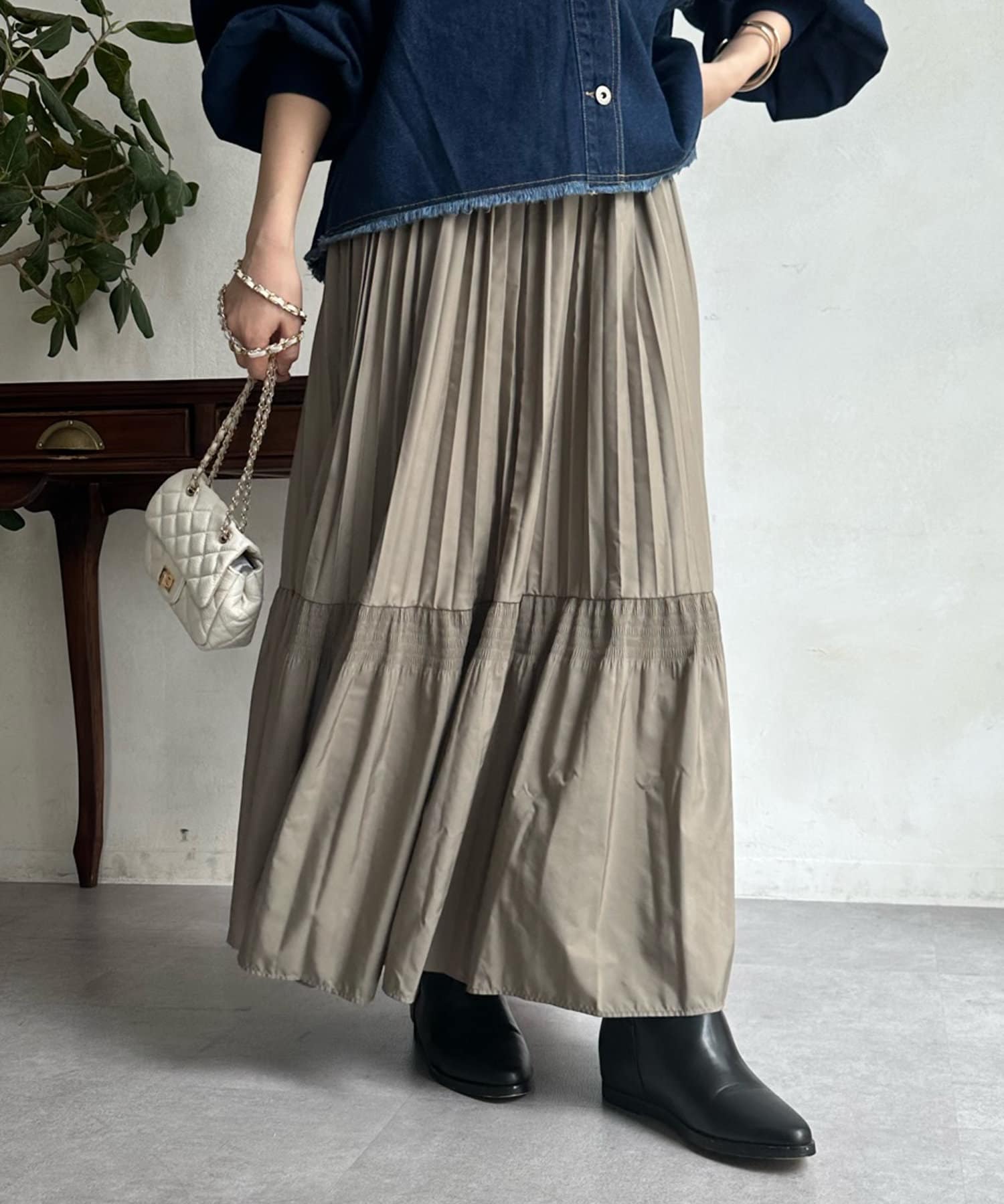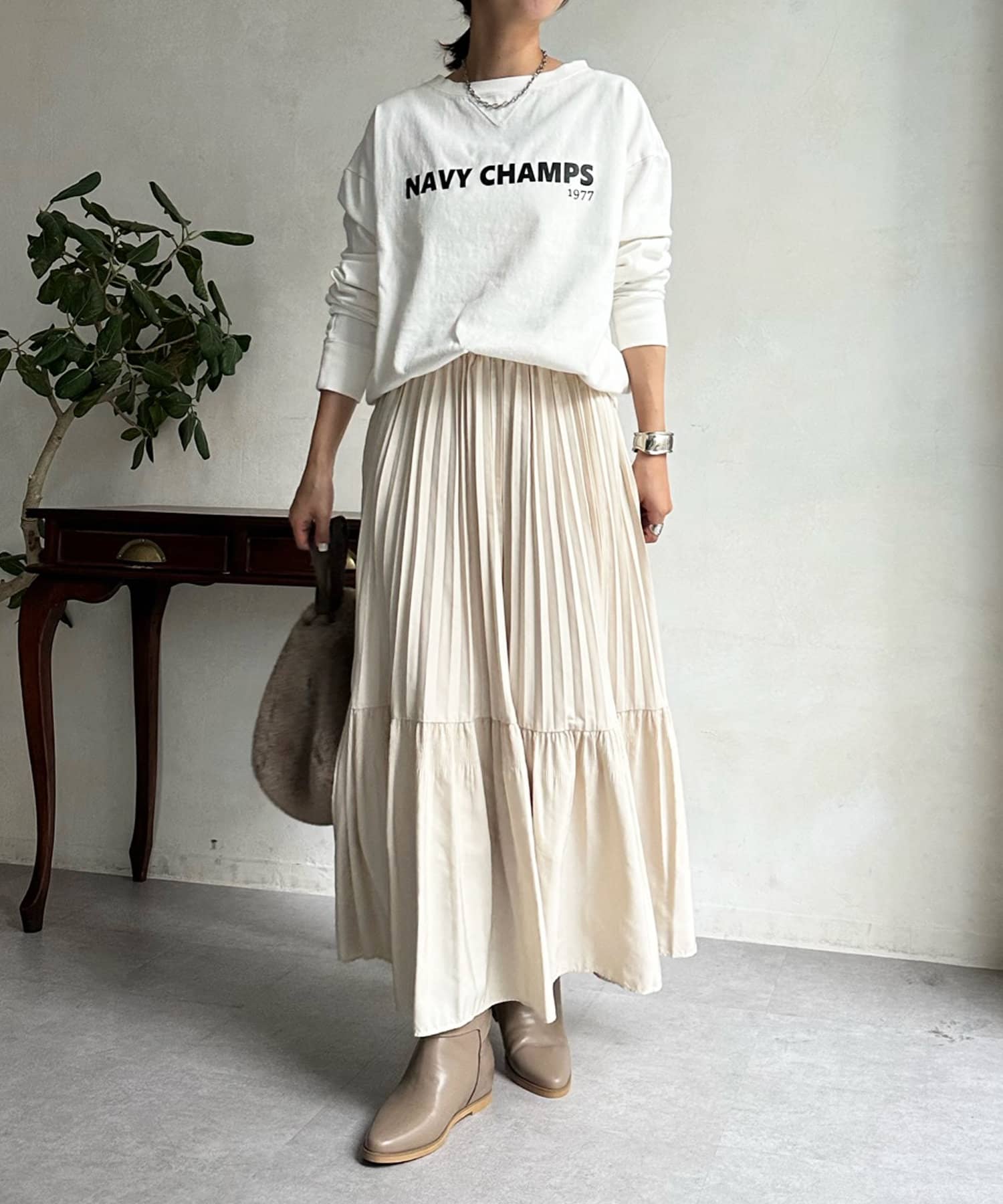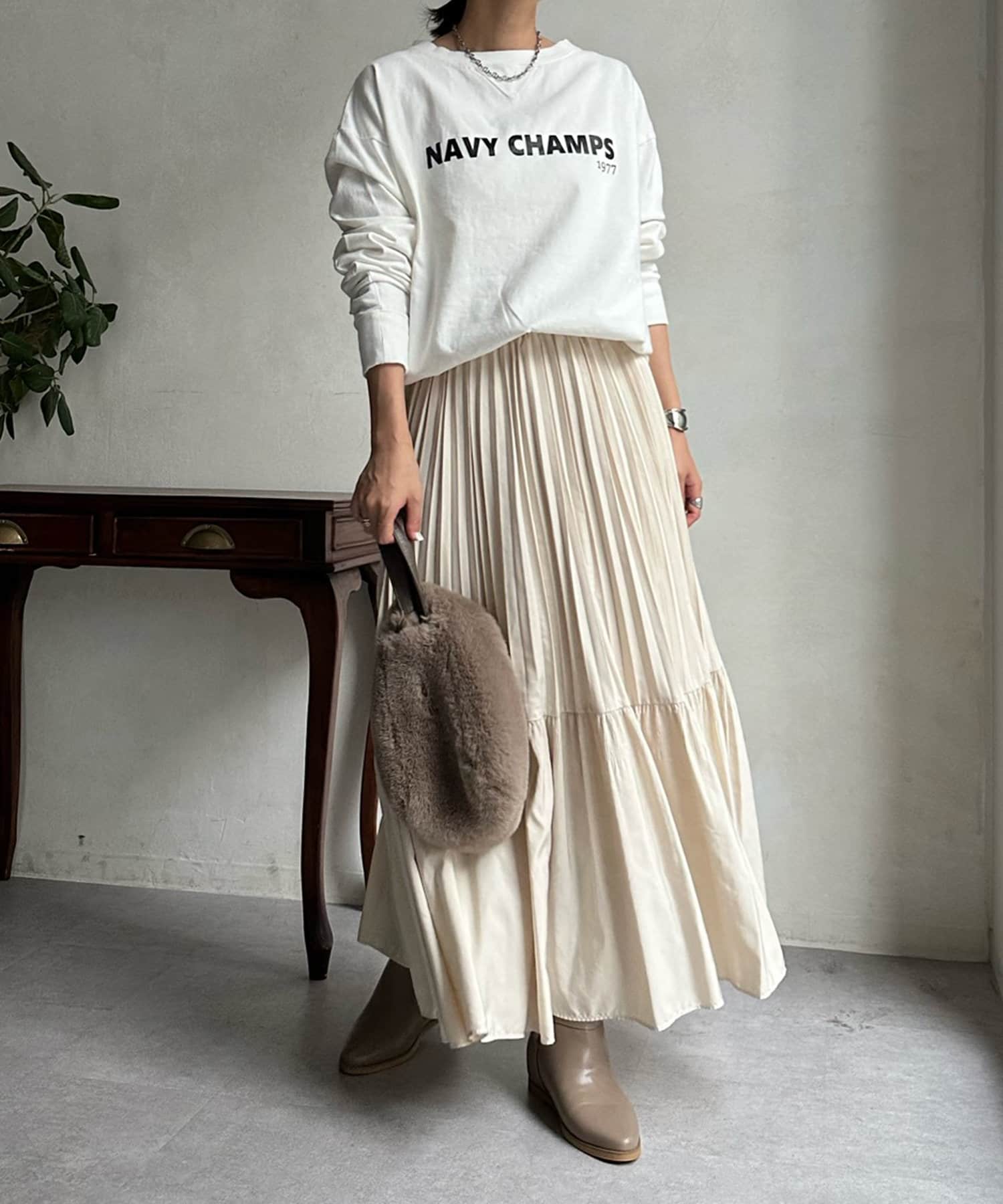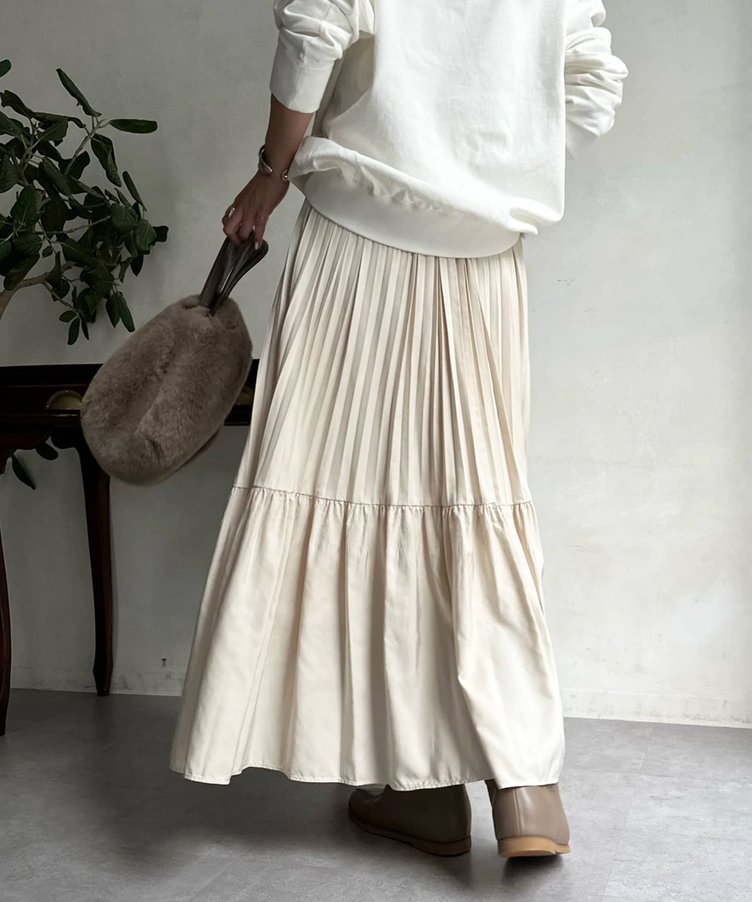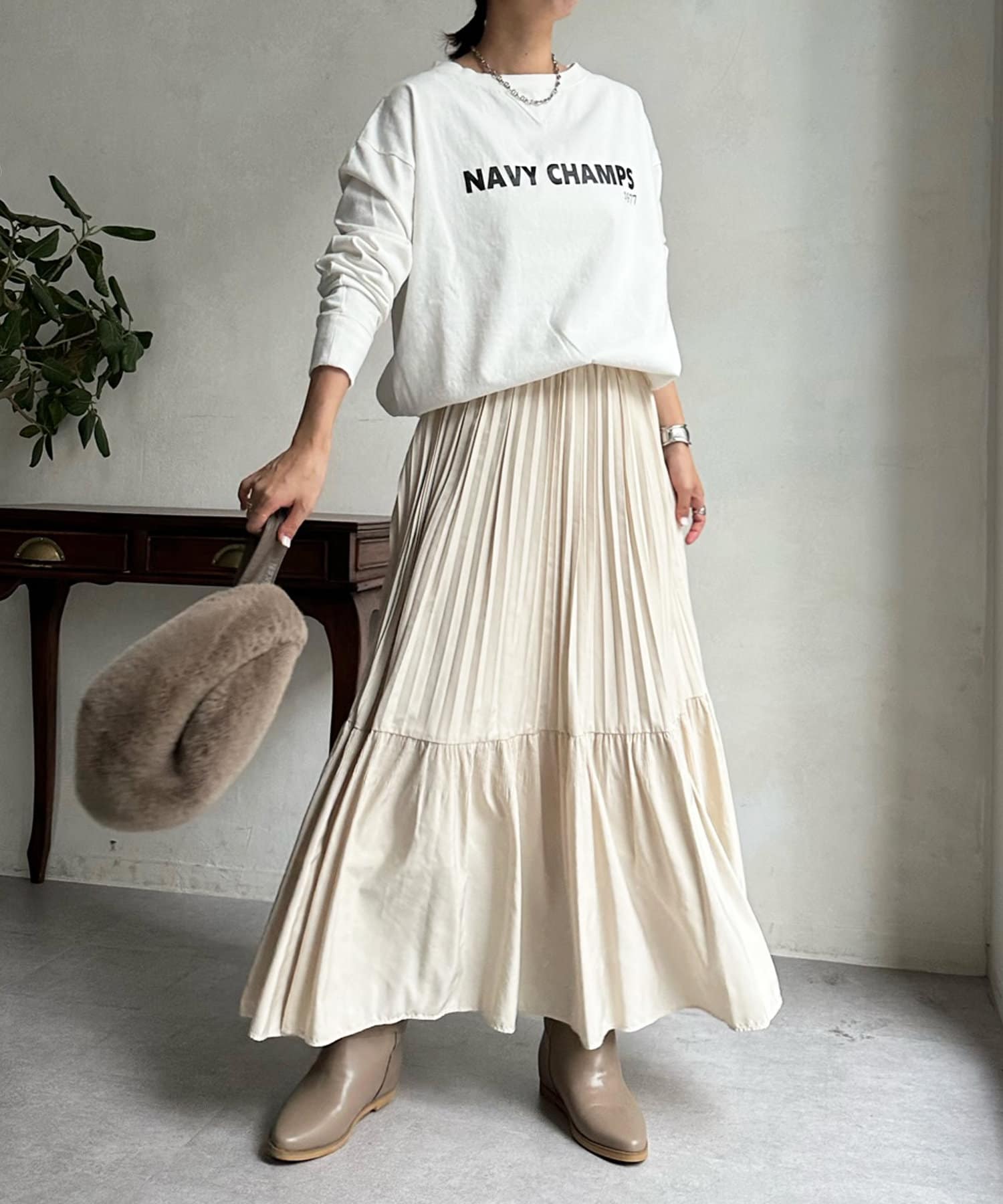 裾に向かって緩やかに広がるシルエットが旬な印象に。