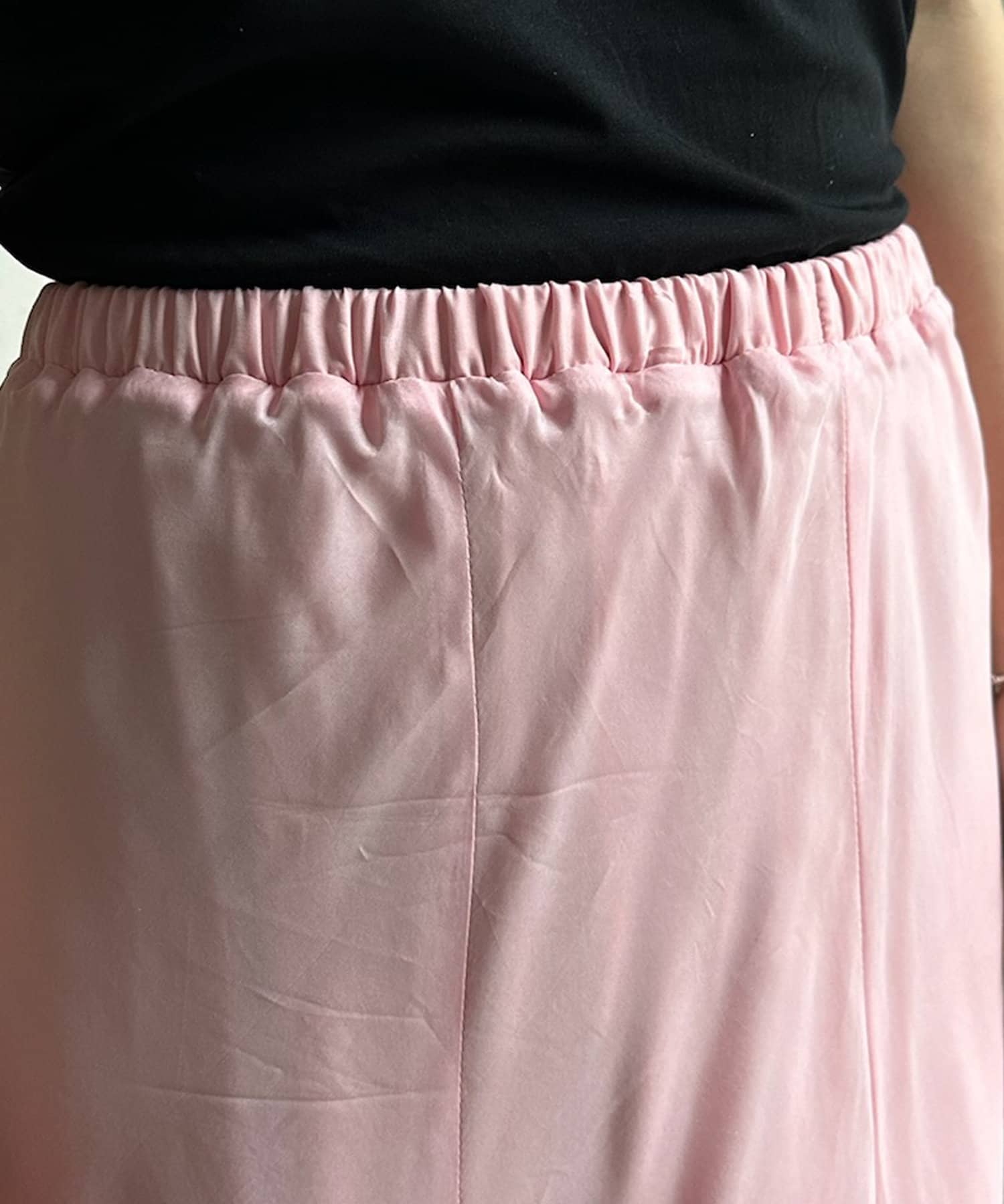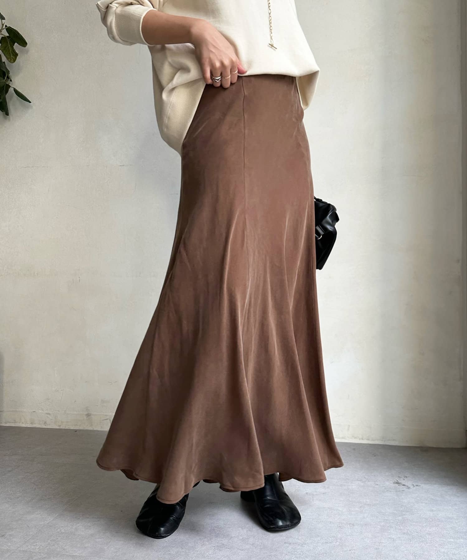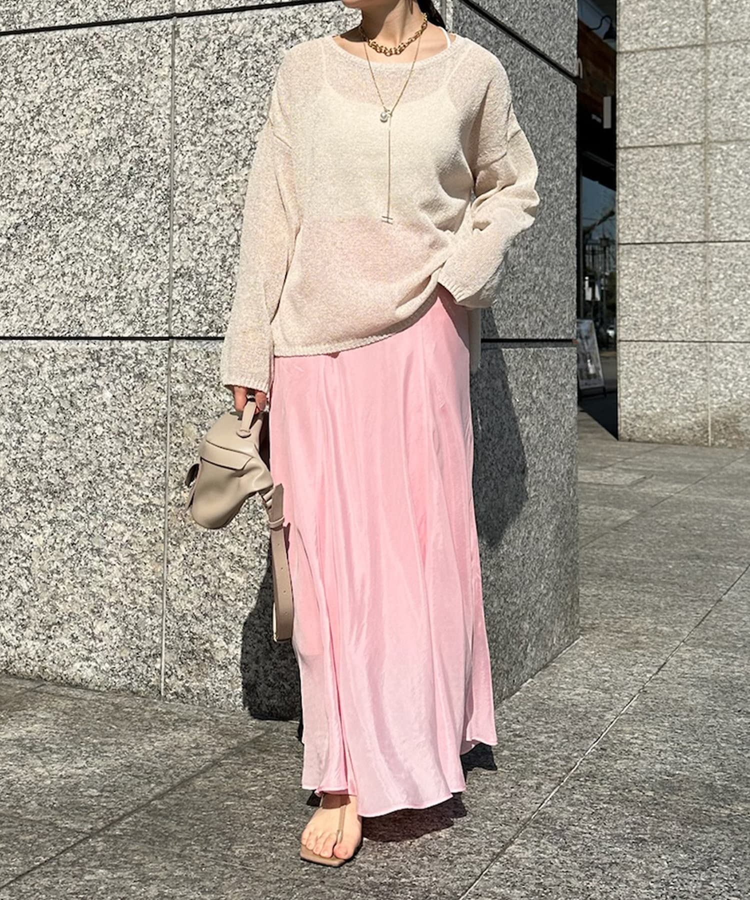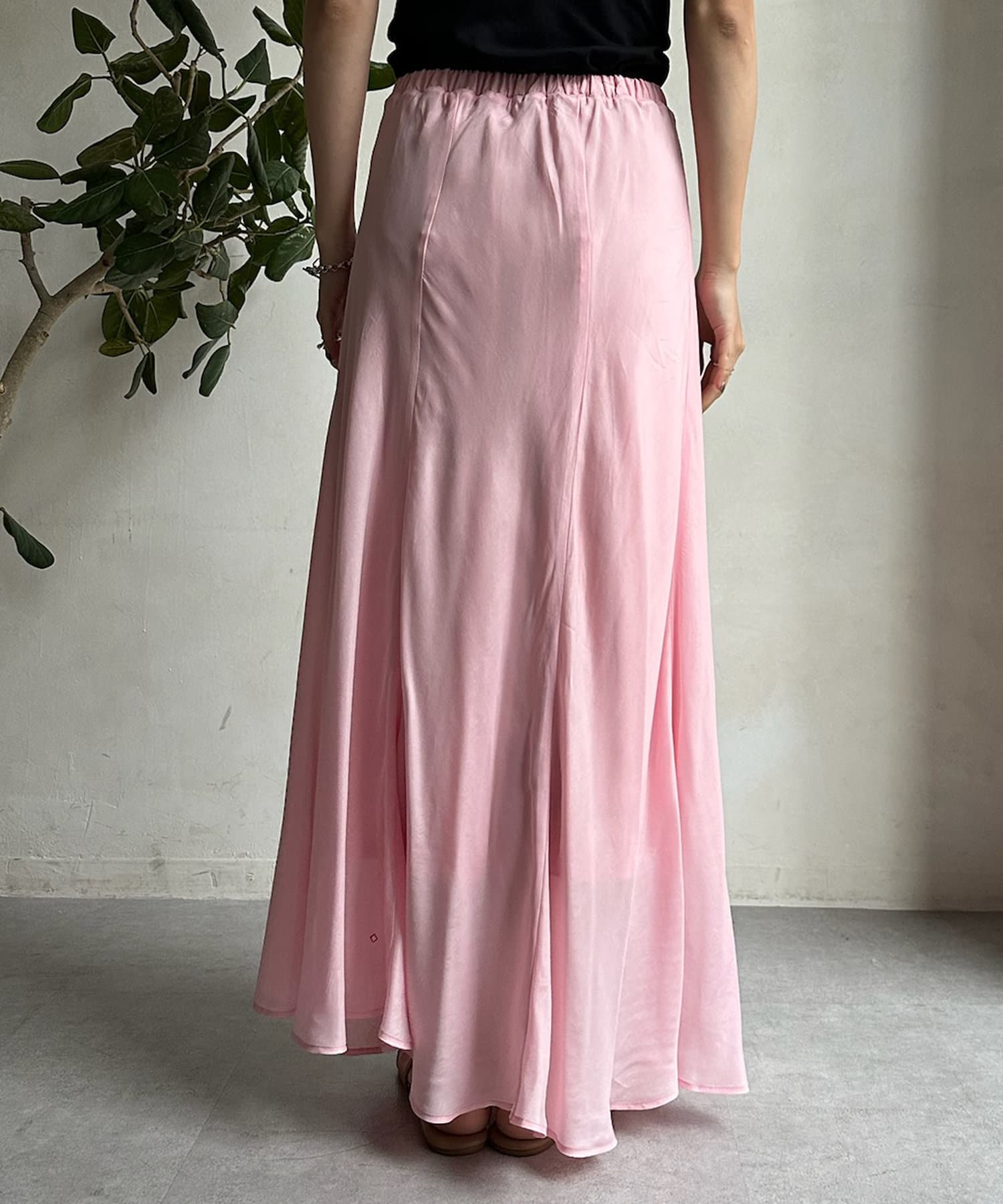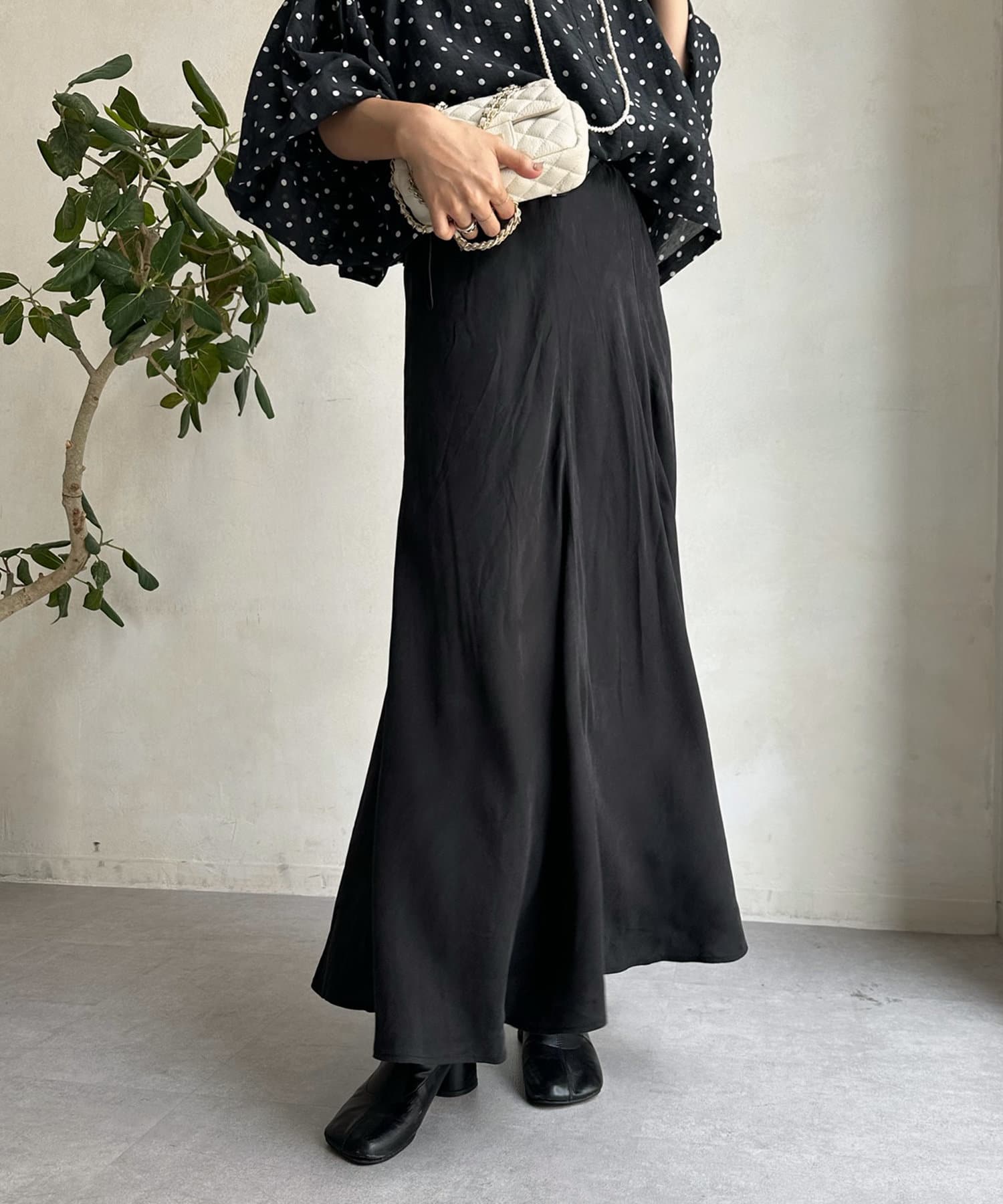 とろみのあるキュプラ100%素材が、きれい見えしてくれるポイントです。また、生地を斜めに裁断するバイヤスカットを採用することで、しなやかな落ち感のシルエットを演出。
