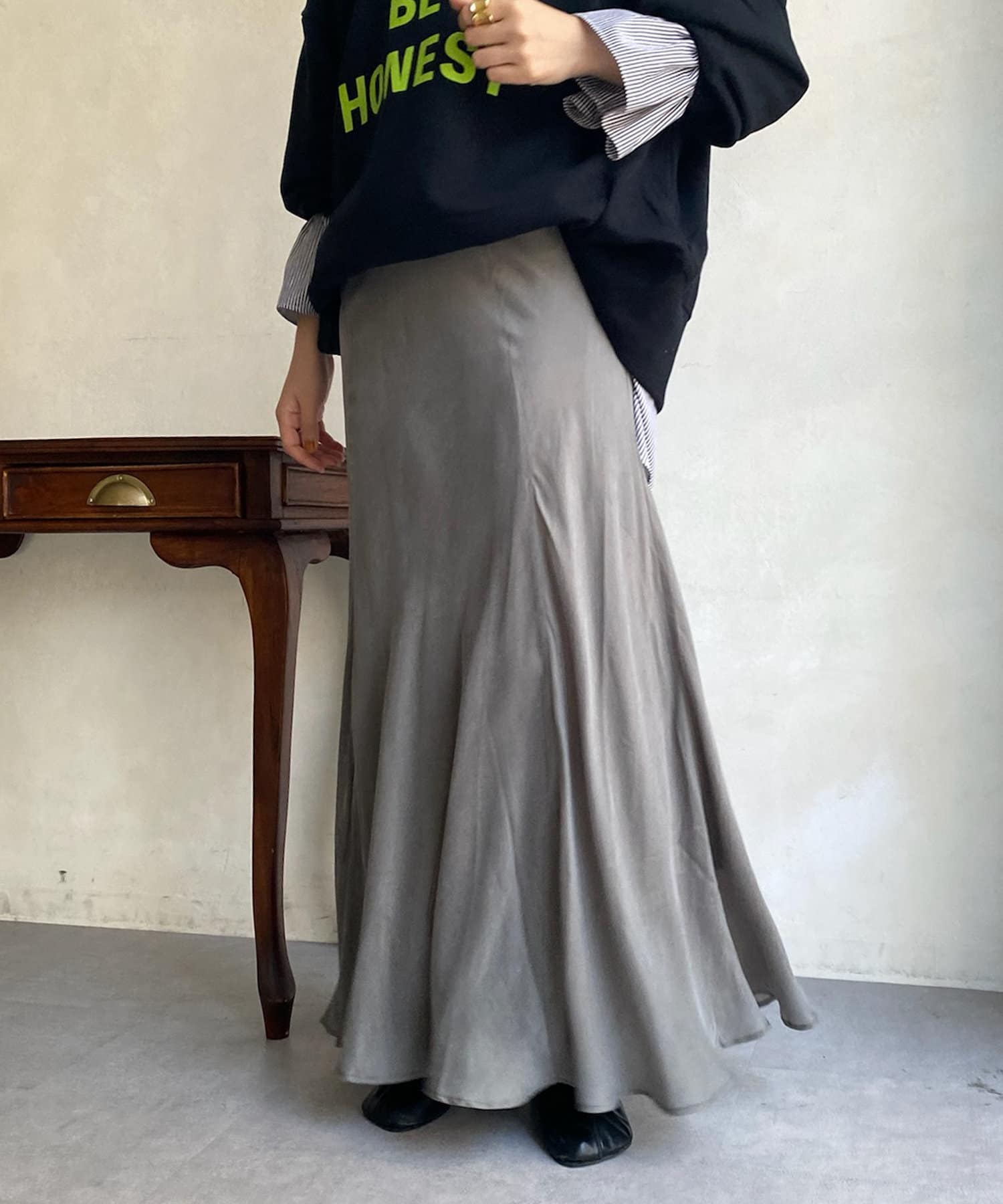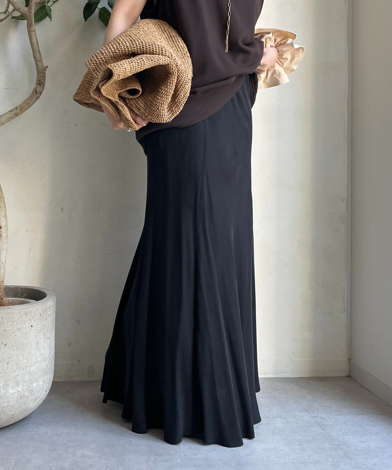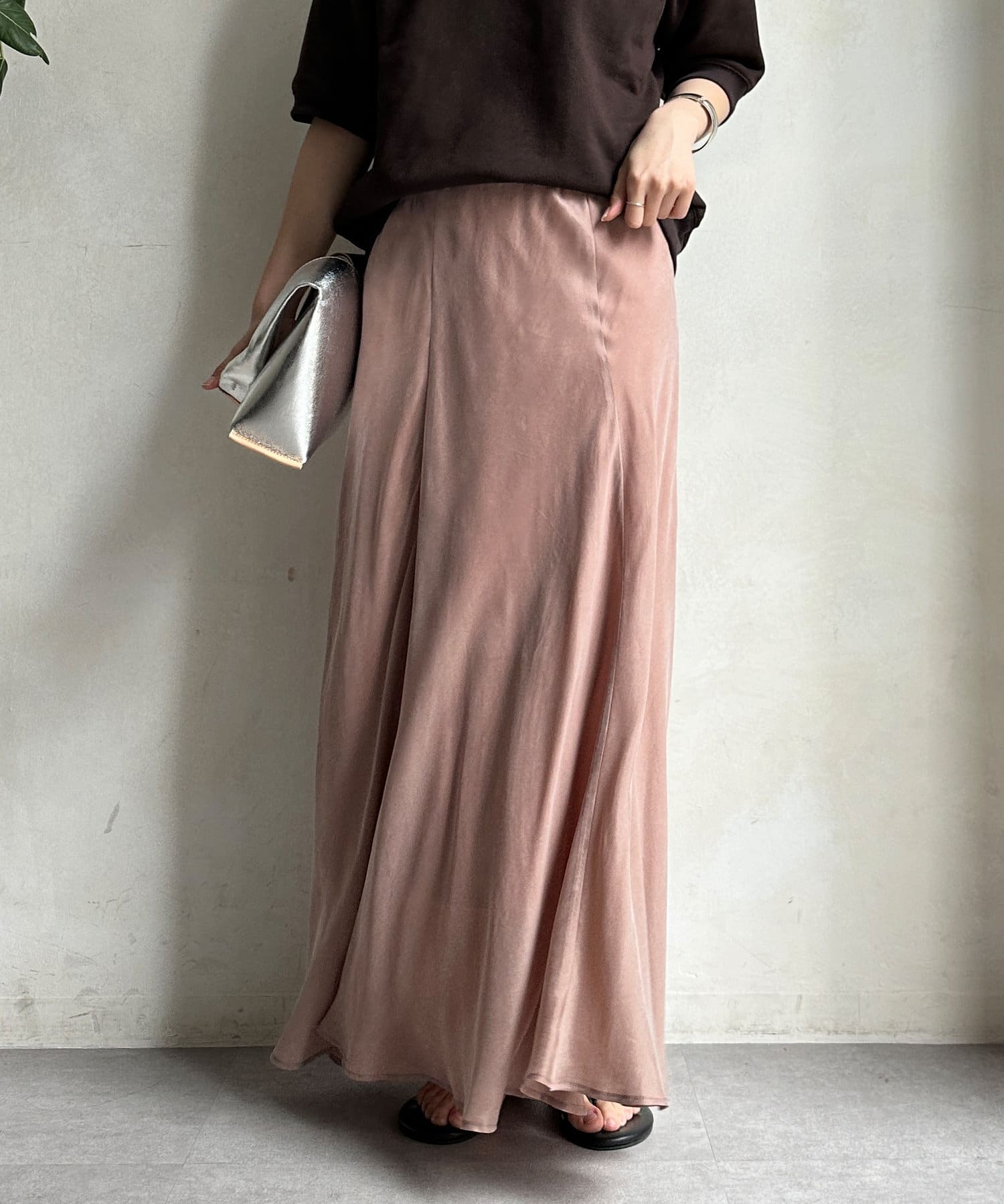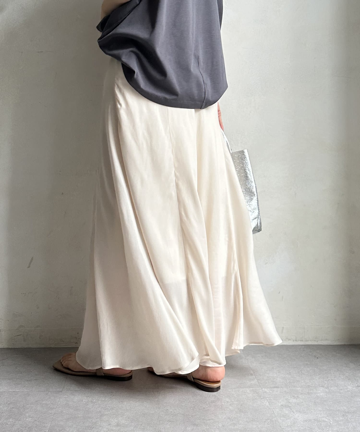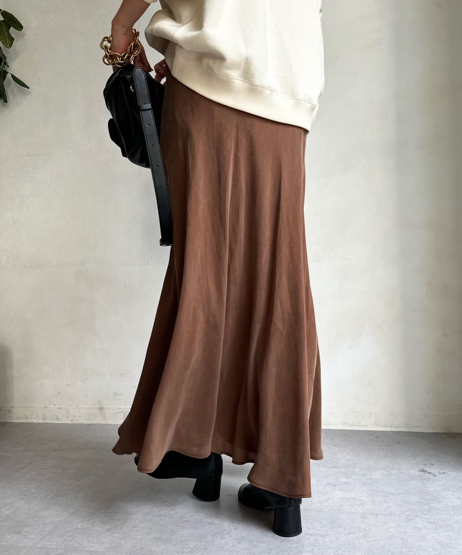 とろみのあるキュプラ100%素材が、きれい見えしてくれるポイントです。また、生地を斜めに裁断するバイヤスカットを採用することで、しなやかな落ち感のシルエットを演出。