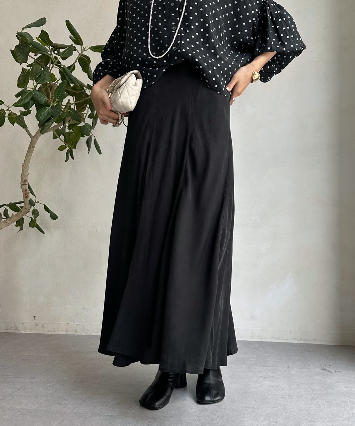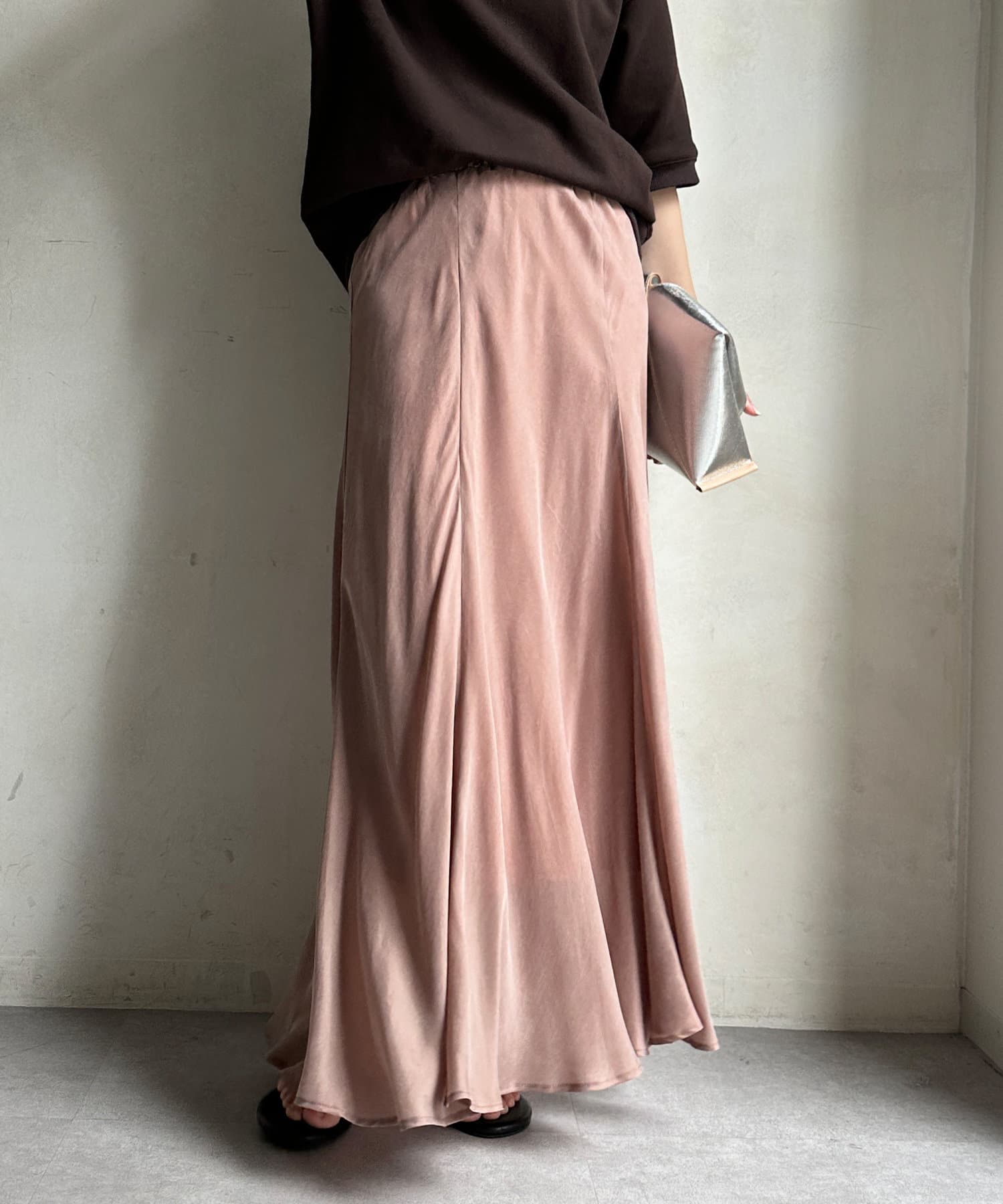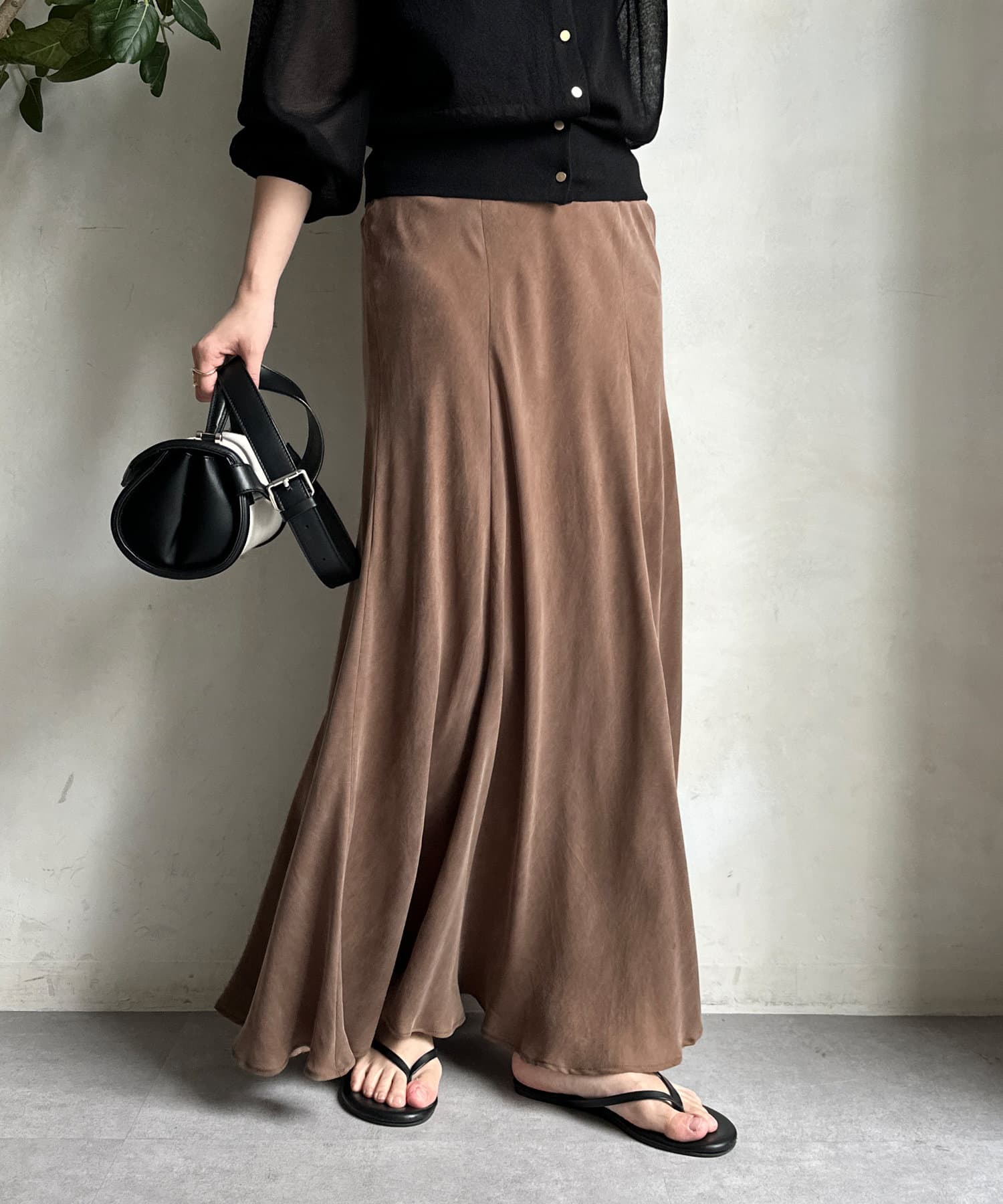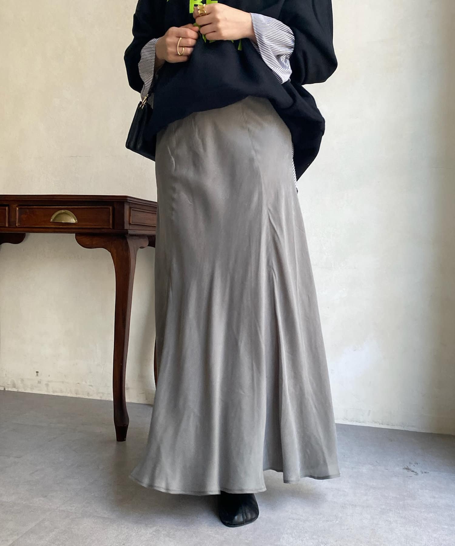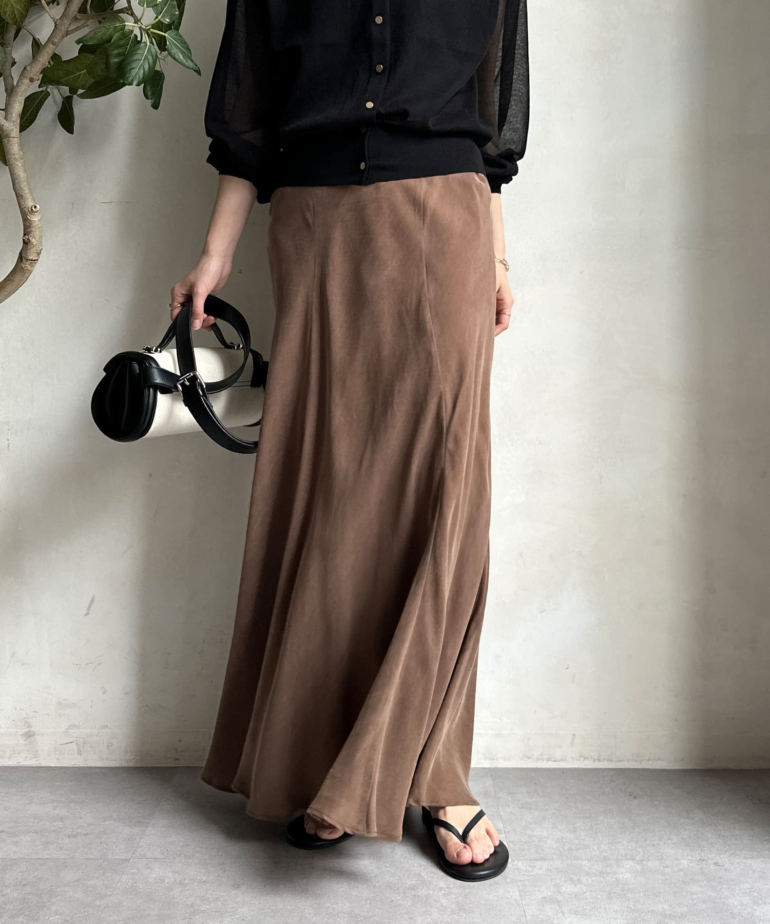 とろみのあるキュプラ100%素材が、きれい見えしてくれるポイントです。また、生地を斜めに裁断するバイヤスカットを採用することで、しなやかな落ち感のシルエットを演出。