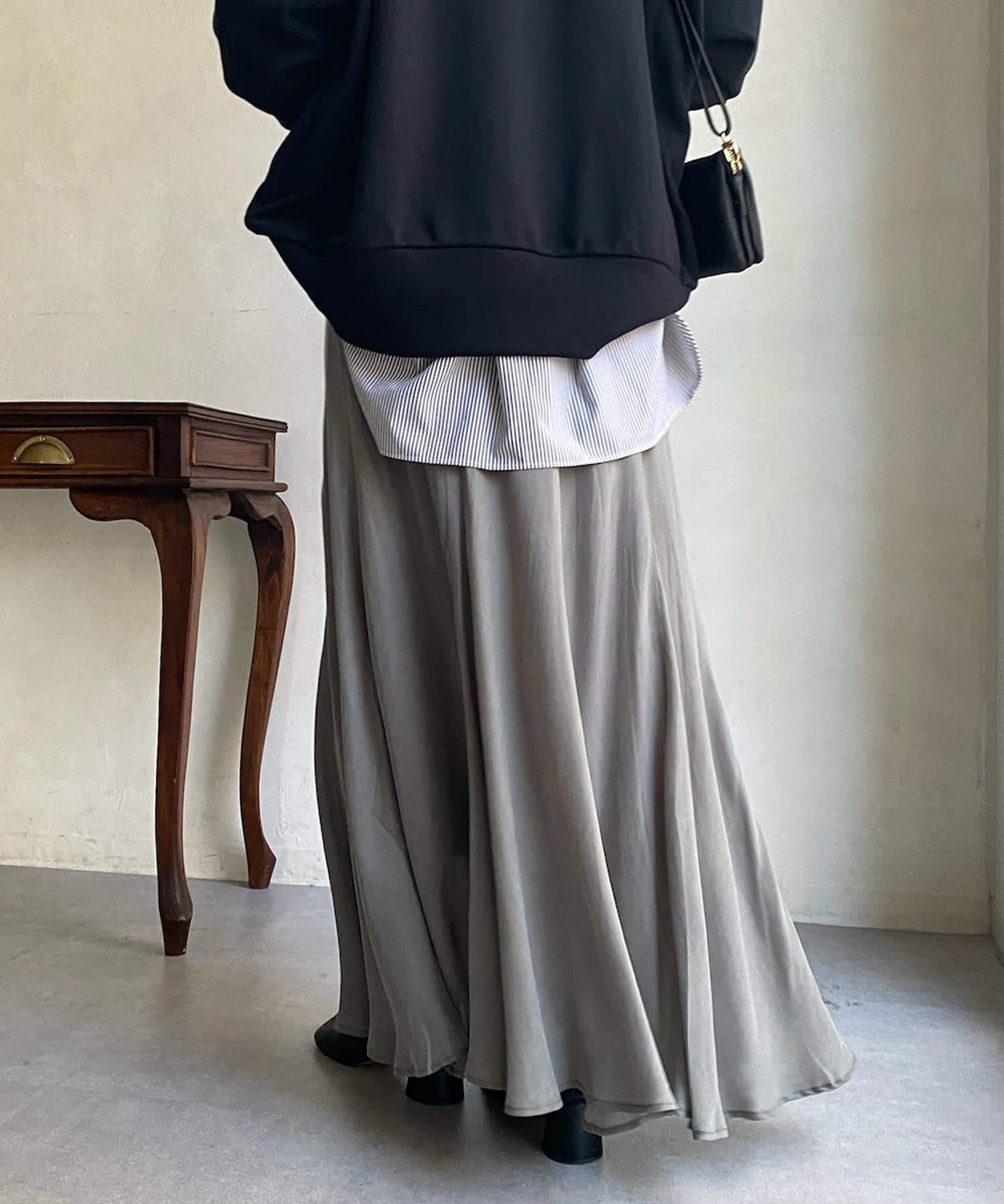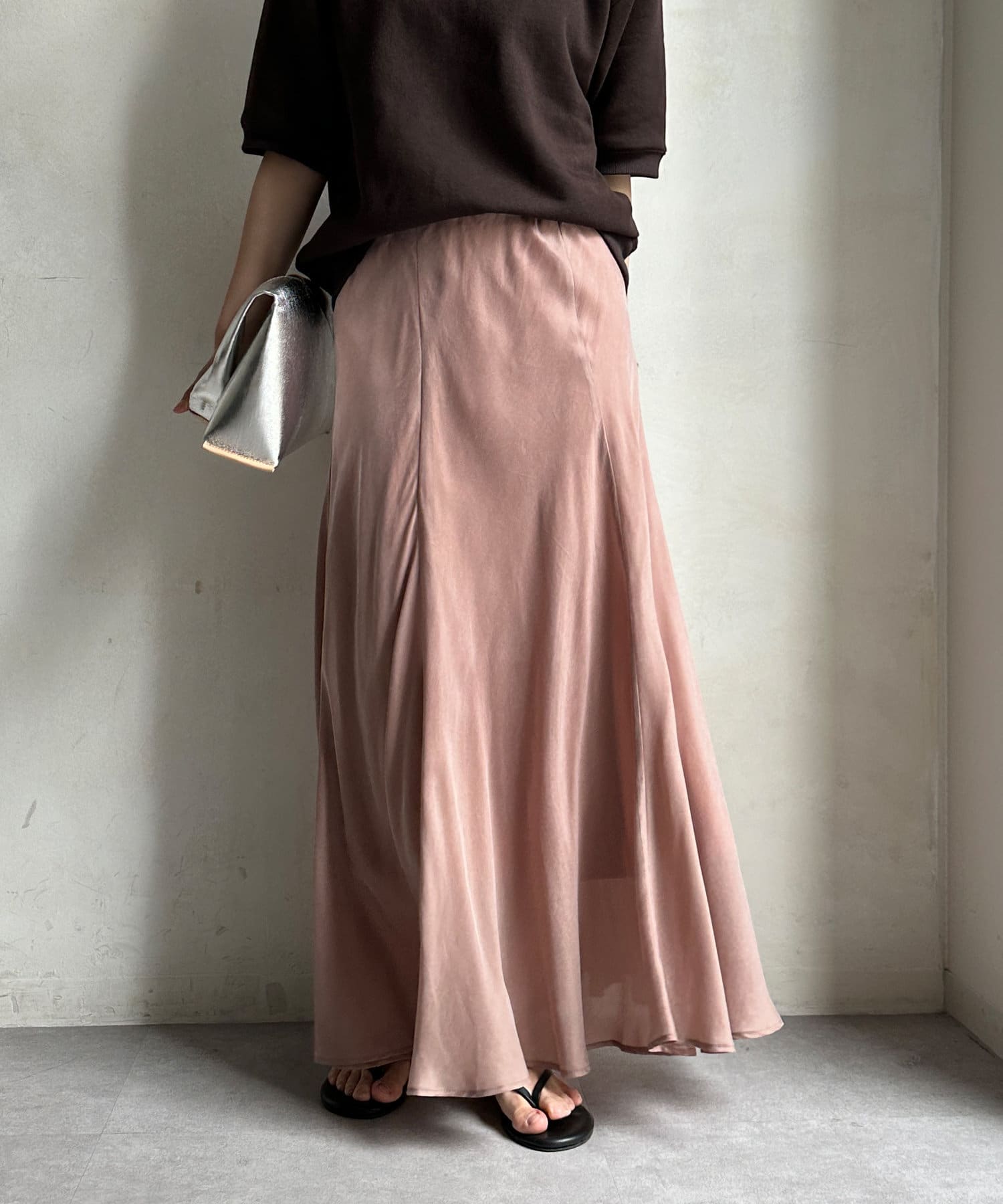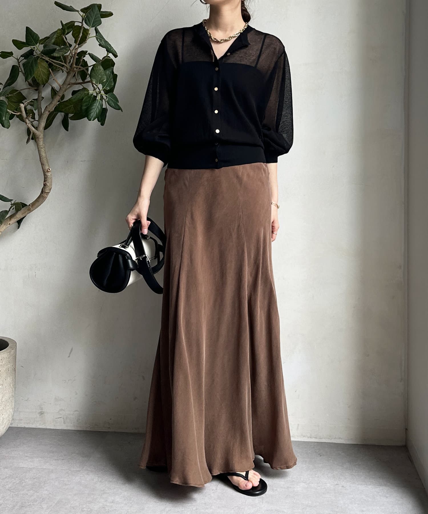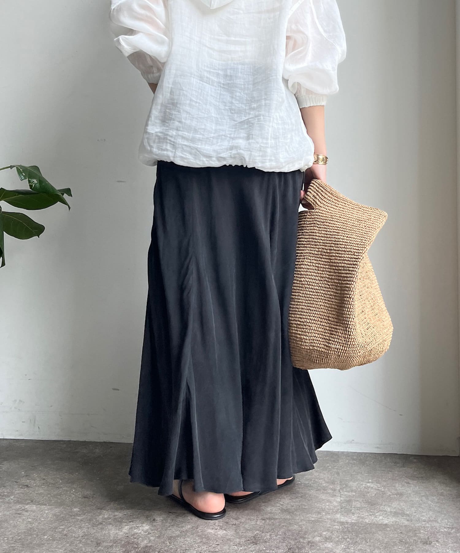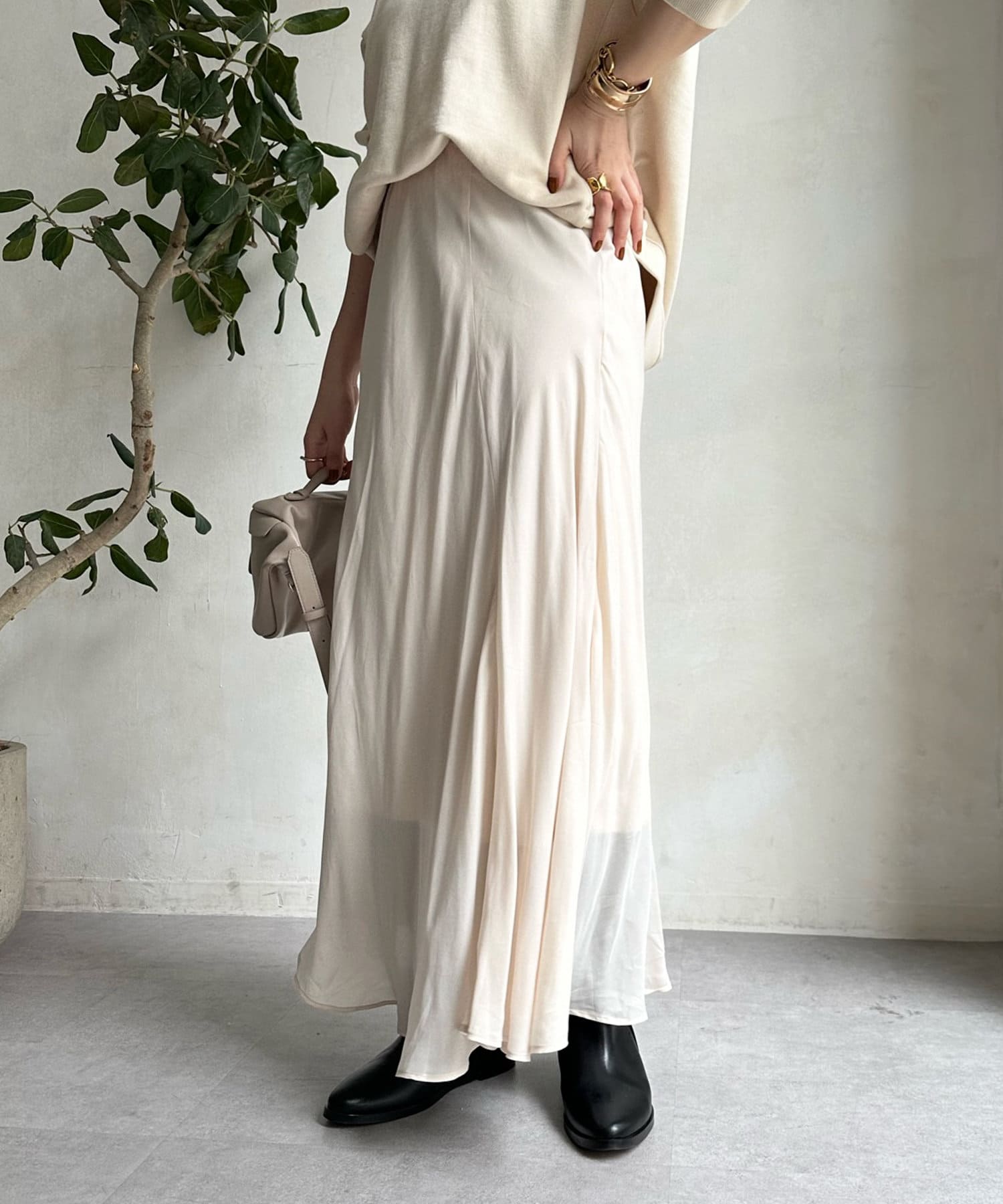 とろみのあるキュプラ100%素材が、きれい見えしてくれるポイントです。また、生地を斜めに裁断するバイヤスカットを採用することで、しなやかな落ち感のシルエットを演出。