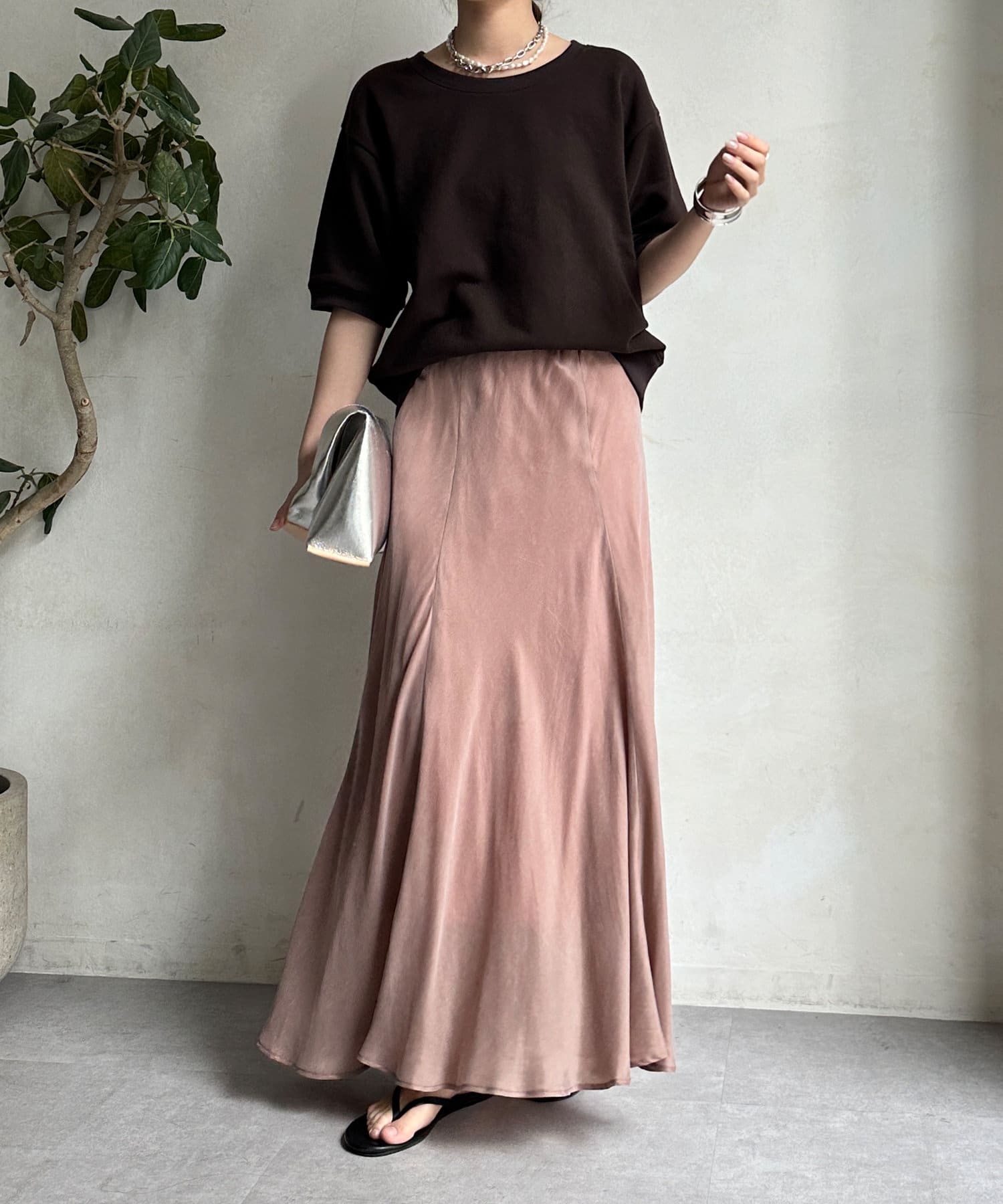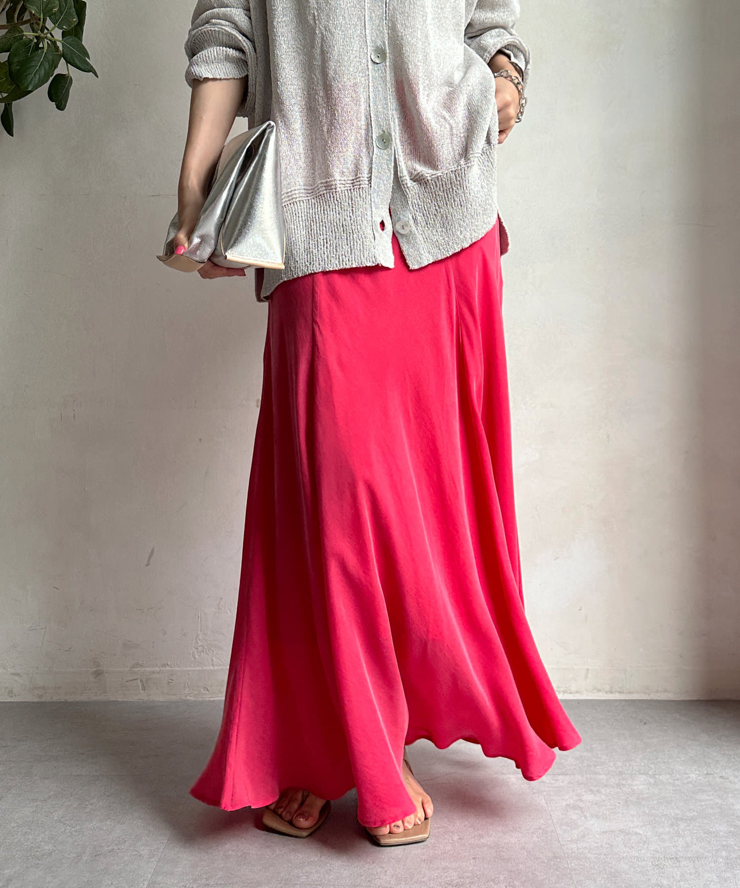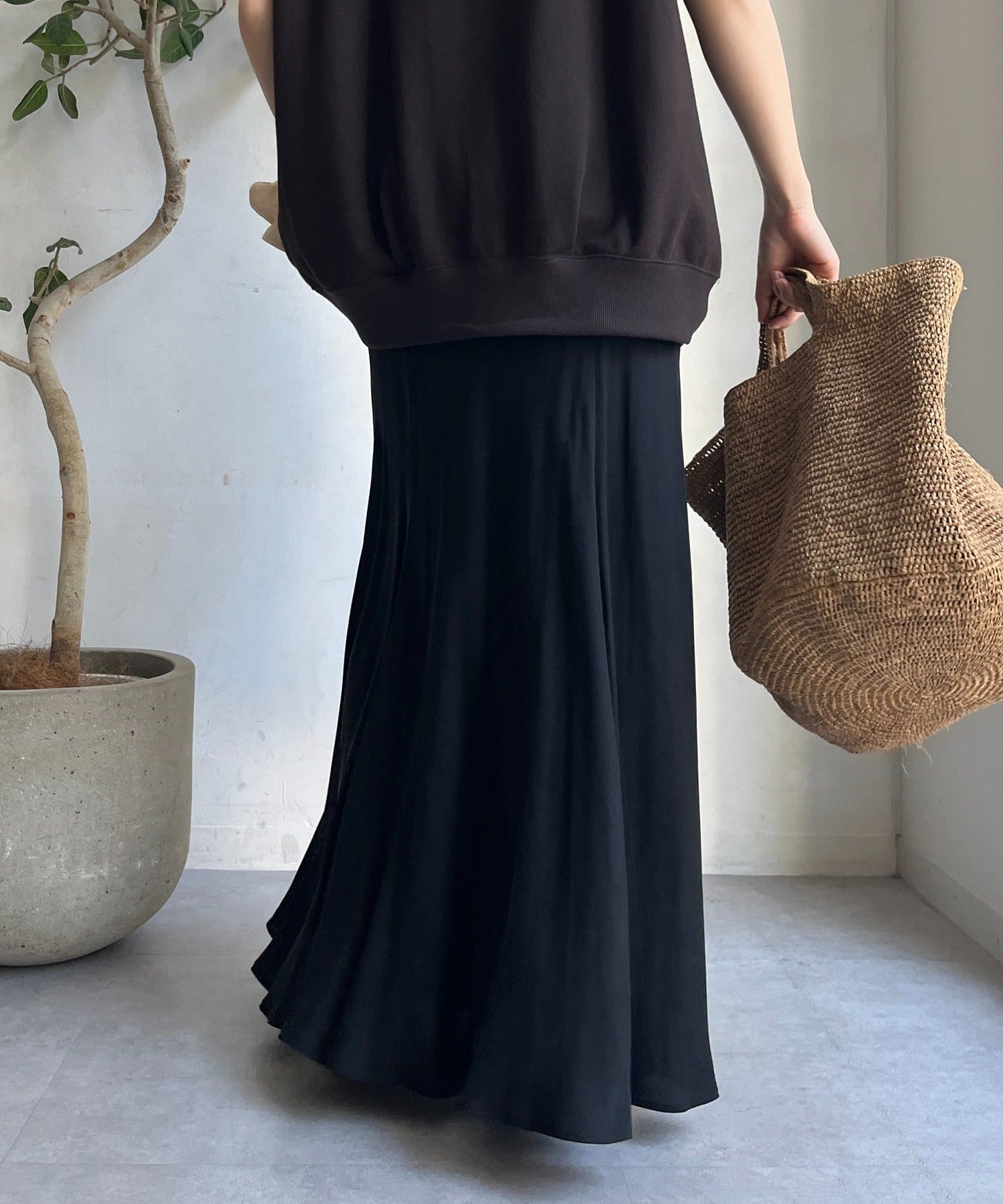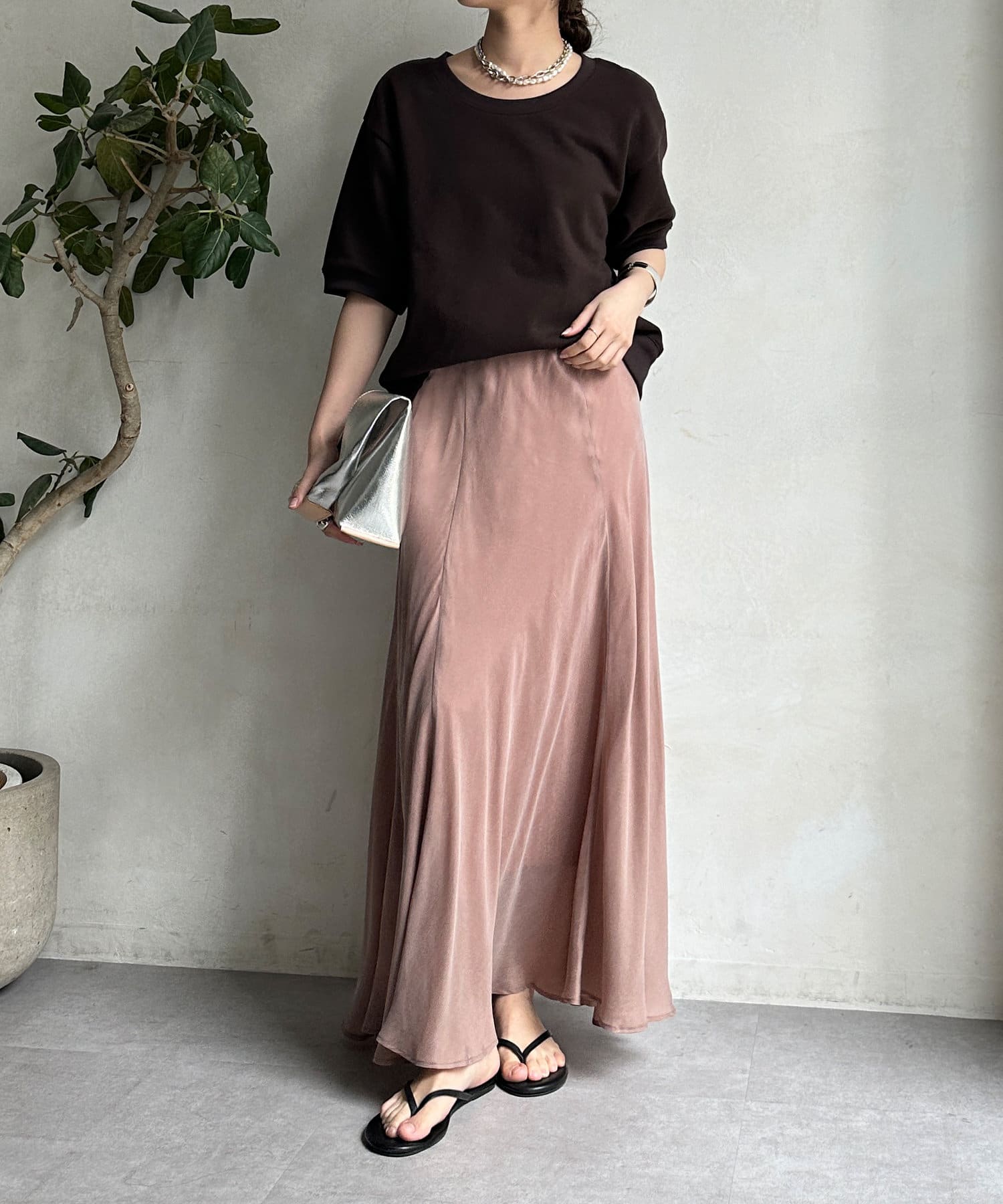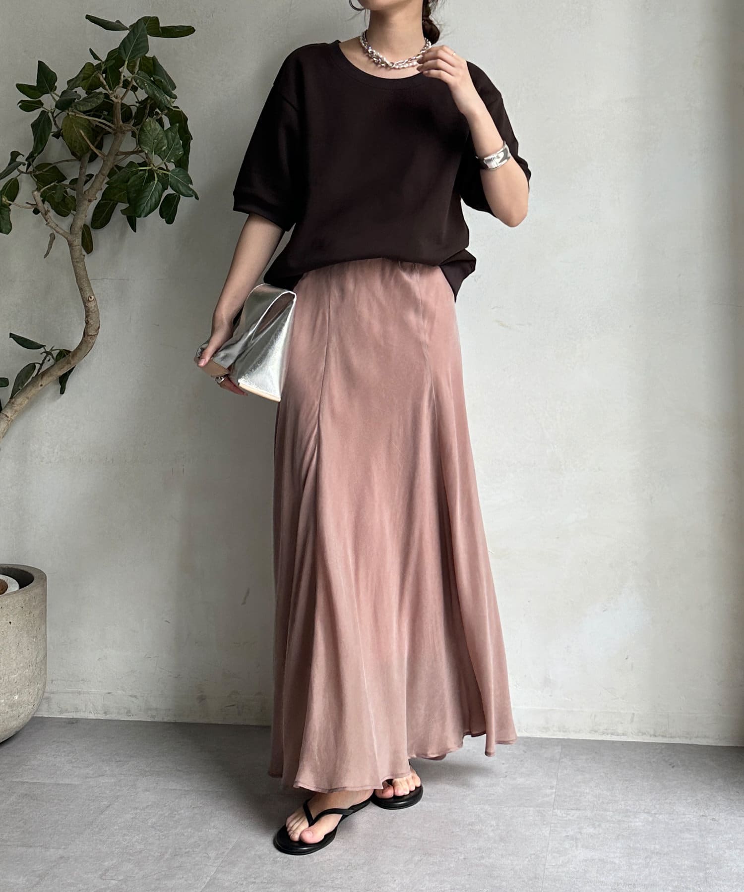 とろみのあるキュプラ100%素材が、きれい見えしてくれるポイントです。また、生地を斜めに裁断するバイヤスカットを採用することで、しなやかな落ち感のシルエットを演出。