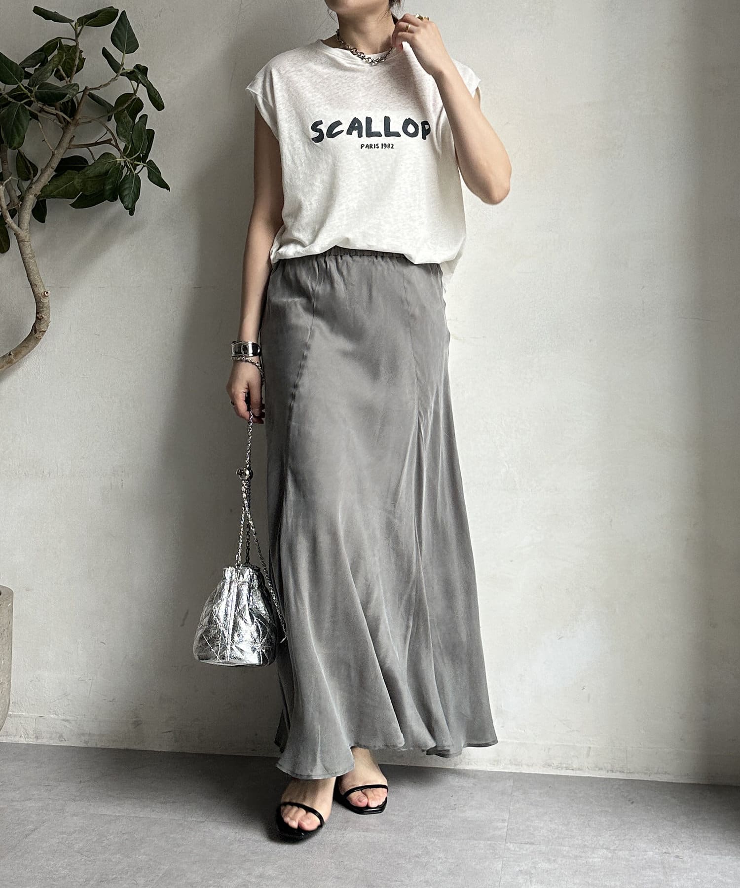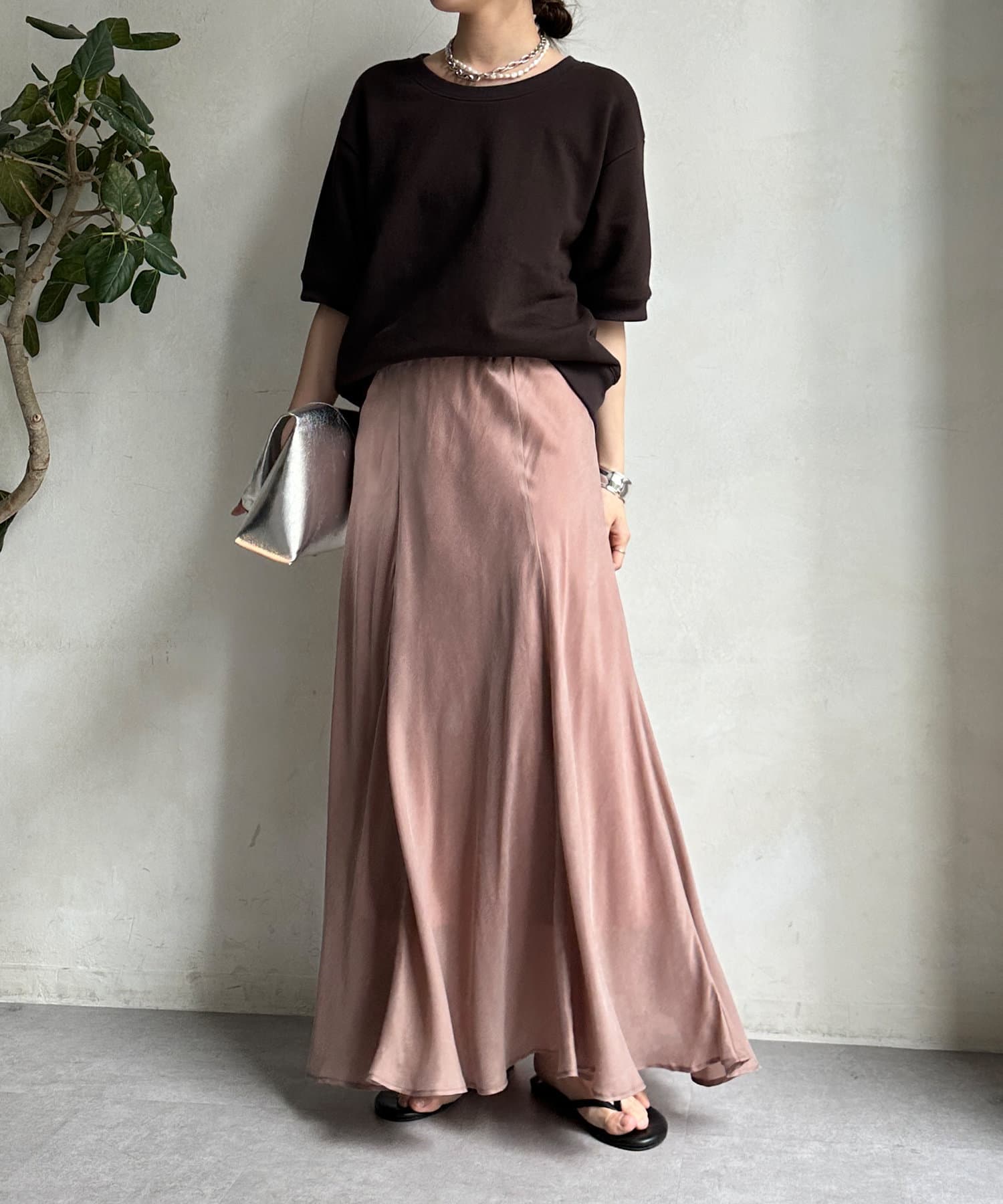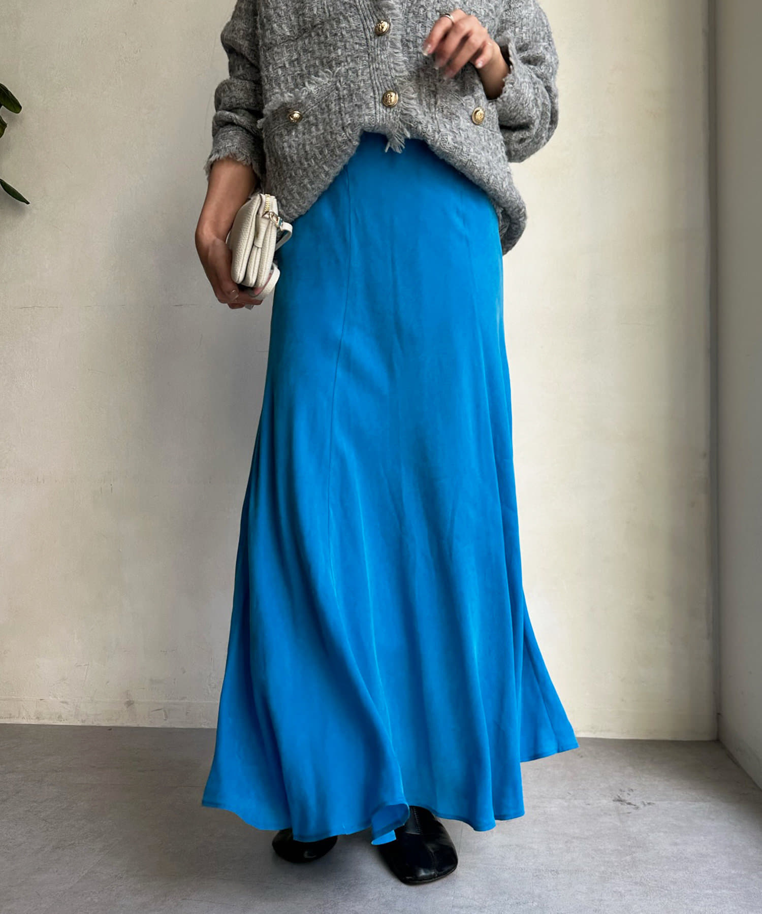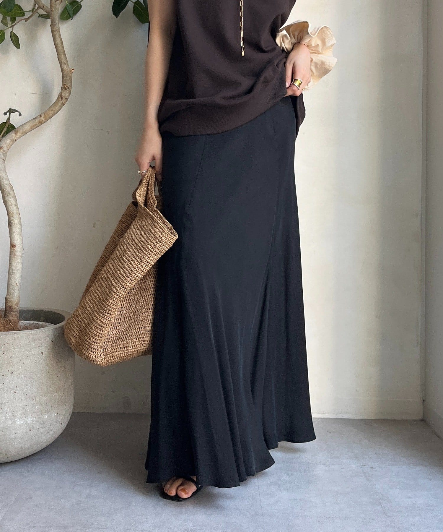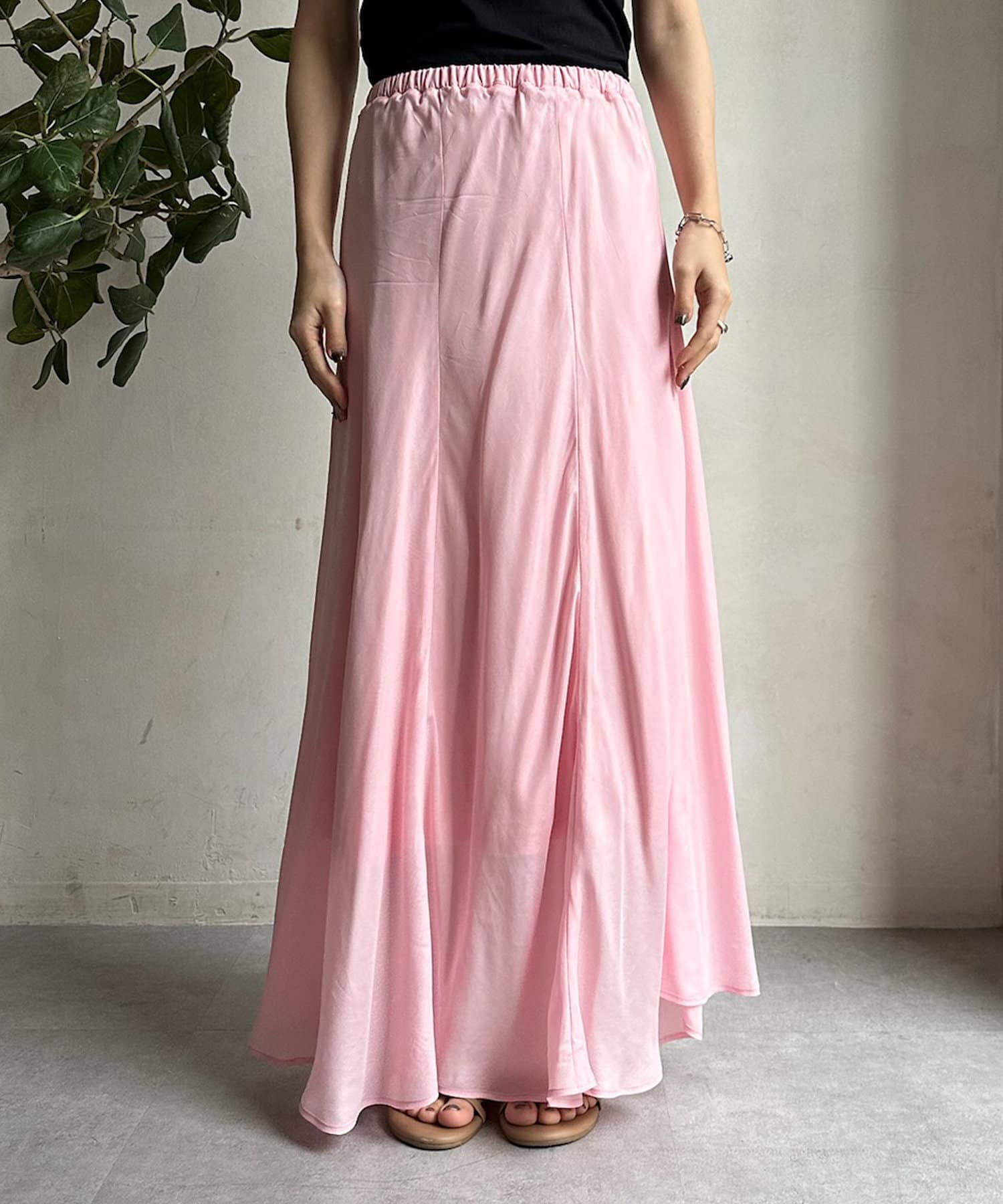 とろみのあるキュプラ100%素材が、きれい見えしてくれるポイントです。また、生地を斜めに裁断するバイヤスカットを採用することで、しなやかな落ち感のシルエットを演出。
