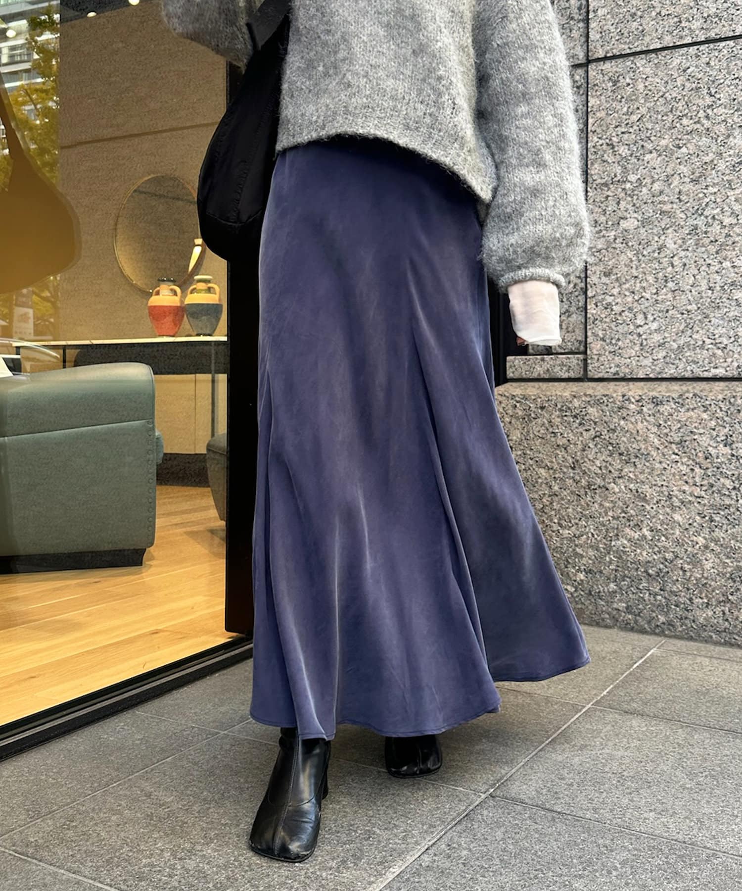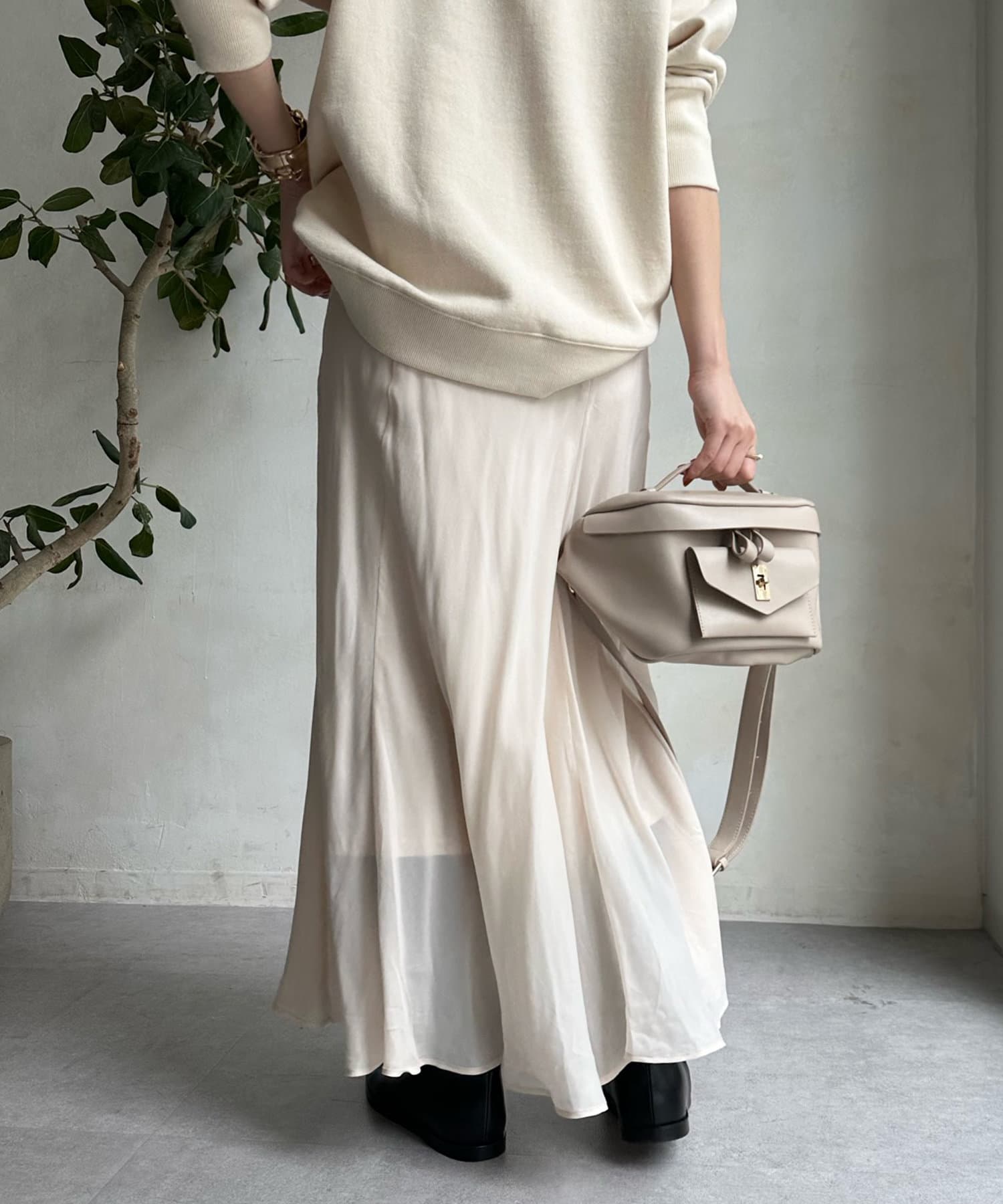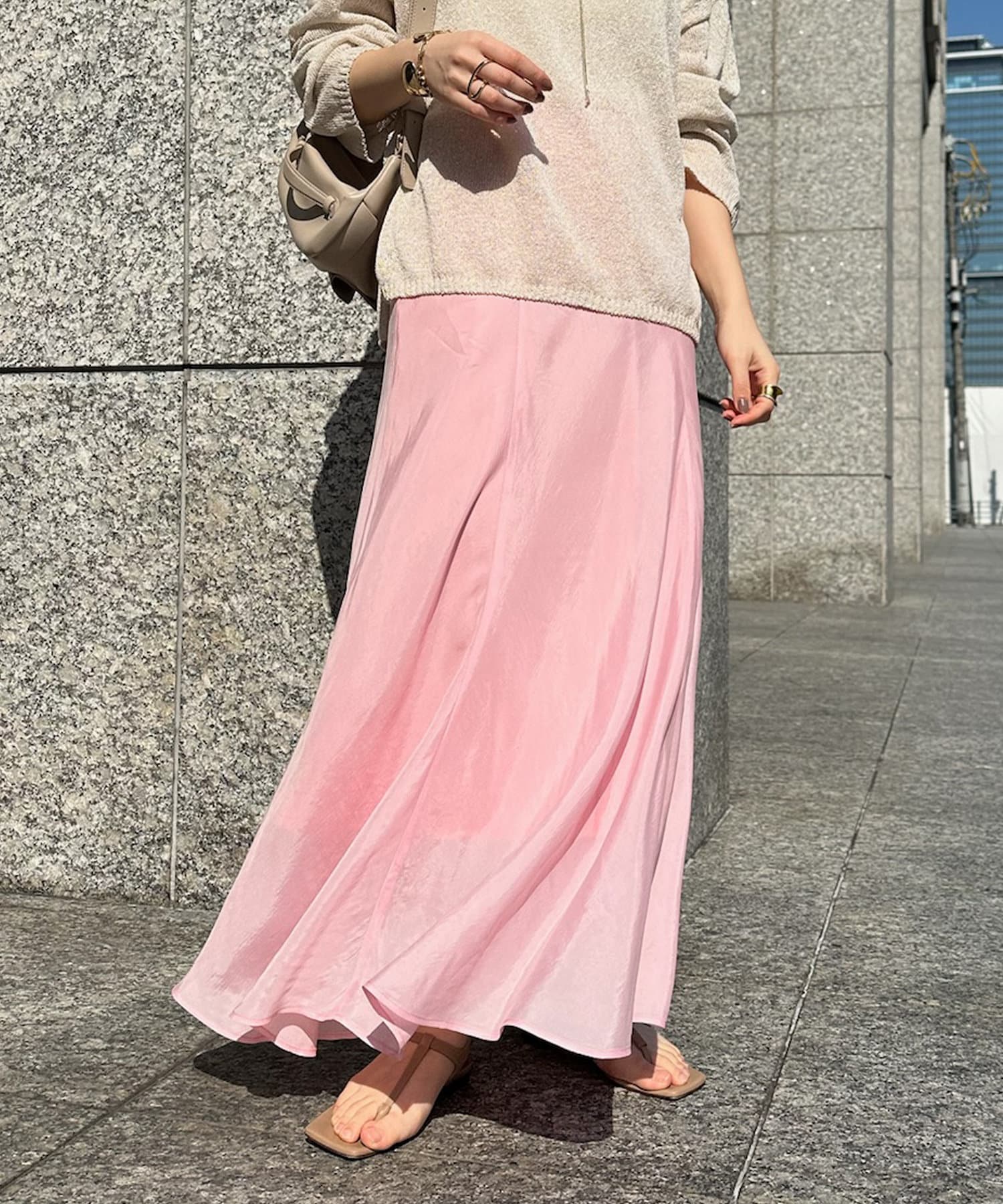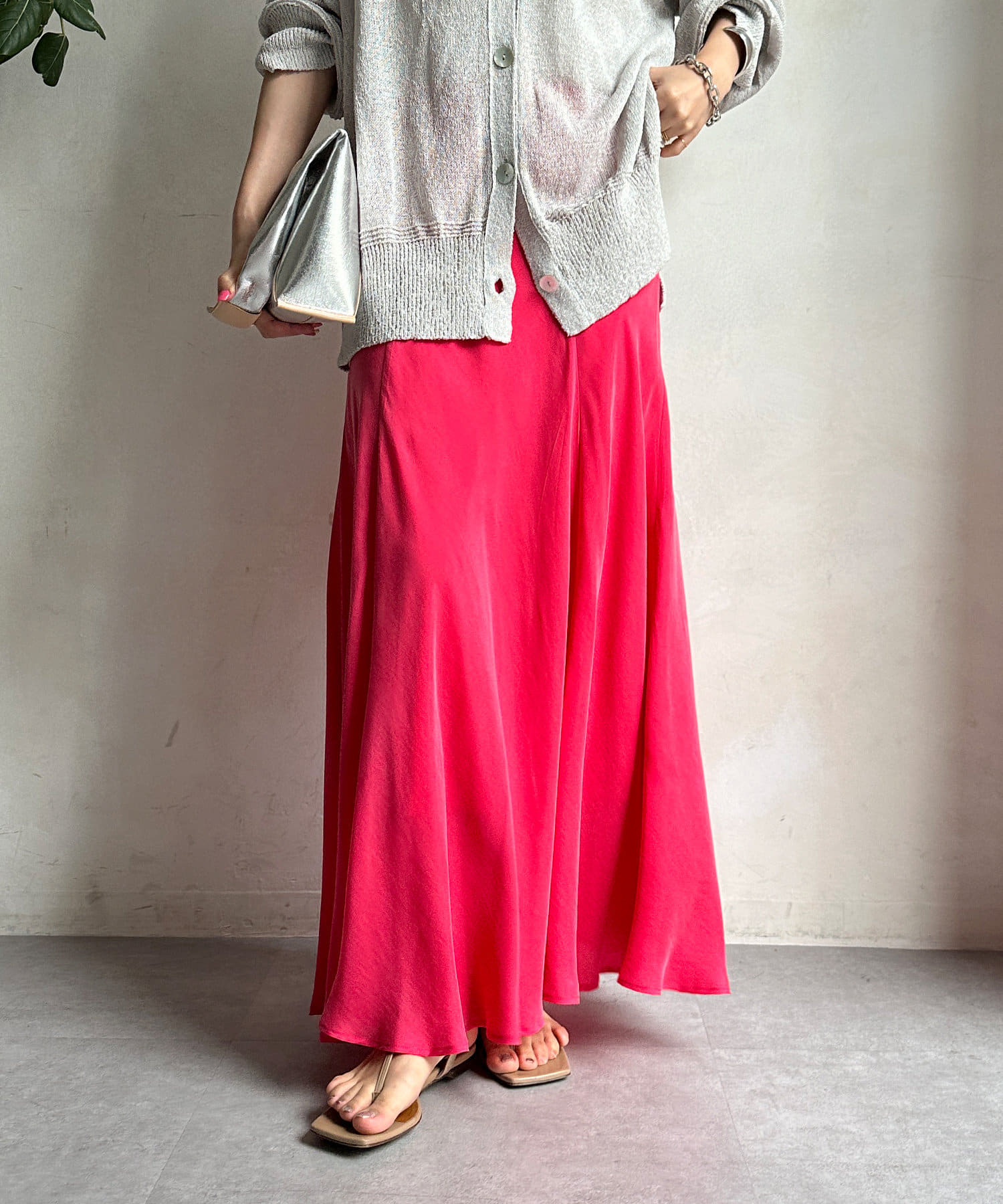 とろみのあるキュプラ100%素材が、きれい見えしてくれるポイントです。また、生地を斜めに裁断するバイヤスカットを採用することで、しなやかな落ち感のシルエットを演出。