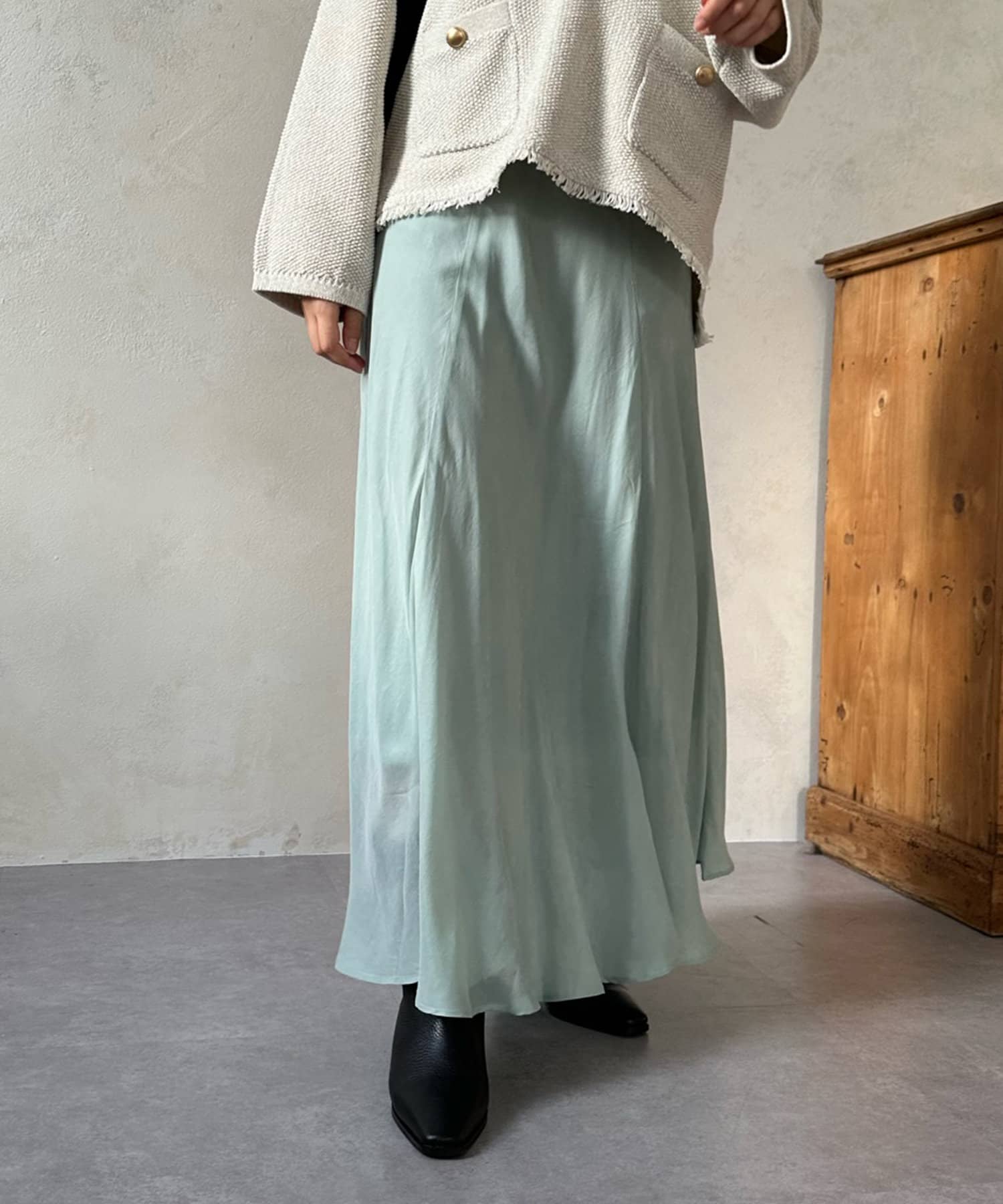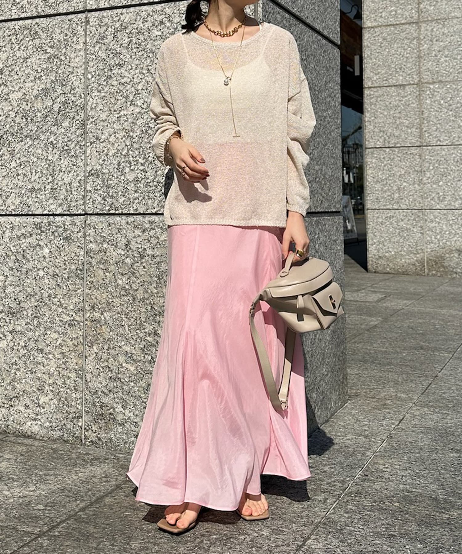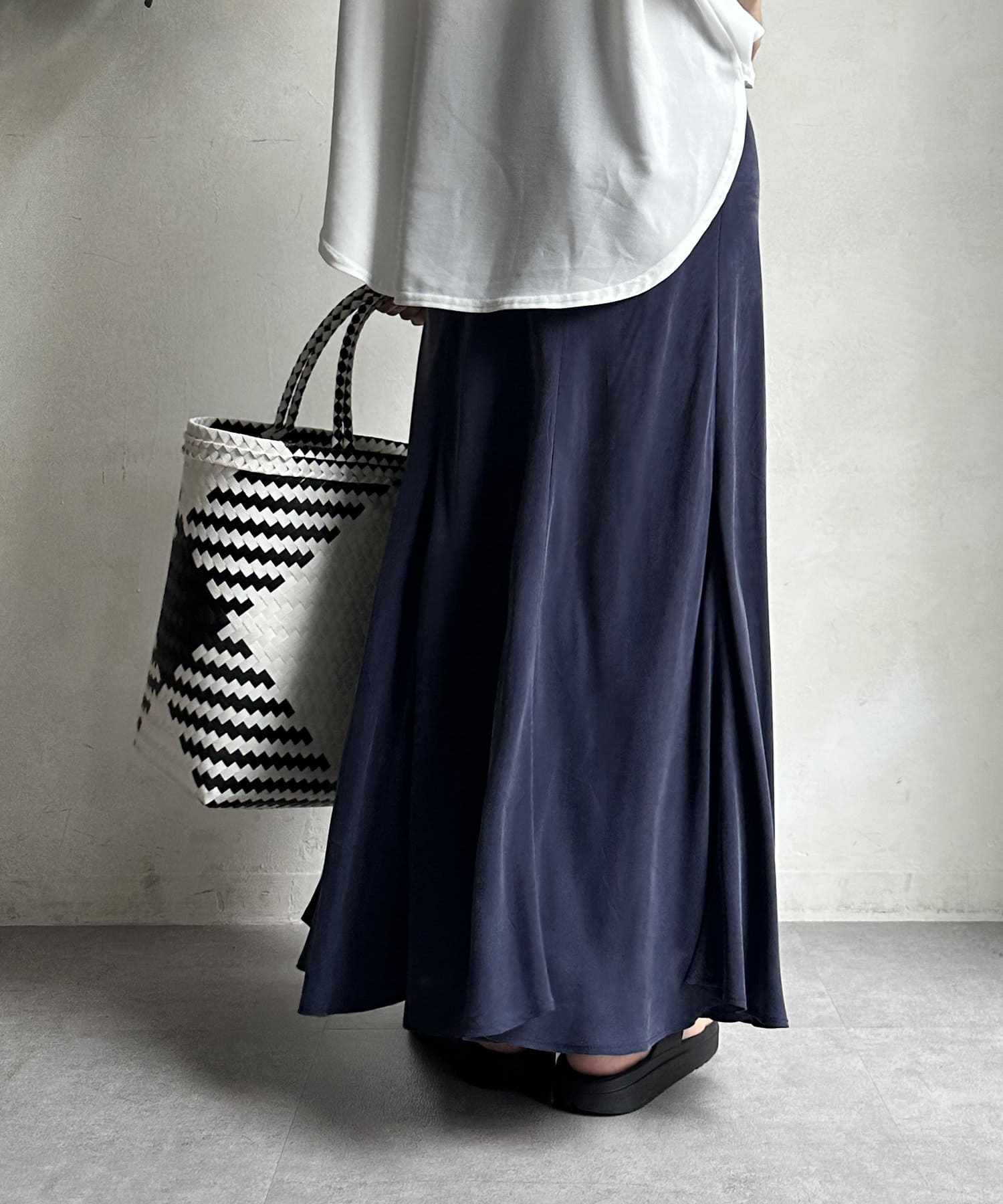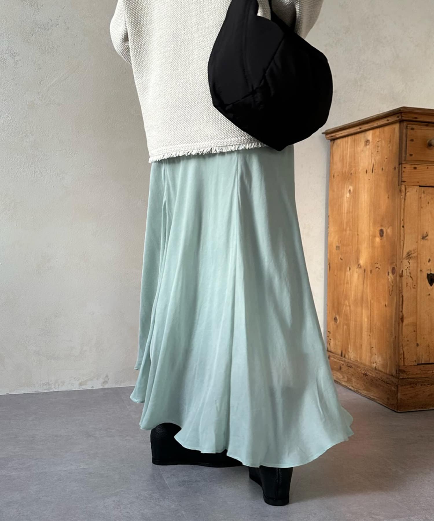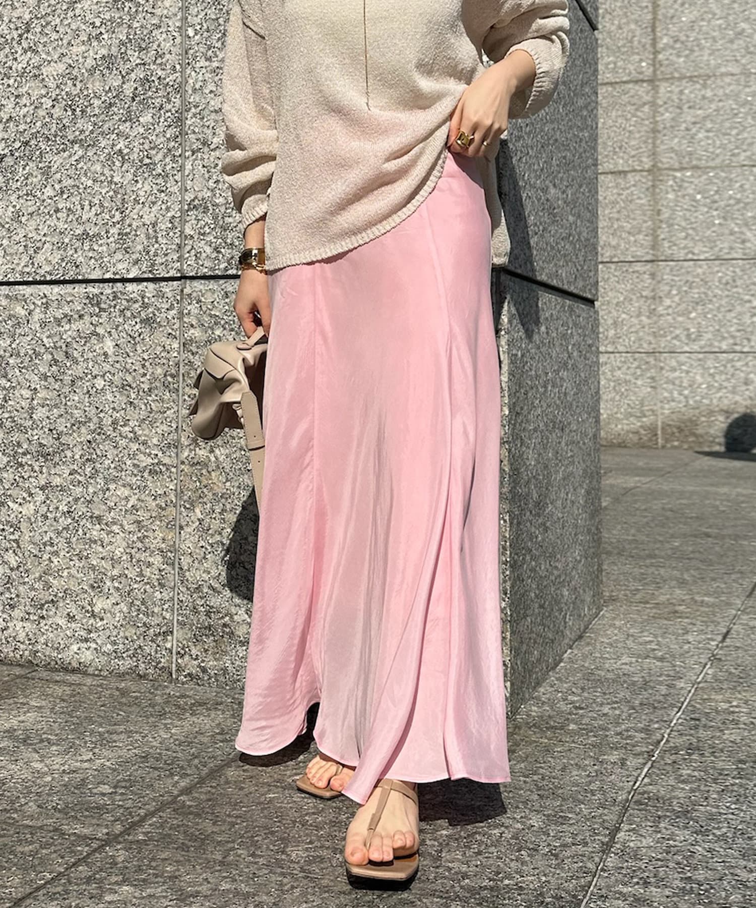 とろみのあるキュプラ100%素材が、きれい見えしてくれるポイントです。また、生地を斜めに裁断するバイヤスカットを採用することで、しなやかな落ち感のシルエットを演出。