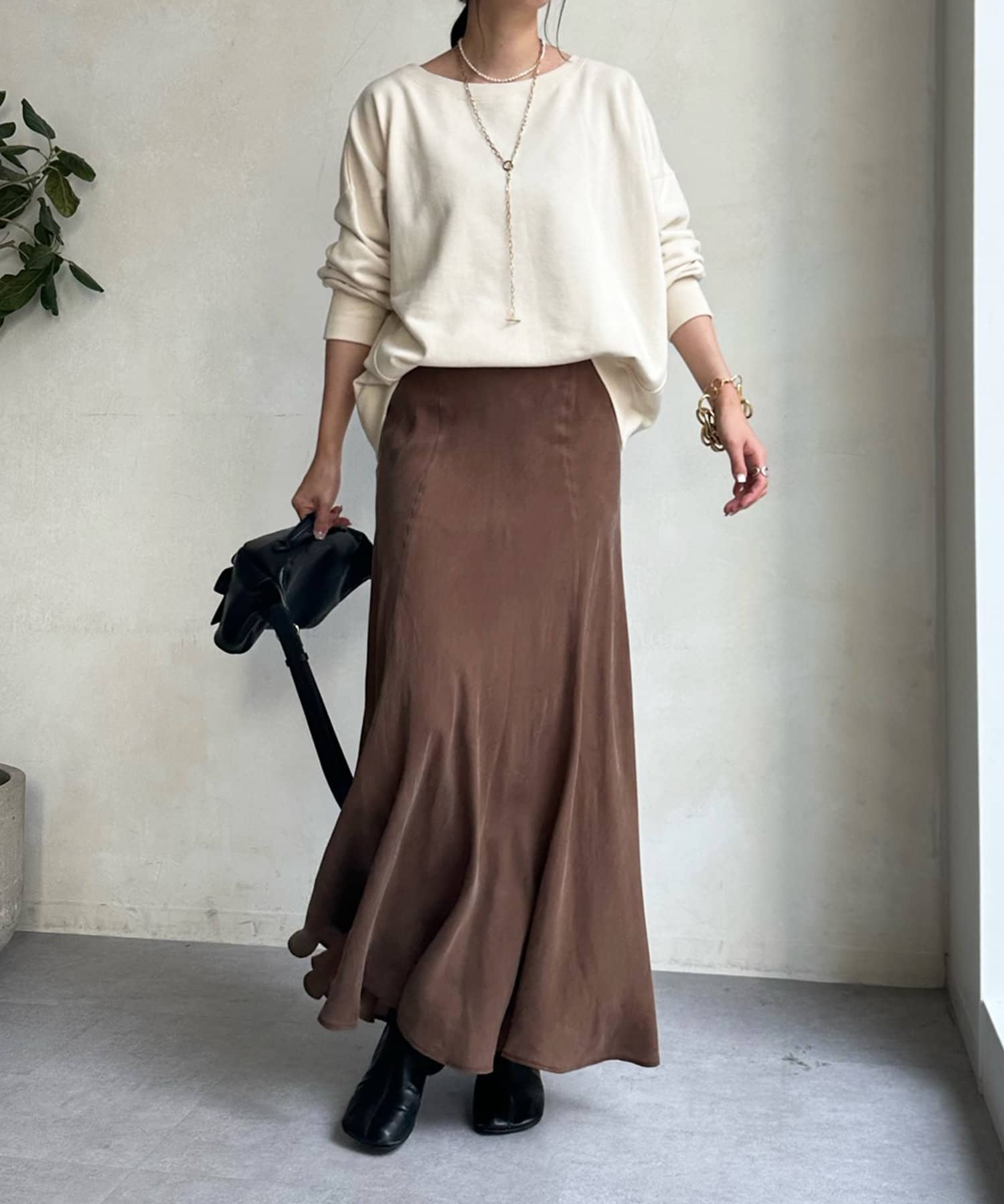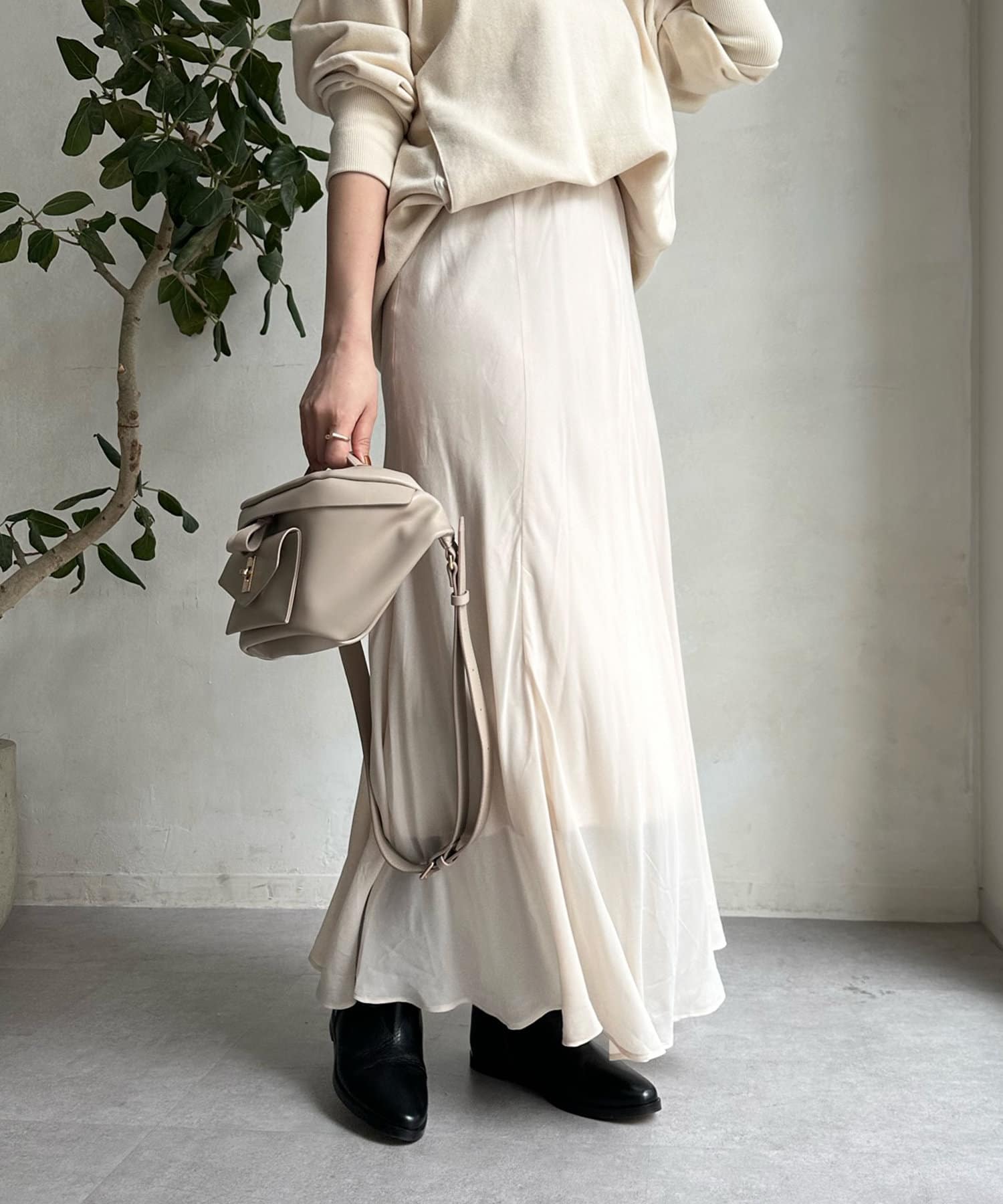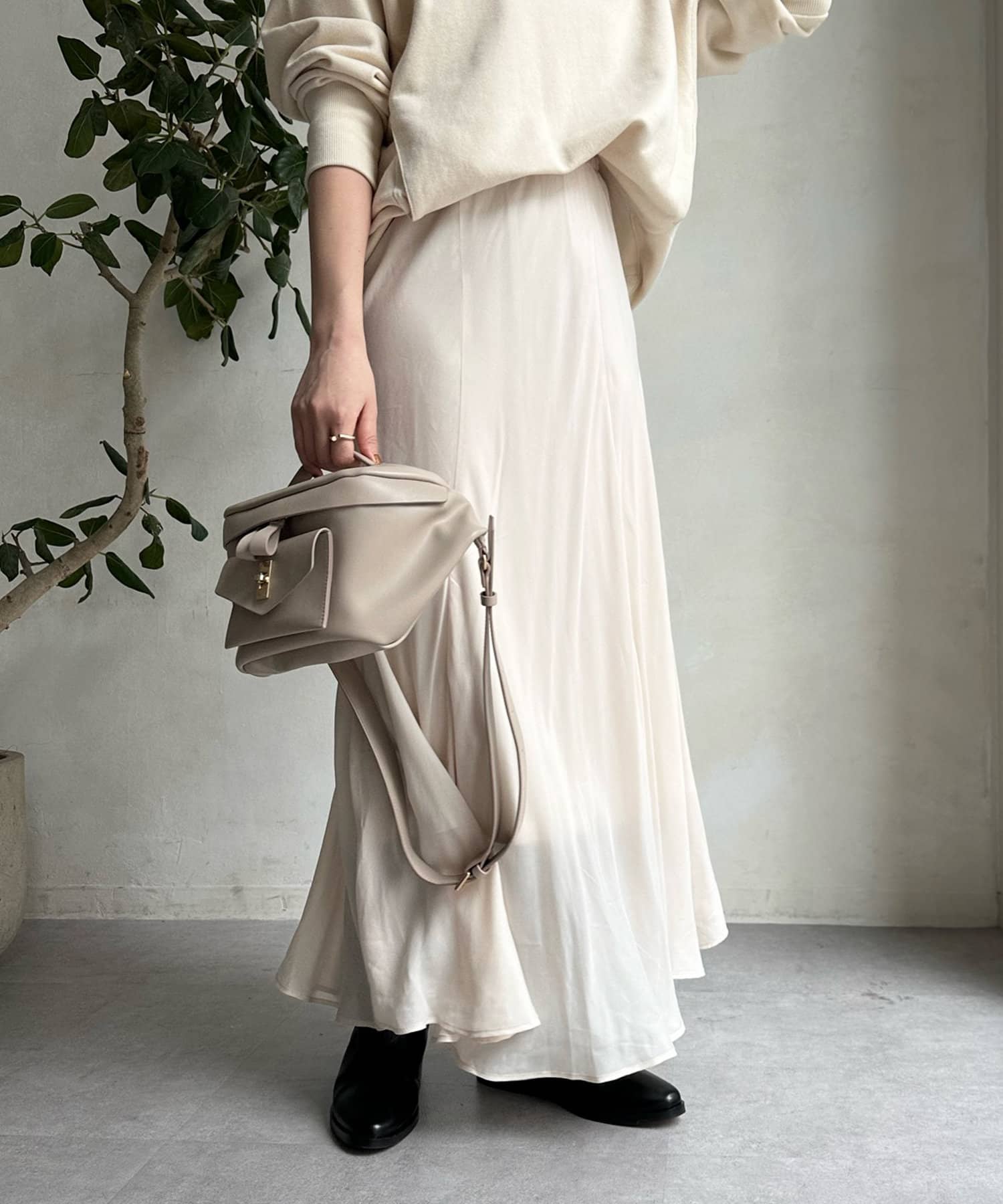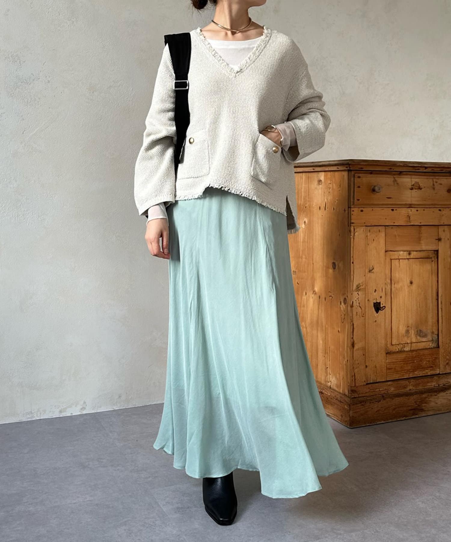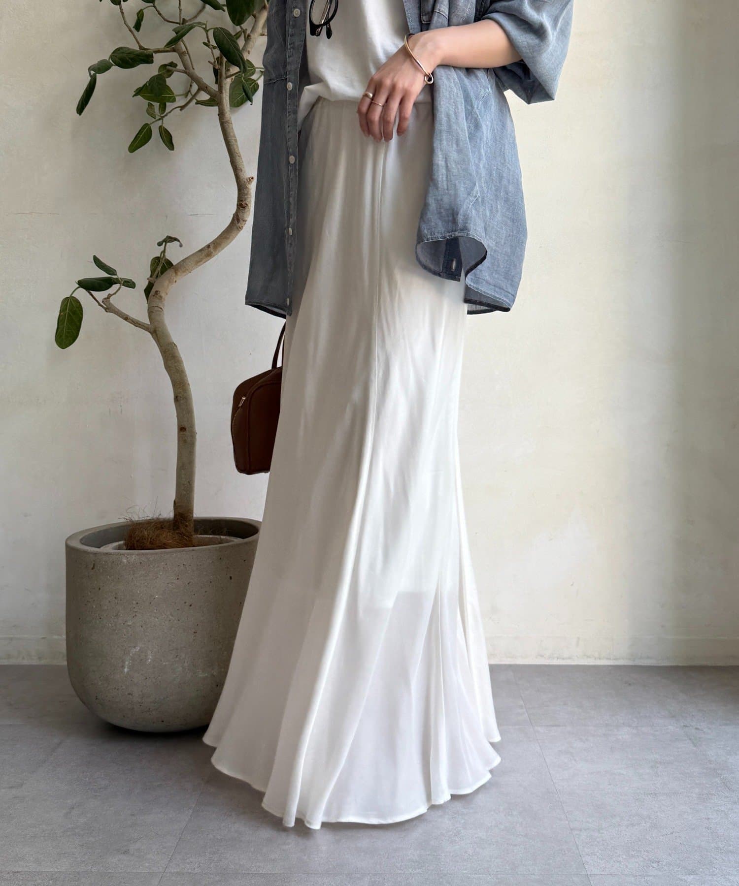 とろみのあるキュプラ100%素材が、きれい見えしてくれるポイントです。また、生地を斜めに裁断するバイヤスカットを採用することで、しなやかな落ち感のシルエットを演出。