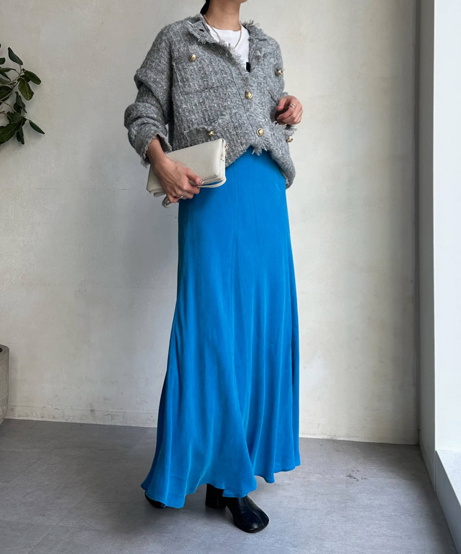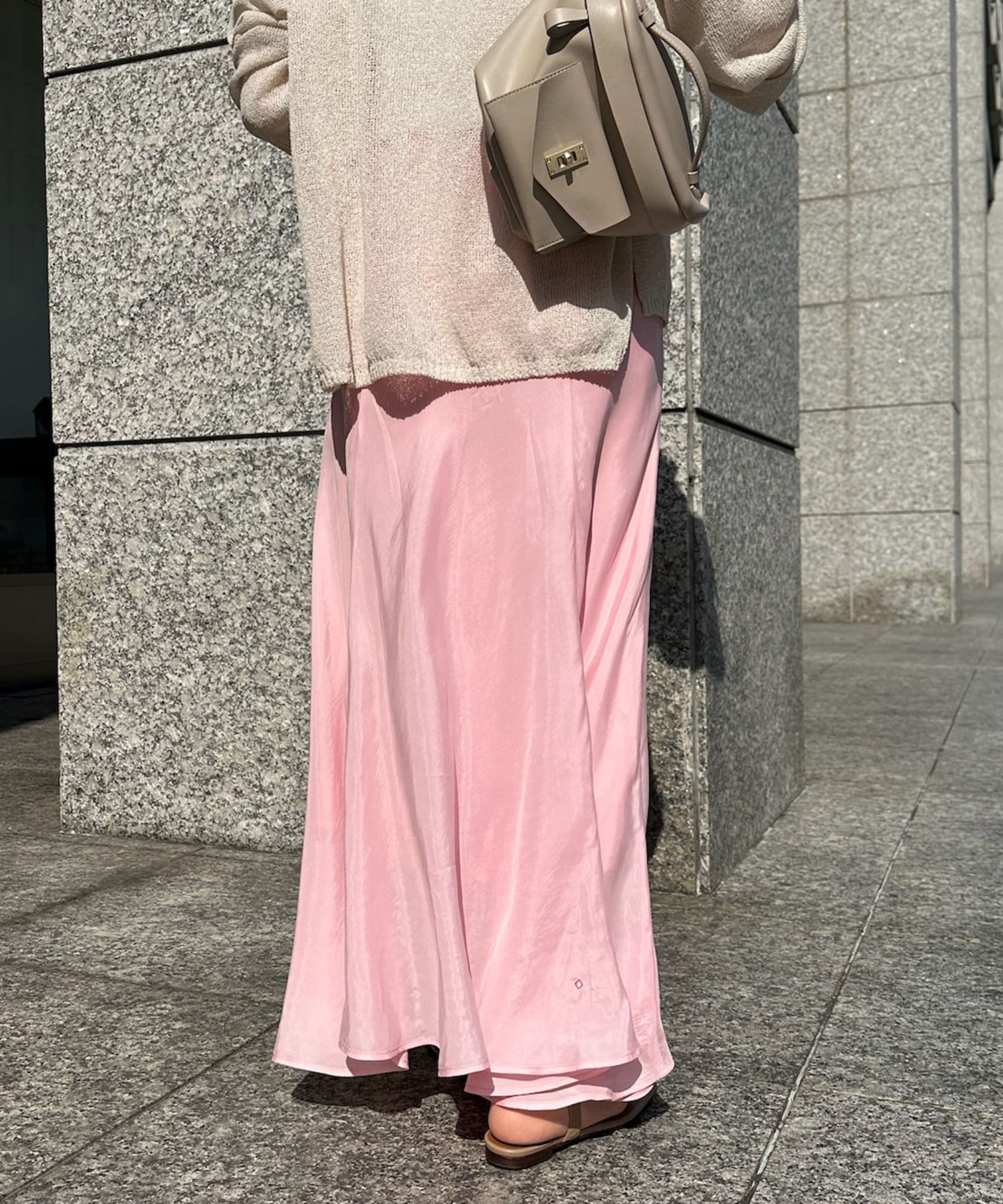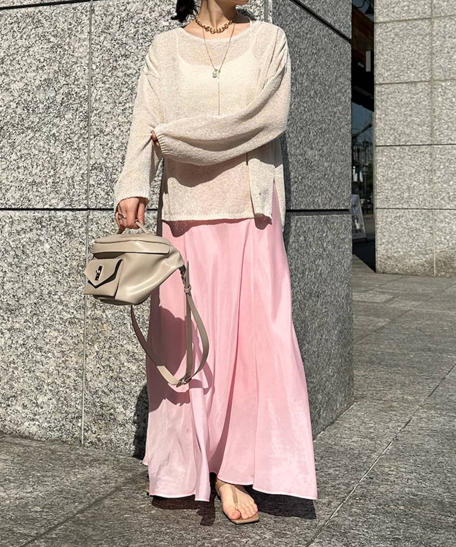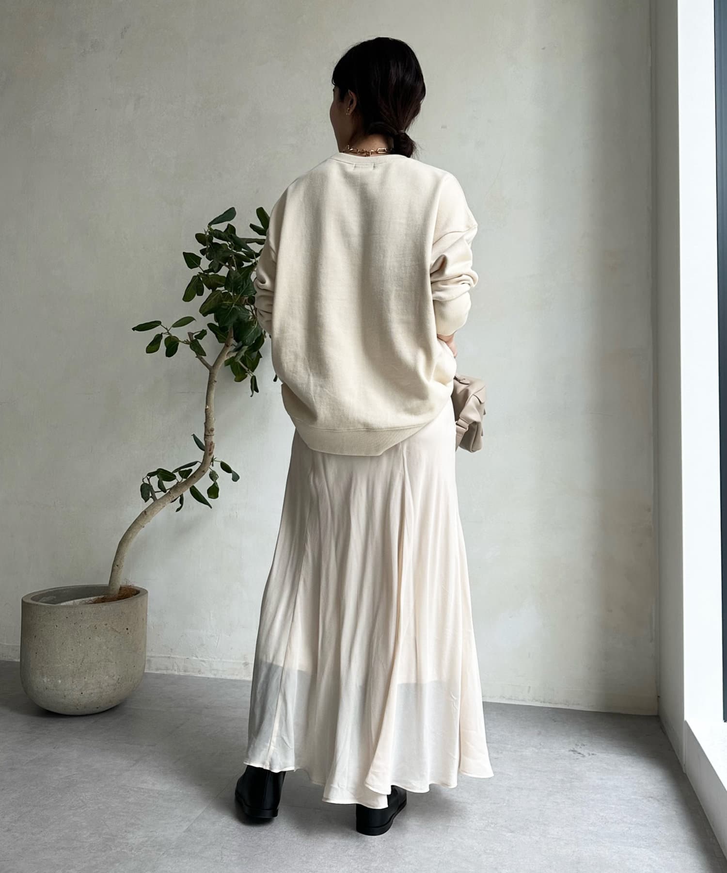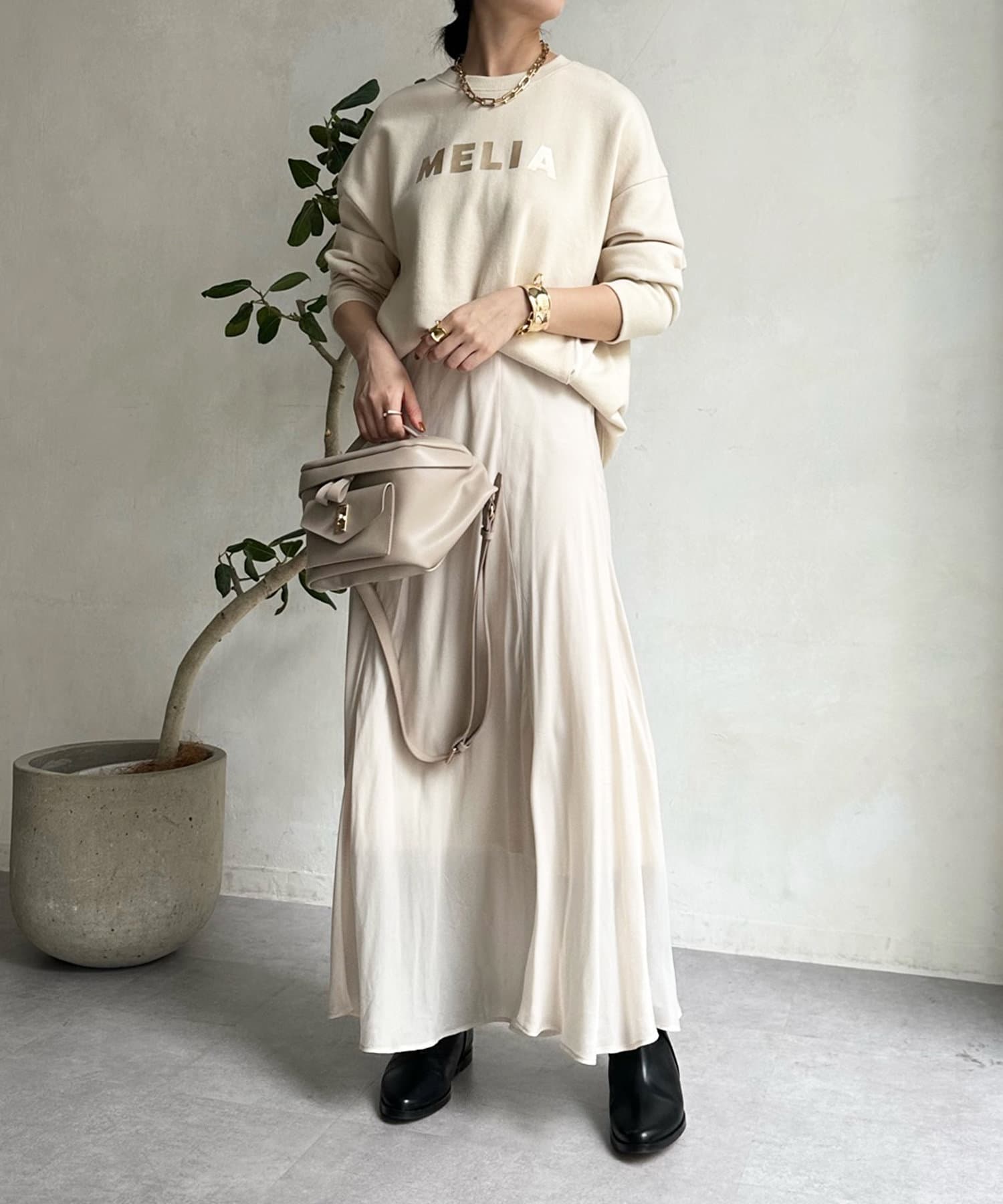 とろみのあるキュプラ100%素材が、きれい見えしてくれるポイントです。また、生地を斜めに裁断するバイヤスカットを採用することで、しなやかな落ち感のシルエットを演出。
