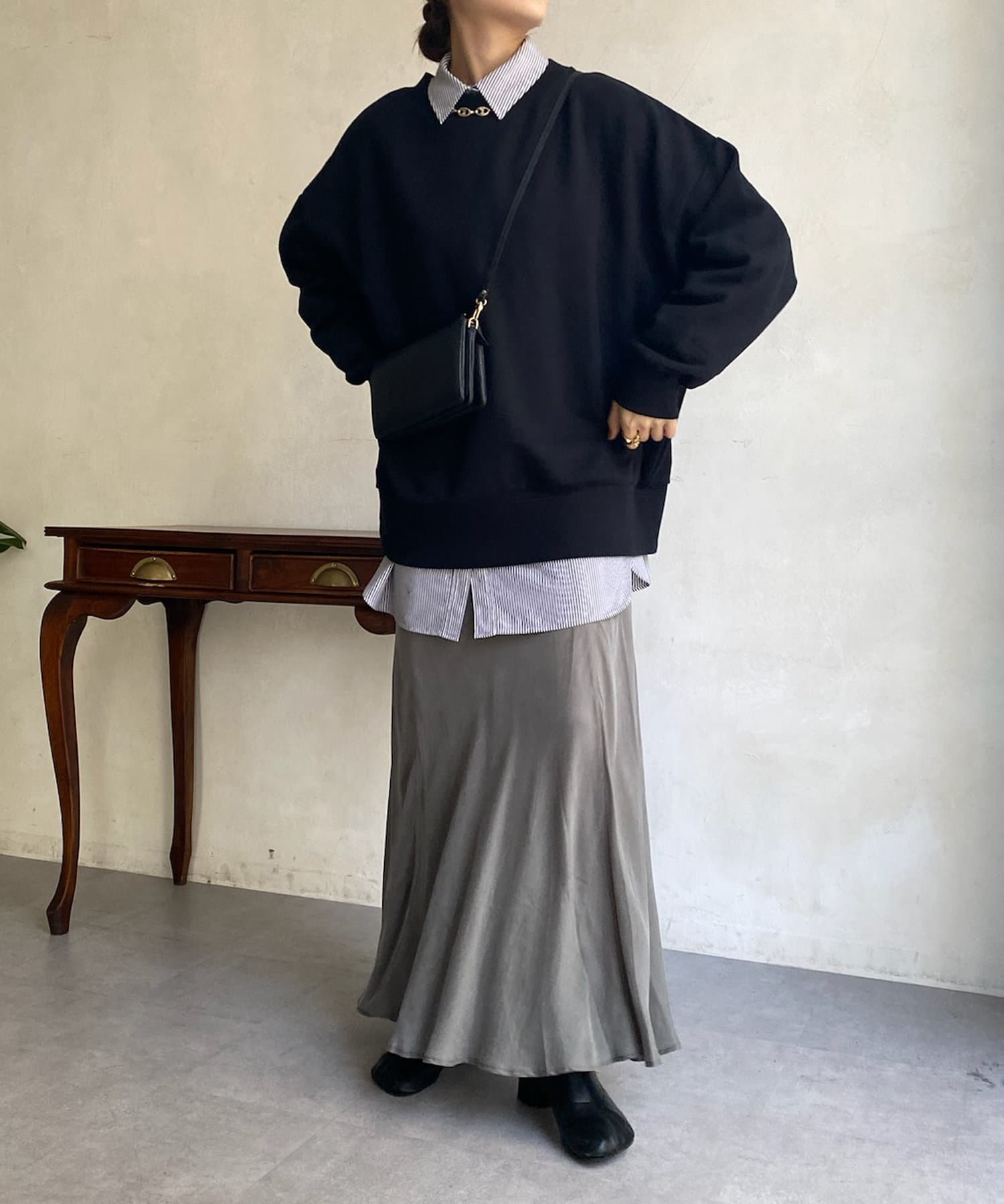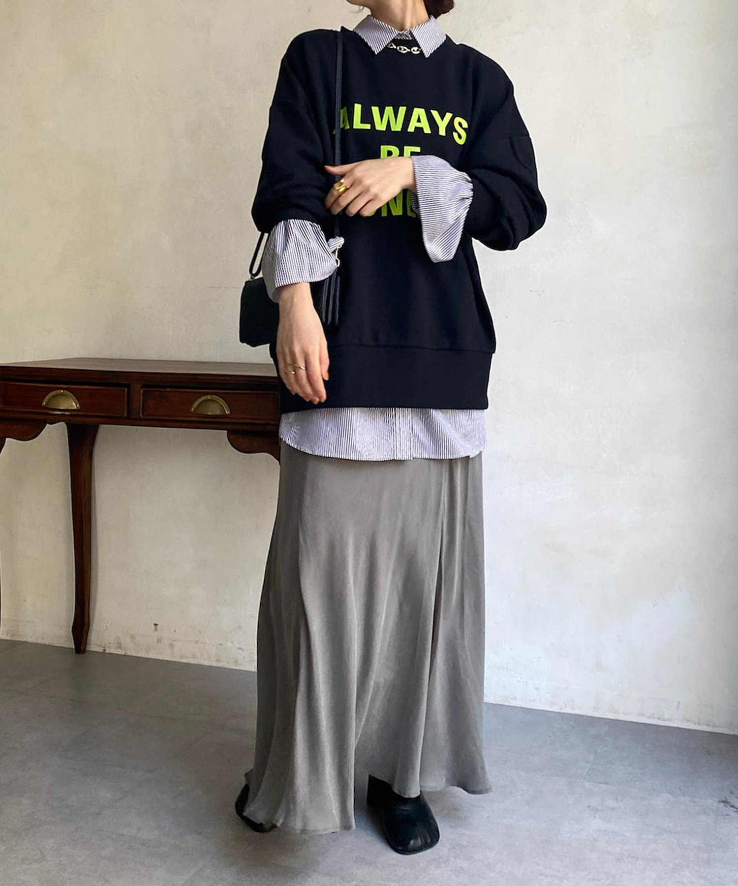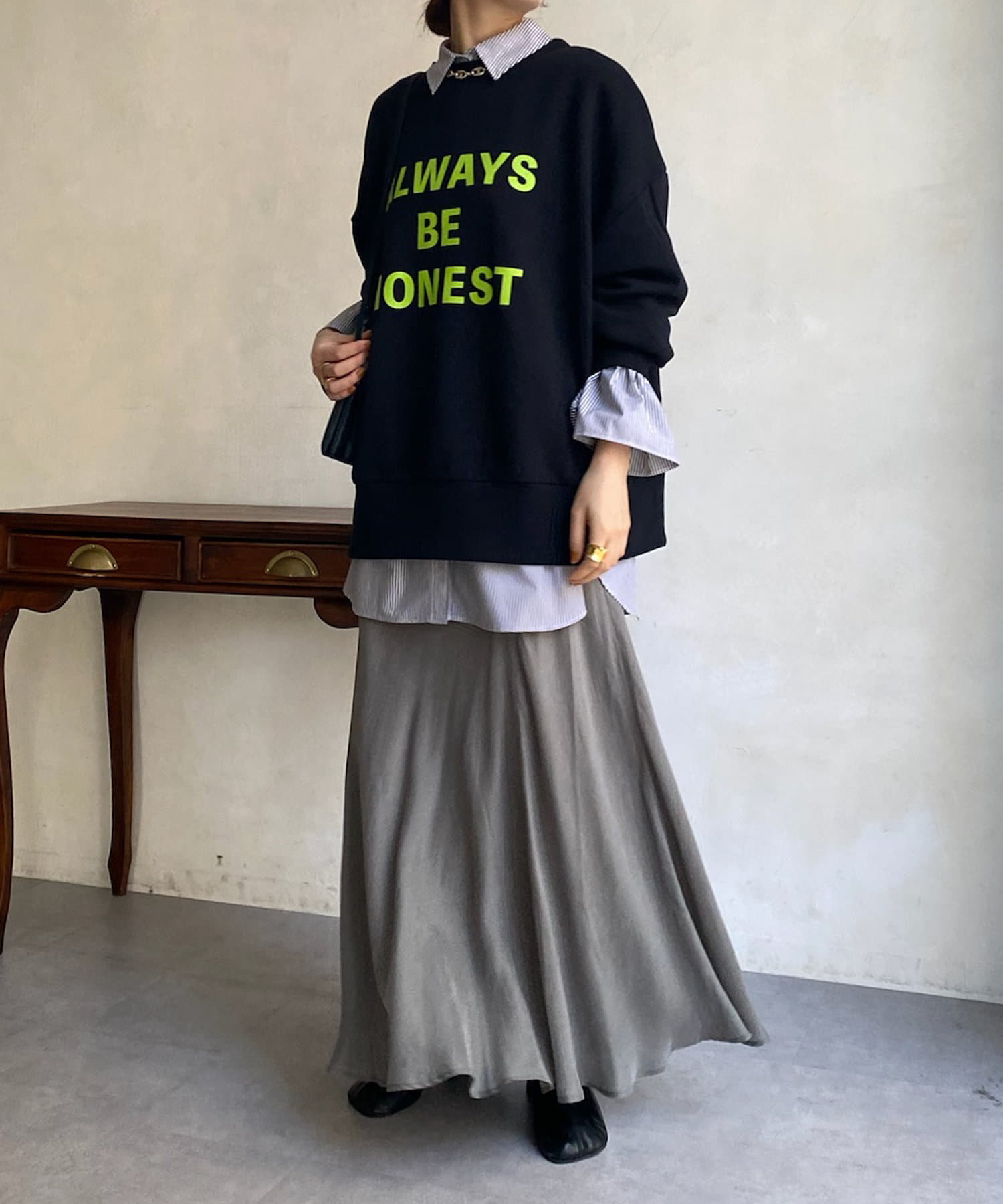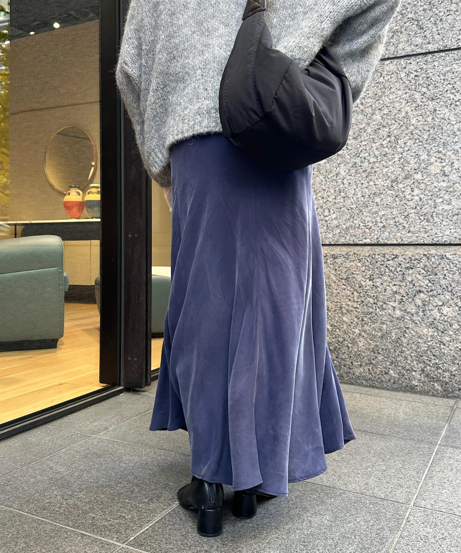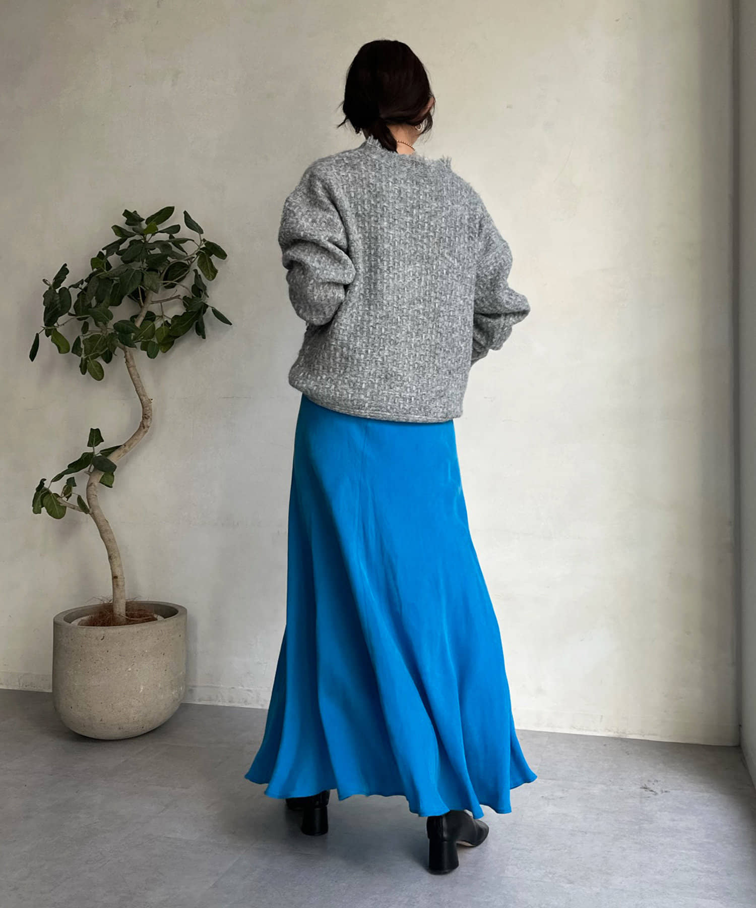 とろみのあるキュプラ100%素材が、きれい見えしてくれるポイントです。また、生地を斜めに裁断するバイヤスカットを採用することで、しなやかな落ち感のシルエットを演出。