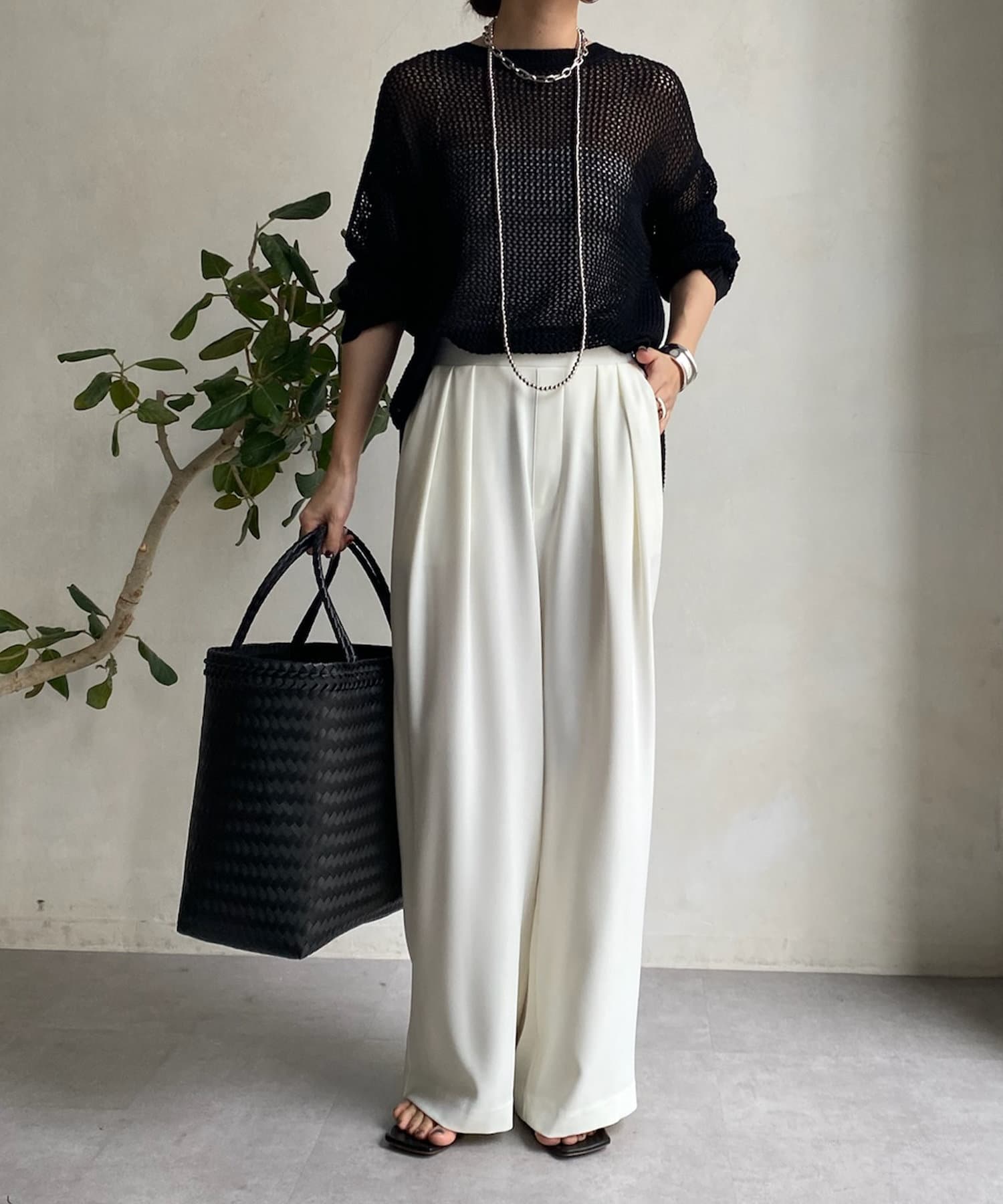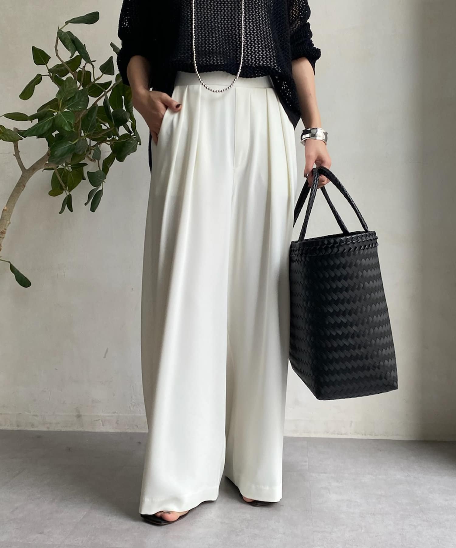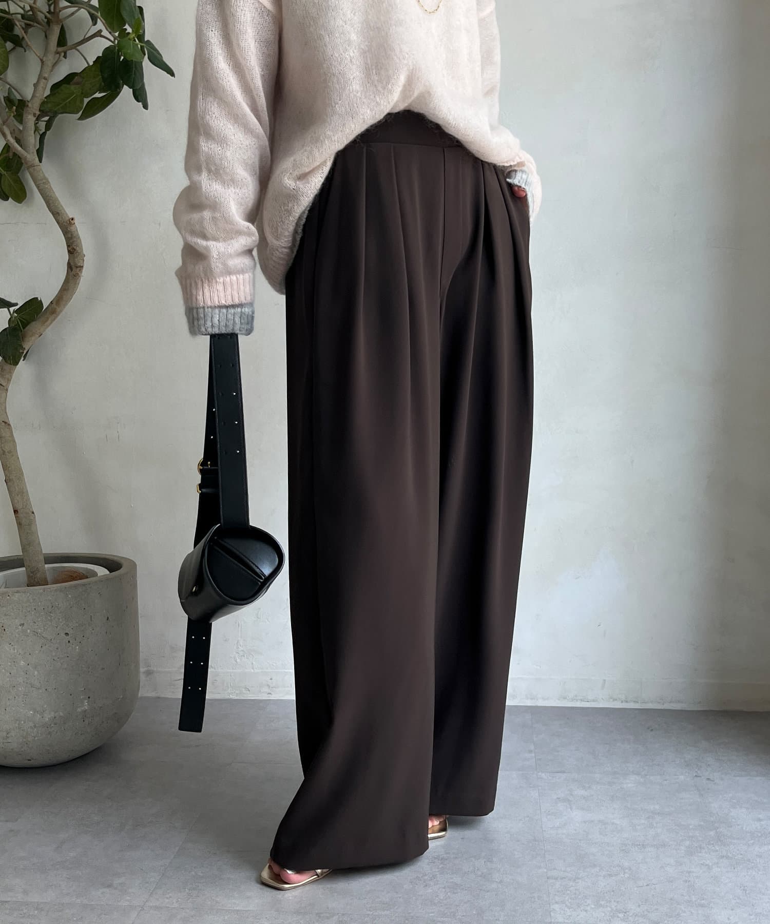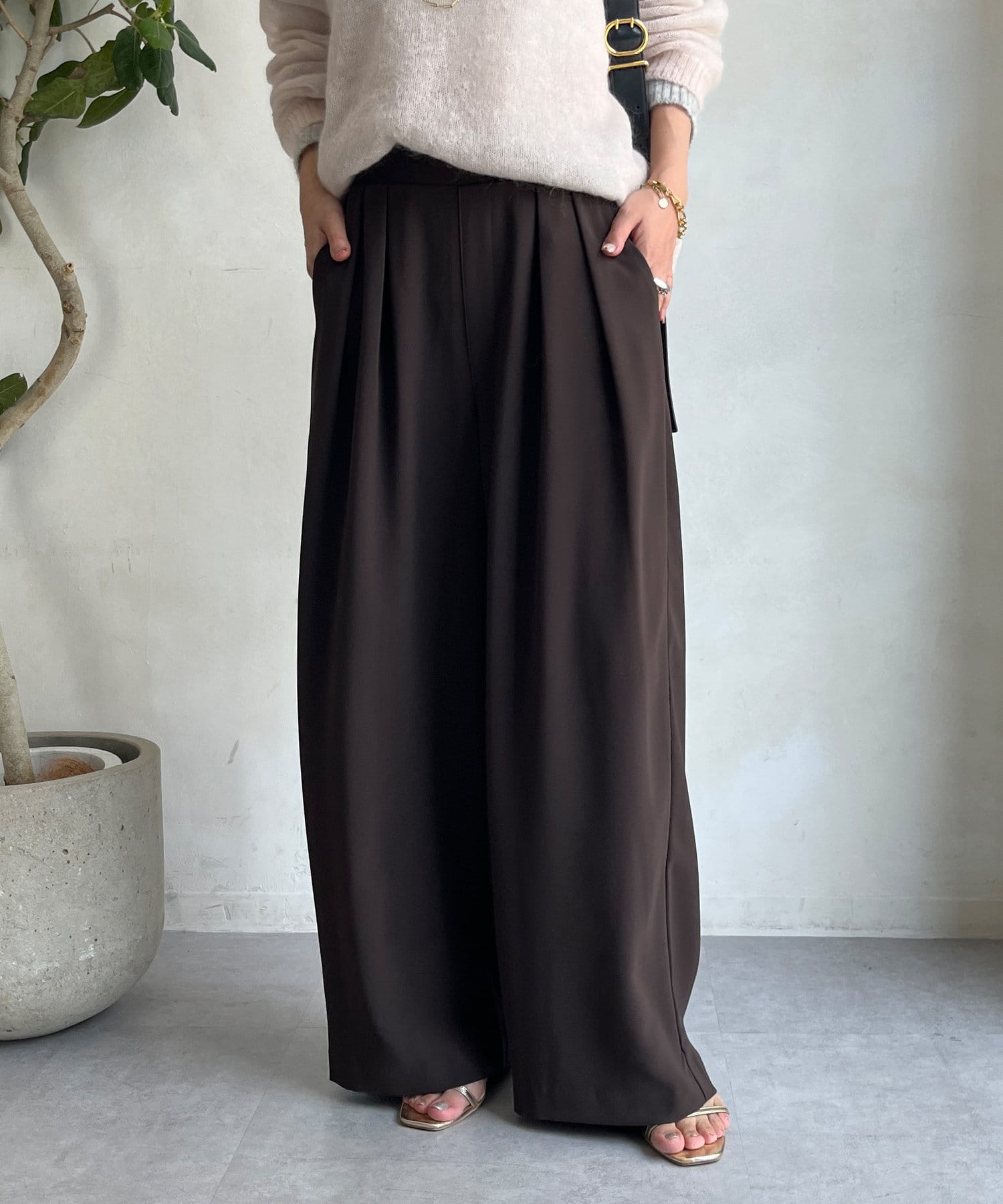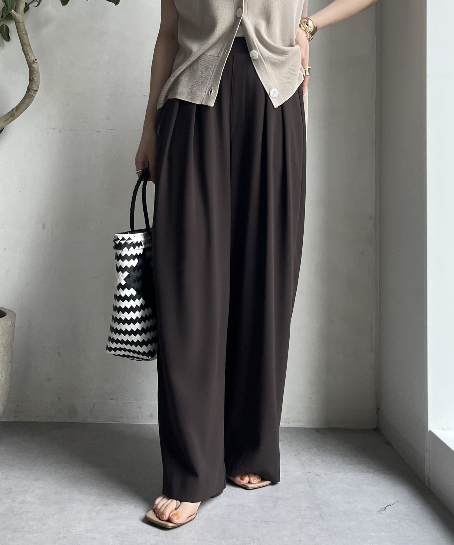 フロントに施したツータックがマイナス3キロ見えの秘訣で、すとんと落ちるきれいなシルエットを演出。